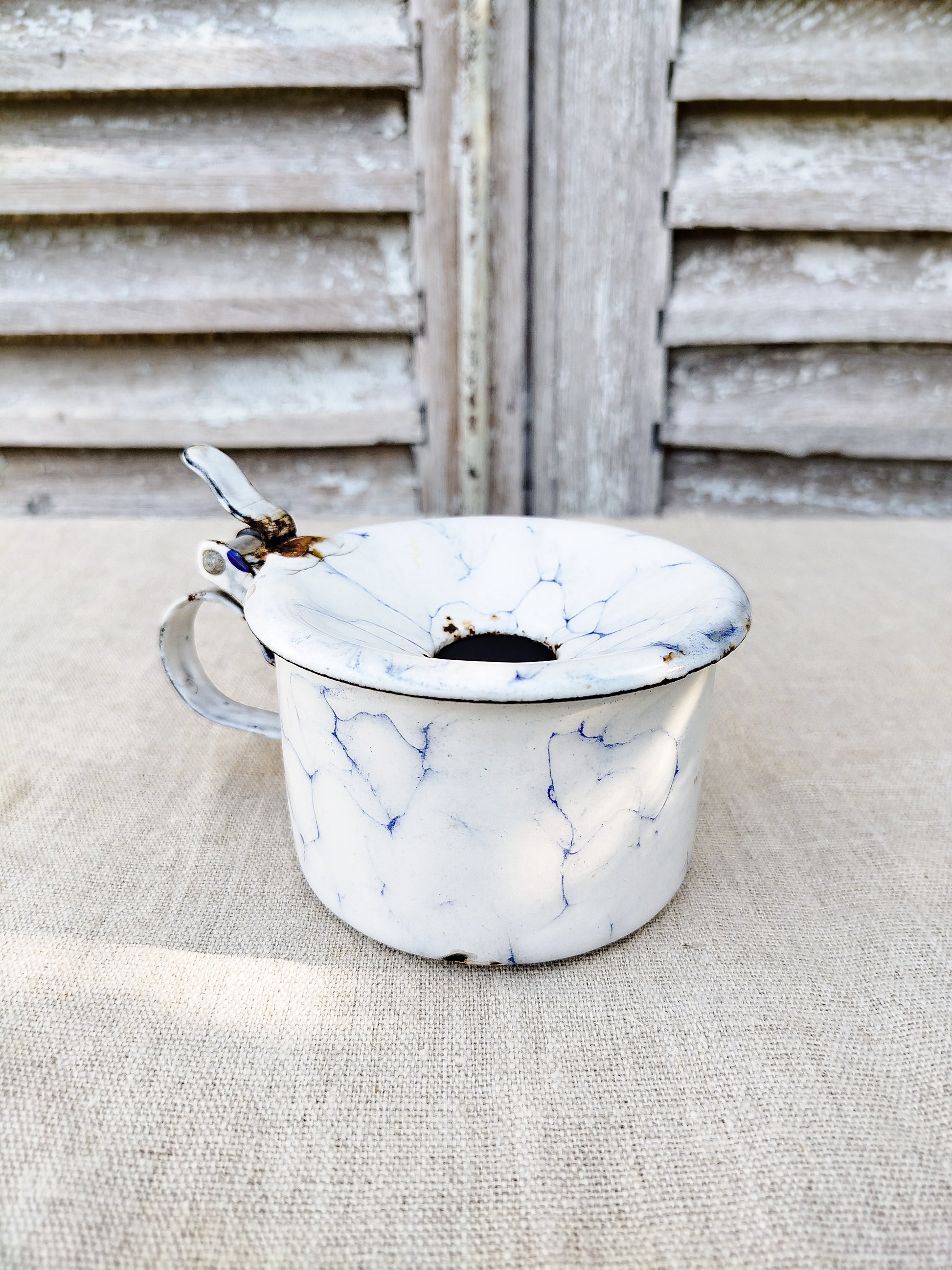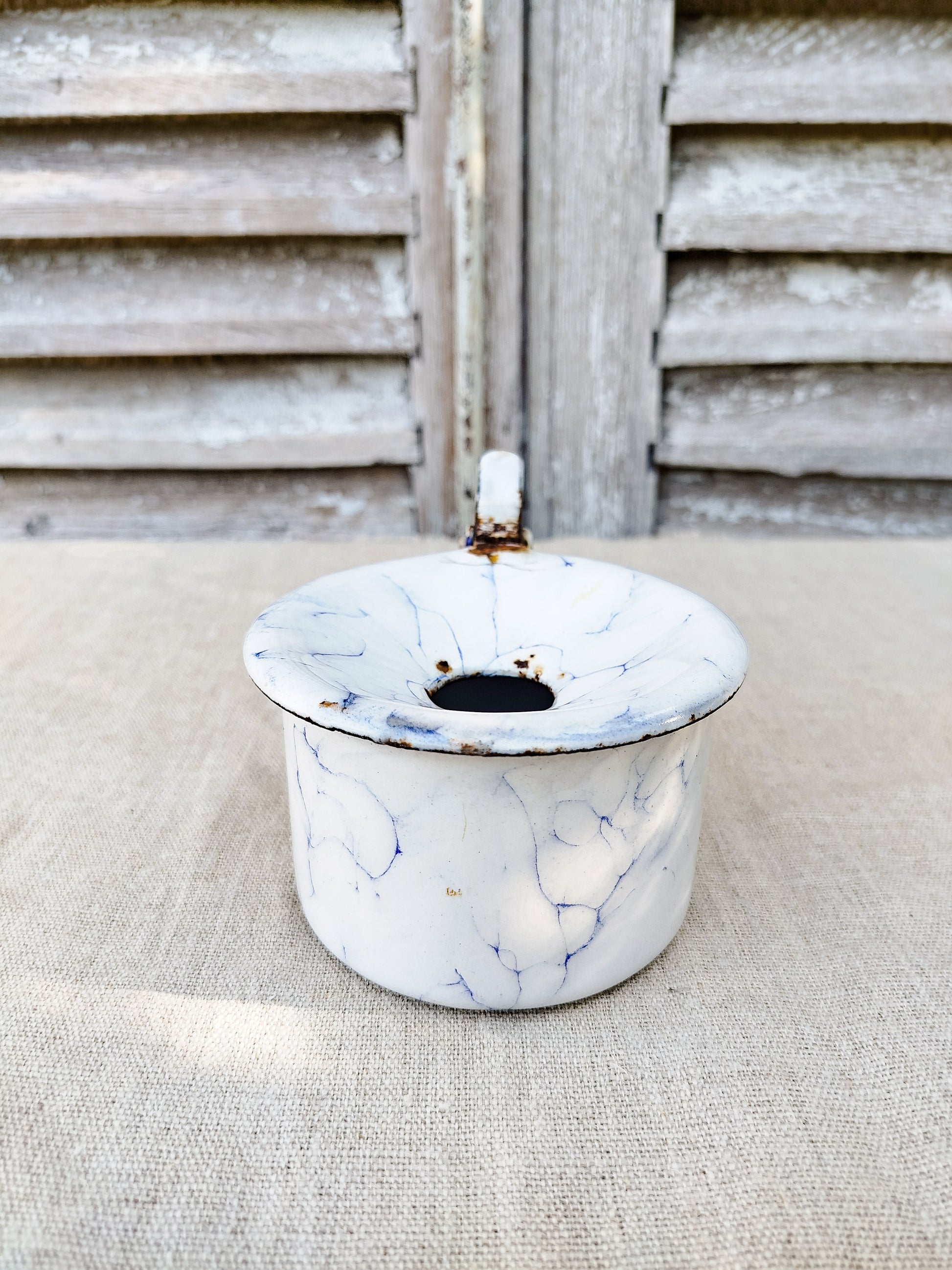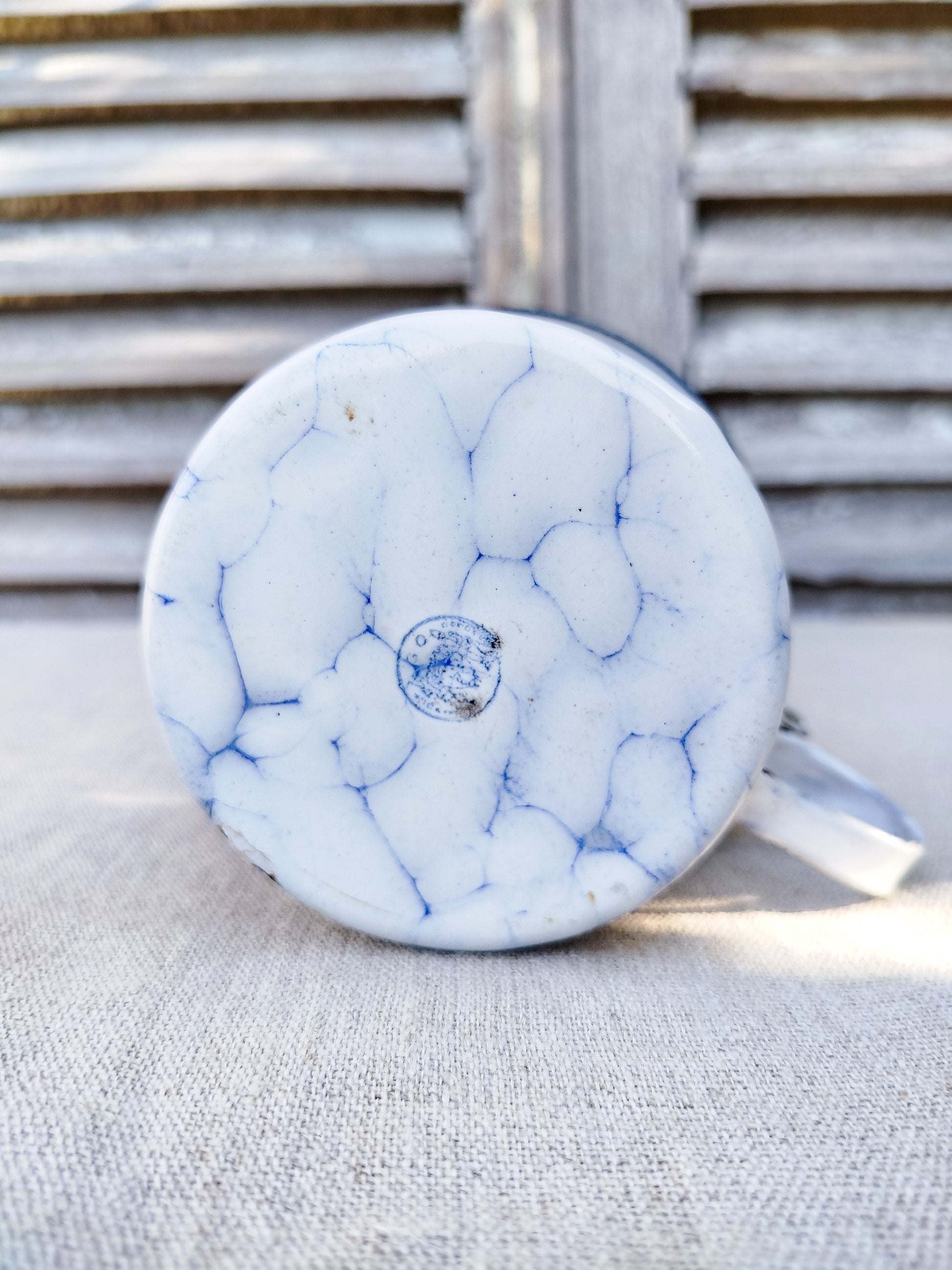 Émaillé en blanc et bleu, effet marbré.