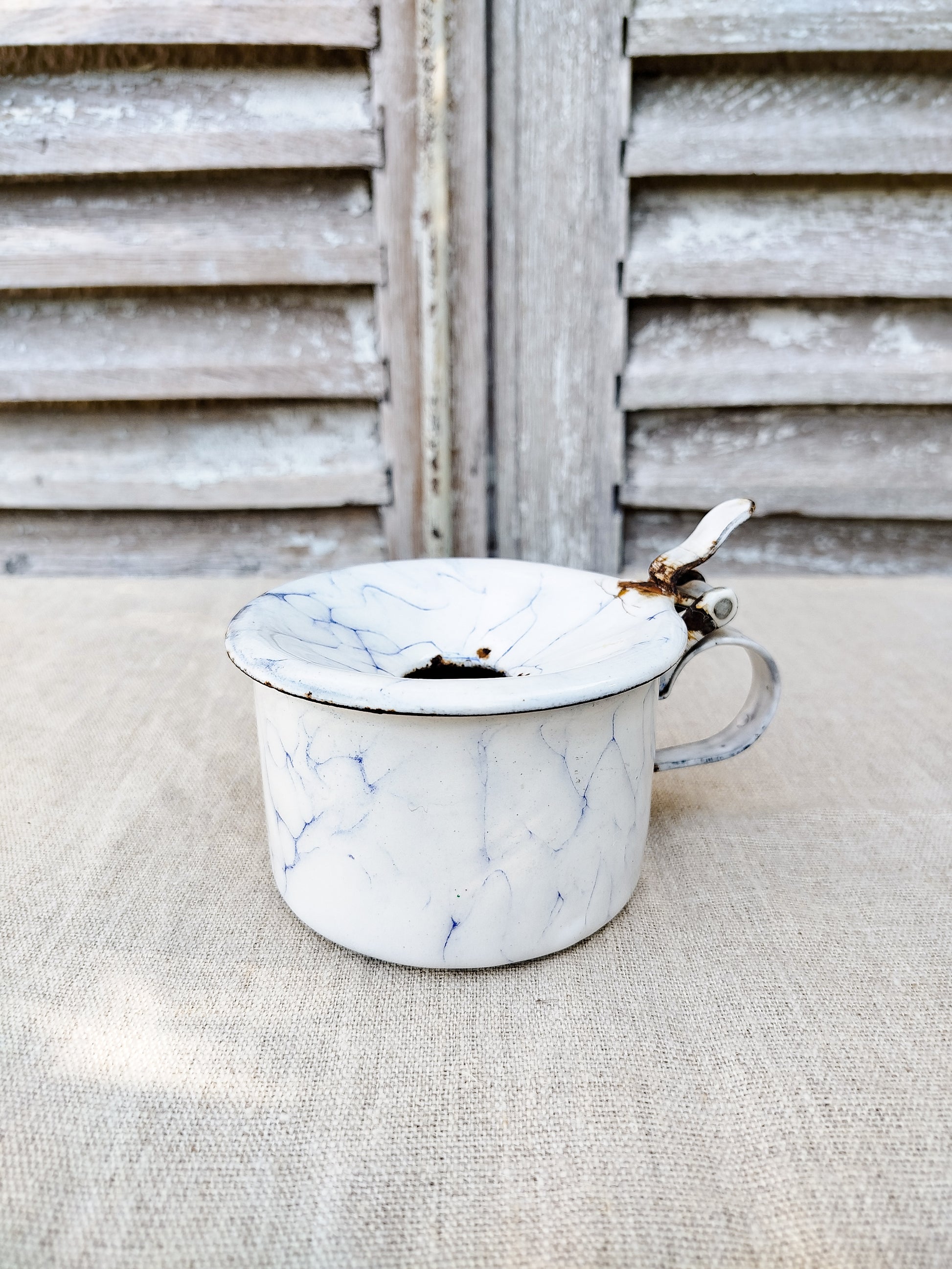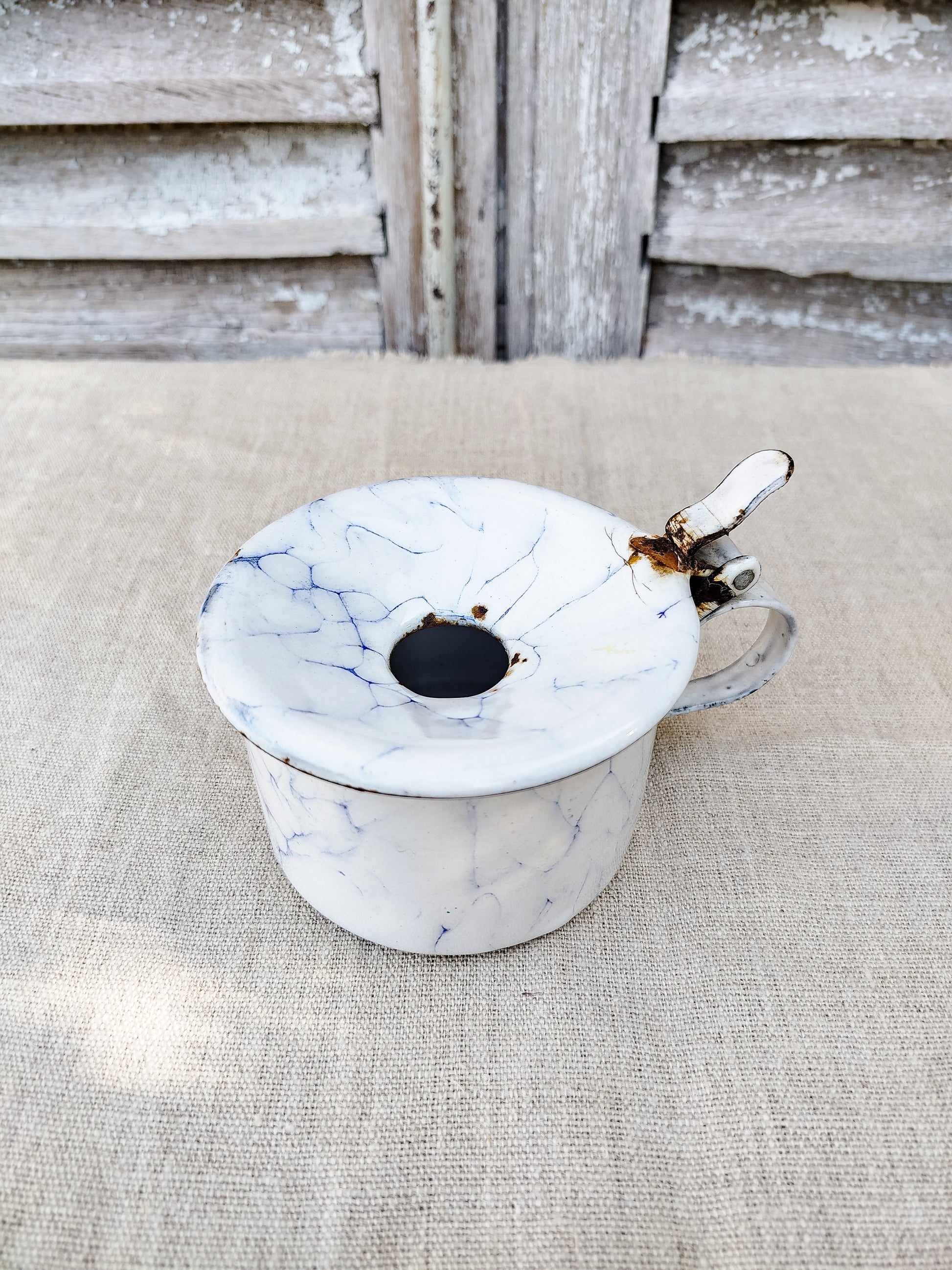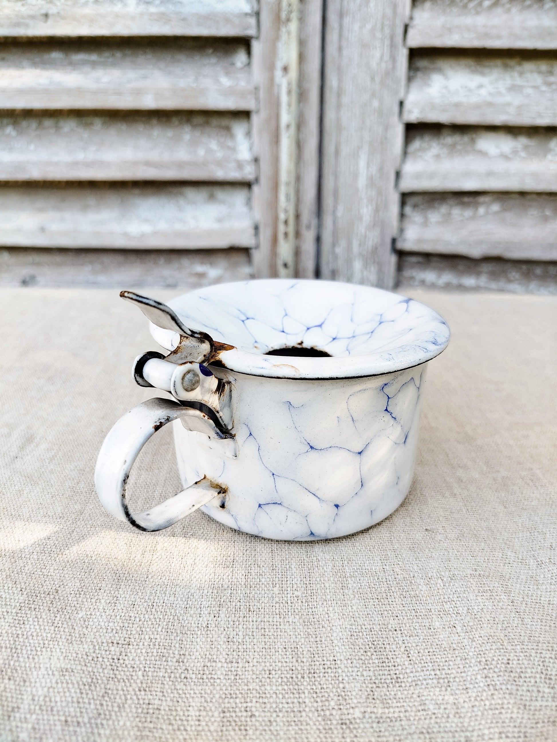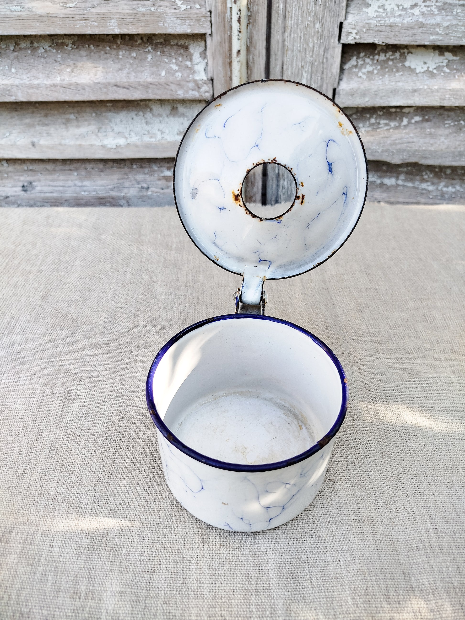 Émaillé en blanc et bleu, effet marbré.