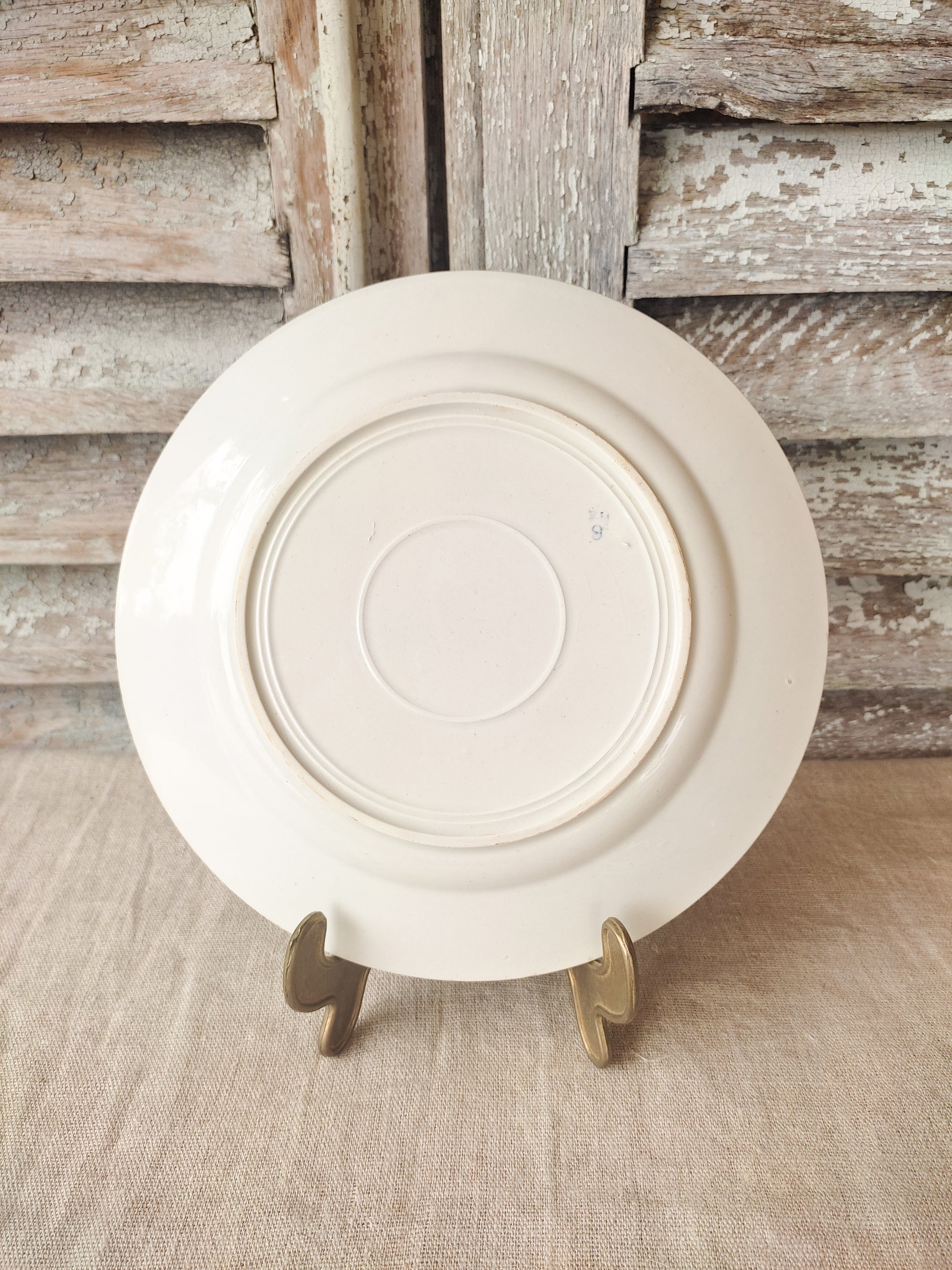 Assiette plate vintage en faïence blanche.