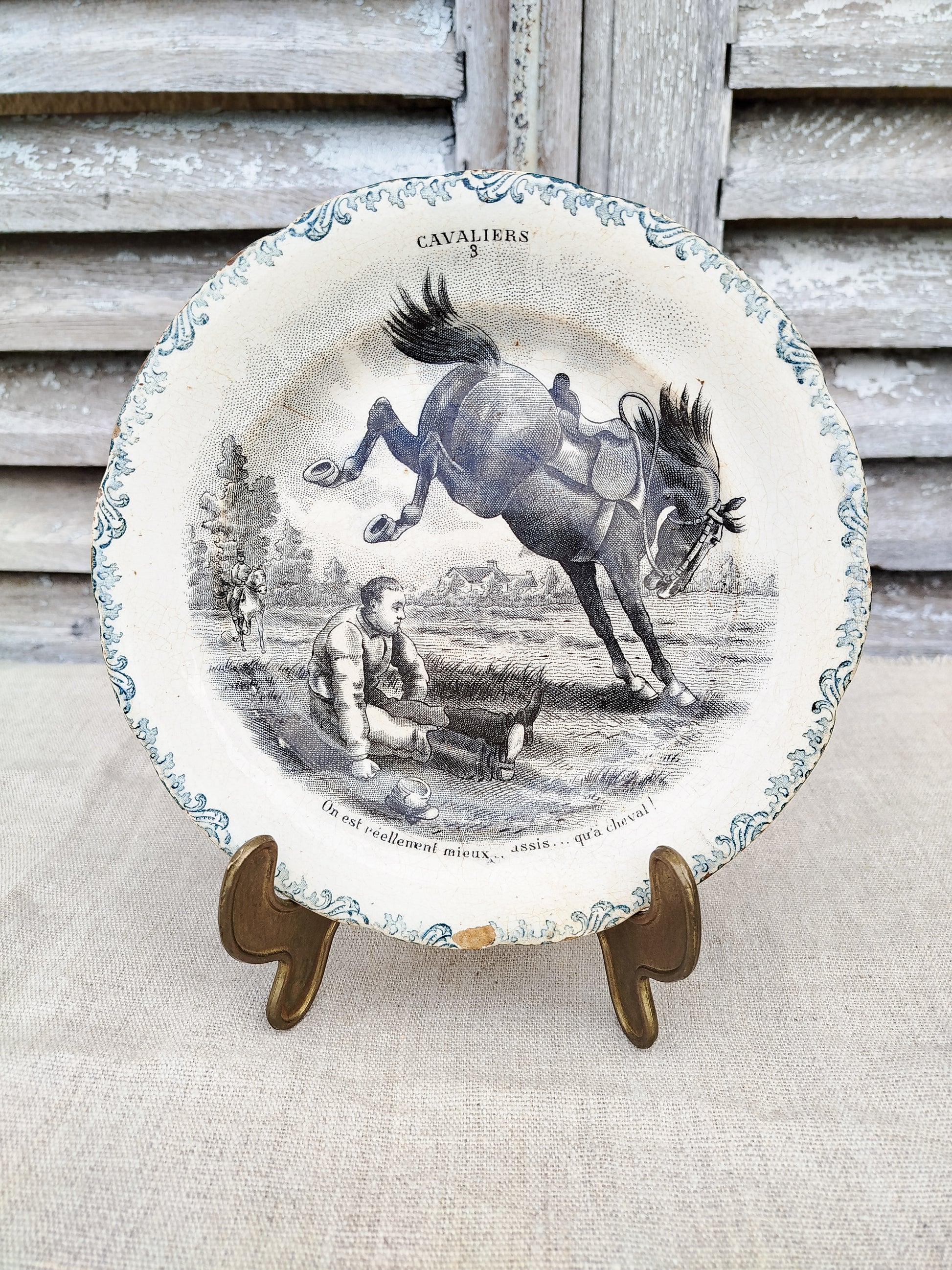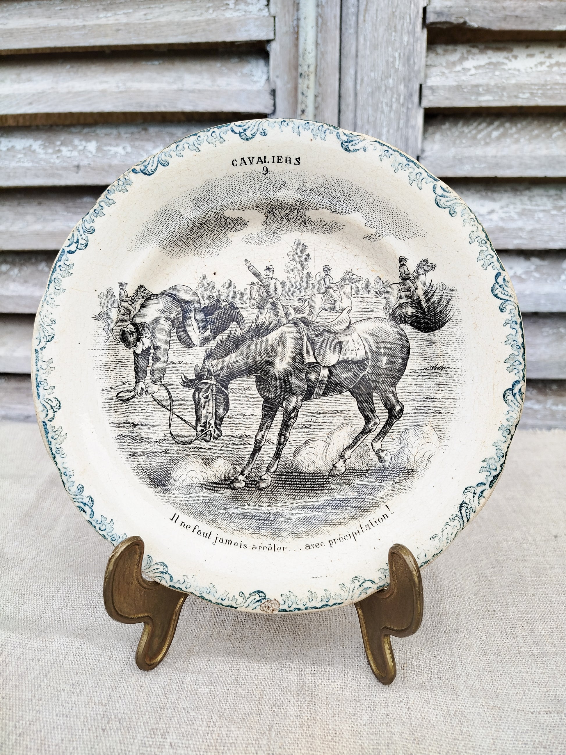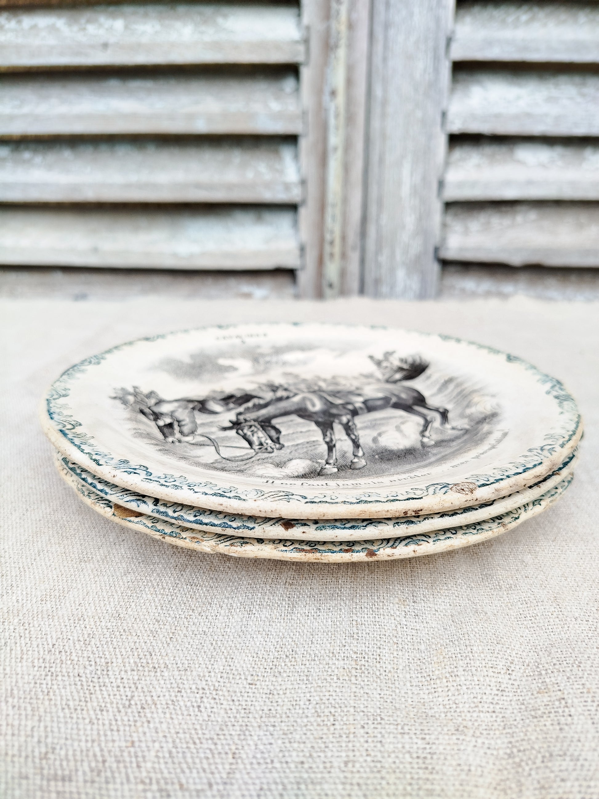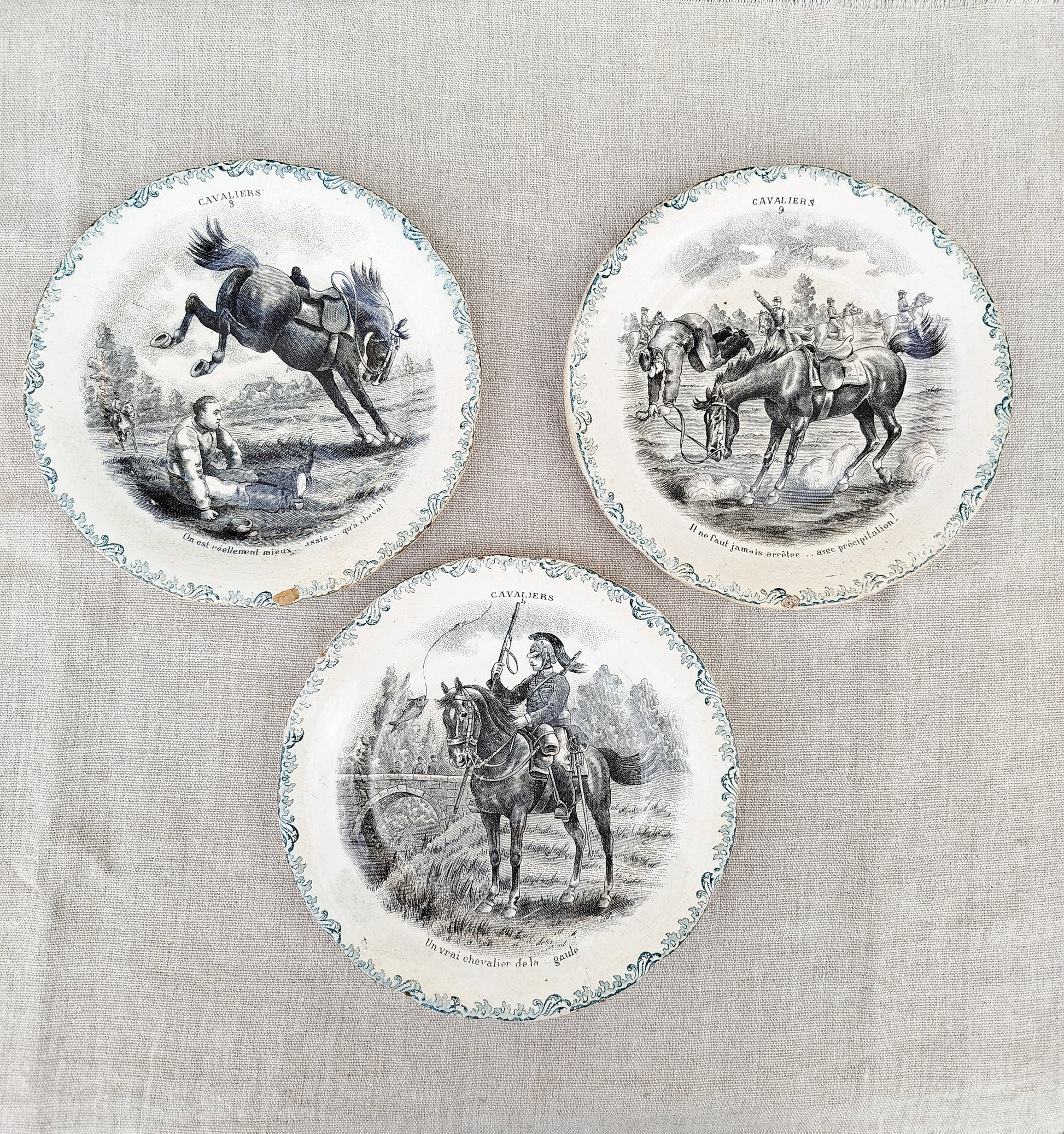 Ensemble de trois petites assiettes à dessert, il s'agit d'assiettes parlantes sur le thème des cavaliers.