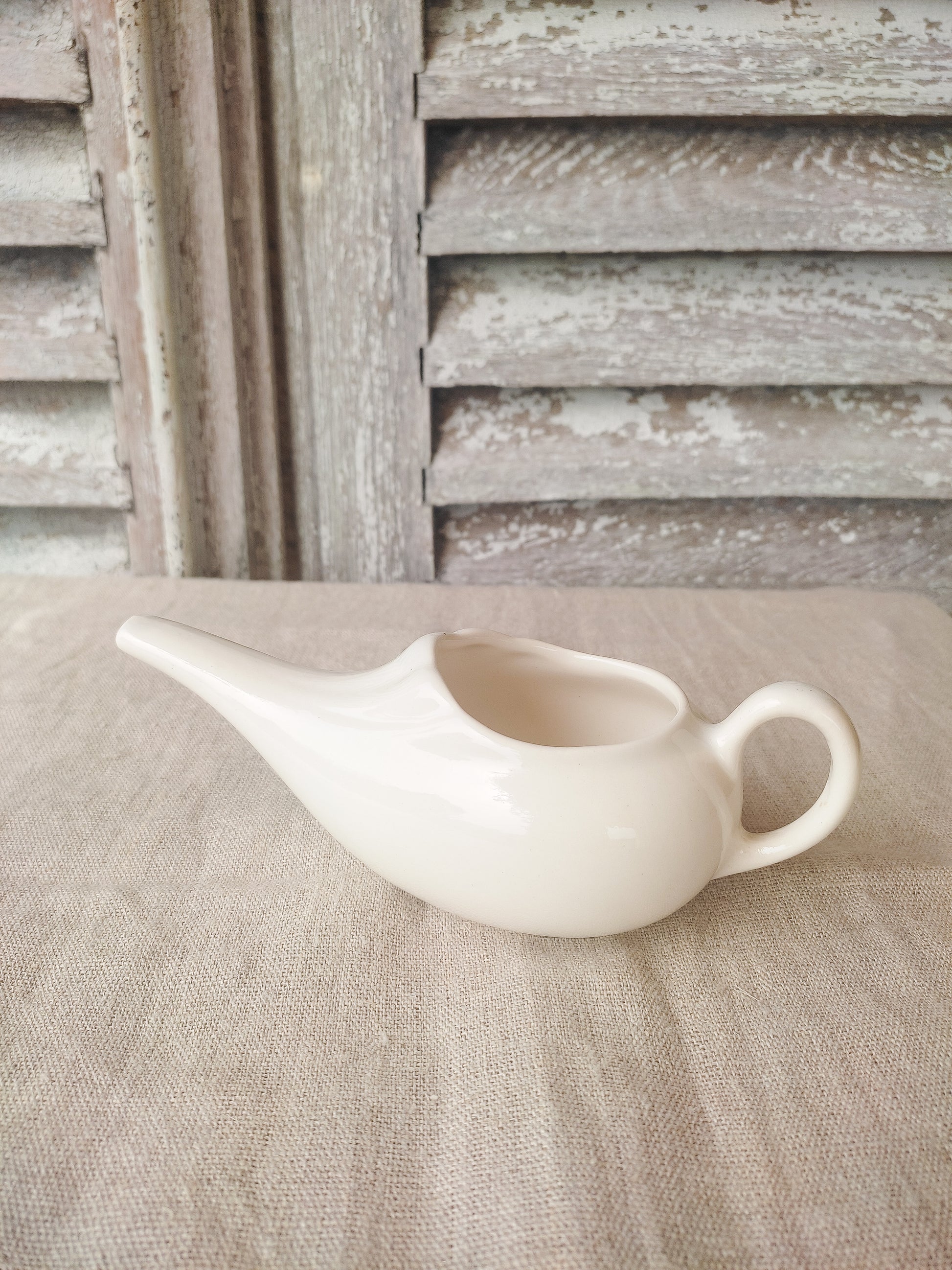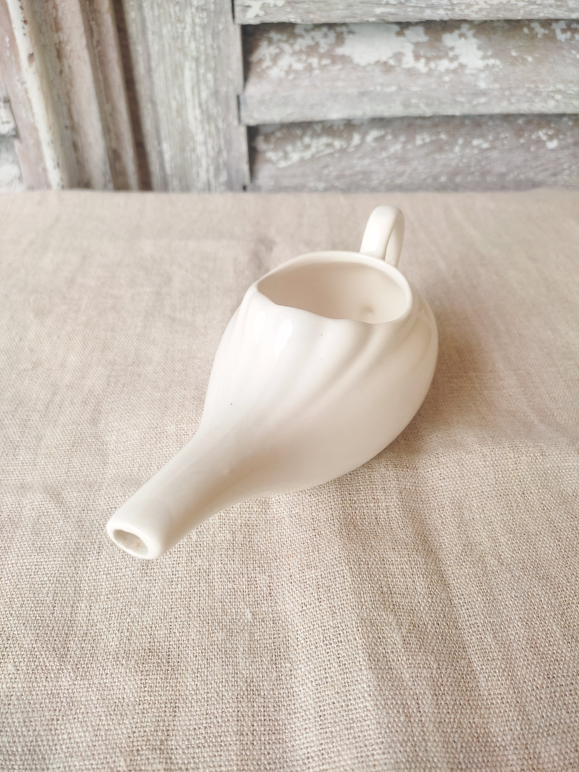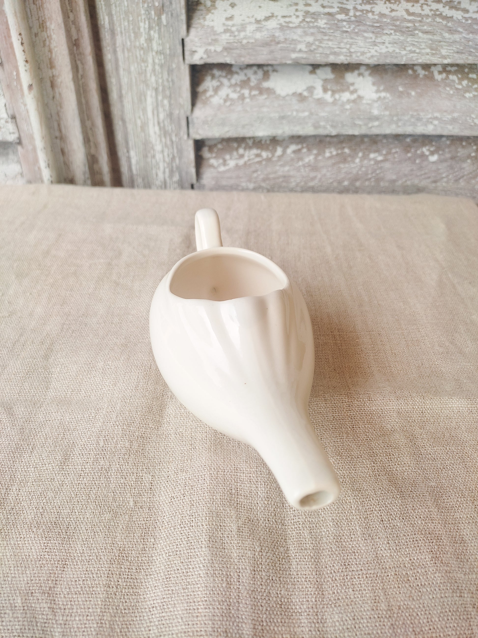 Biberon ou canard de malade ancien en faïence blanche.