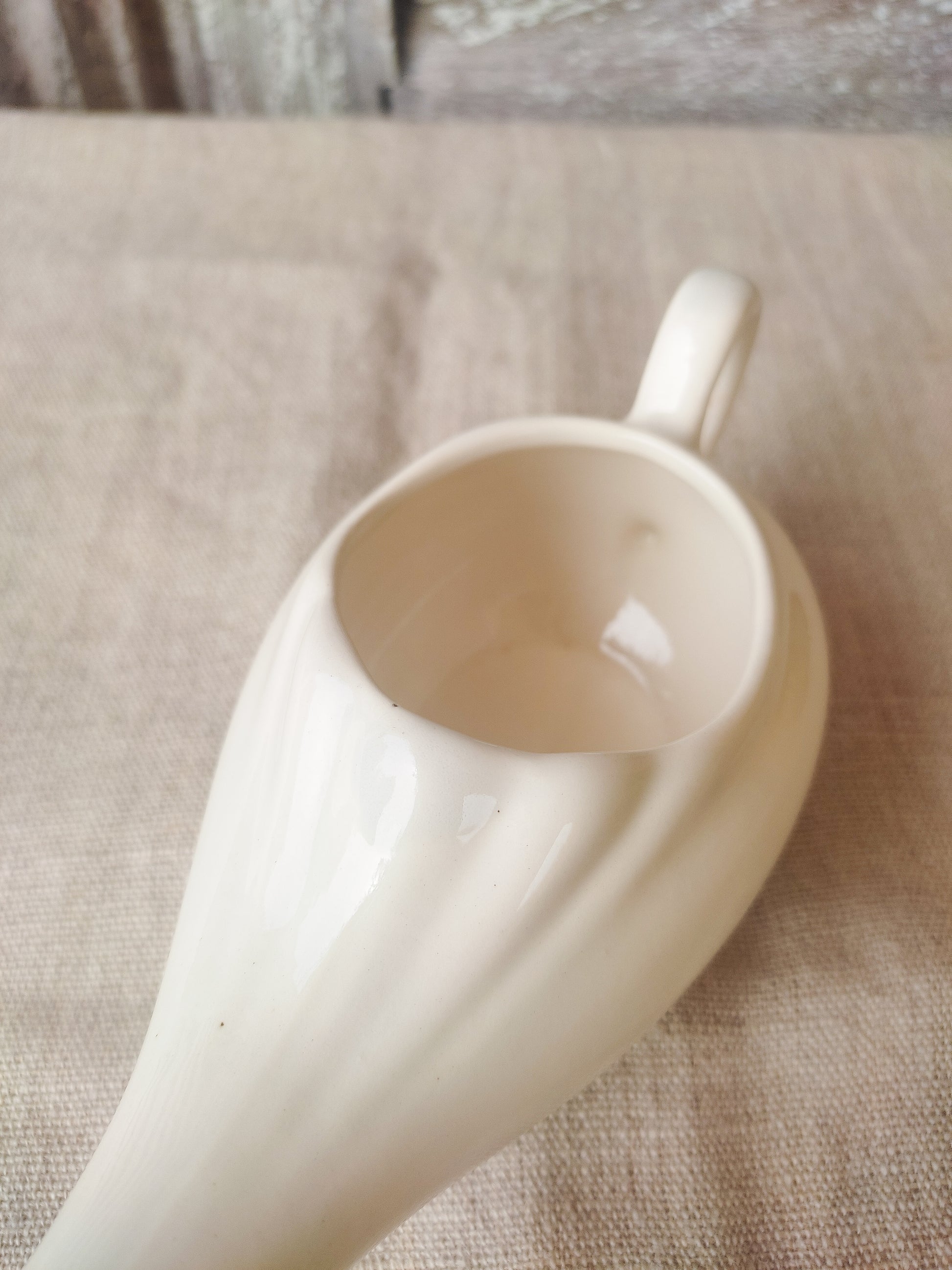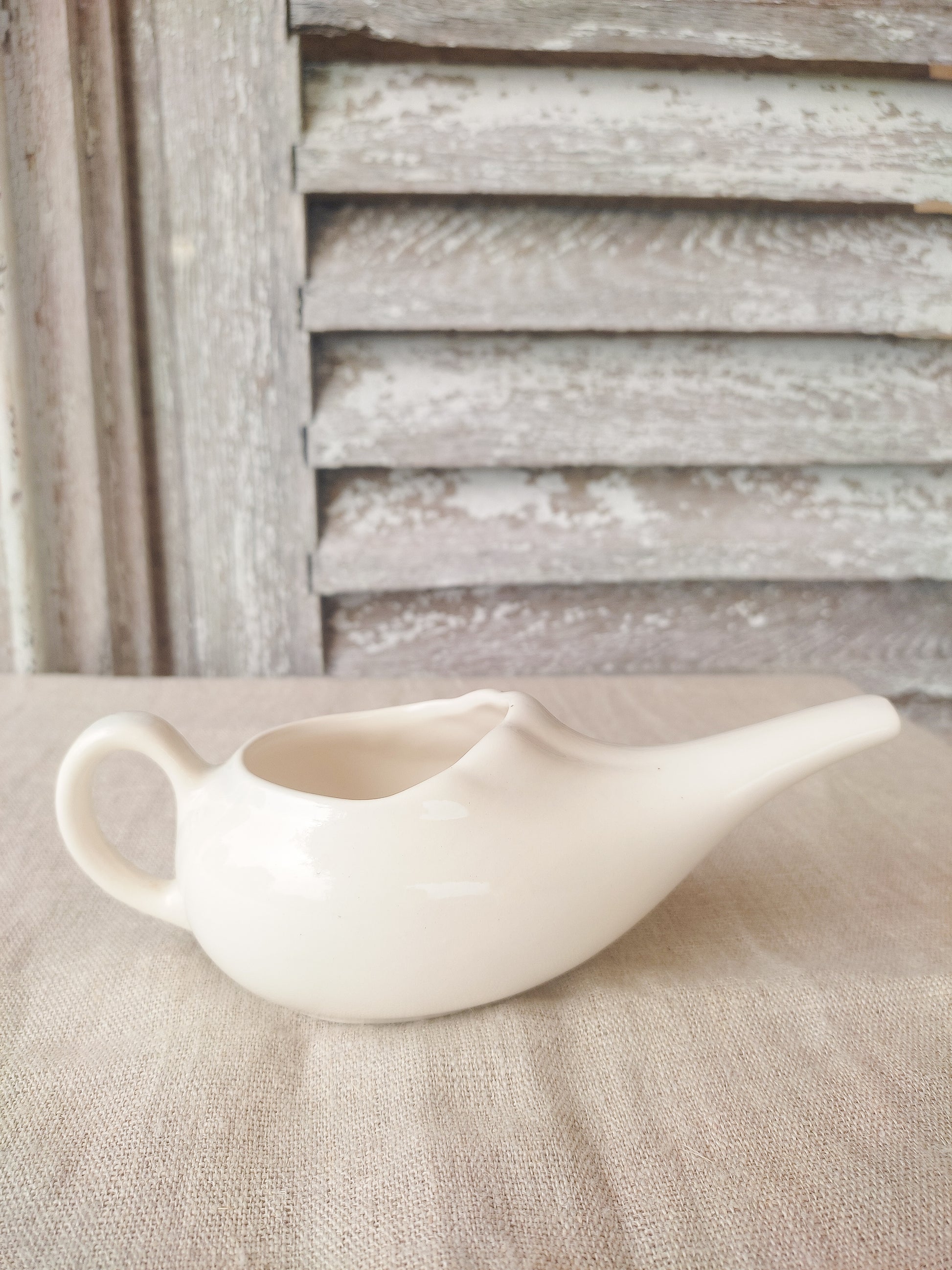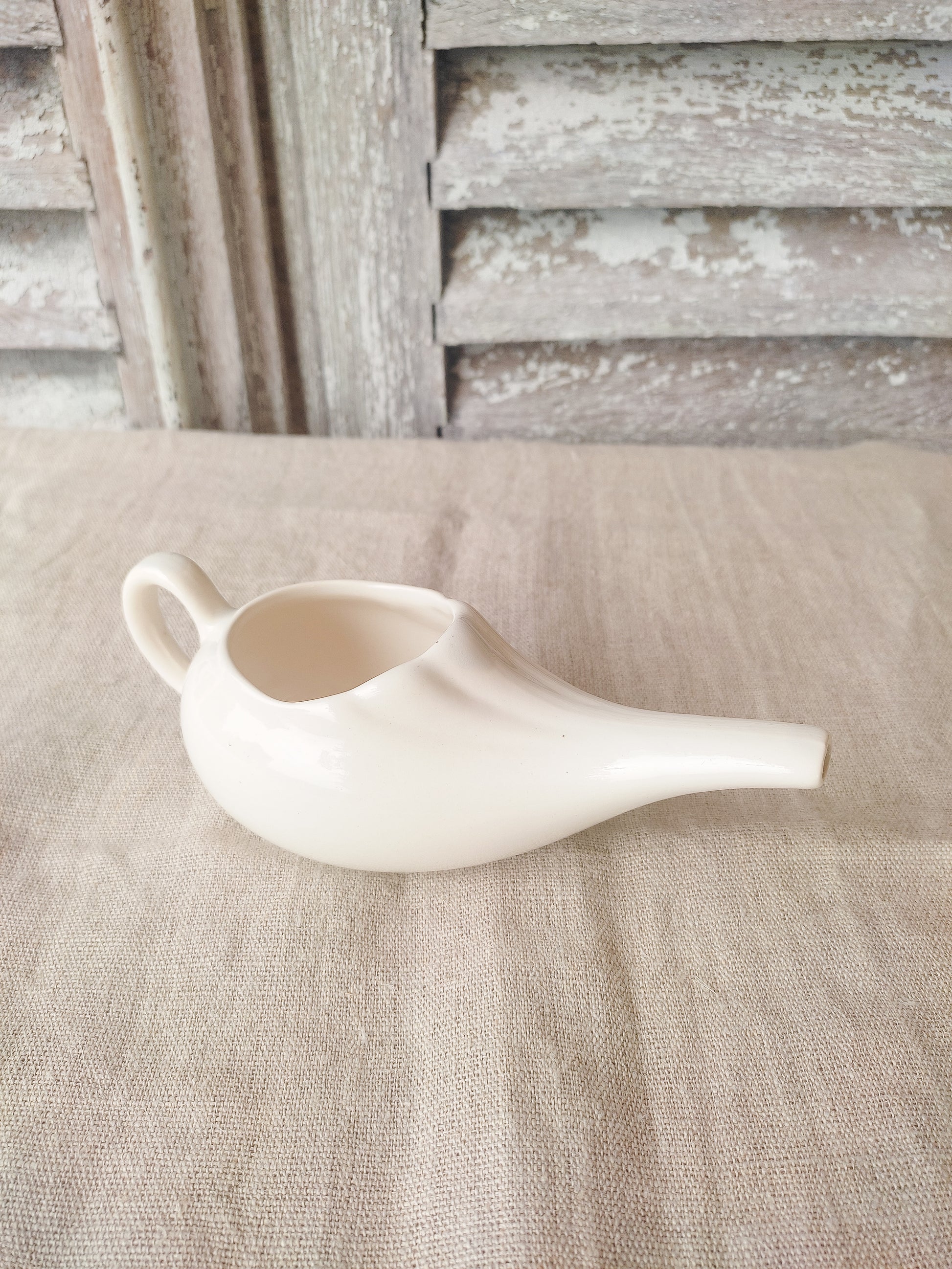 Biberon ou canard de malade ancien en faïence blanche.
