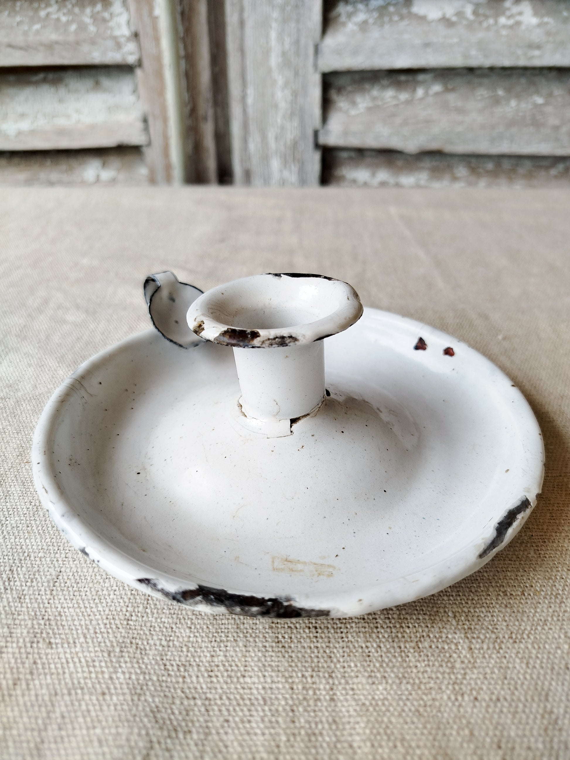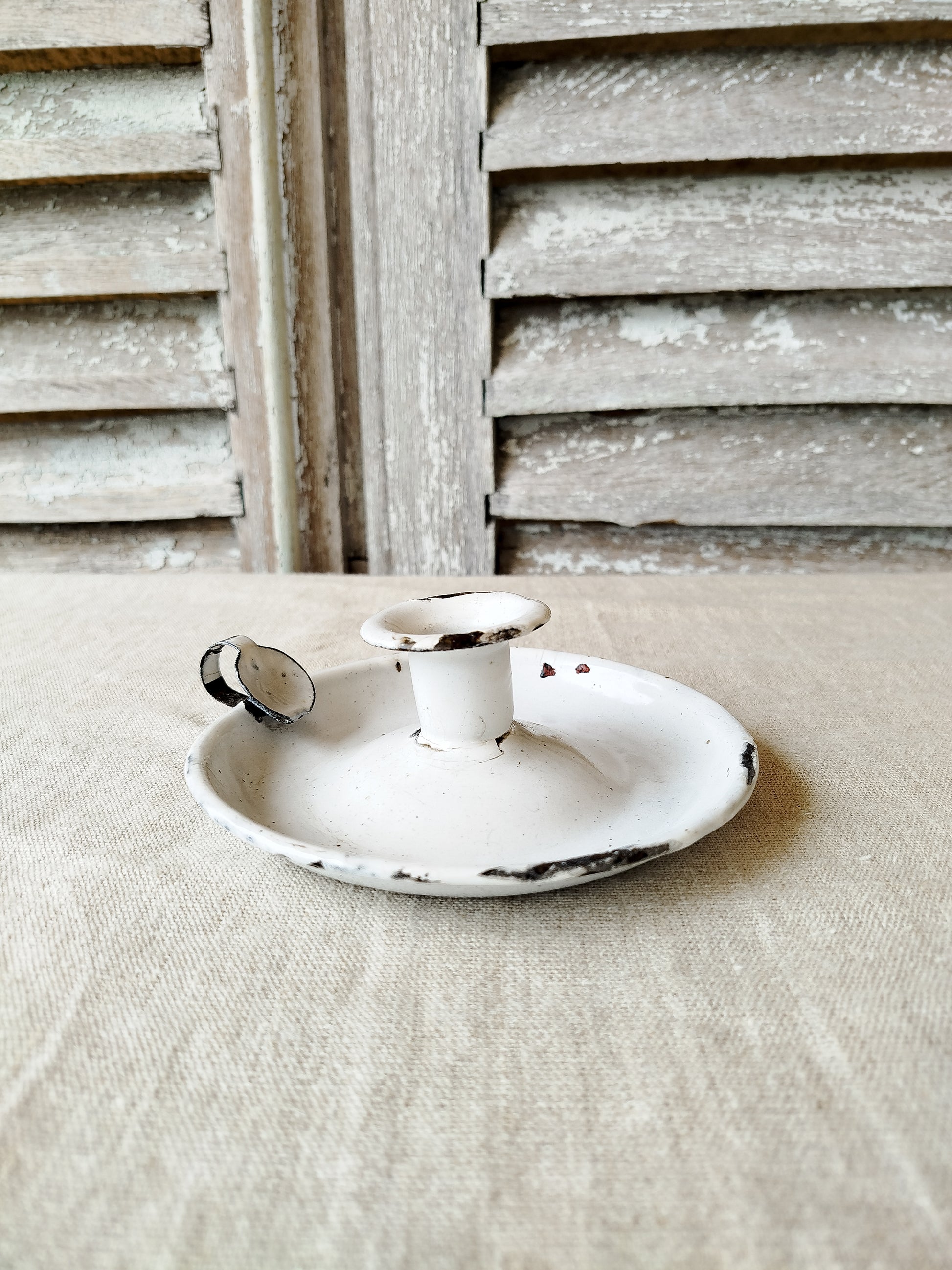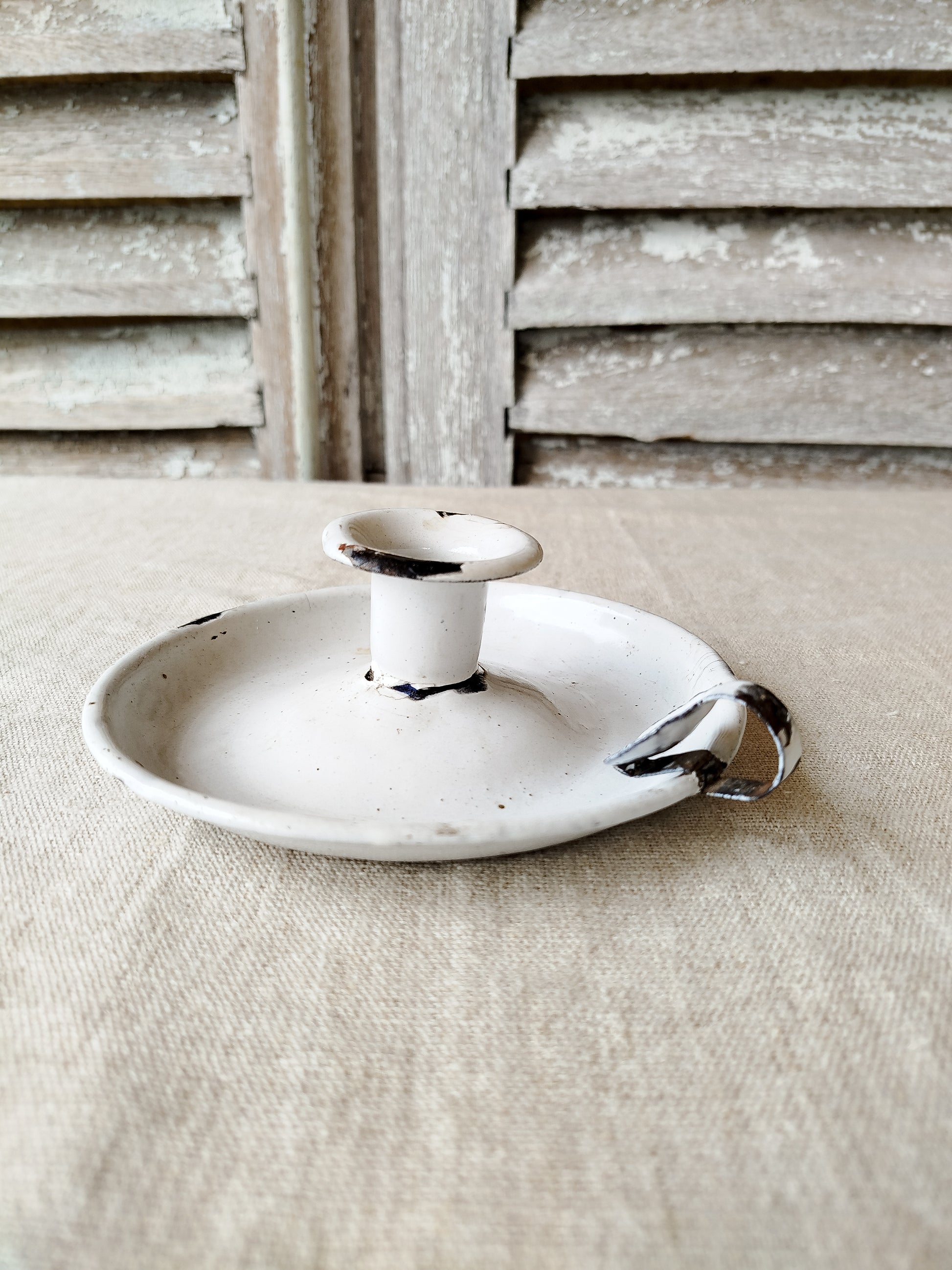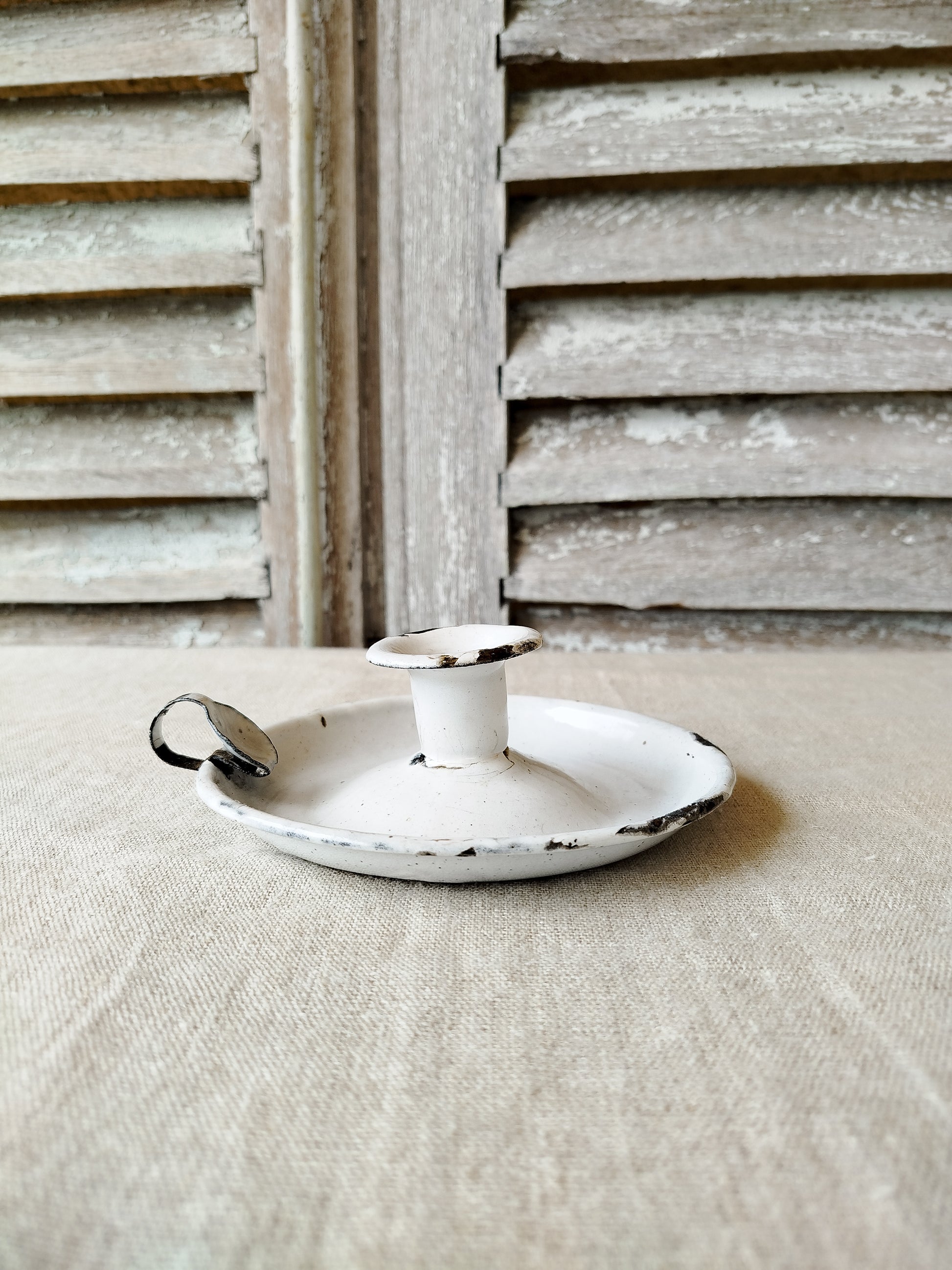 Bougeoir ancien dit " Ras de cave " en métal émaillé.