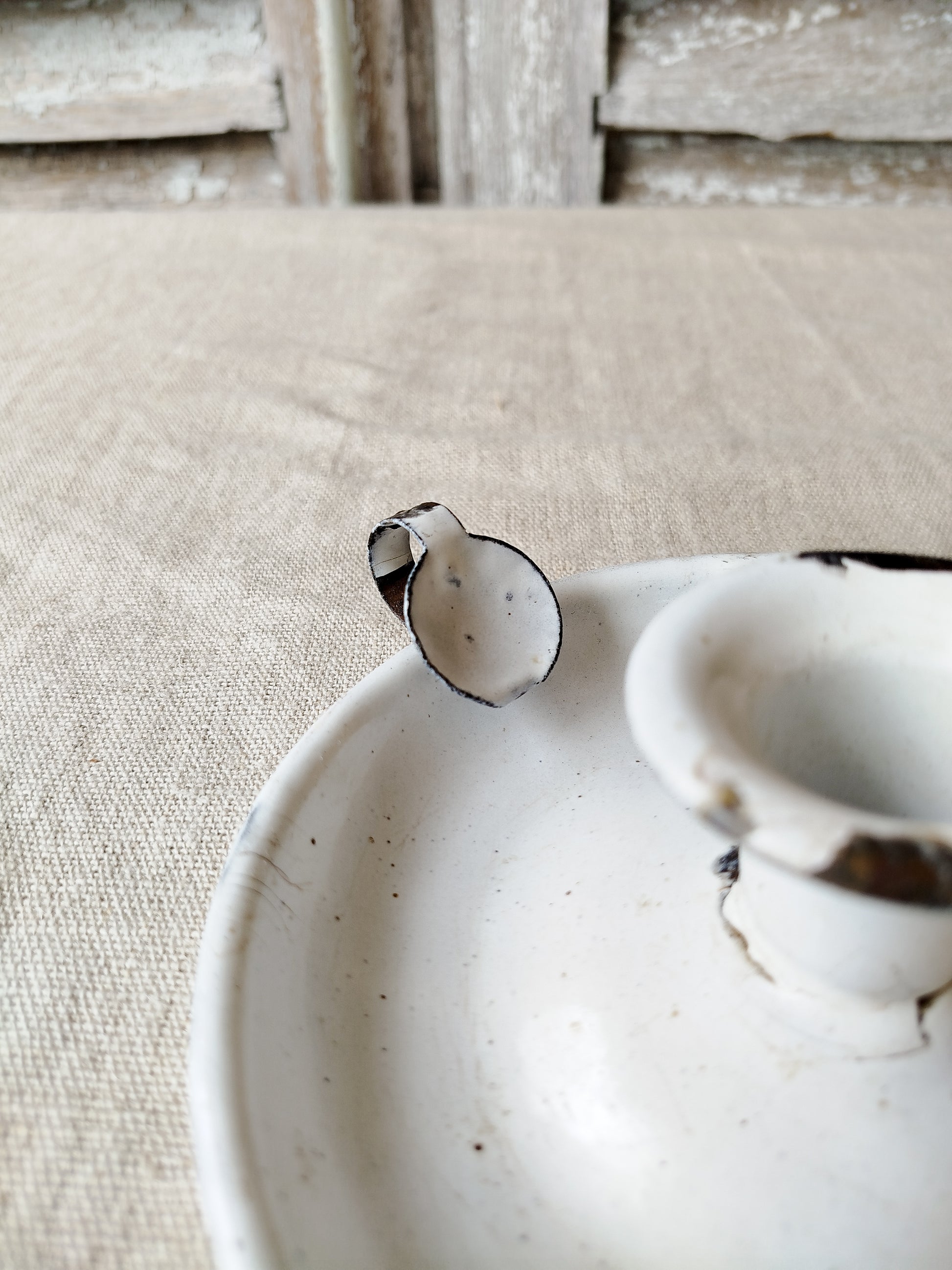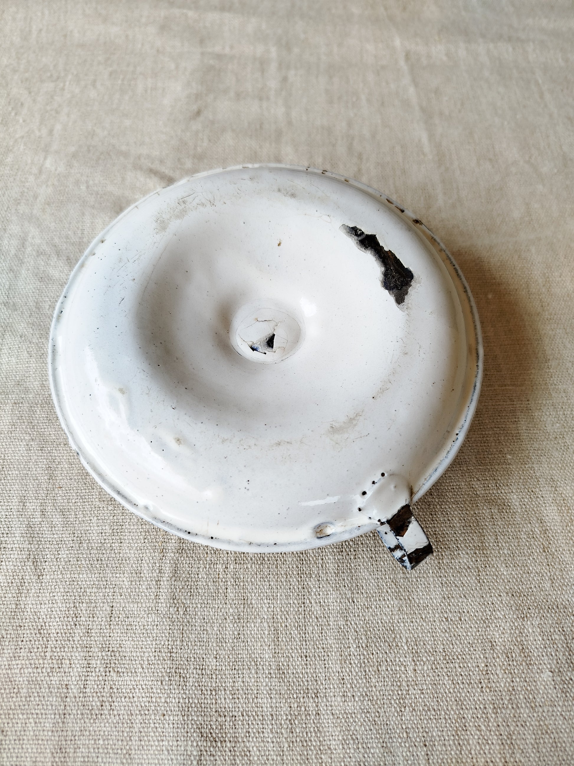 Il est émaillé en blanc, cependant plusieurs morceaux d'émail sont maintenant manquants.