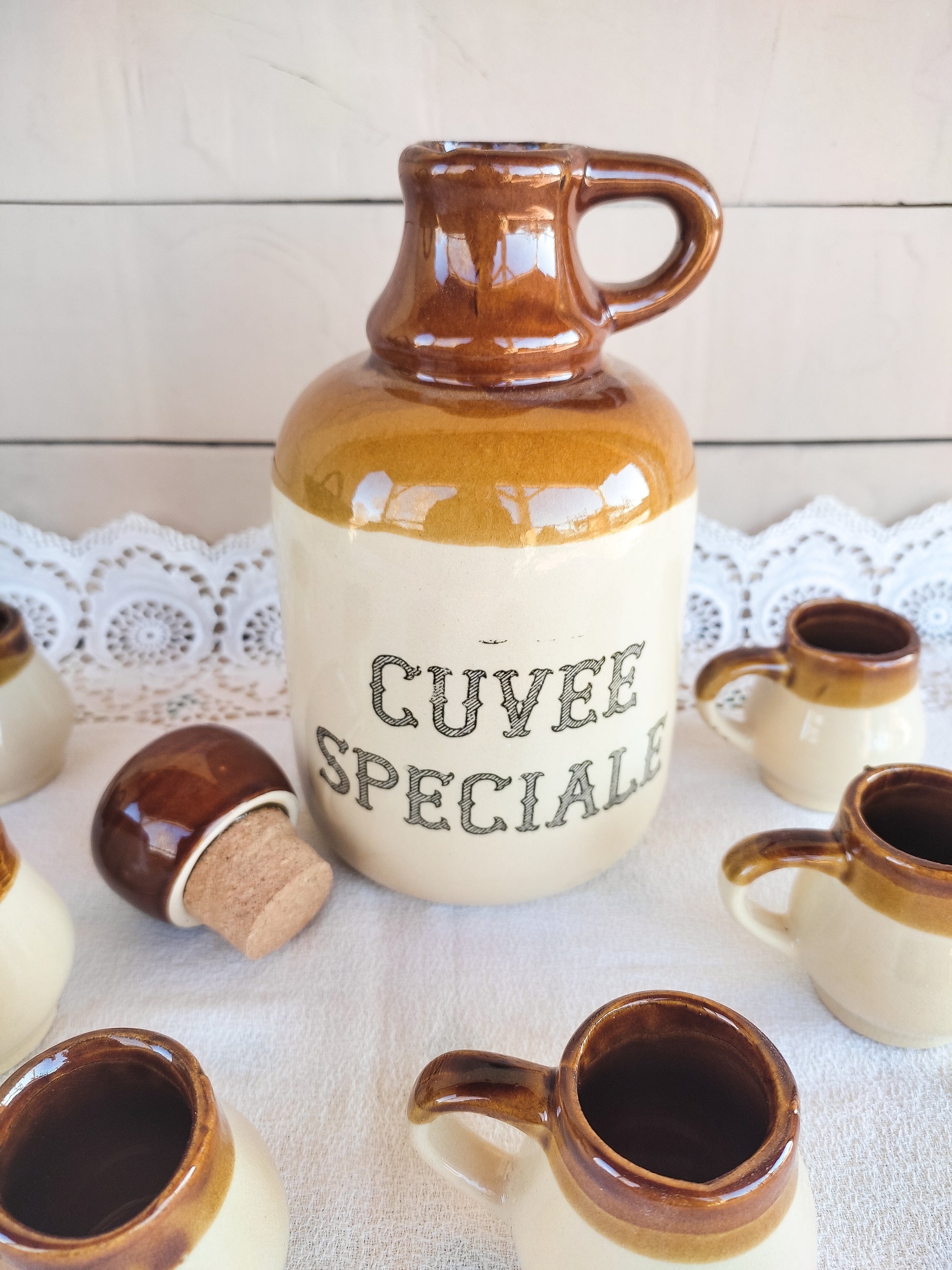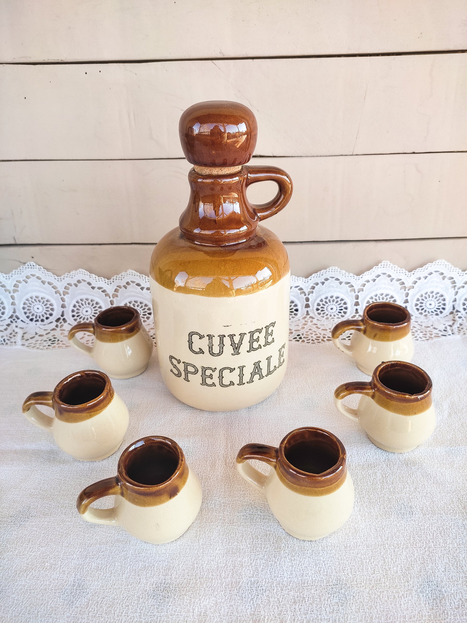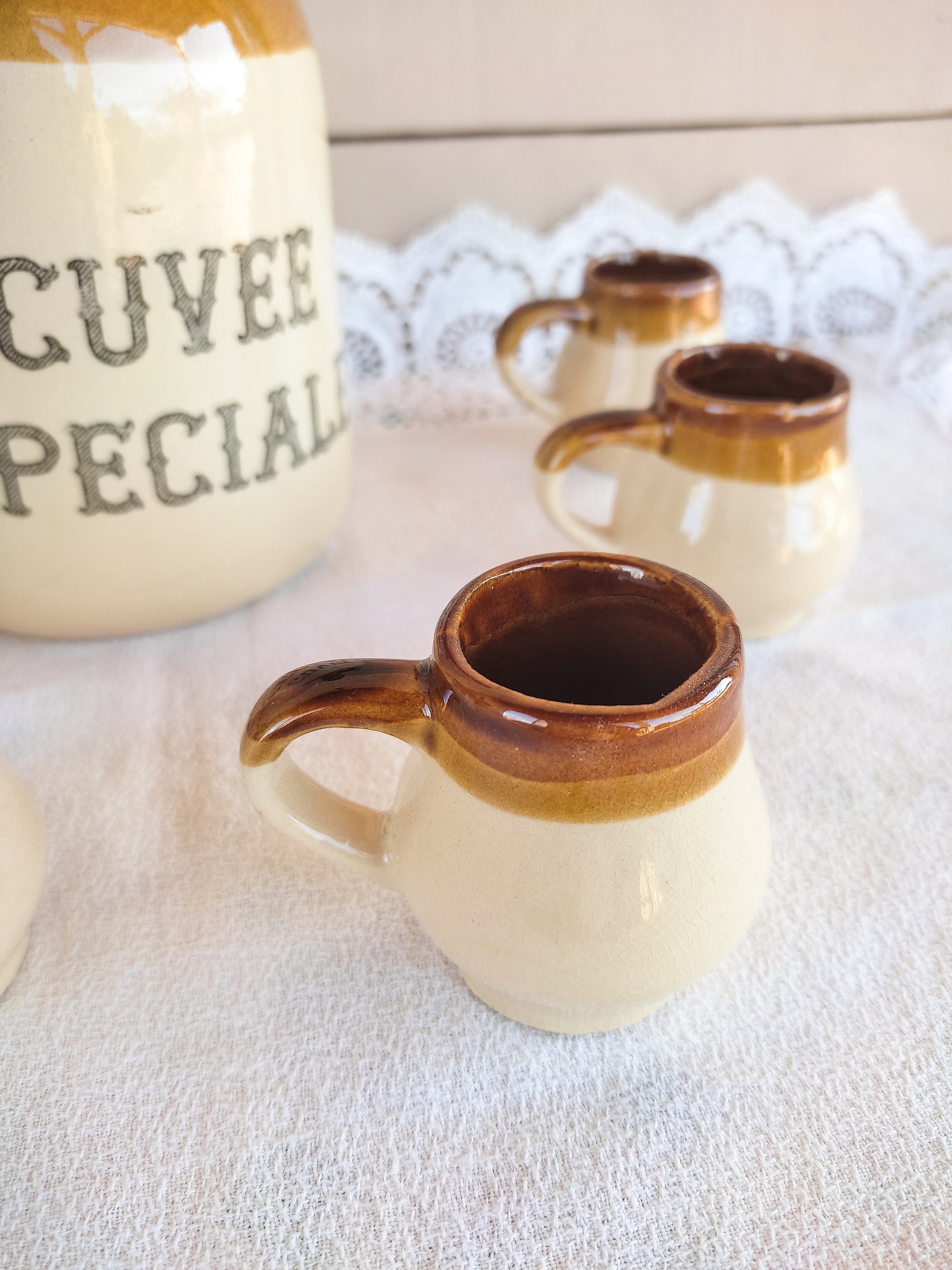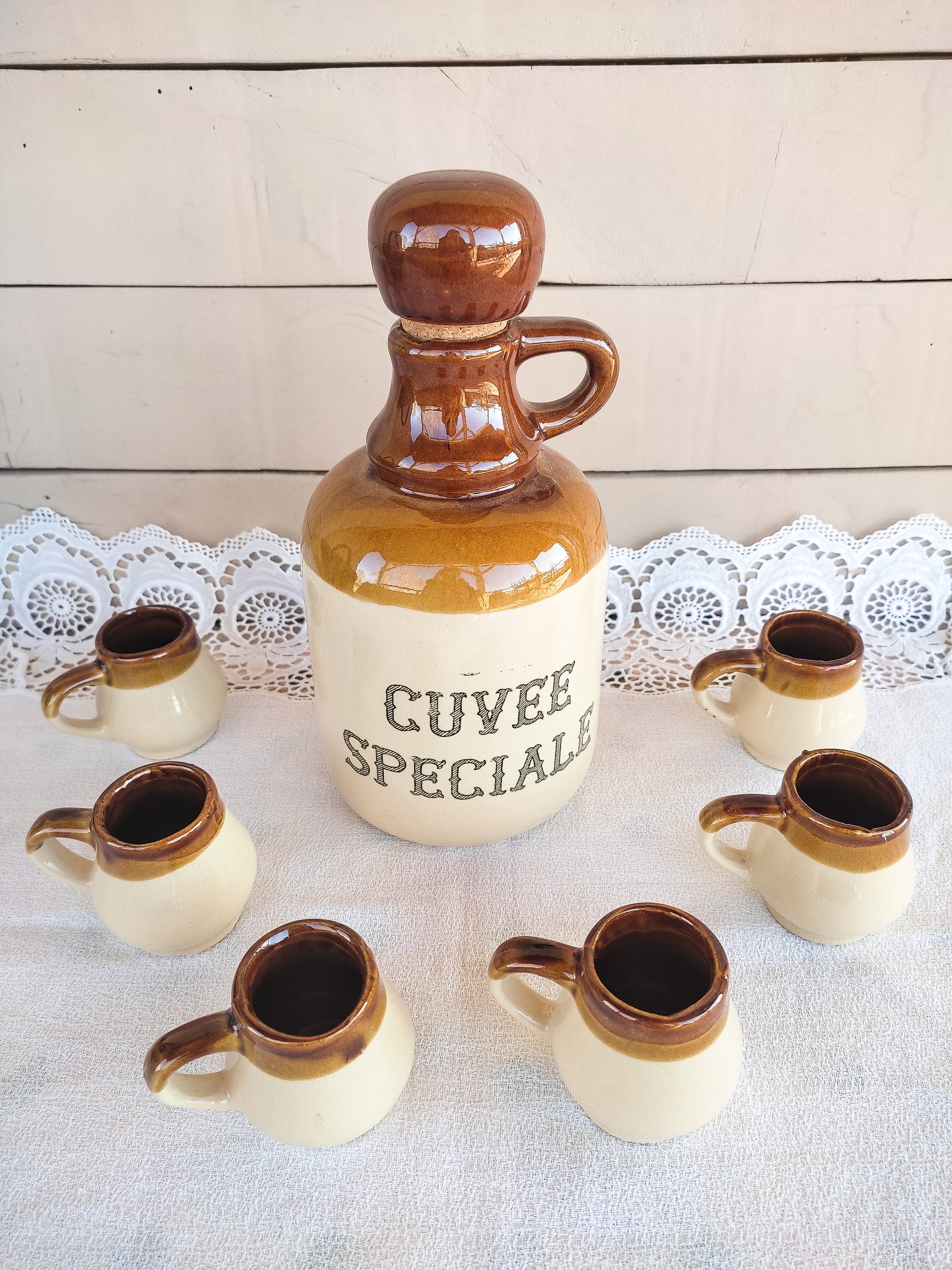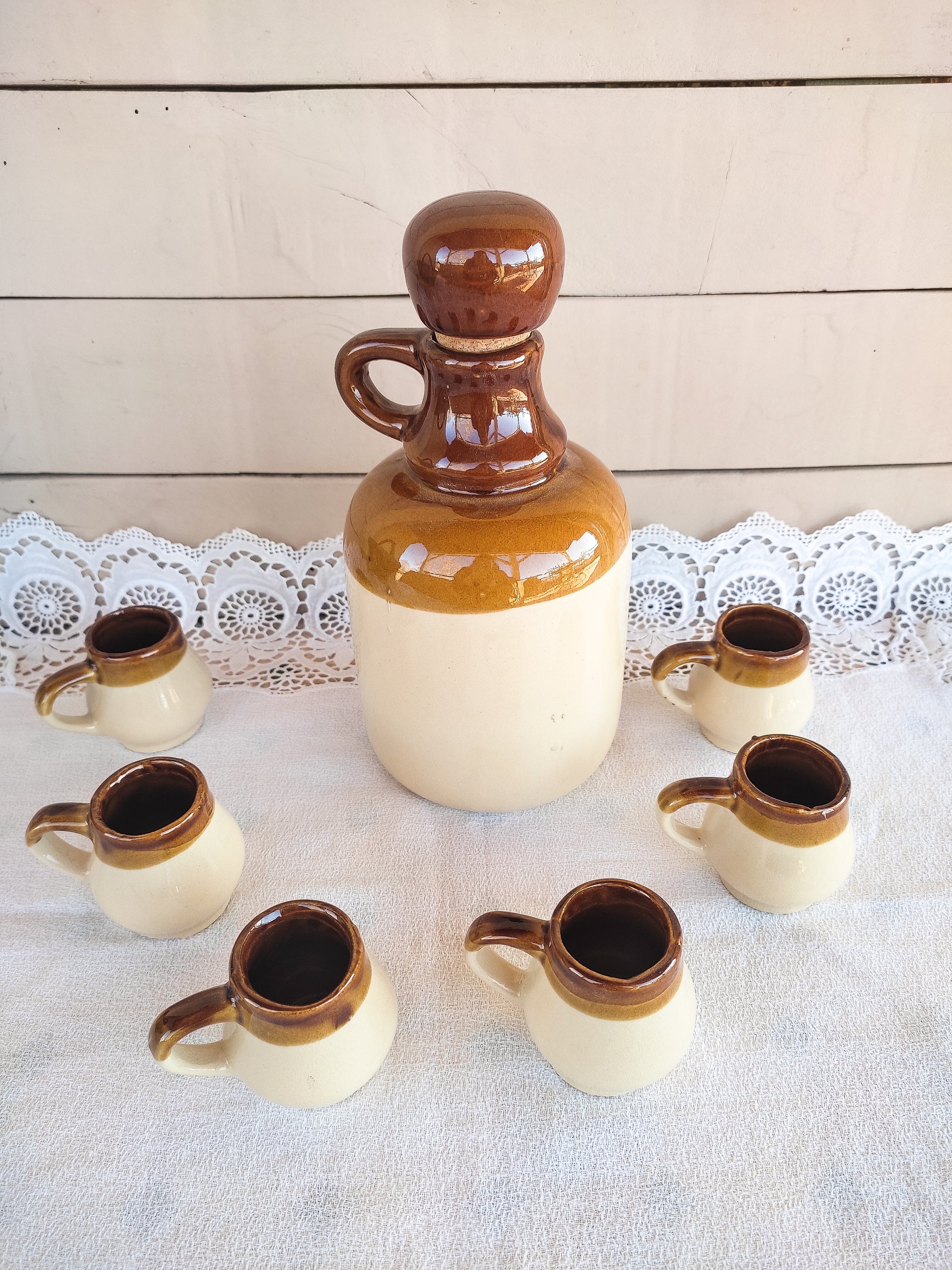 Service à liqueur vintage, composé d'une bouteille et 6 petites tasses en grès.