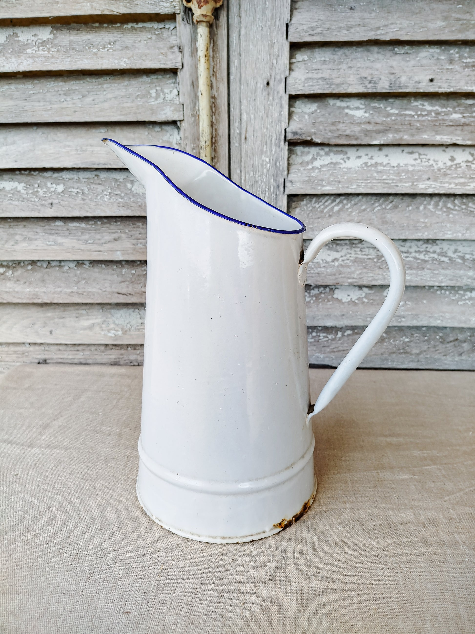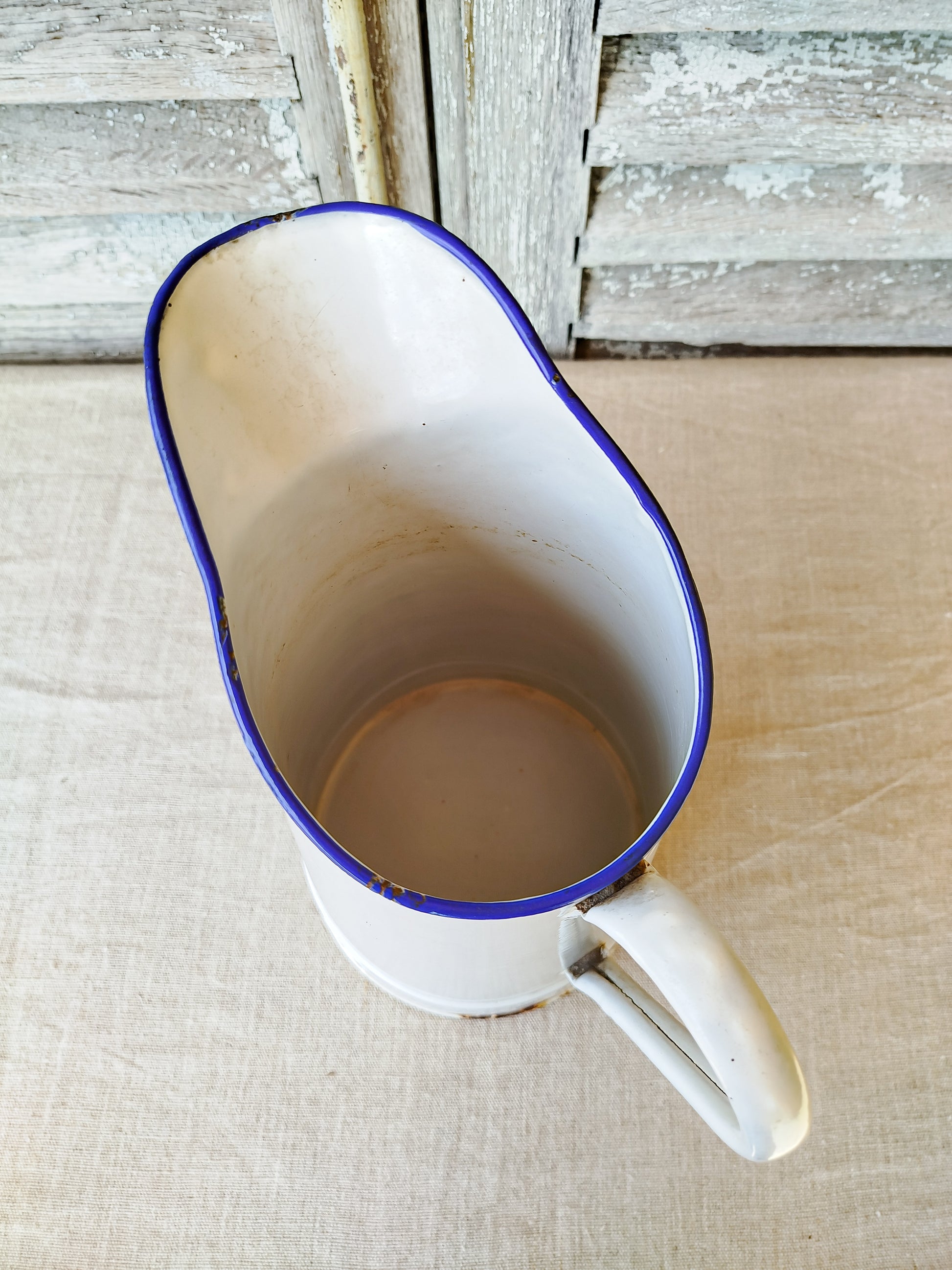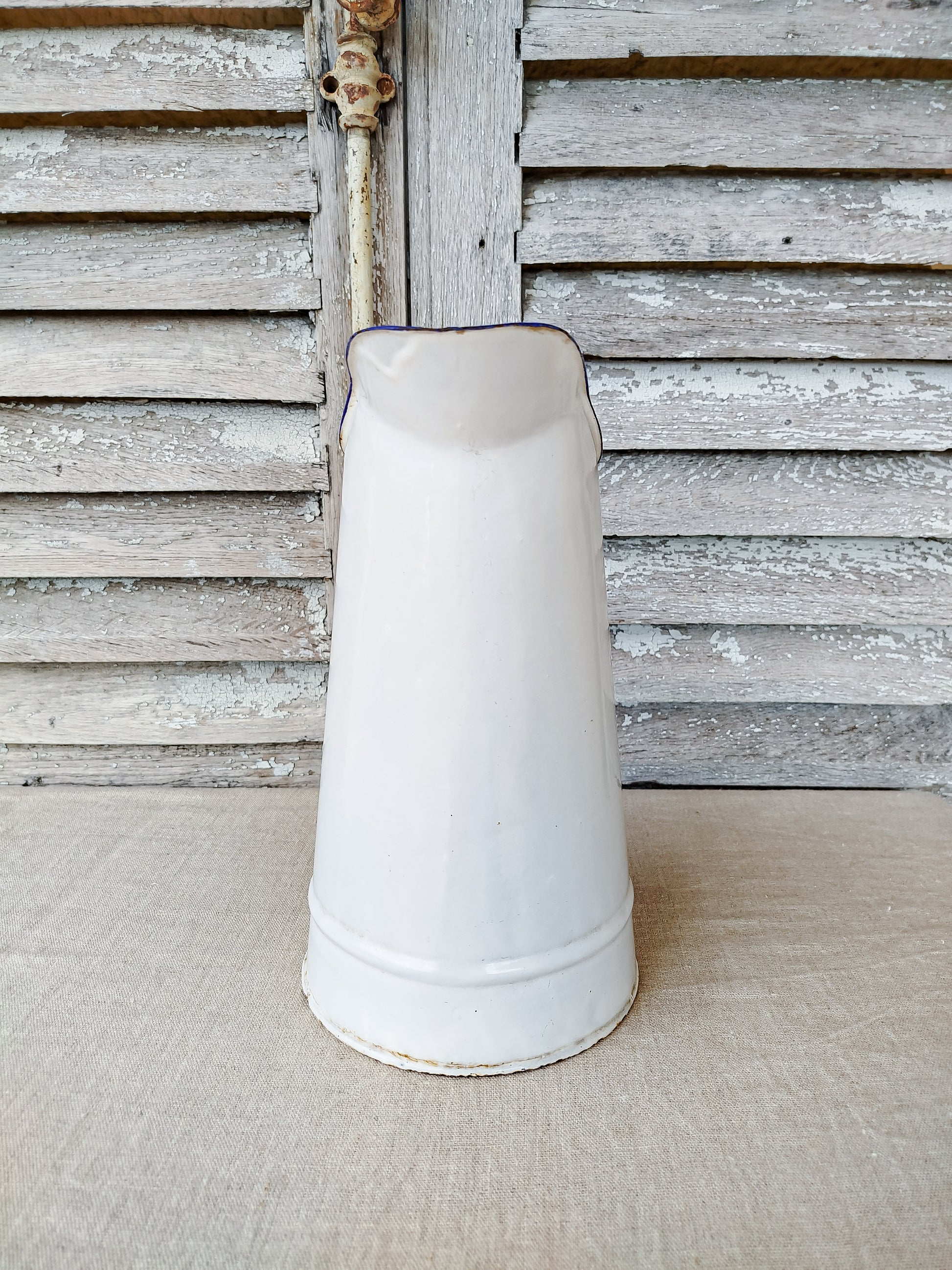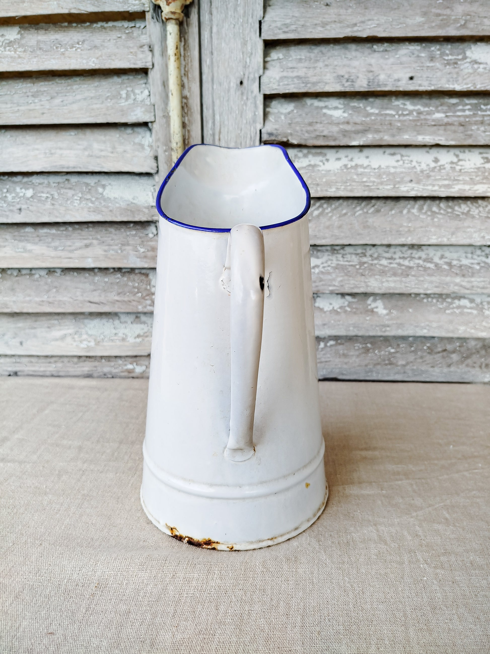 En tôle émaillée de couleur blanche et liseré bleu sur les contours du bec verseur.