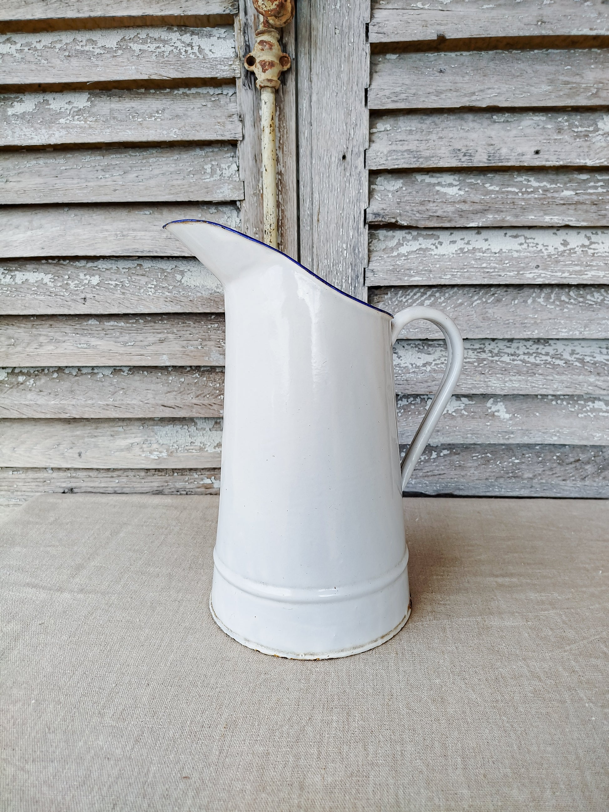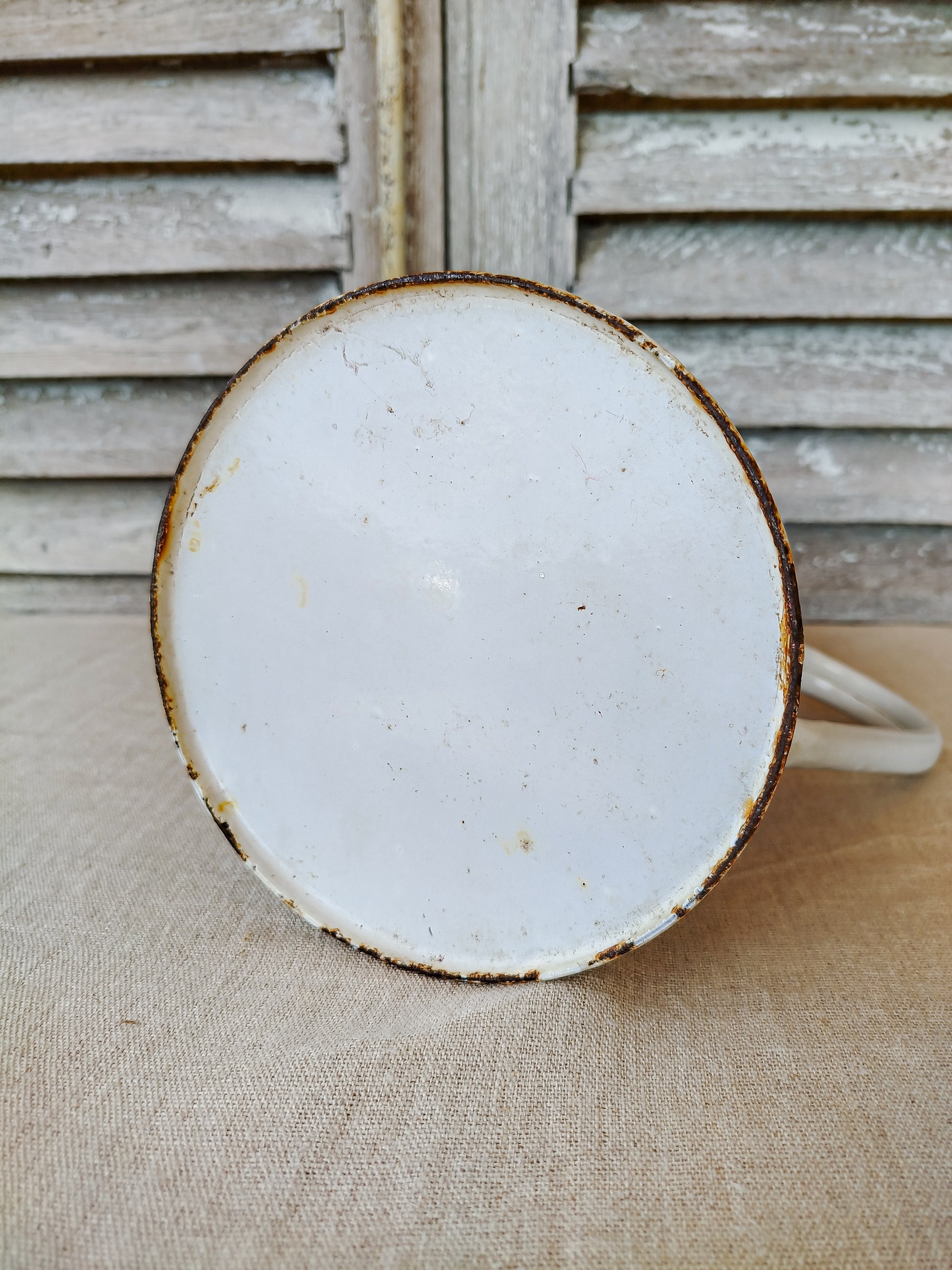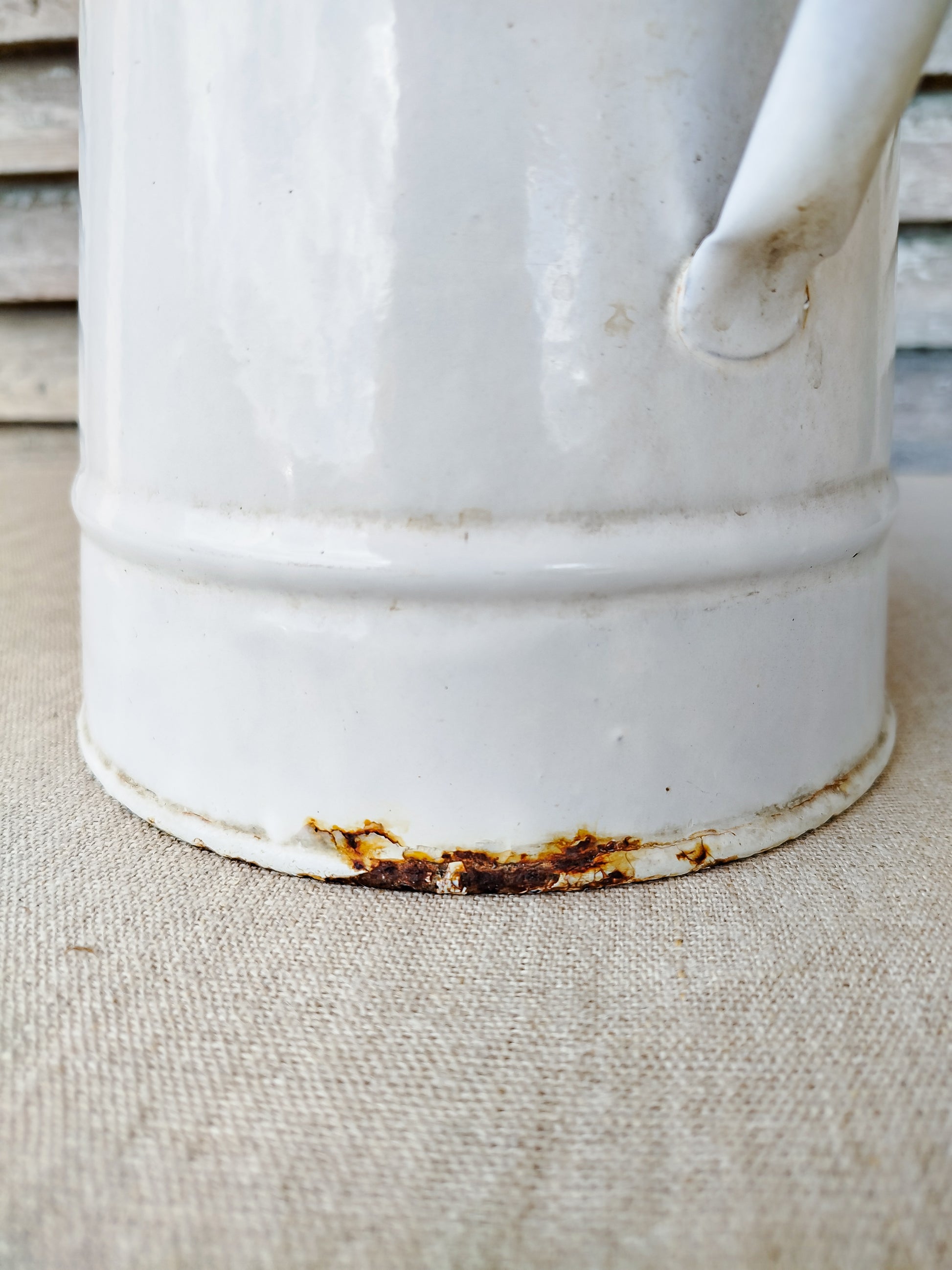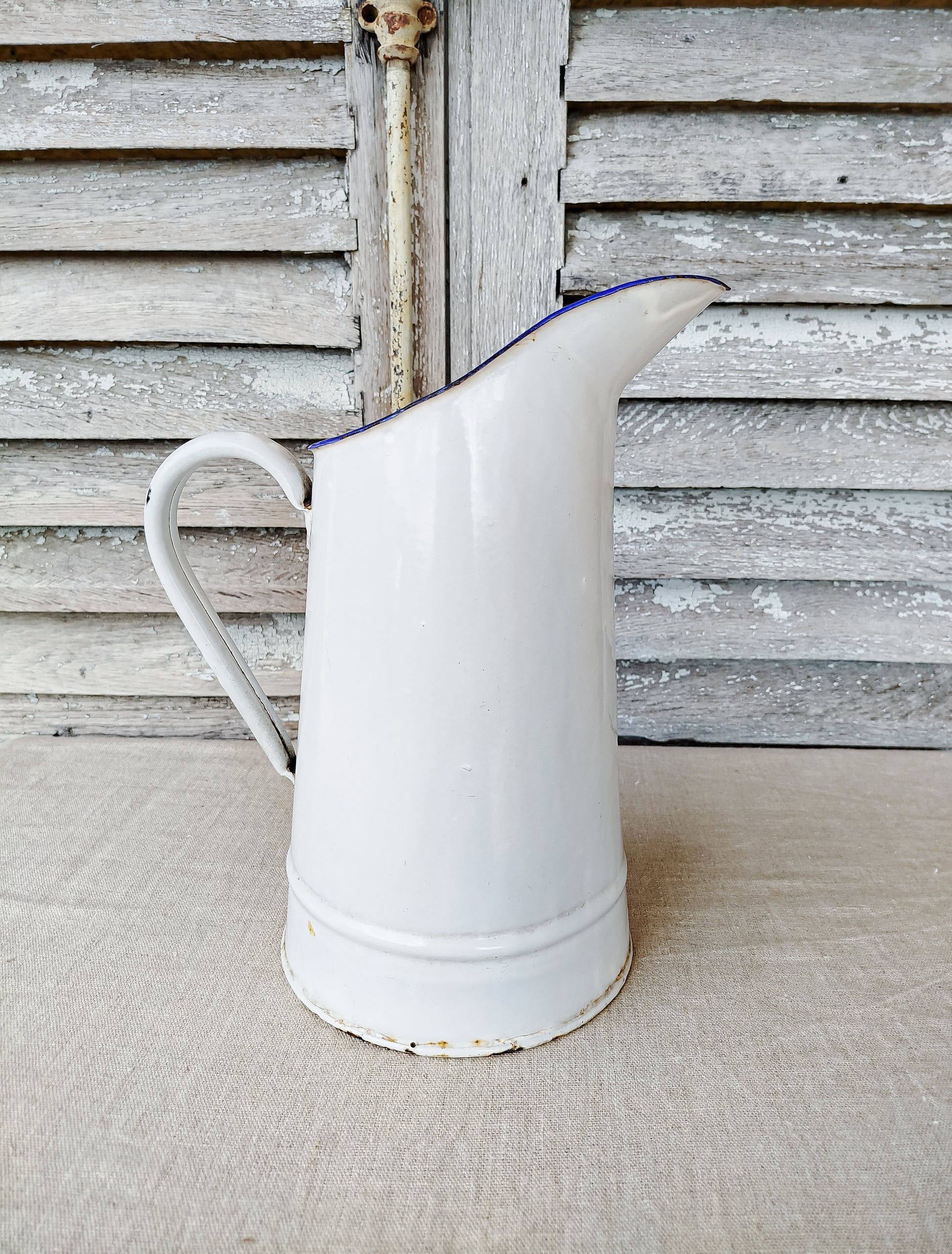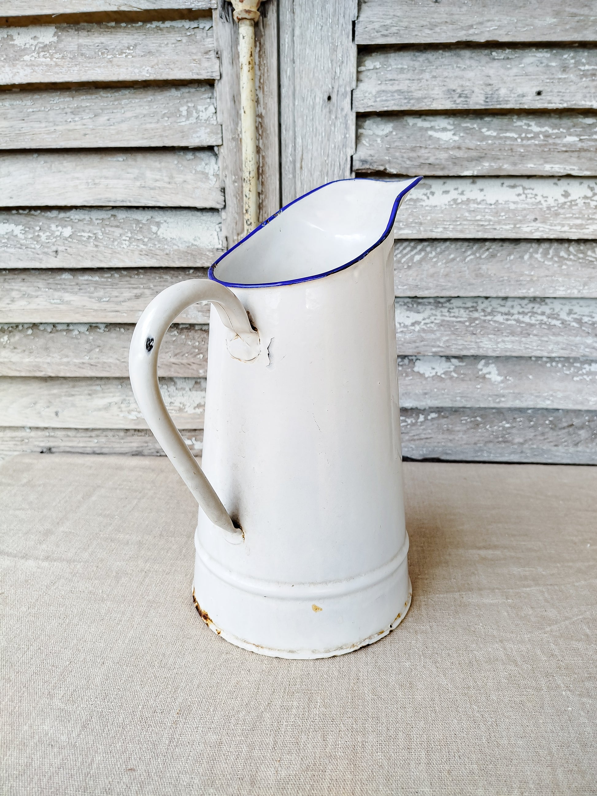 En tôle émaillée de couleur blanche et liseré bleu sur les contours du bec verseur.