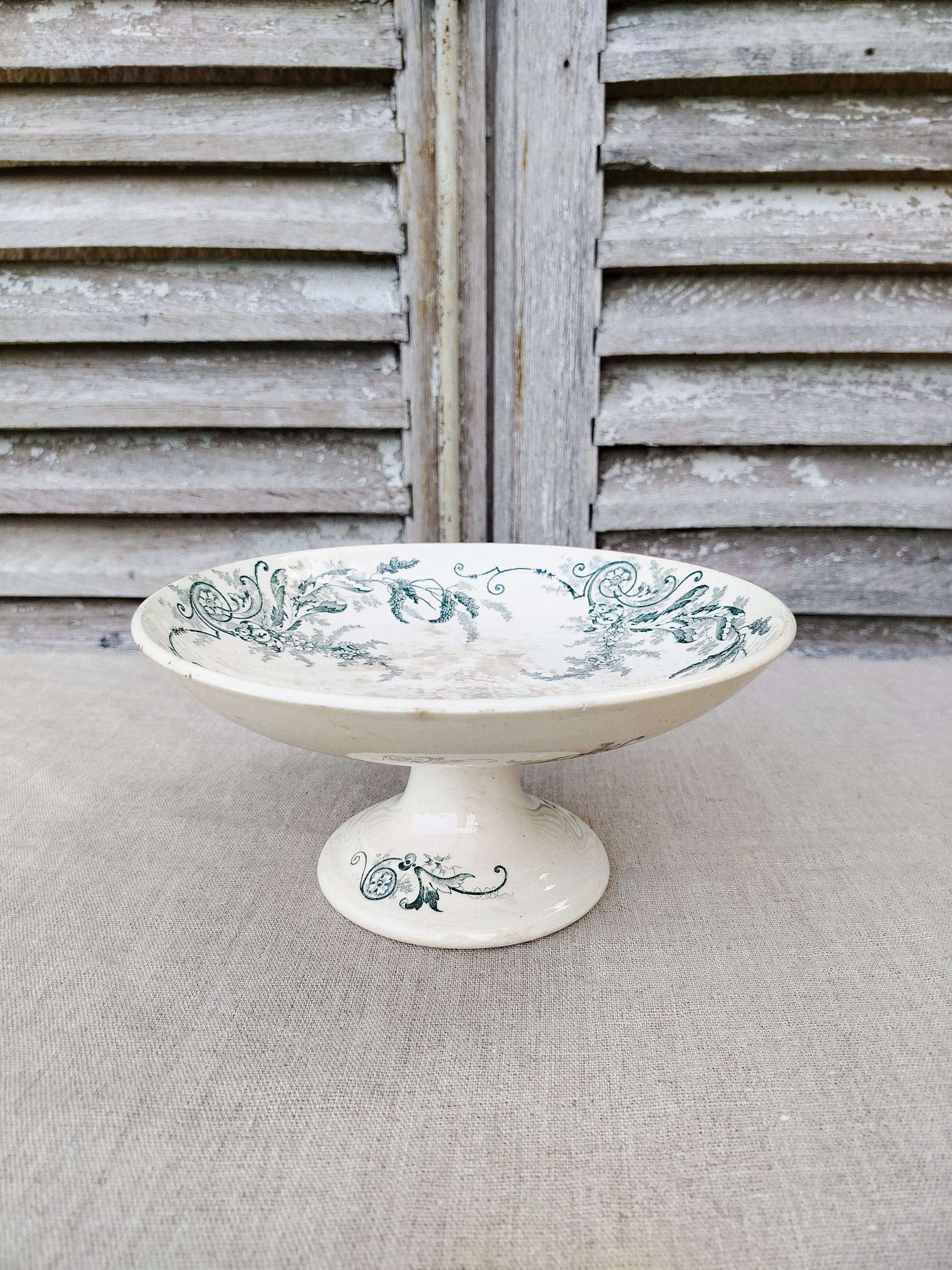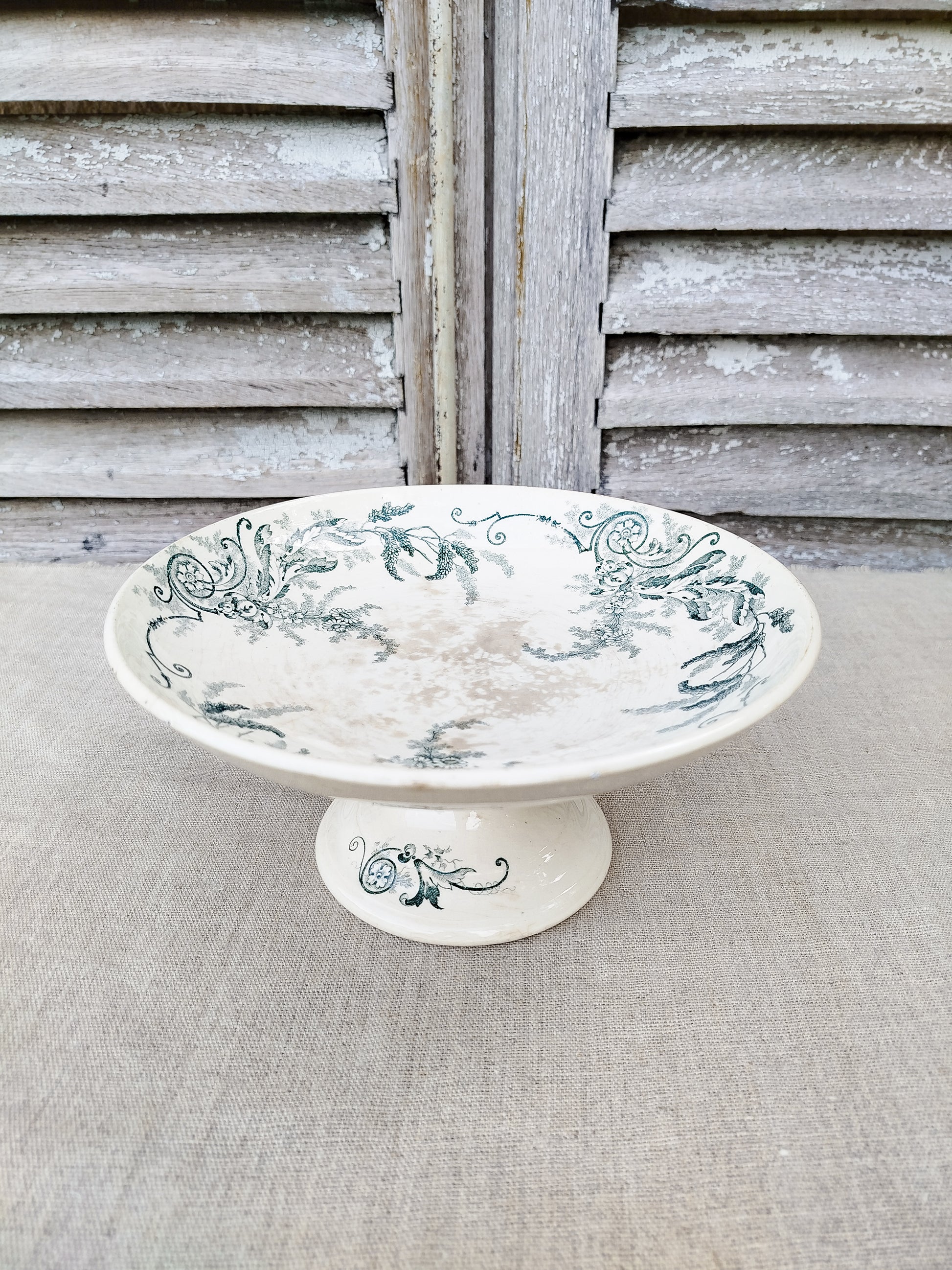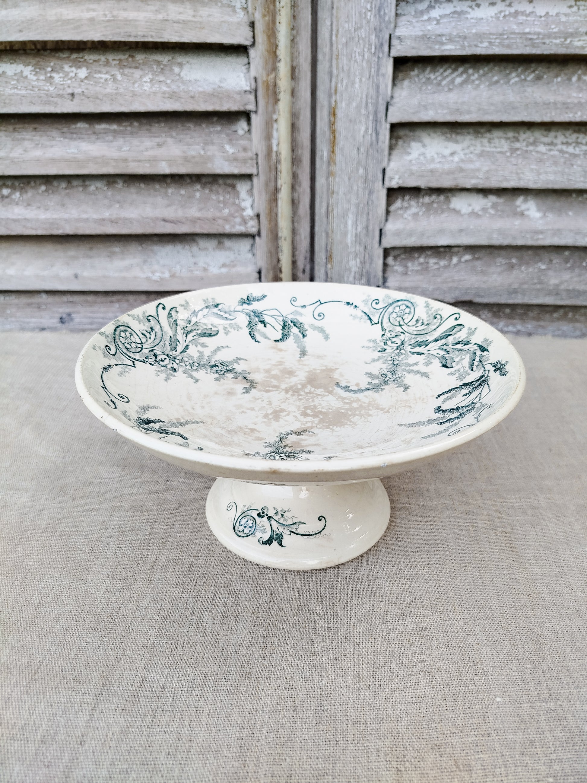 La compotier est patiné par le temps sur le dessus du plateau, ce qui se traduit par des tâches beiges.