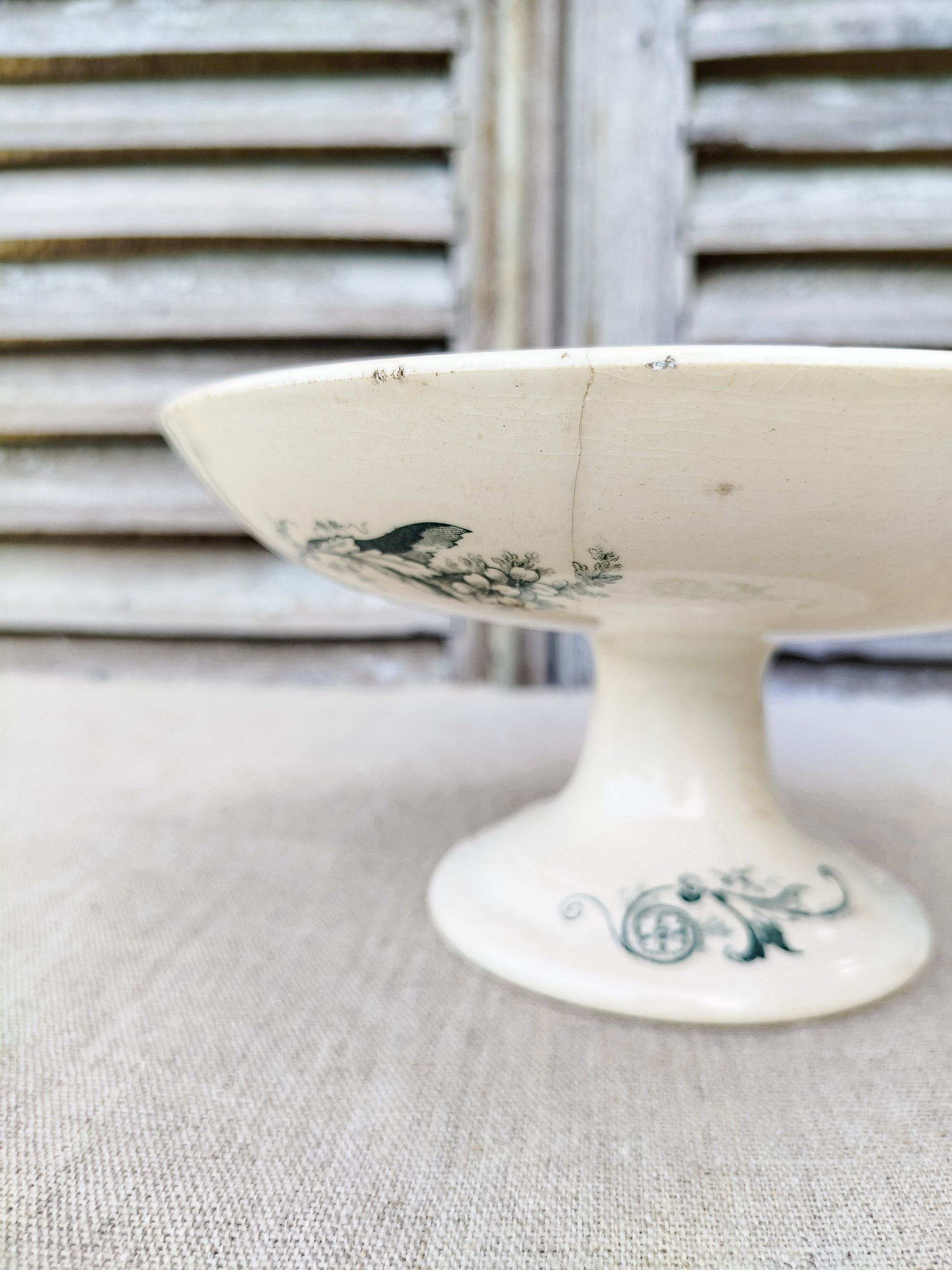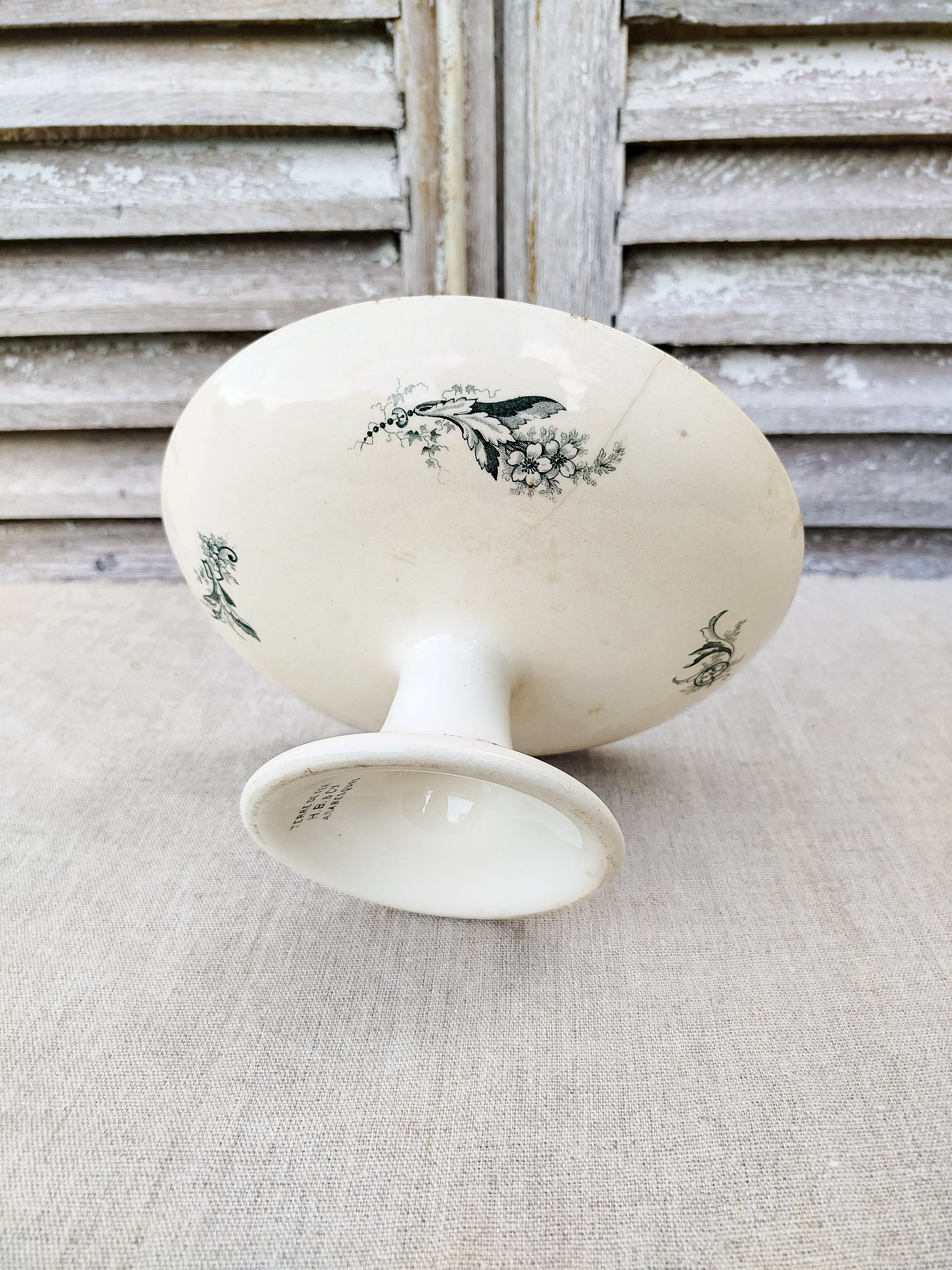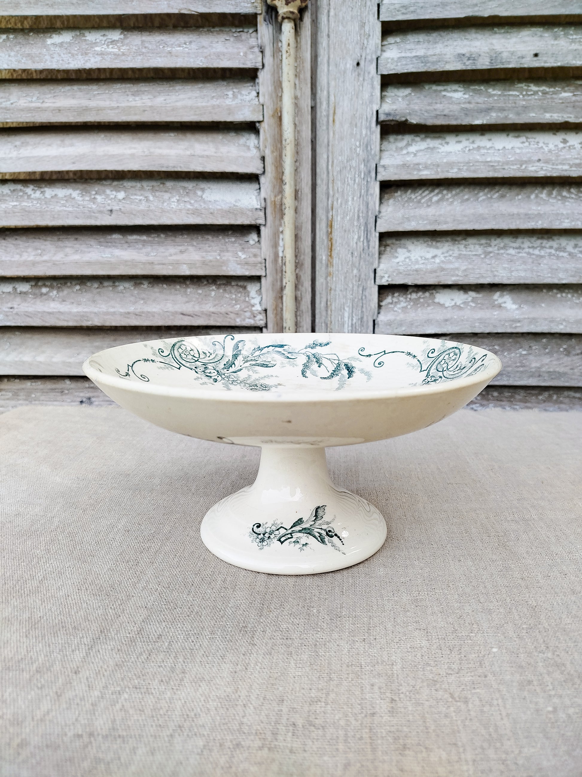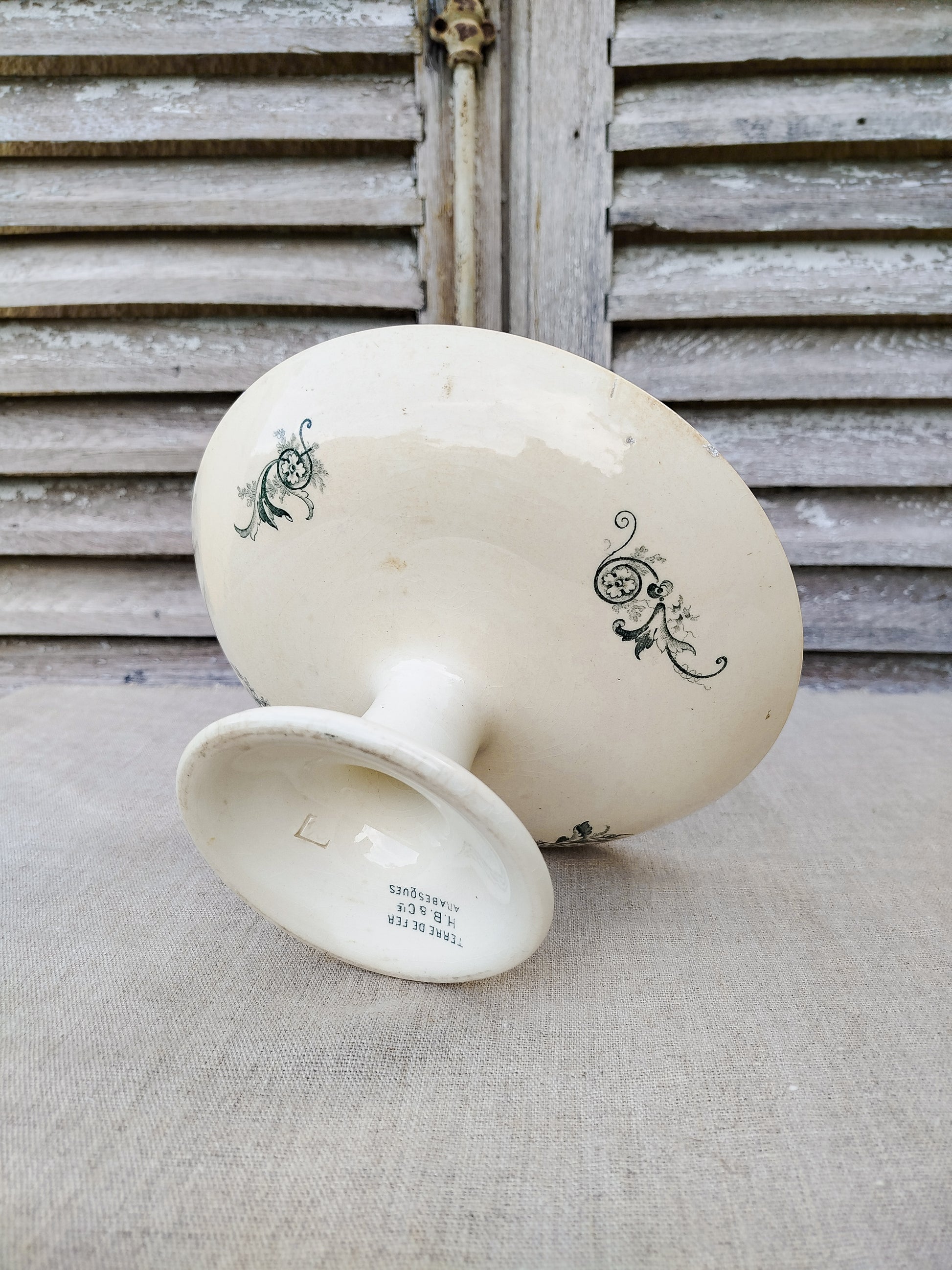 La compotier est patiné par le temps sur le dessus du plateau, ce qui se traduit par des tâches beiges.