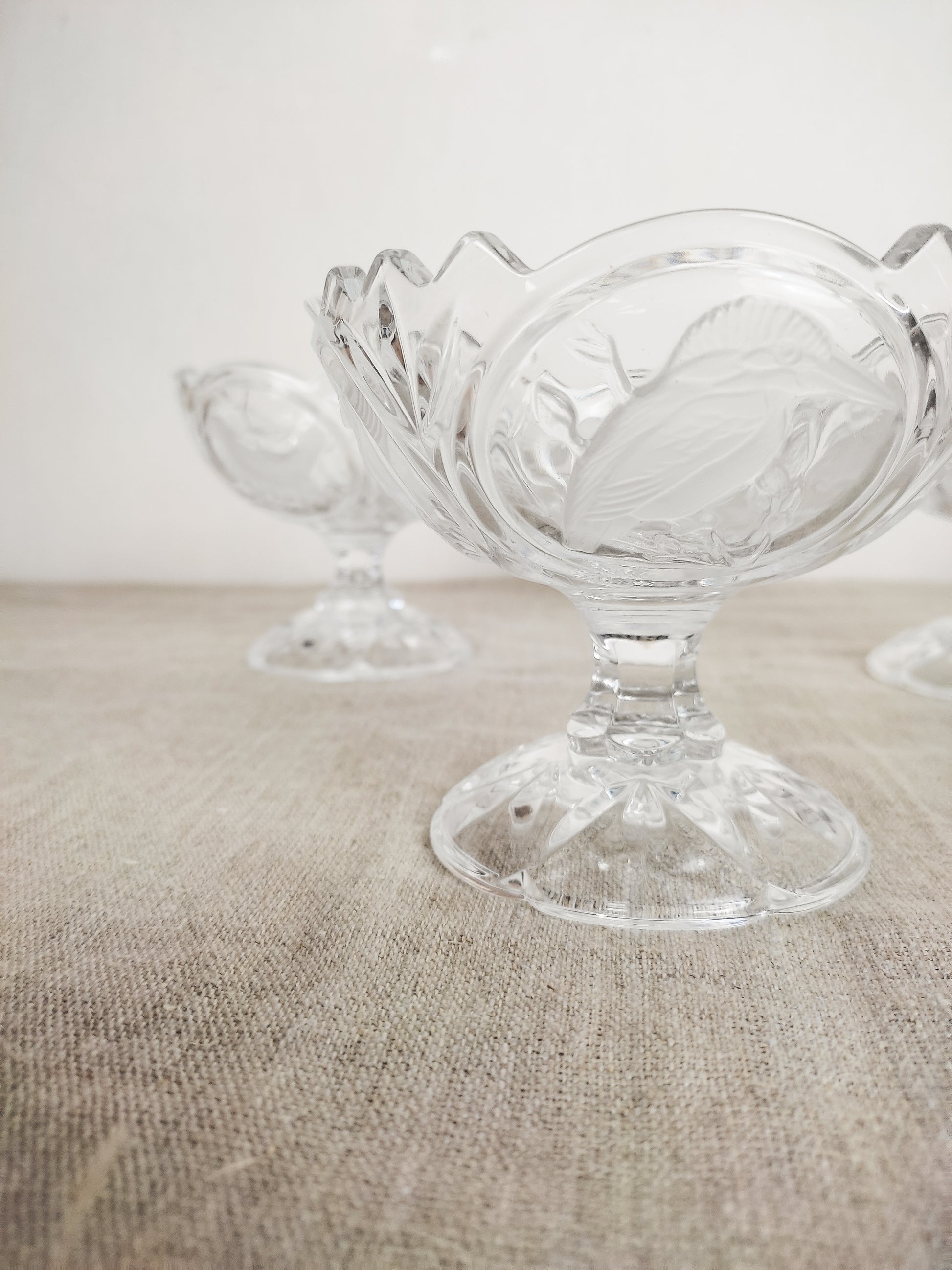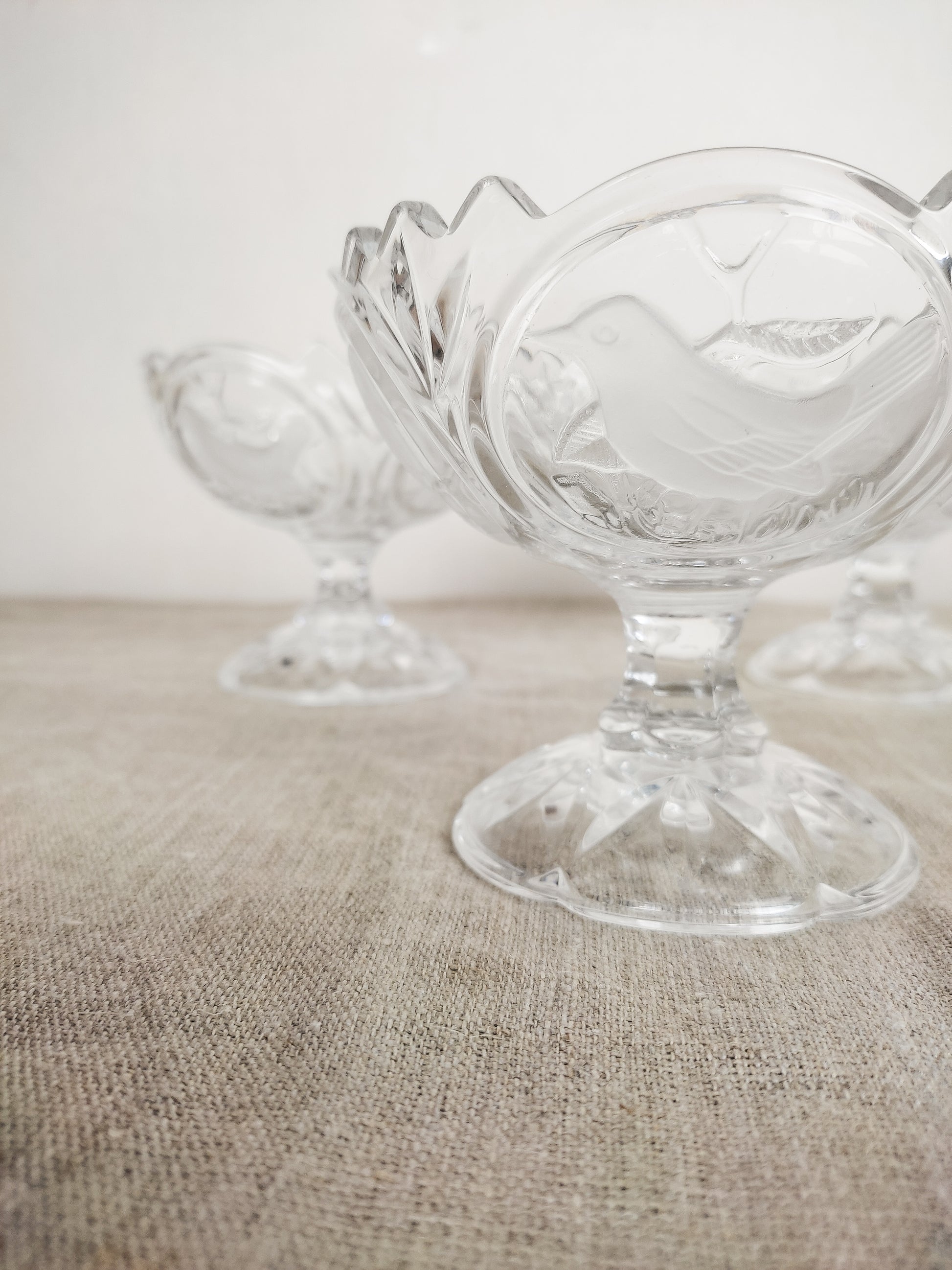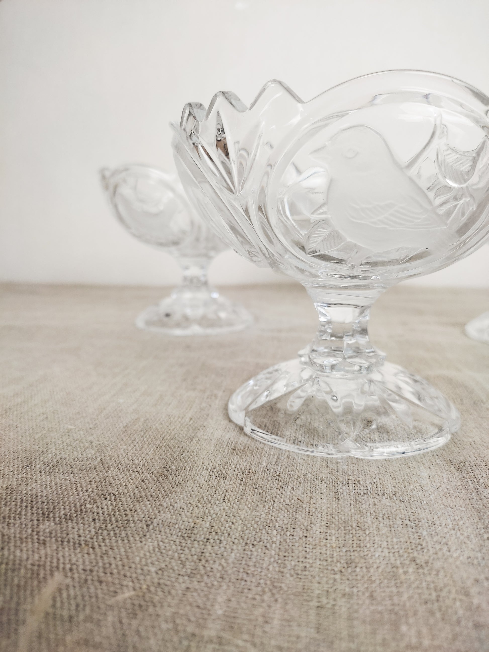Sublimes décors d'oiseaux en relief à la surface du cristal... Quatre oiseaux différents sont illustrés sur chaque coupe.