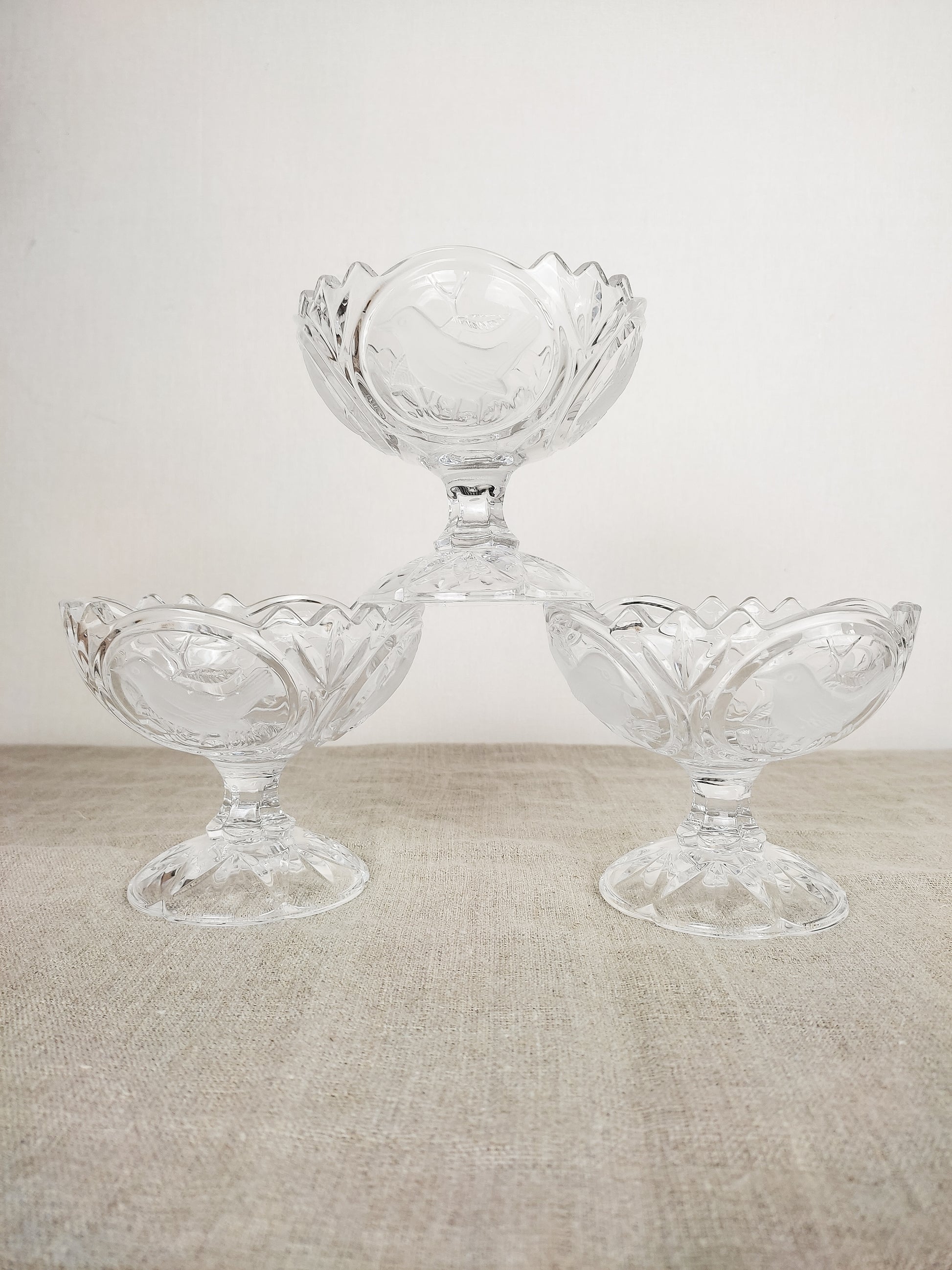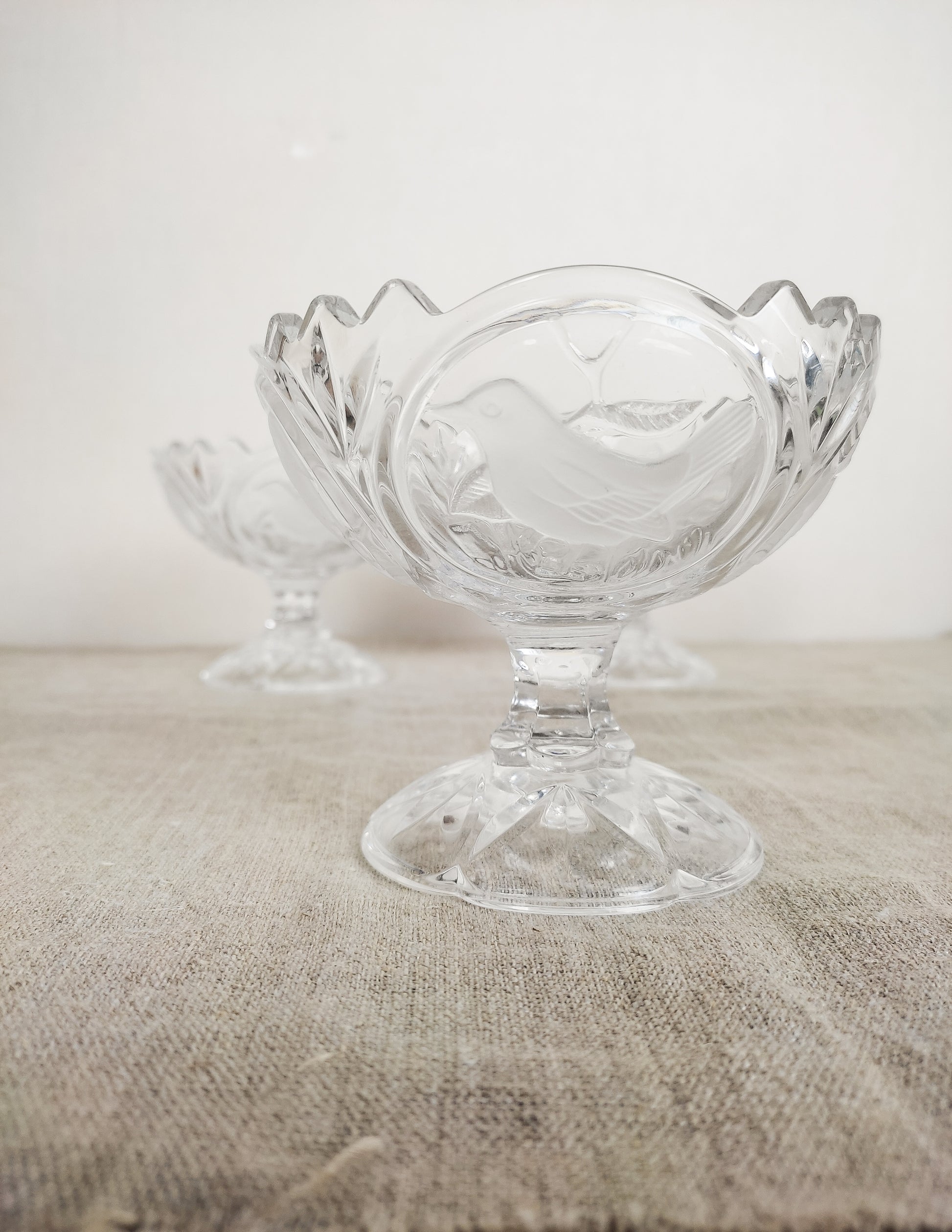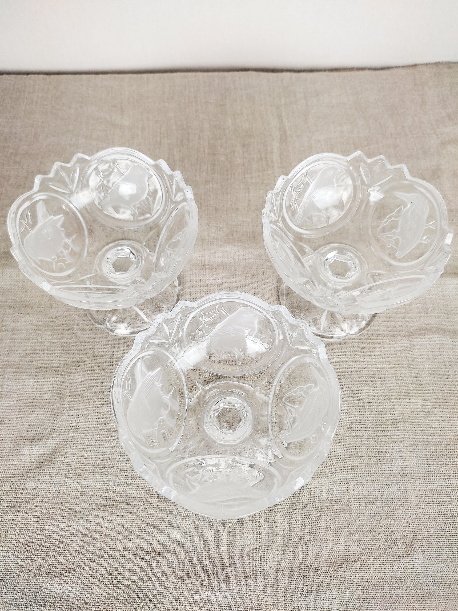 Sublimes décors d'oiseaux en relief à la surface du cristal... Quatre oiseaux différents sont illustrés sur chaque coupe.