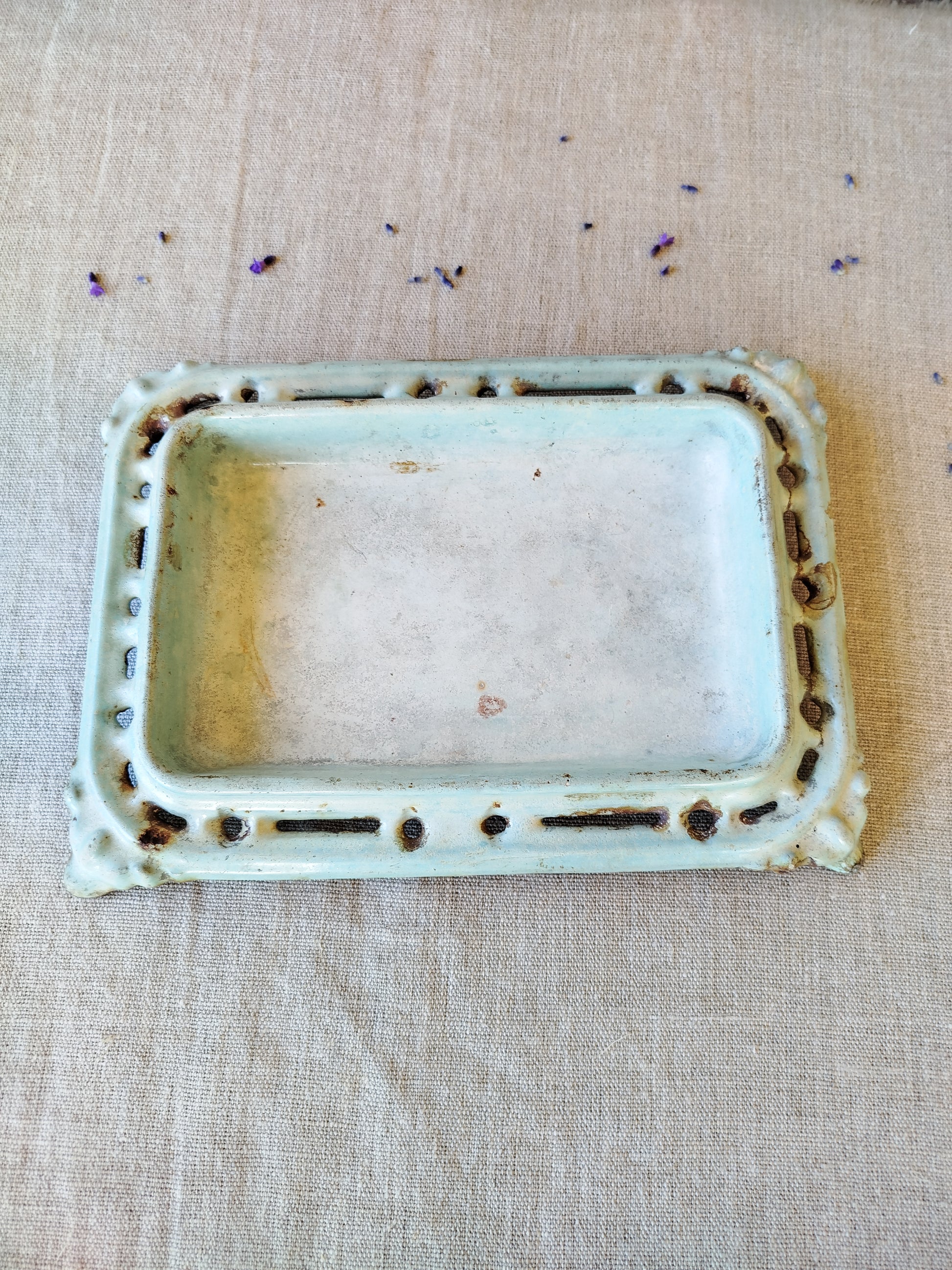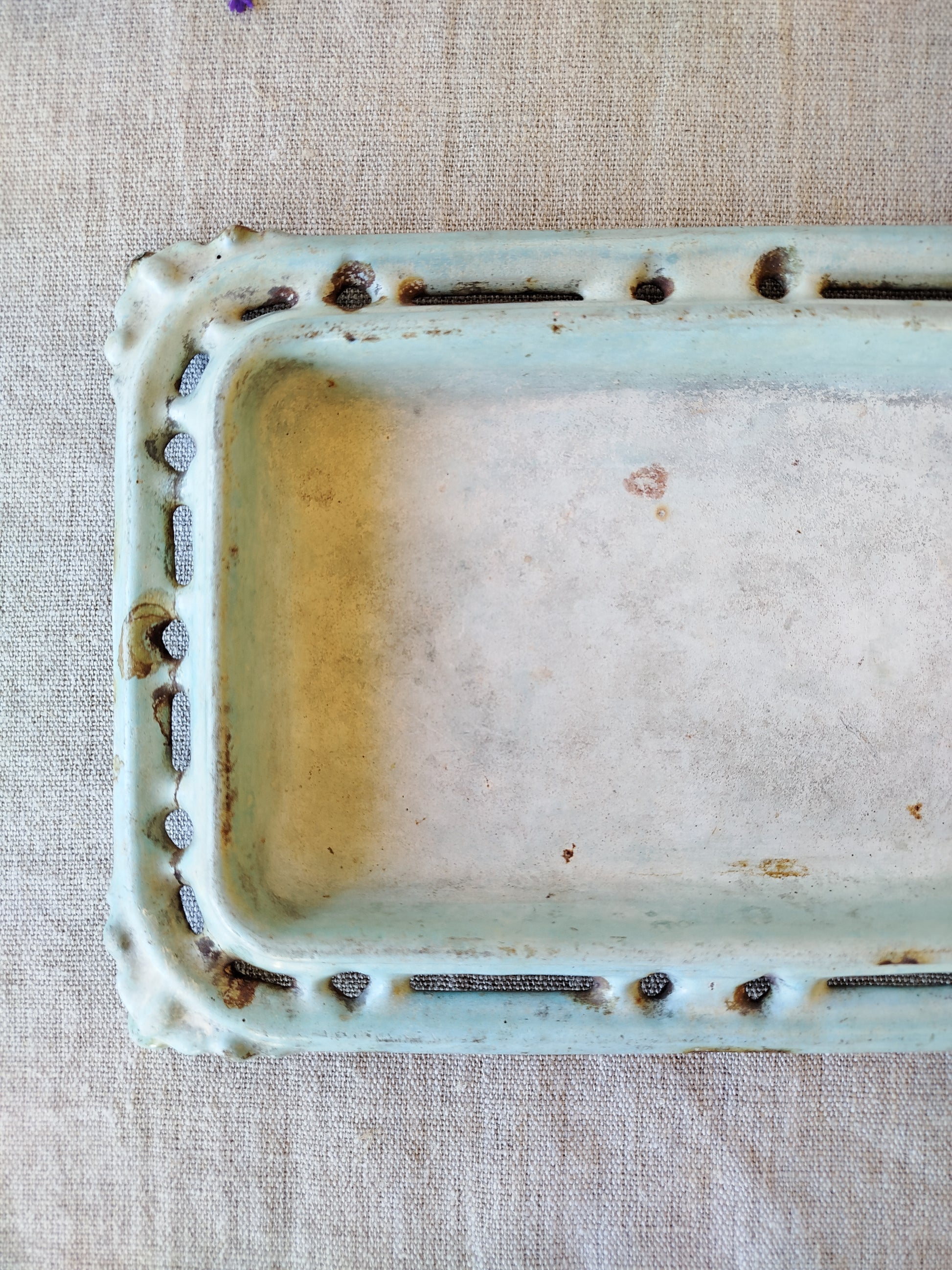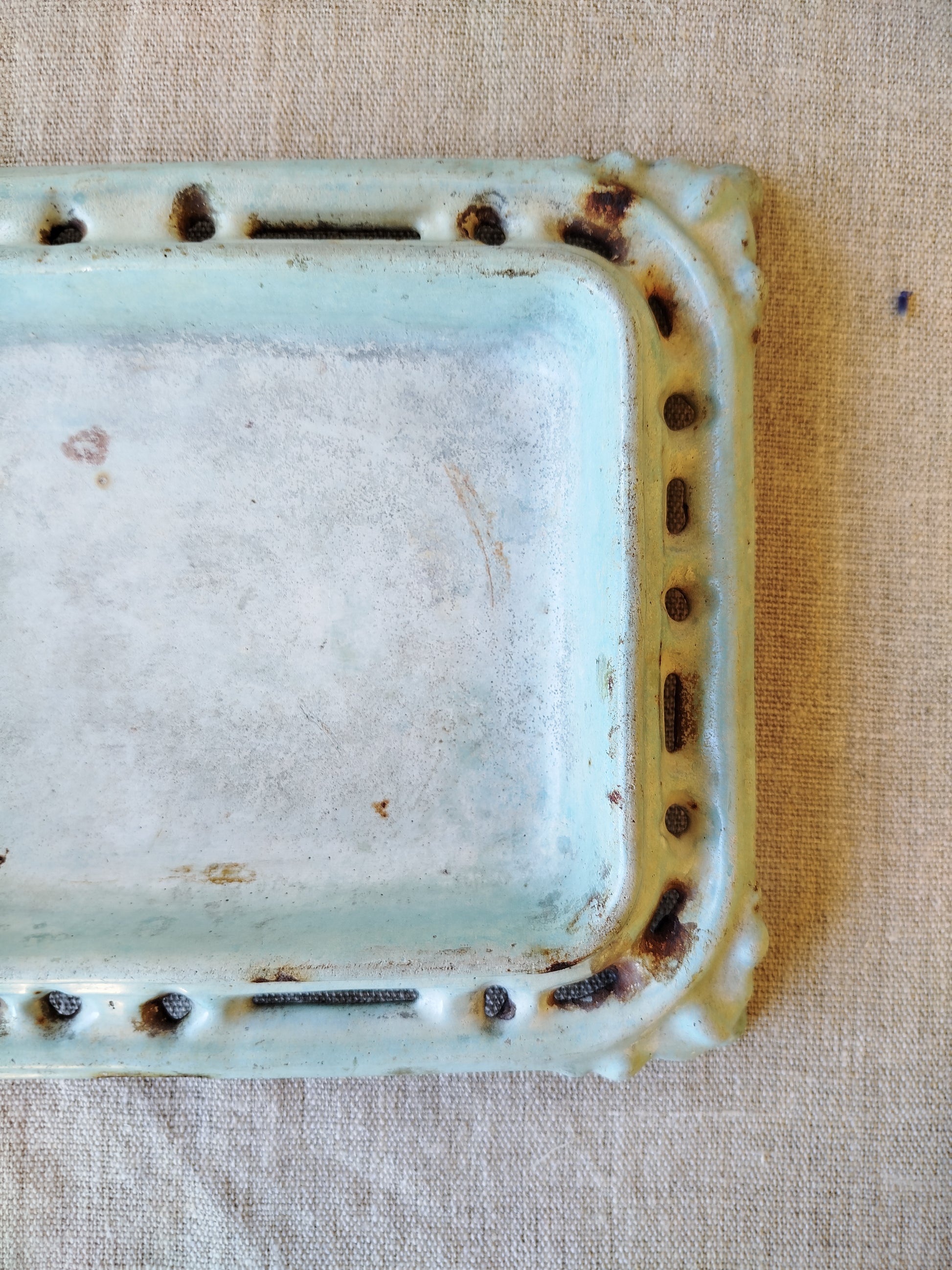 L'émaillage est manquant à divers petits endroits, surtout sur les bordures et les arrêtes, suite à l'usage et au temps, ce qui laisse entrevoir le métal rouillé.
