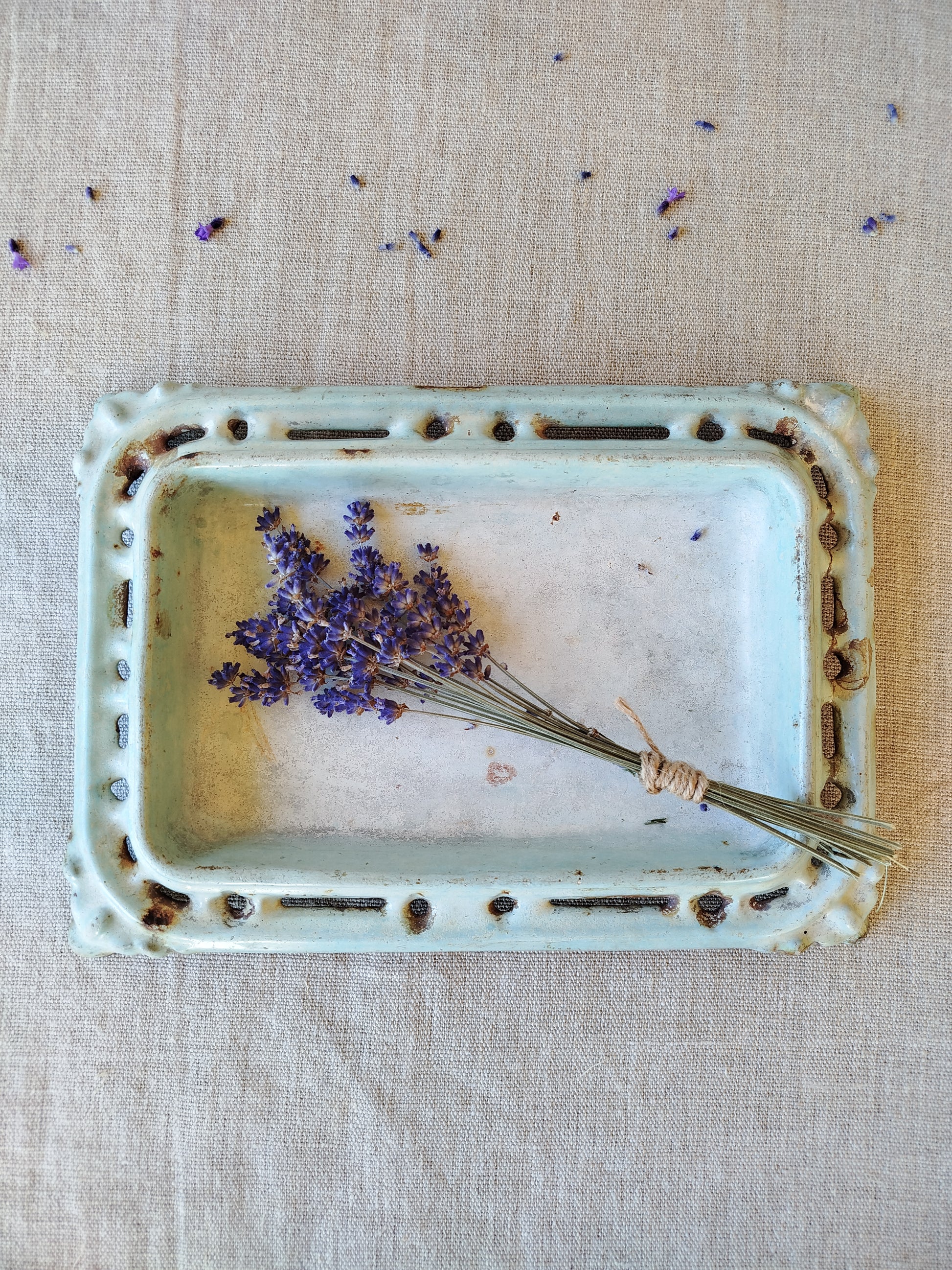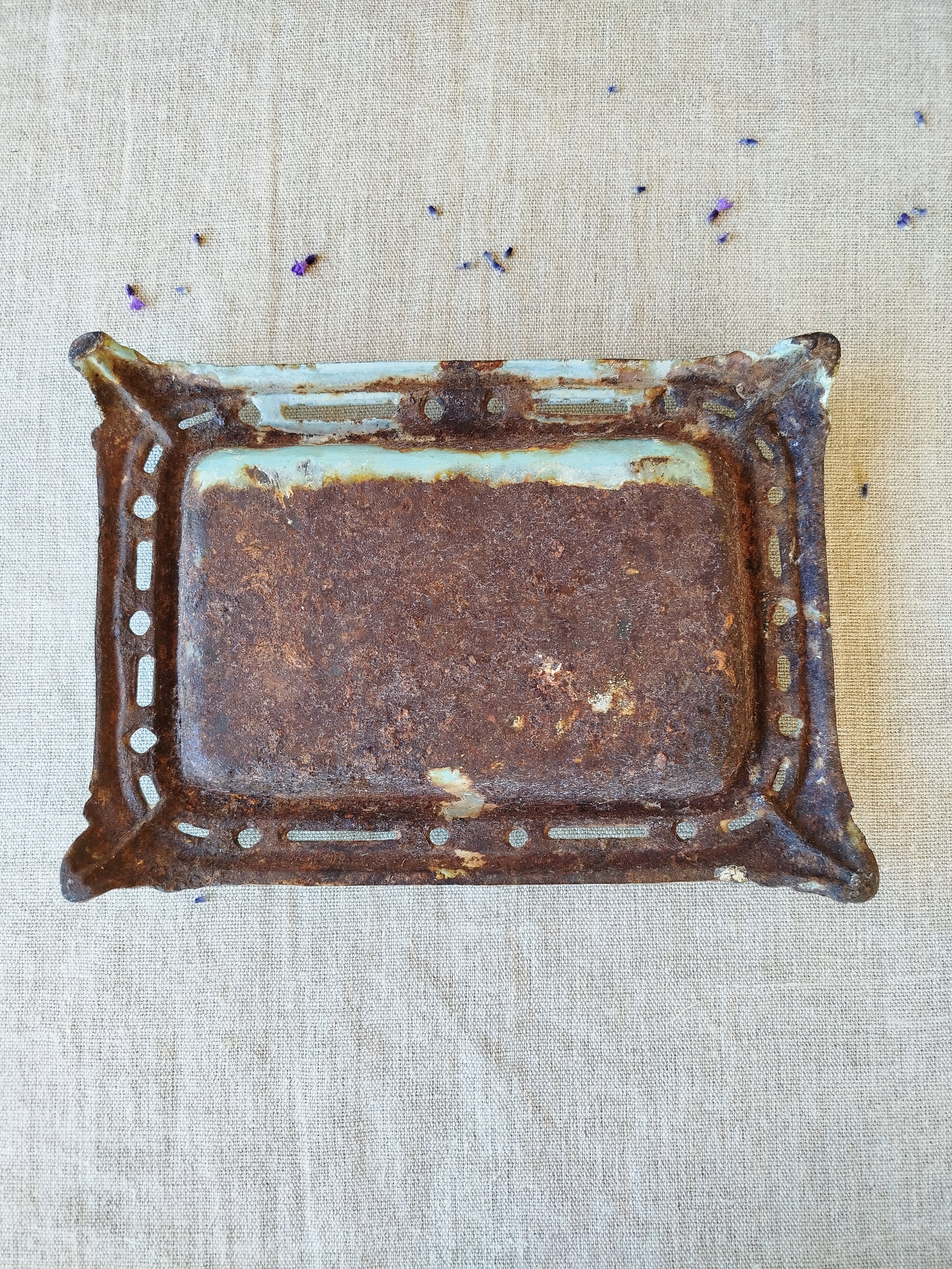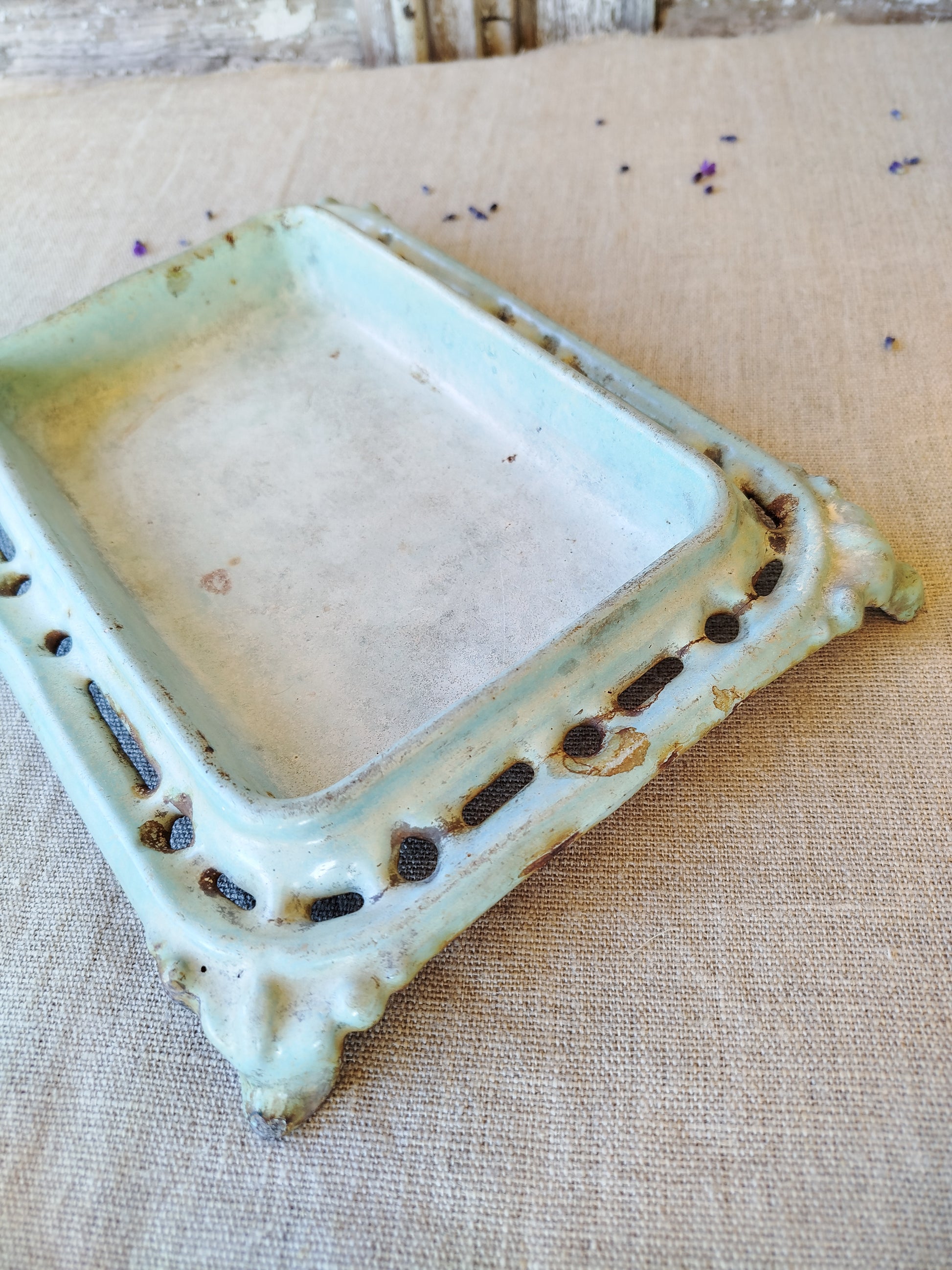 L'émaillage est manquant à divers petits endroits, surtout sur les bordures et les arrêtes, suite à l'usage et au temps, ce qui laisse entrevoir le métal rouillé.