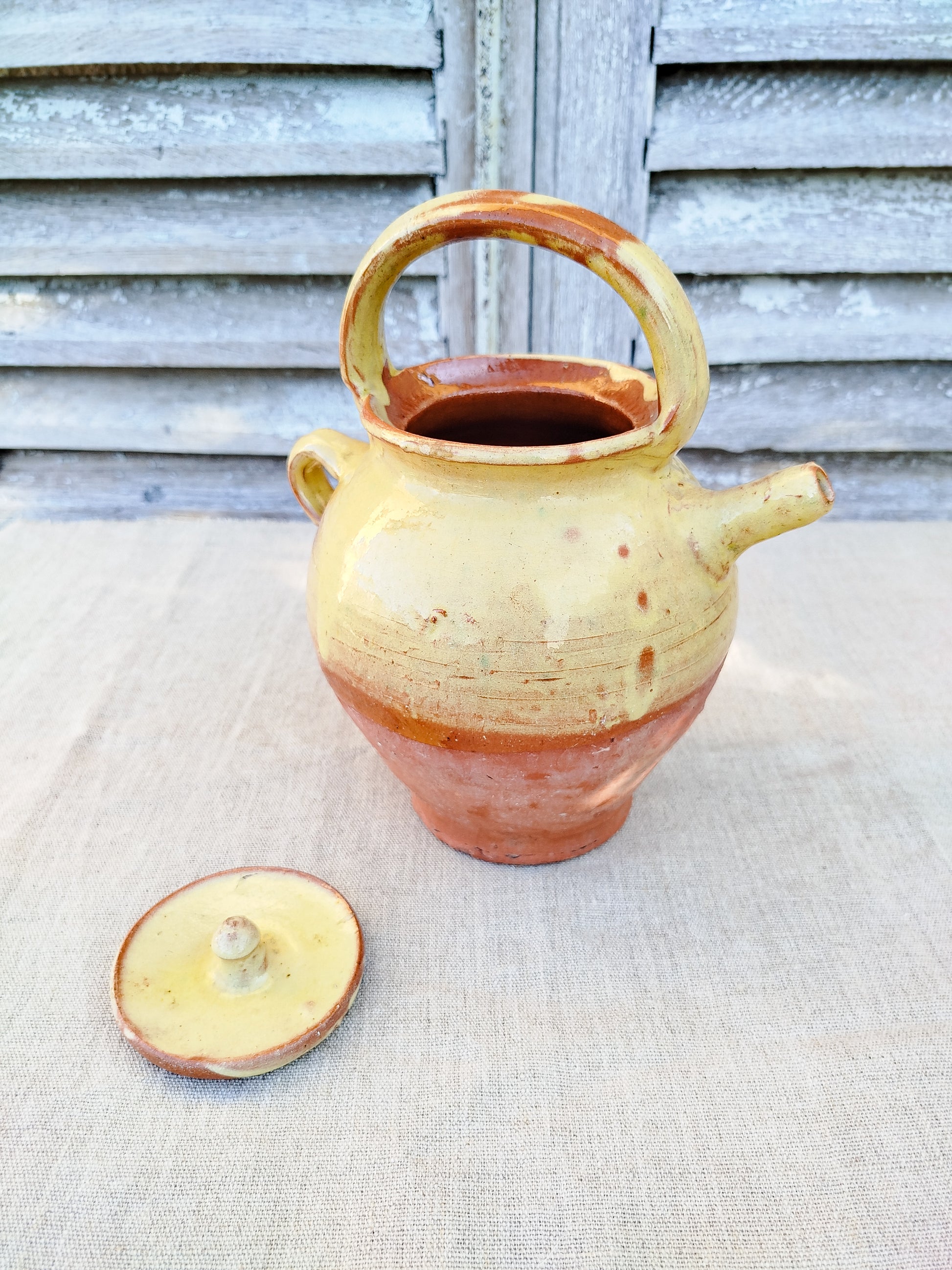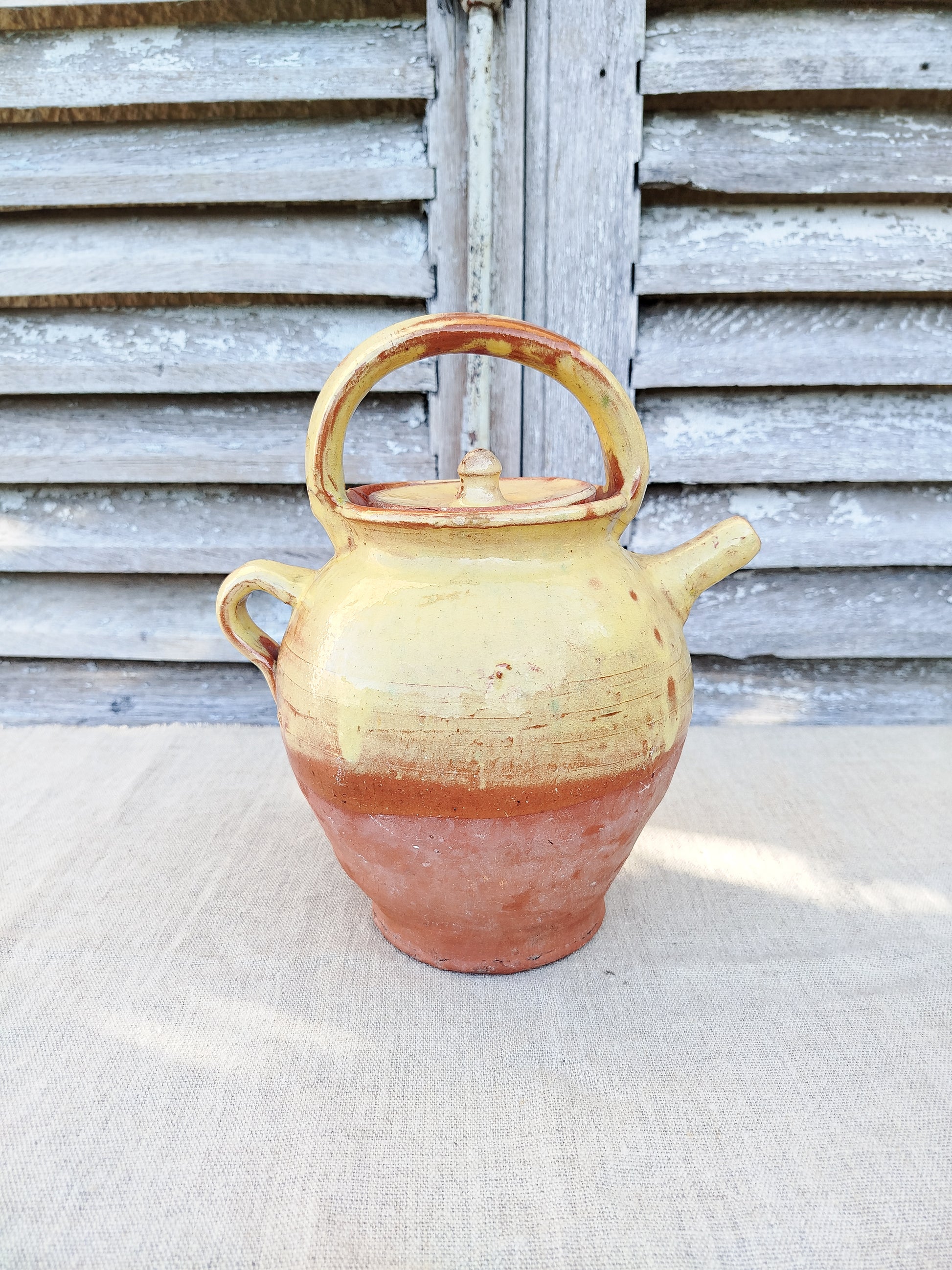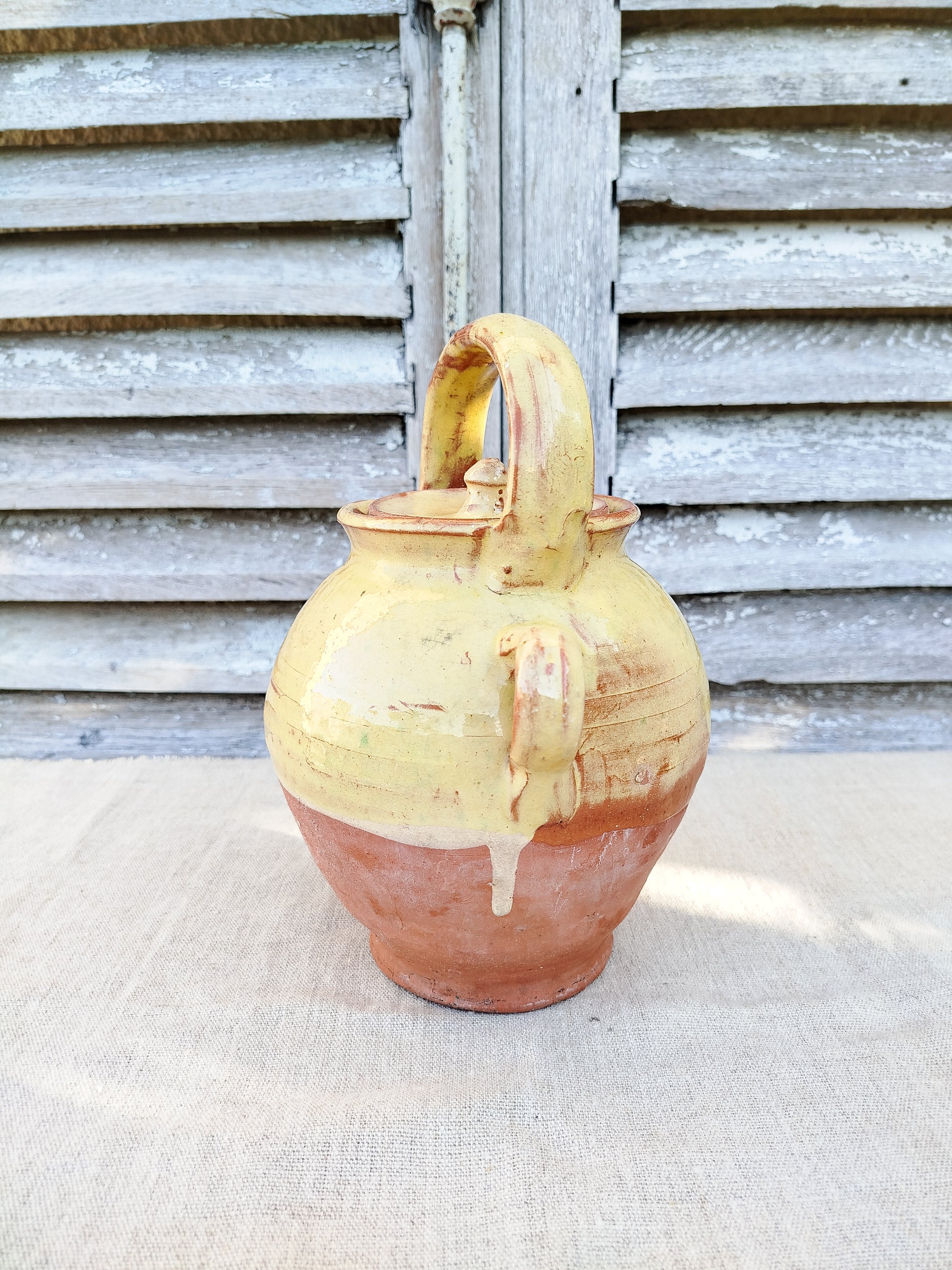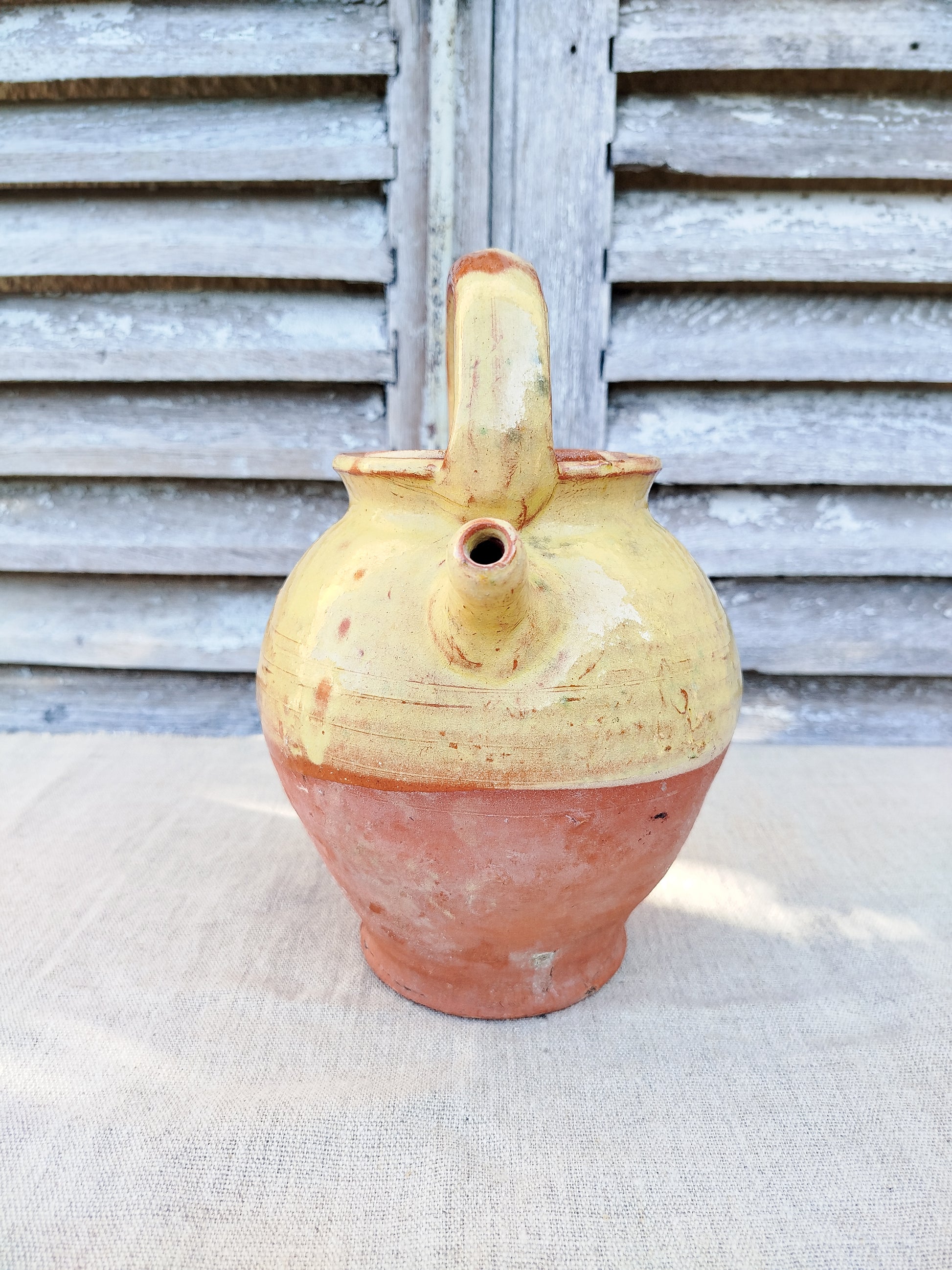 La cruche est émaillée de couleur jaune sur le haut, laissant la base brute.