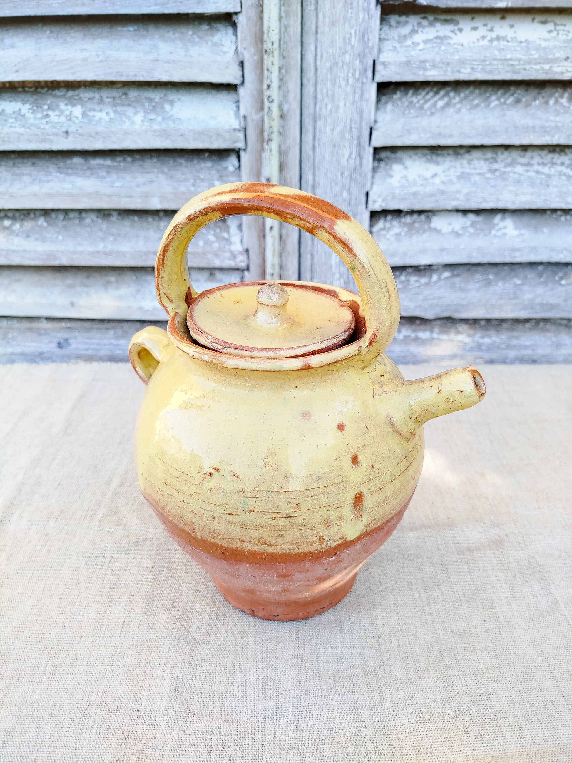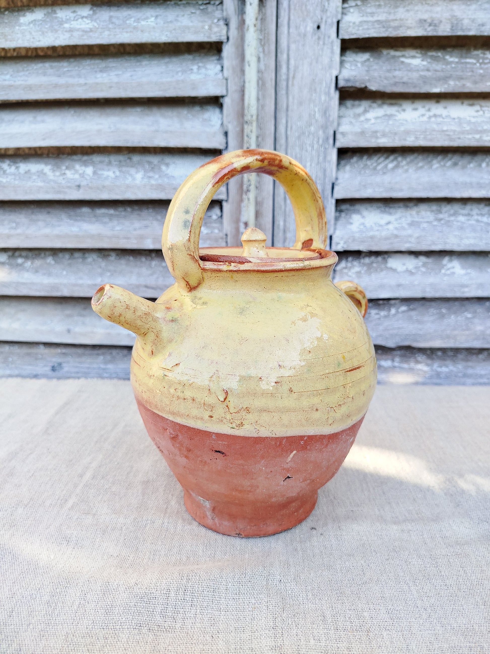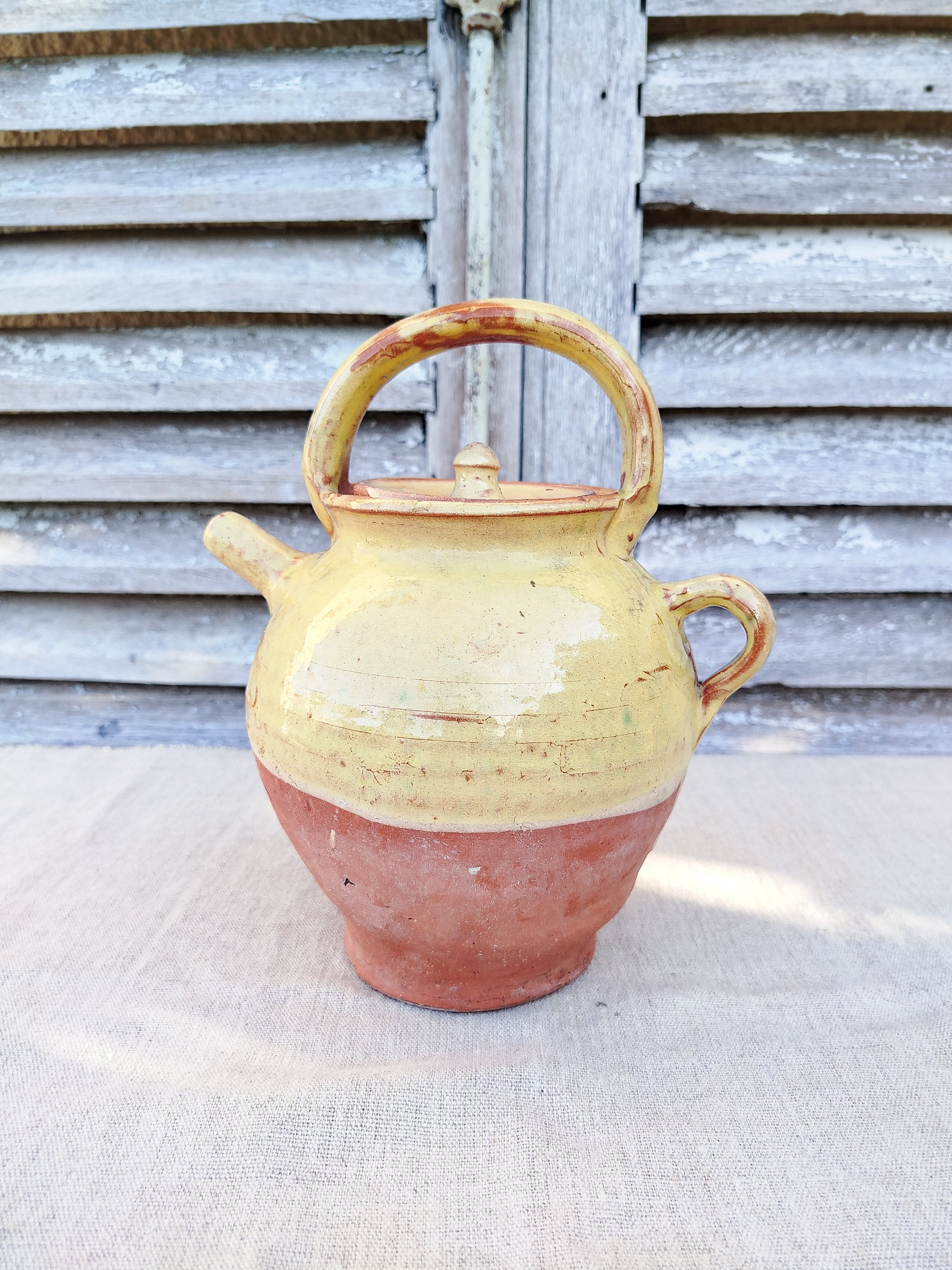 La cruche est émaillée de couleur jaune sur le haut, laissant la base brute.