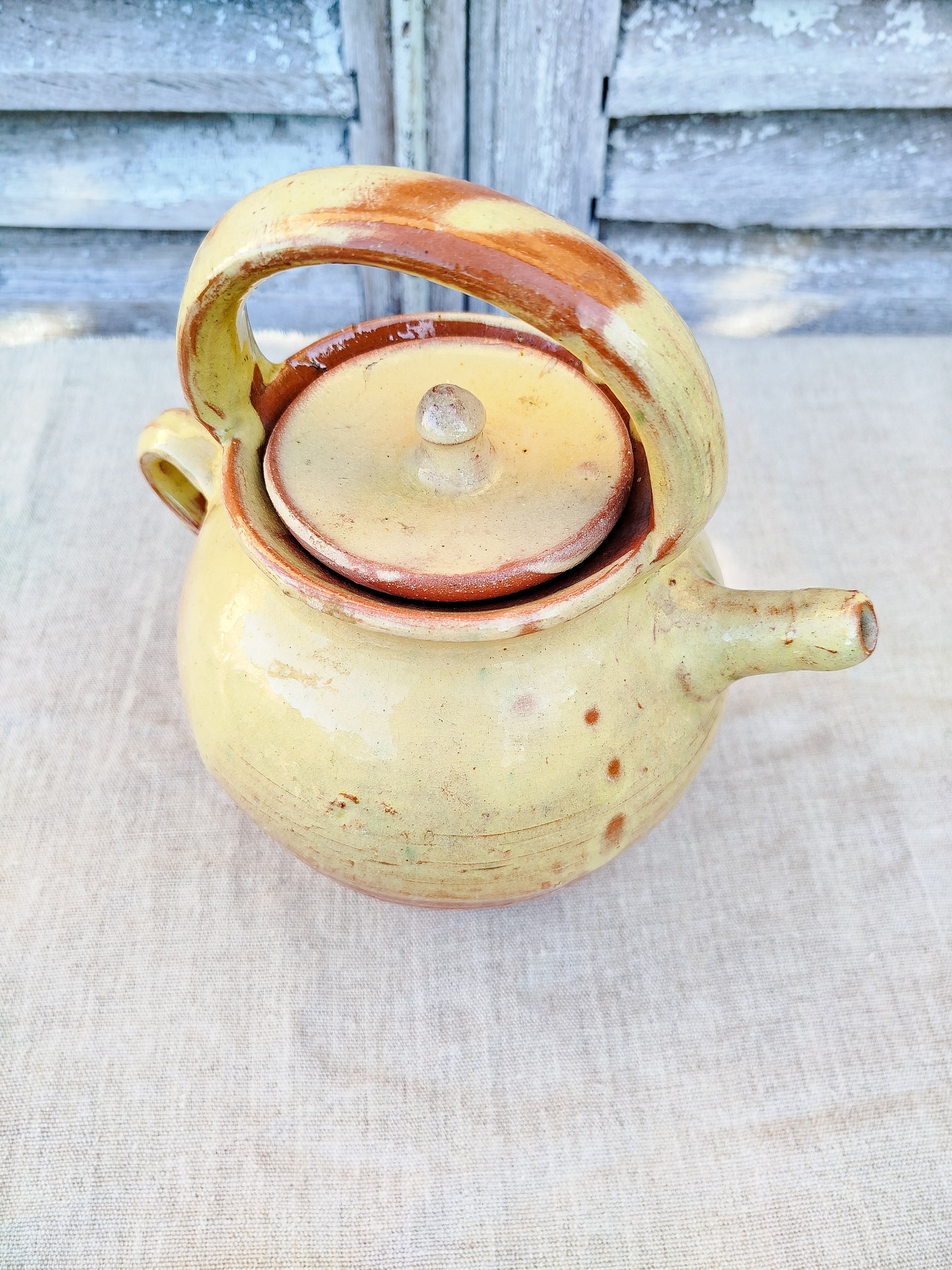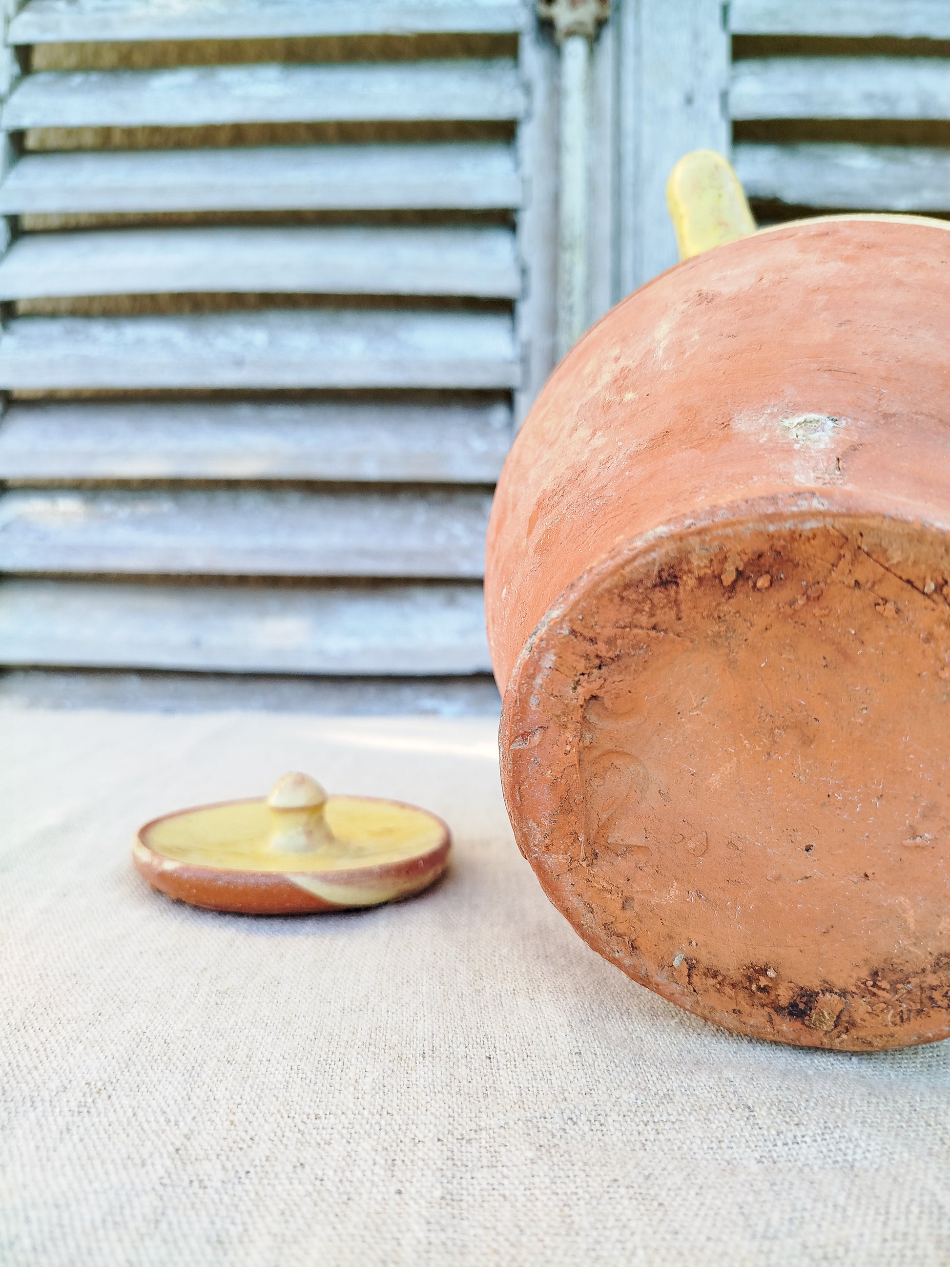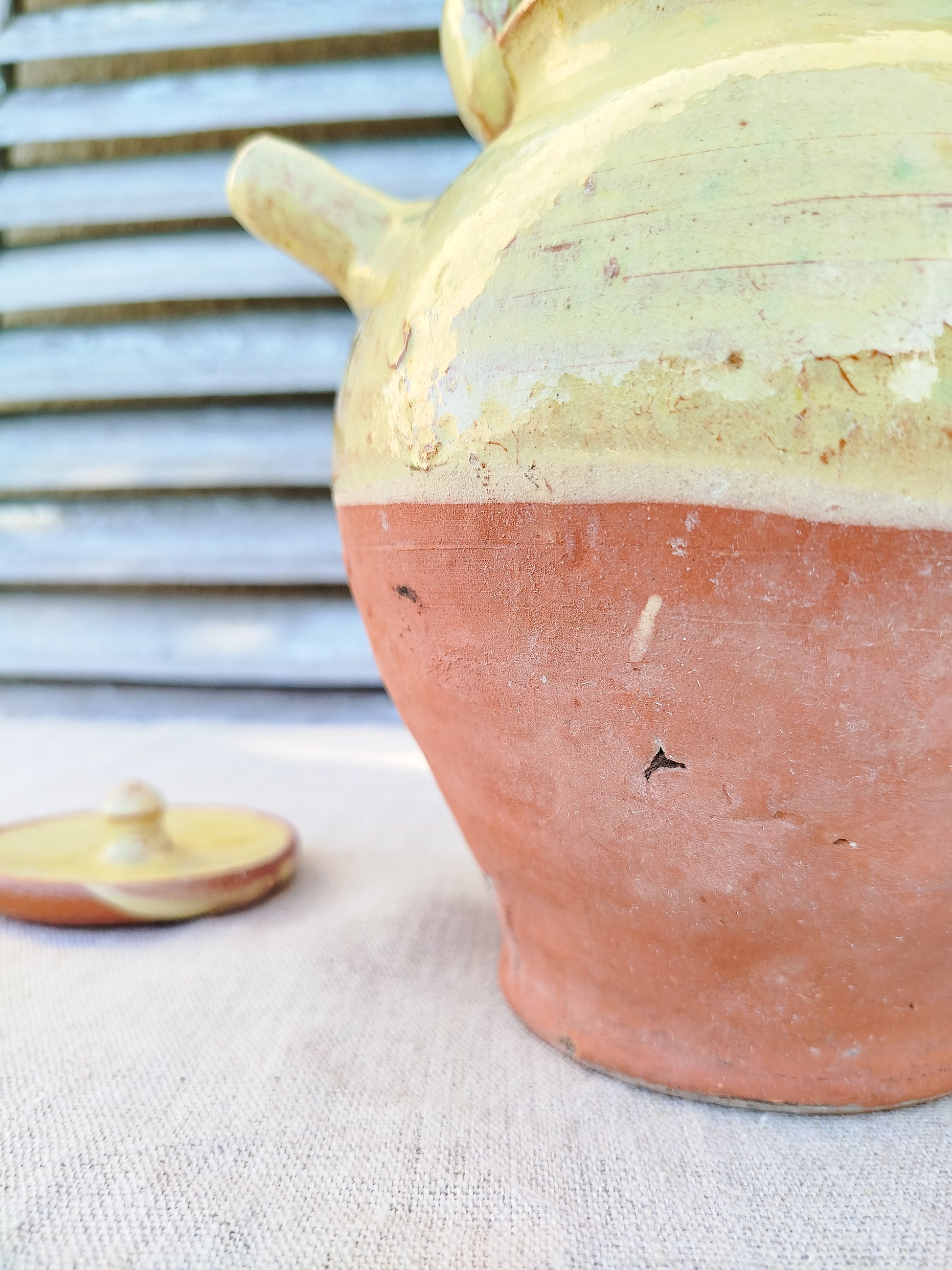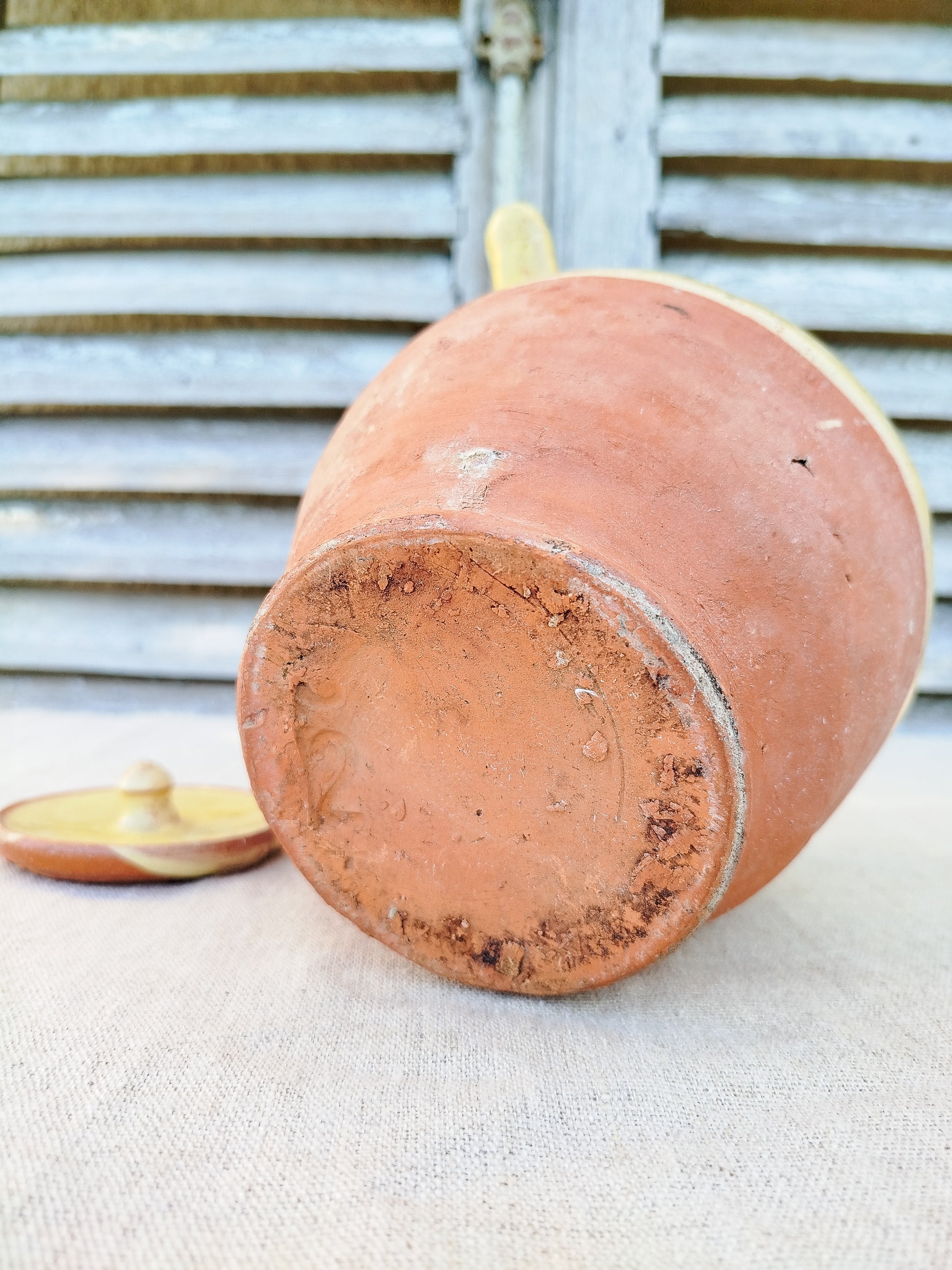 La cruche est émaillée de couleur jaune sur le haut, laissant la base brute.