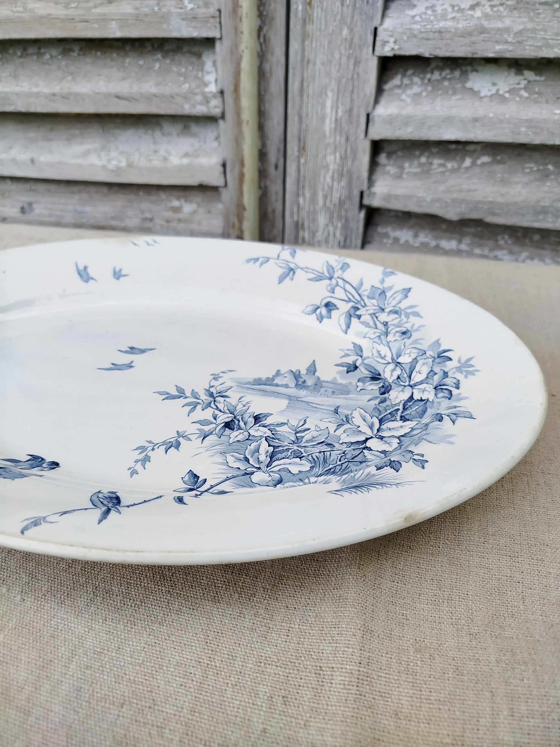 Il s'agit du modèle " Paysages ", avec en guise de décor, plusieurs petits oiseaux en vol, à coté, un clocher d'église est située au bord de l'eau et est entouré d'une branche de ronces.