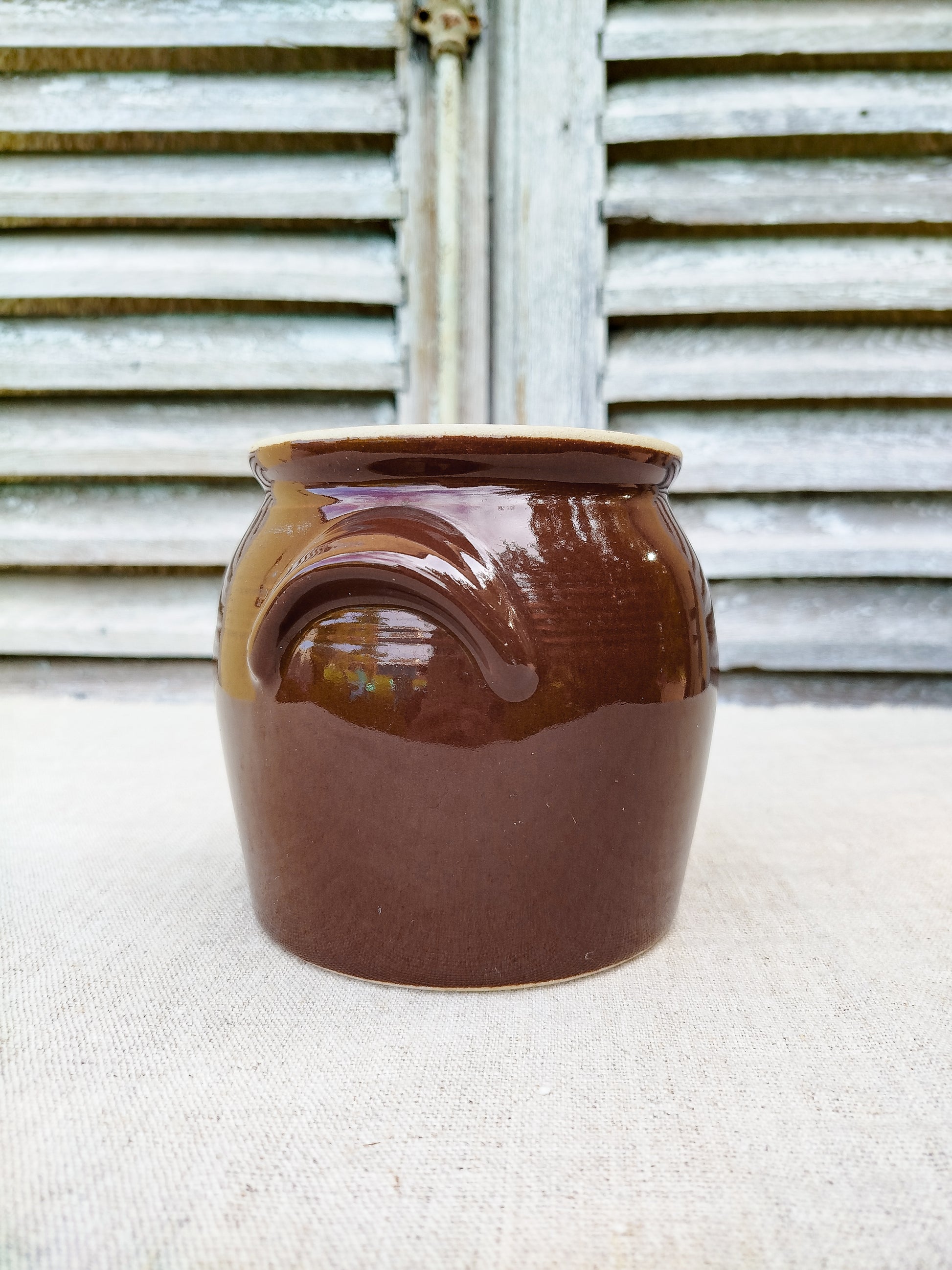 En grès couleur crème à l'intérieur du pot, une glaçure couleur marron recouvre le pot.