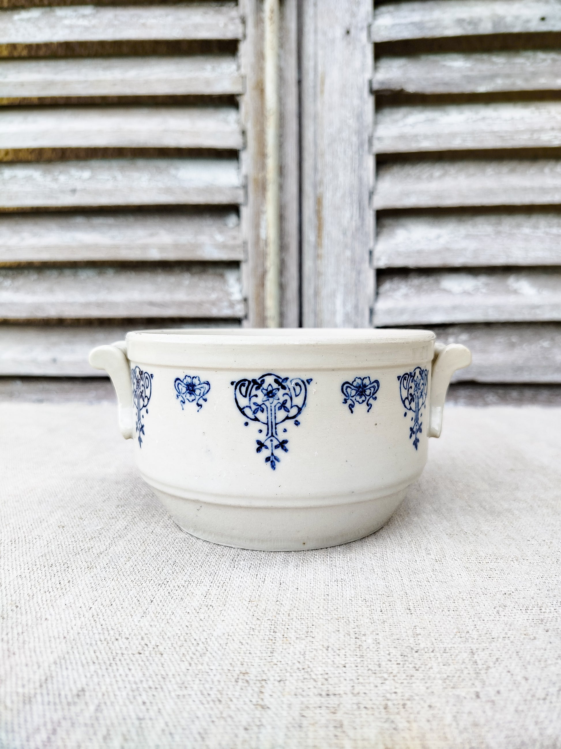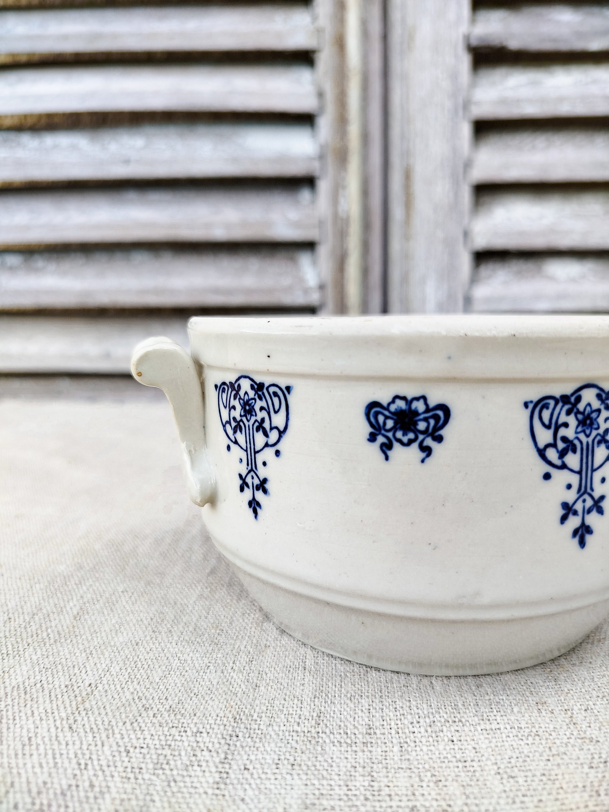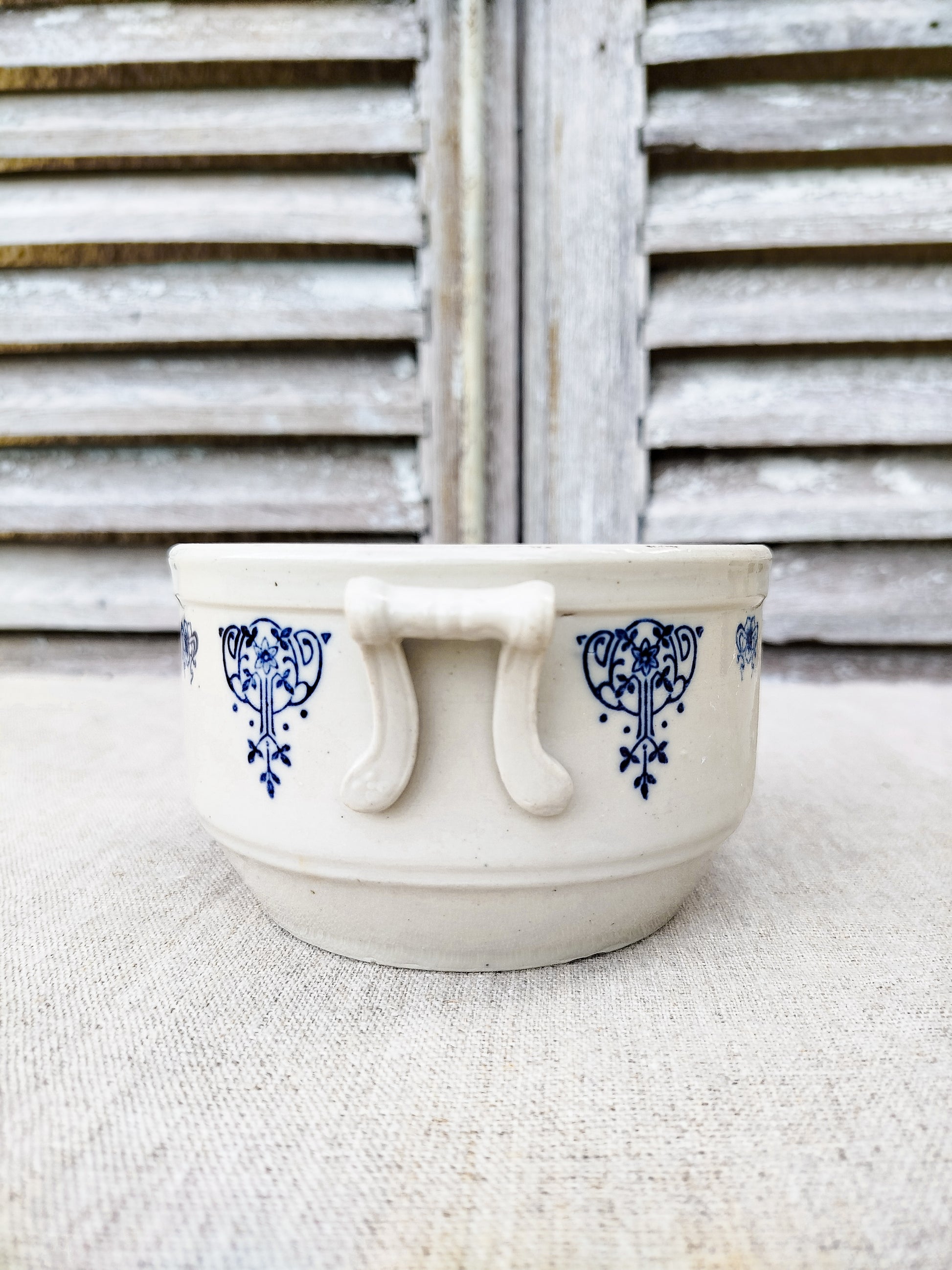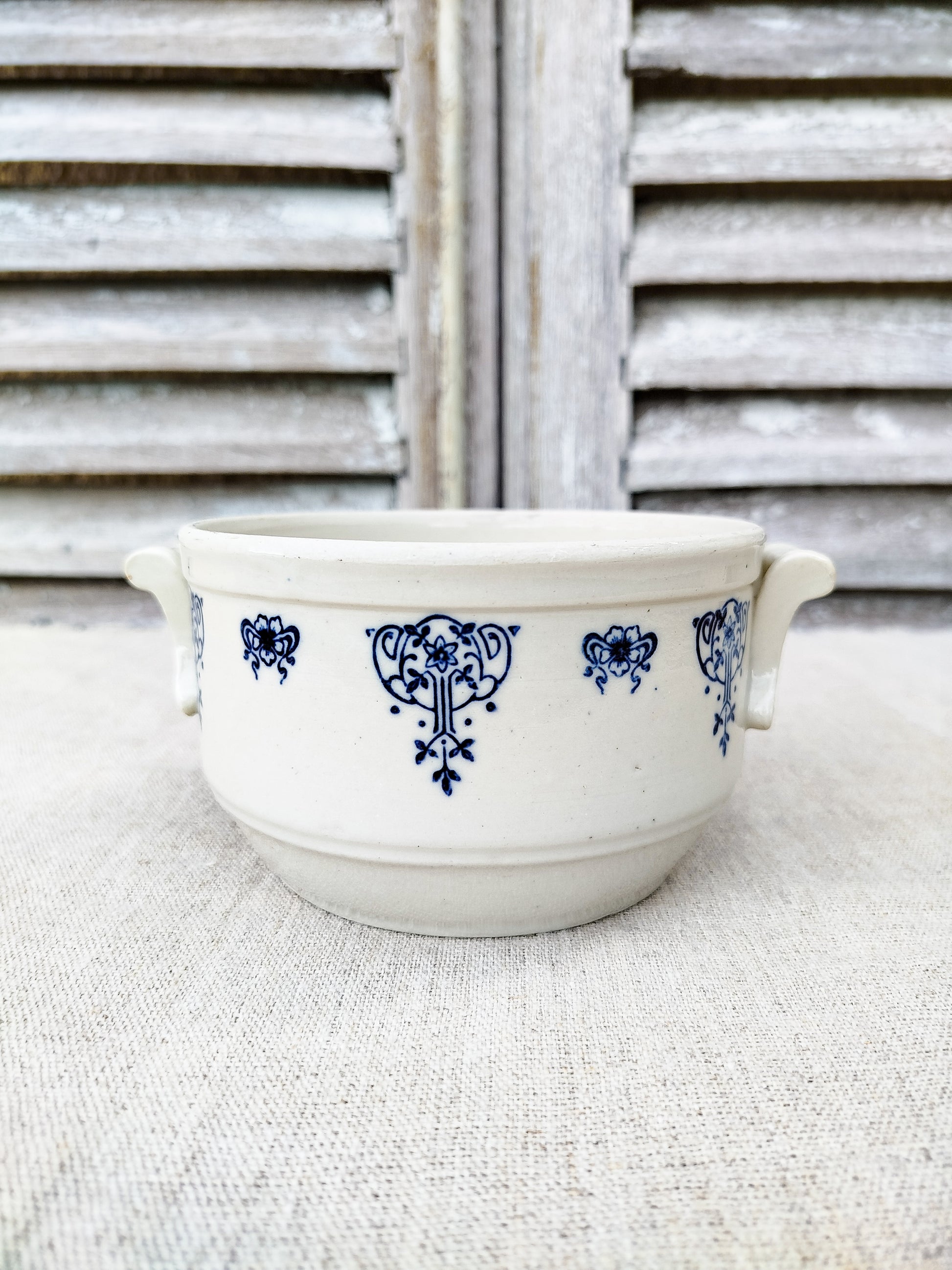 Une frise de motifs floraux, style art nouveau, et en bleu foncé, entourent la soupière.