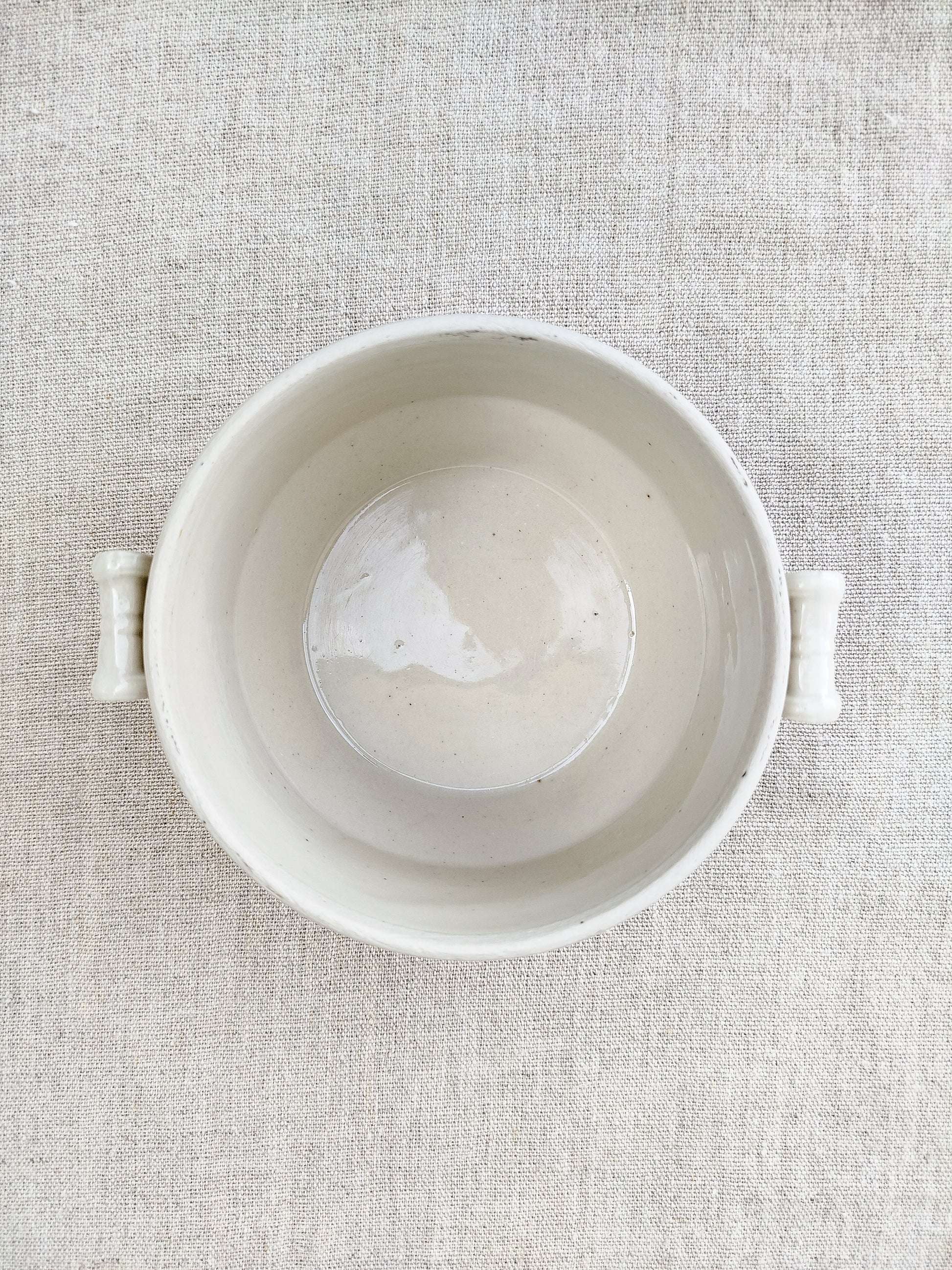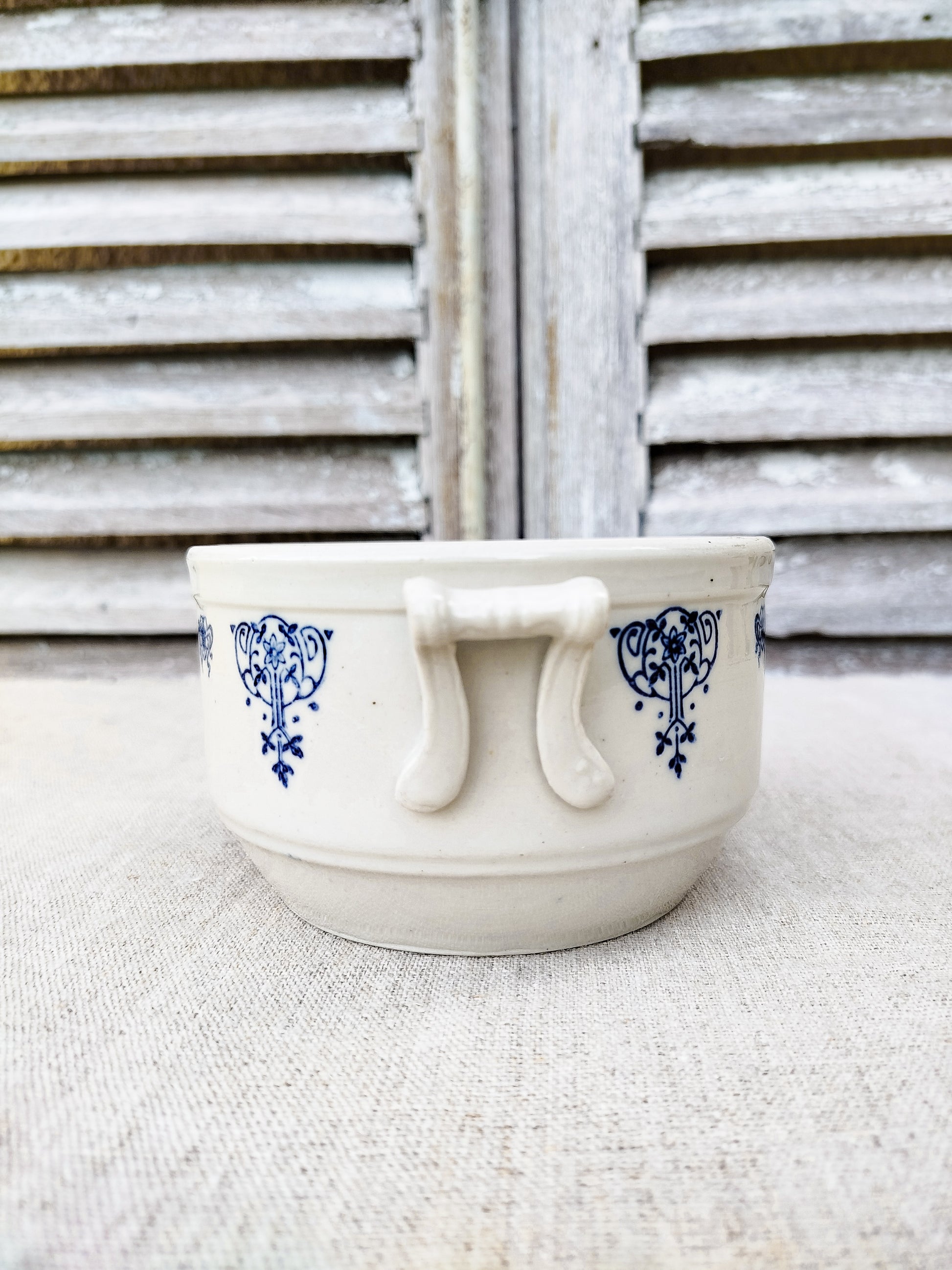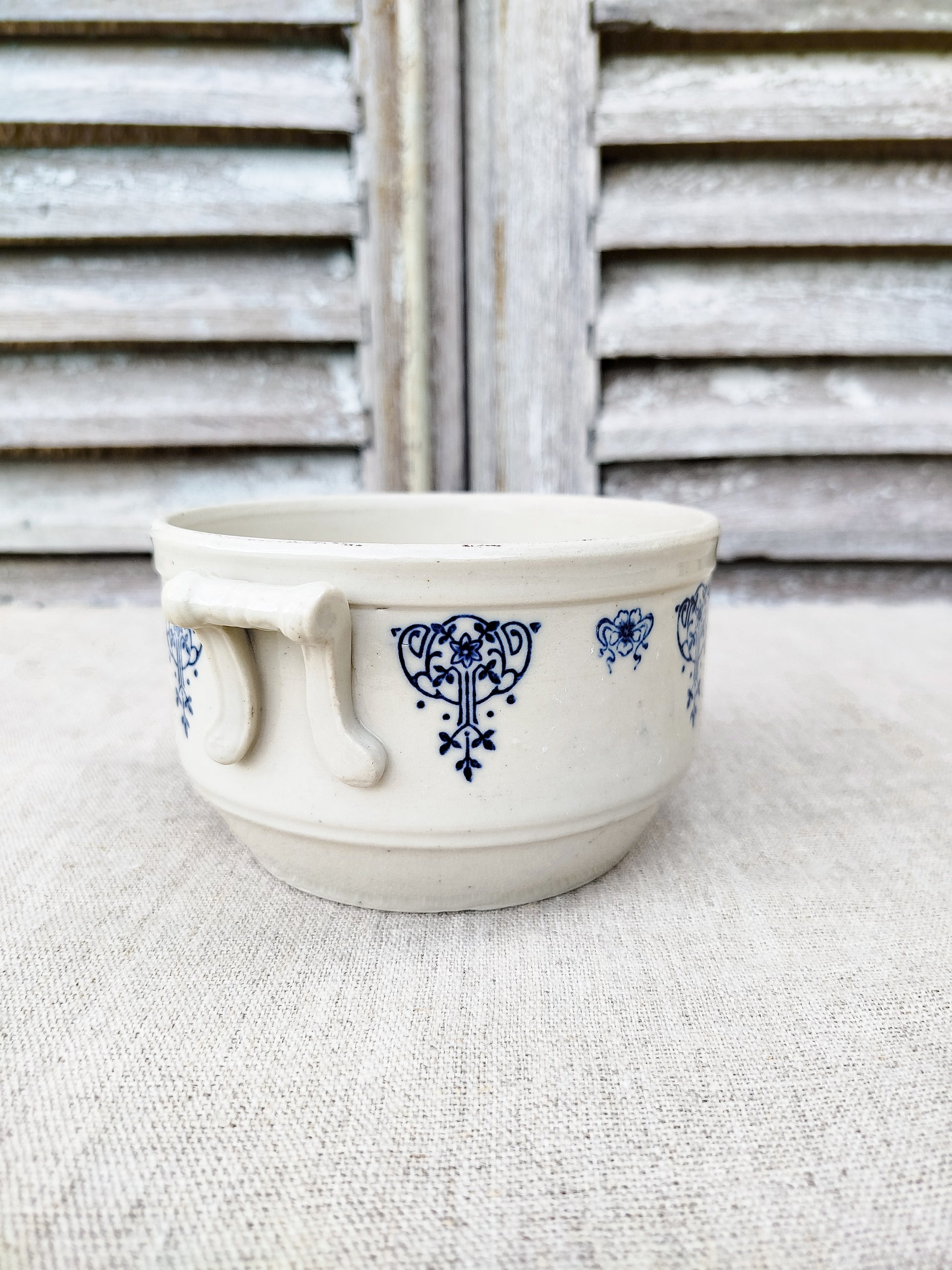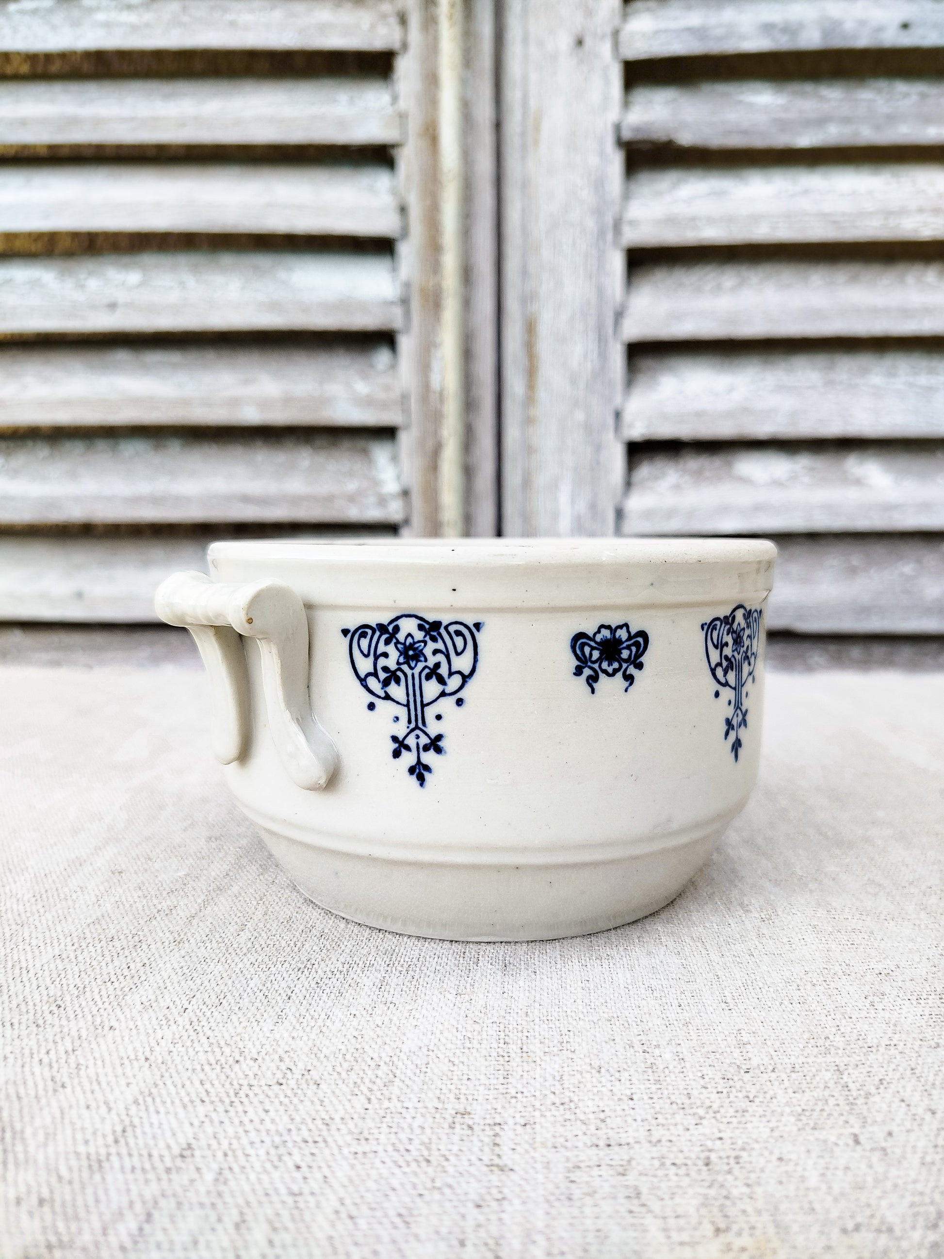 Une frise de motifs floraux, style art nouveau, et en bleu foncé, entourent la soupière.