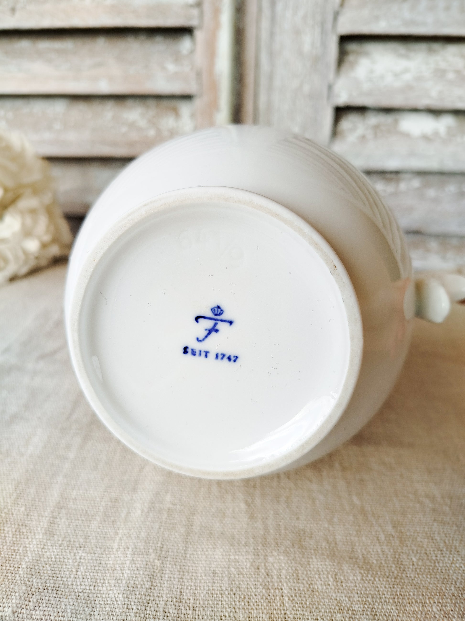 Le pichet porte la marque de la manufacture au dessous, il s'agit du F surmonté d'une petite couronne, et la mention " Seit 1747 ", ( " depuis 1747 " en langue allemande).