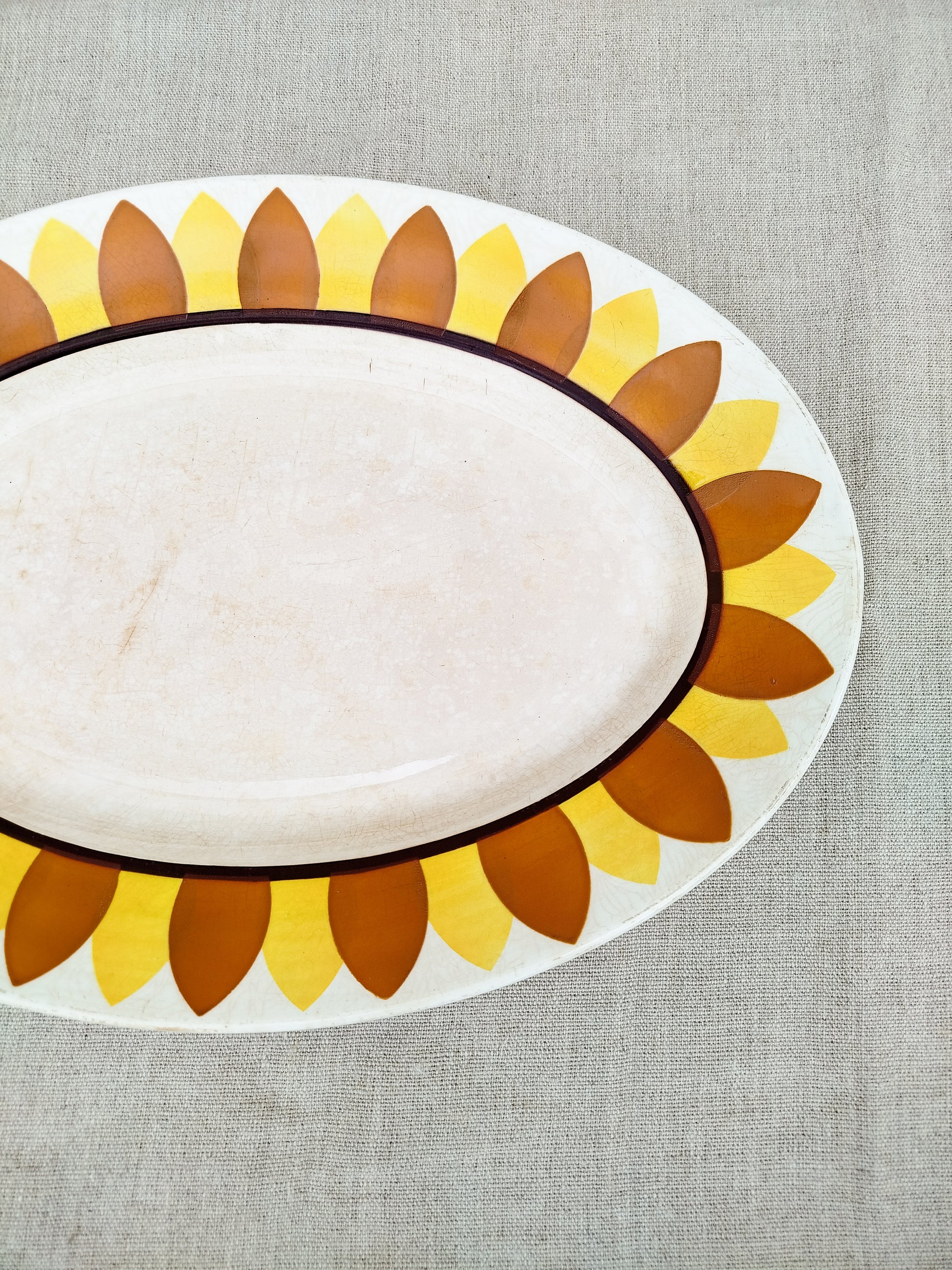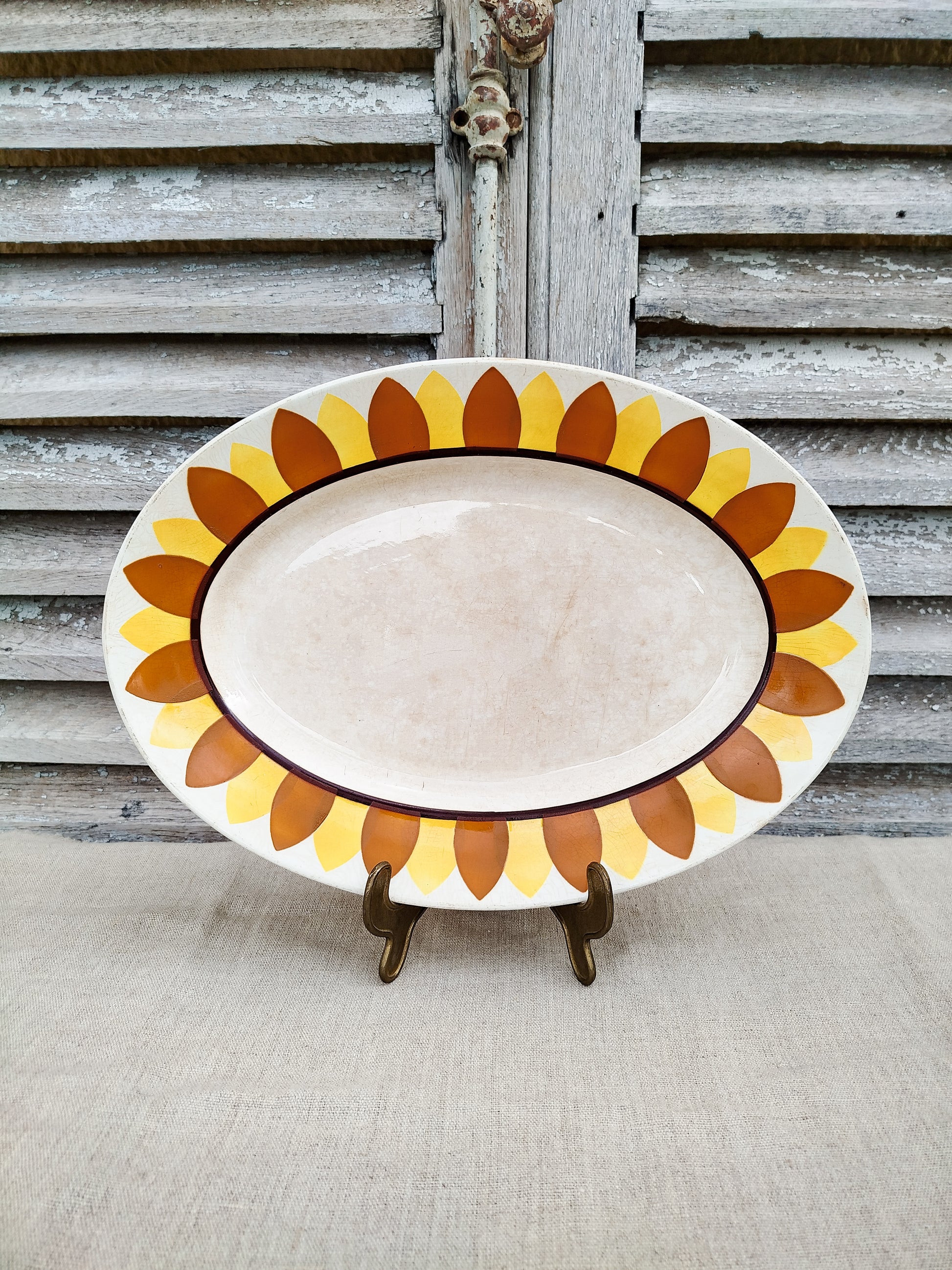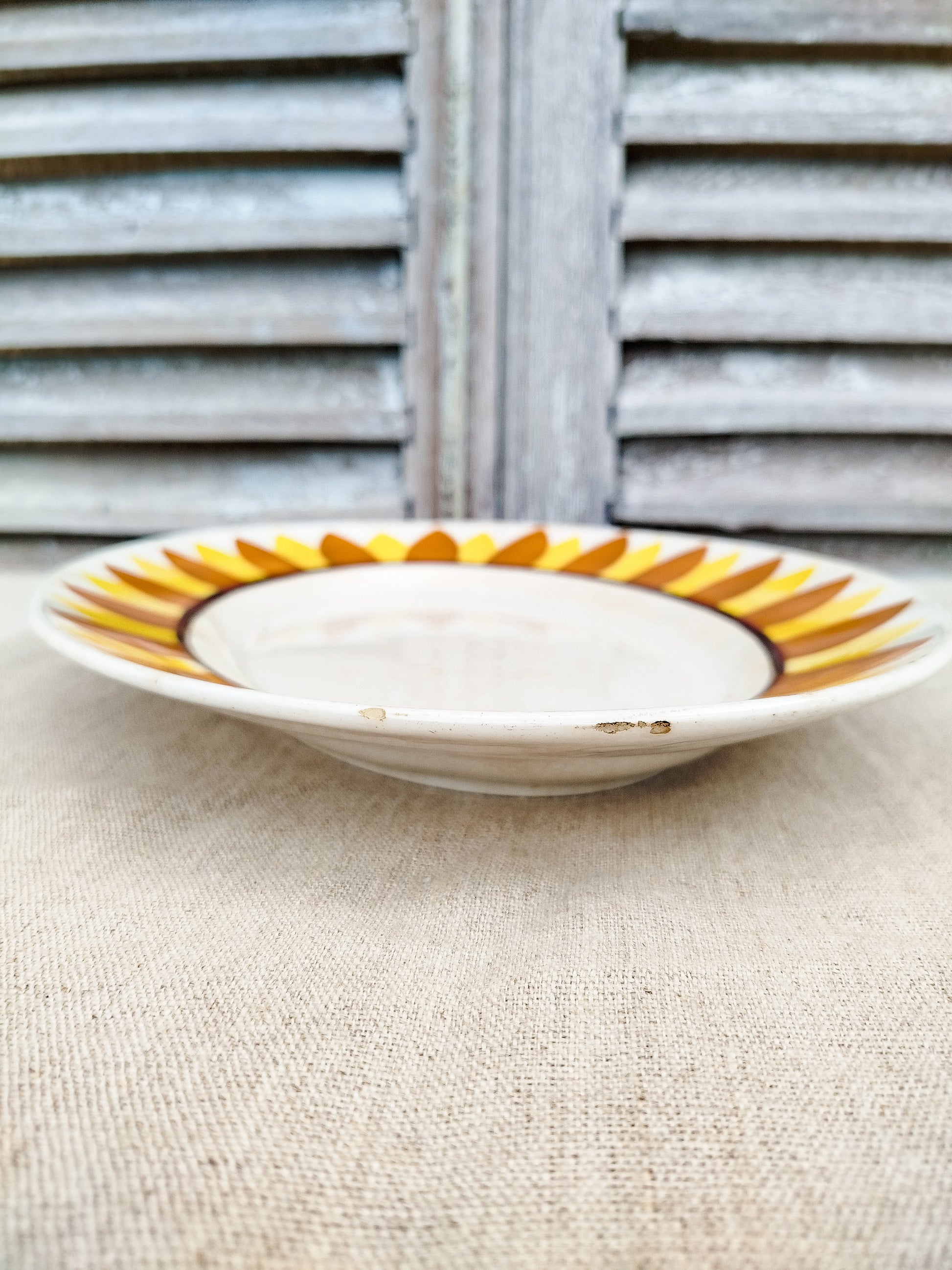 Il est entourĂ© d'une frise reprĂ©sentant des pĂ©tales de tournesol, de couleur orange et jaune. Le centre du plat est lĂ©gèrement patinĂ© par le temps.Â