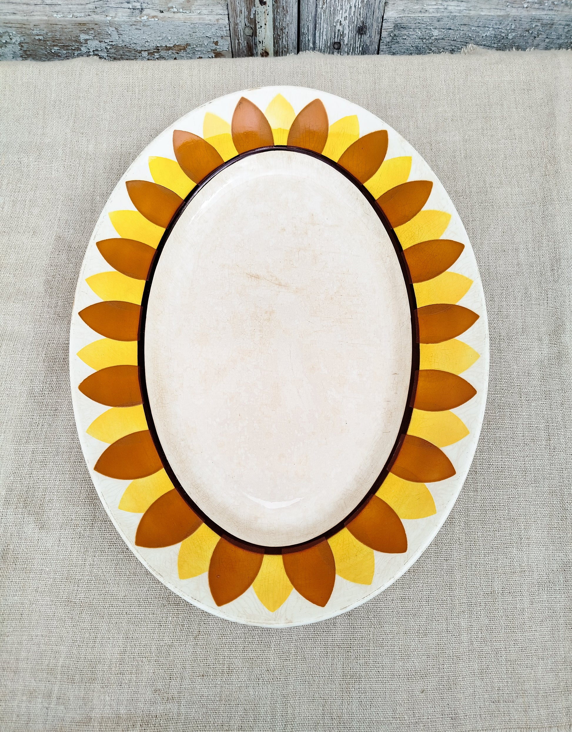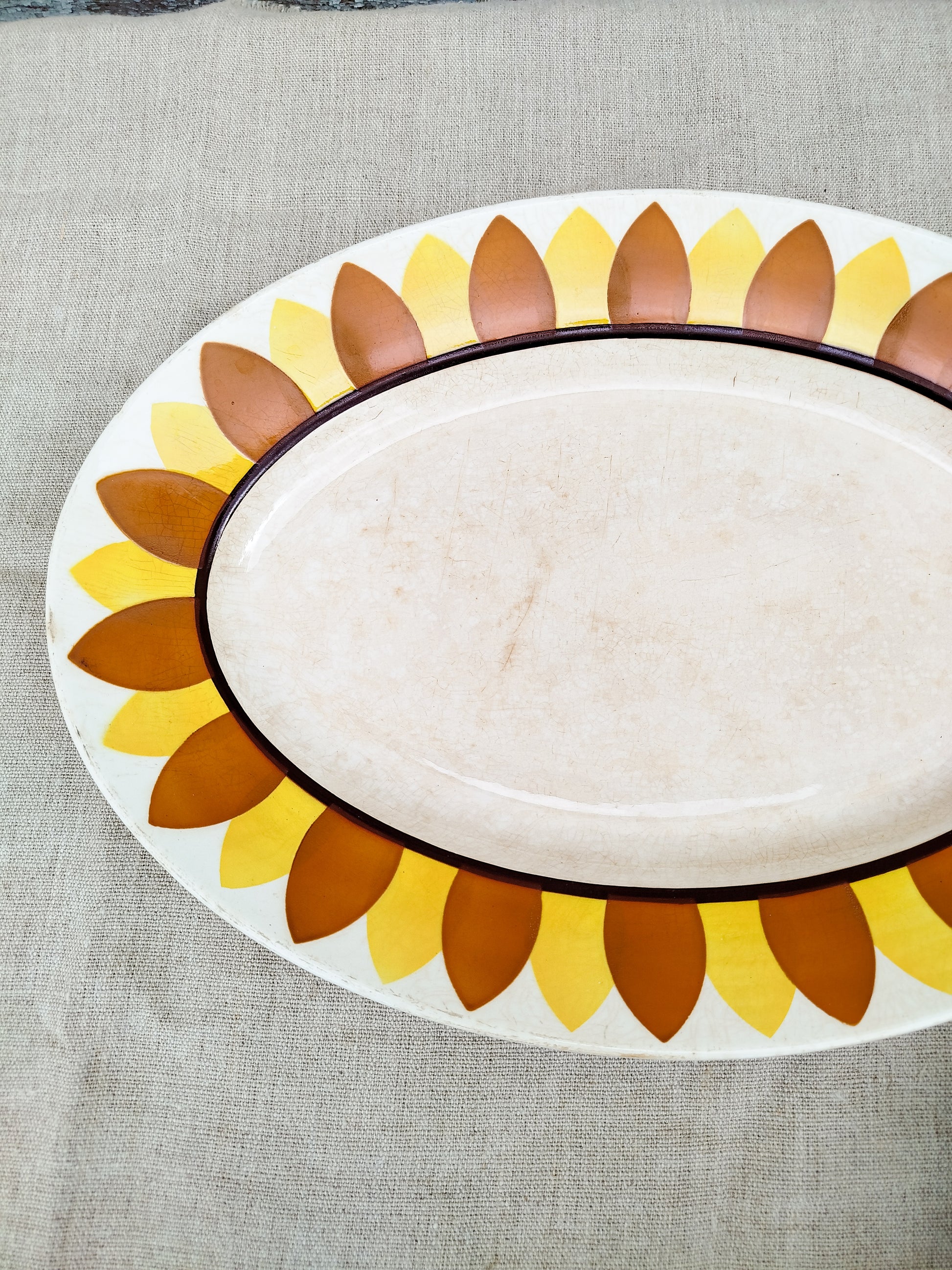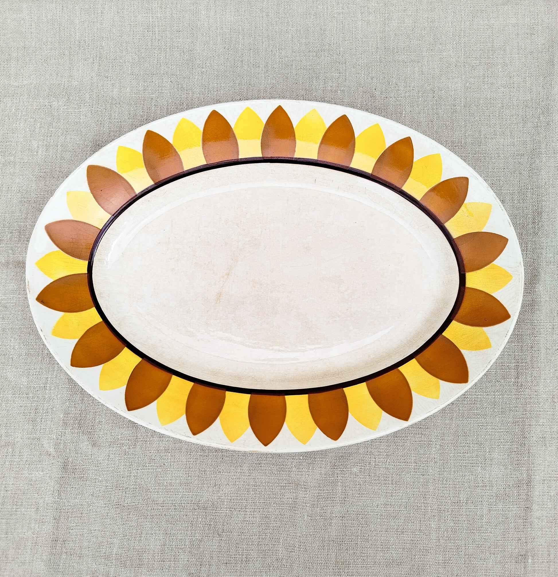 Il est entourĂ© d'une frise reprĂ©sentant des pĂ©tales de tournesol, de couleur orange et jaune. Le centre du plat est lĂ©gèrement patinĂ© par le temps.Â