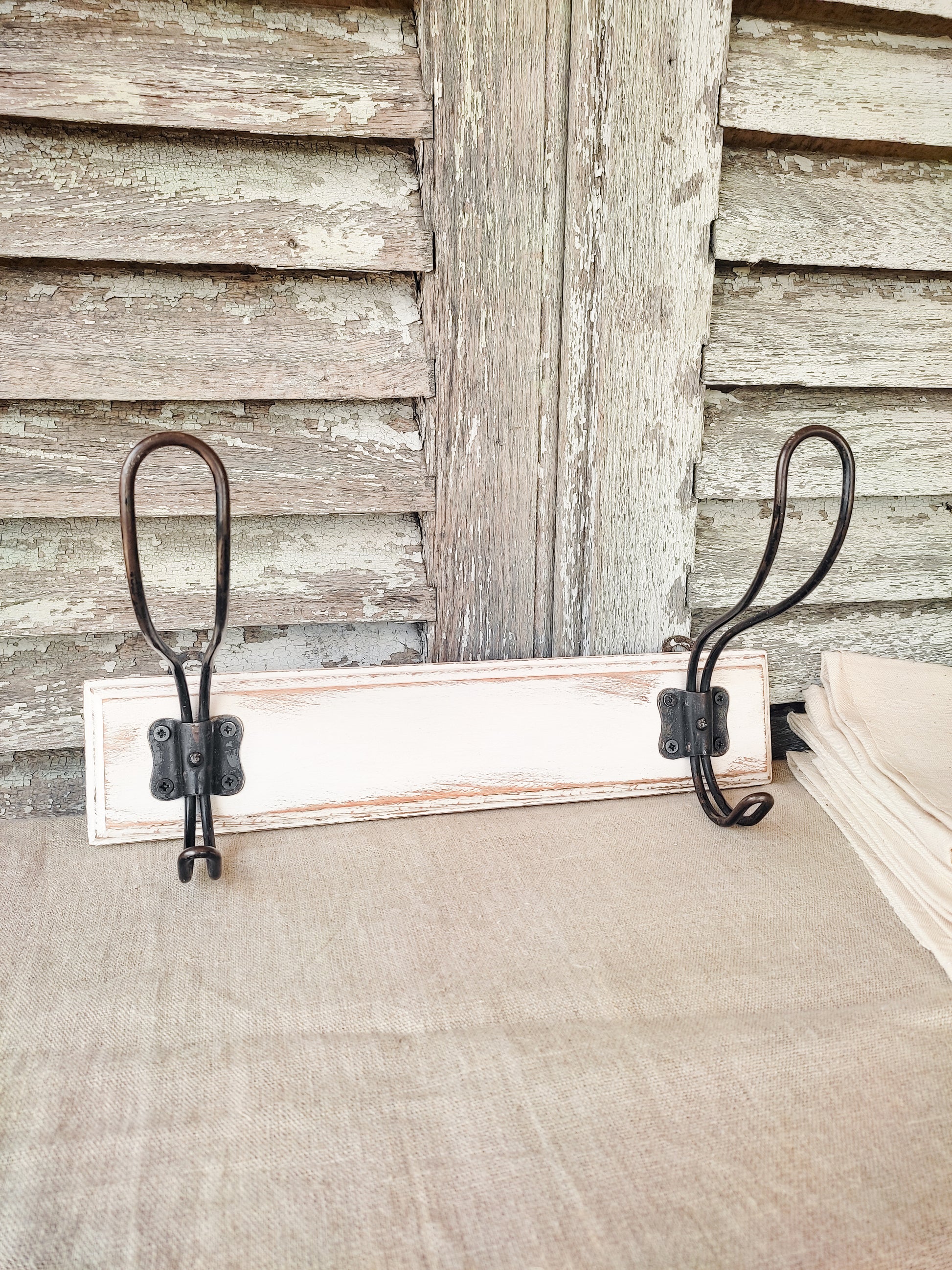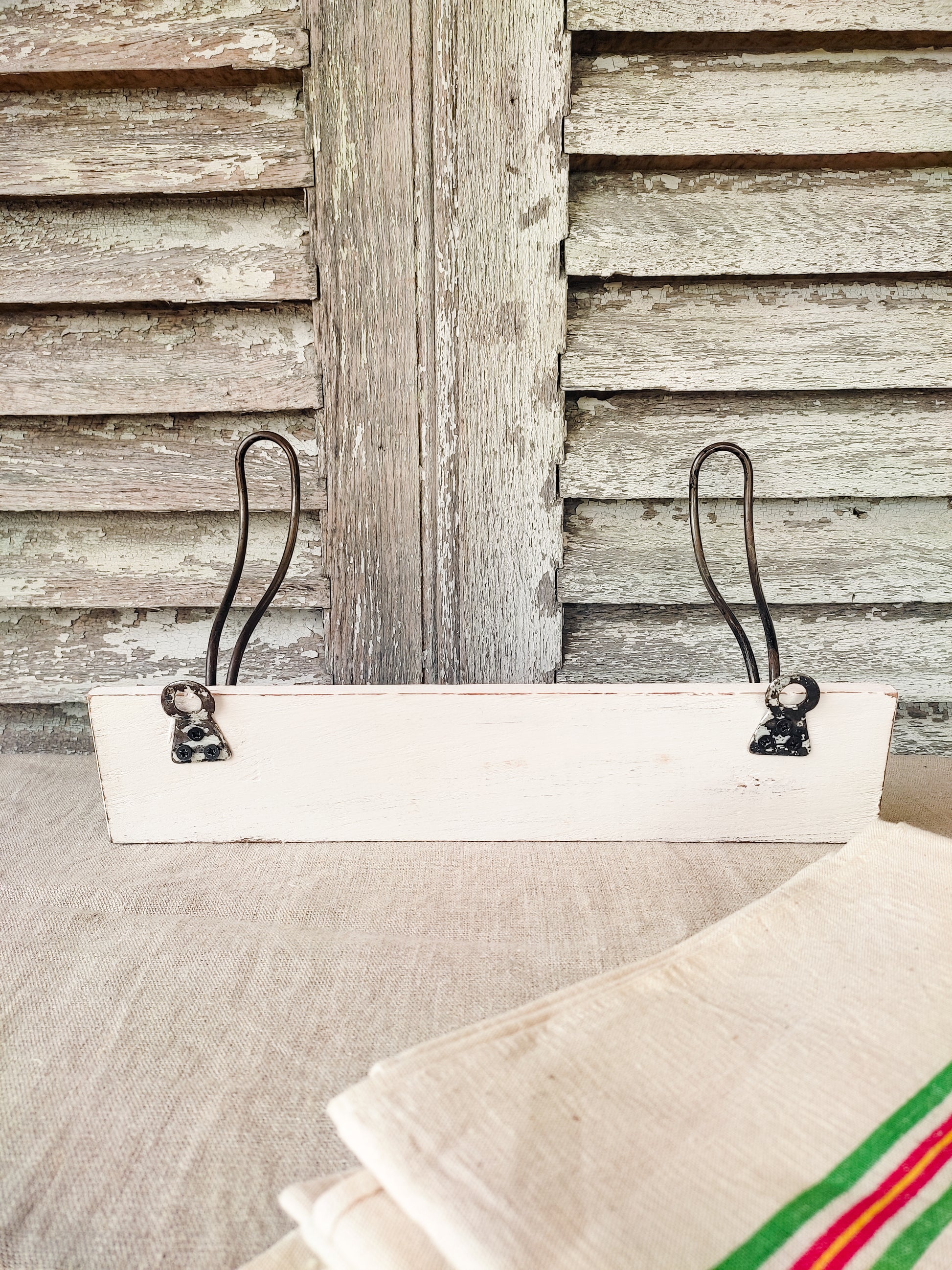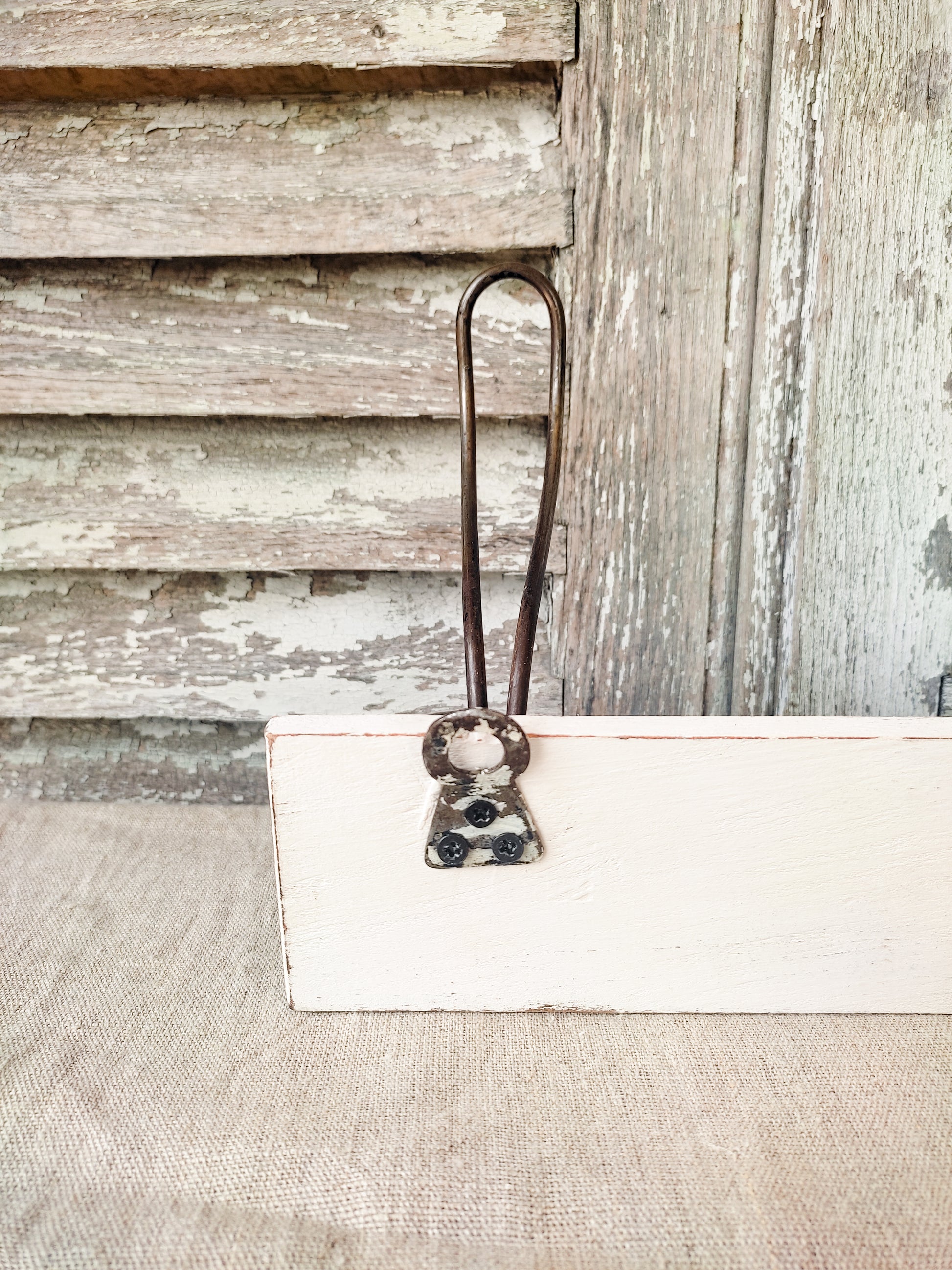 La planche a été relooké avec une peinture blanc crème et poncée pour un effet ancien.