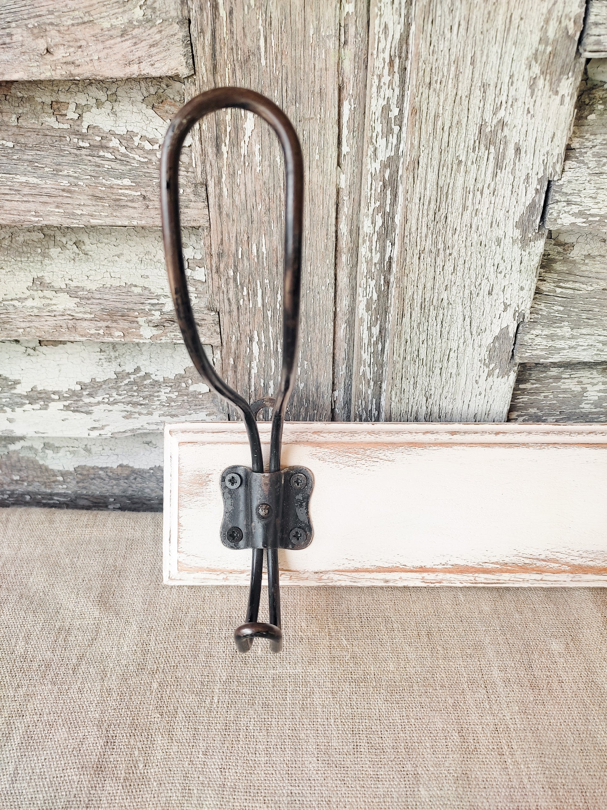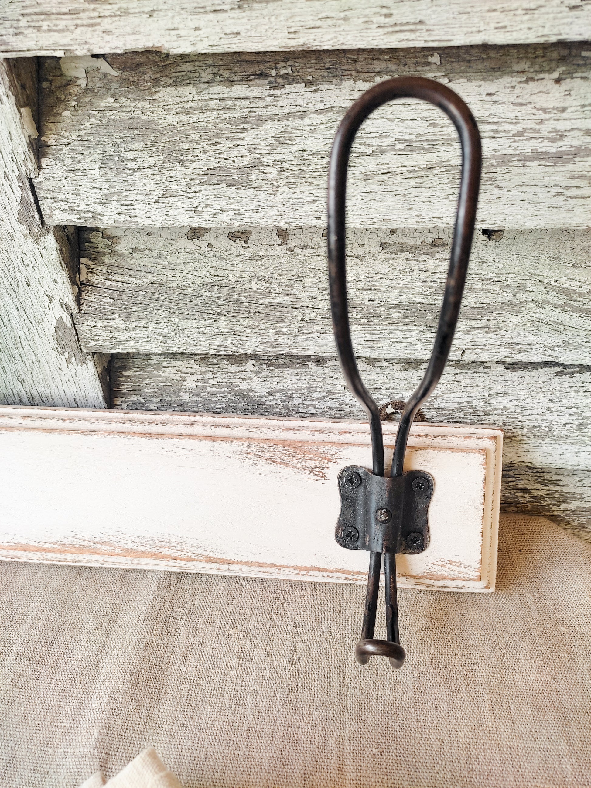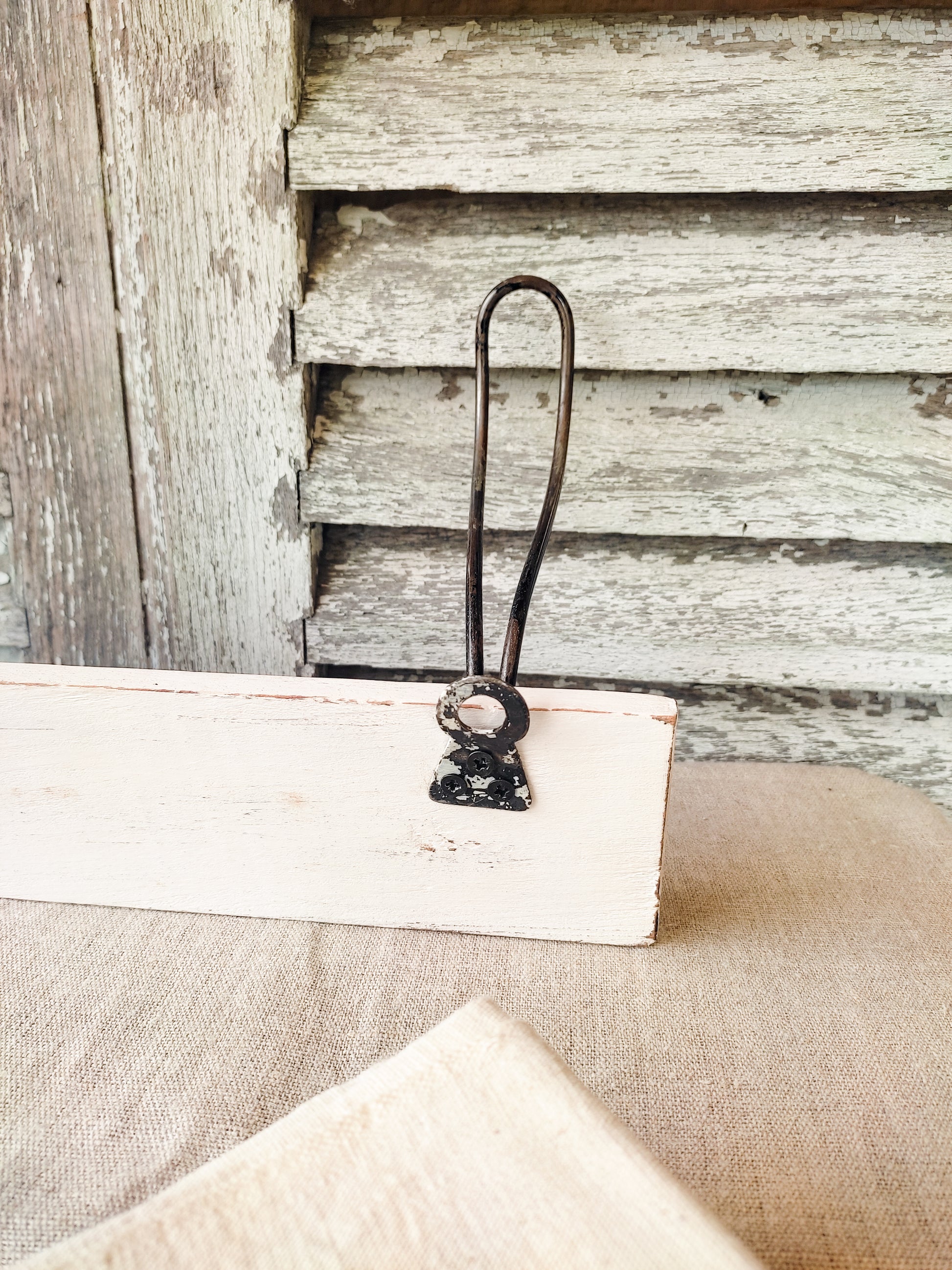 La planche a été relooké avec une peinture blanc crème et poncée pour un effet ancien.