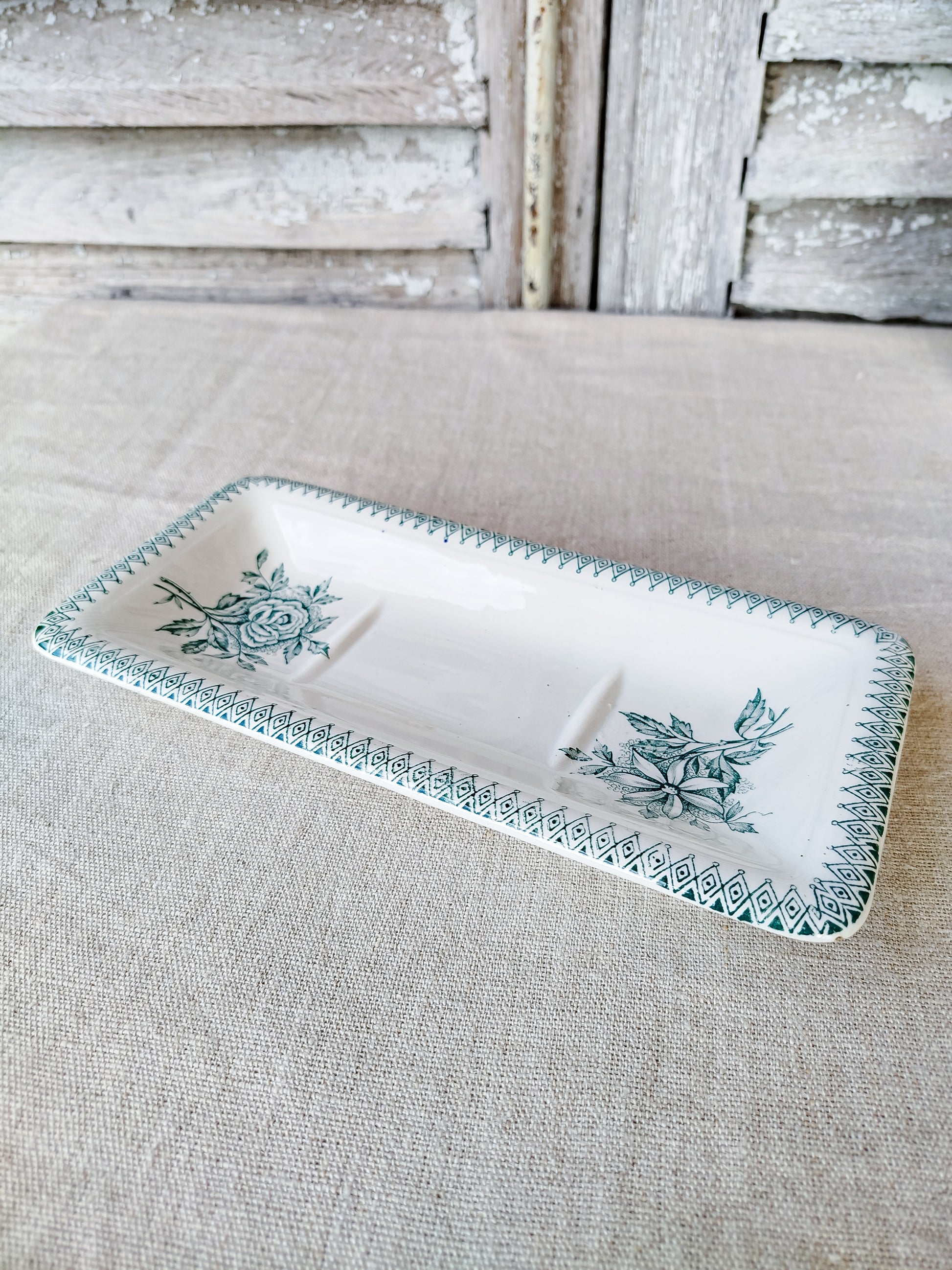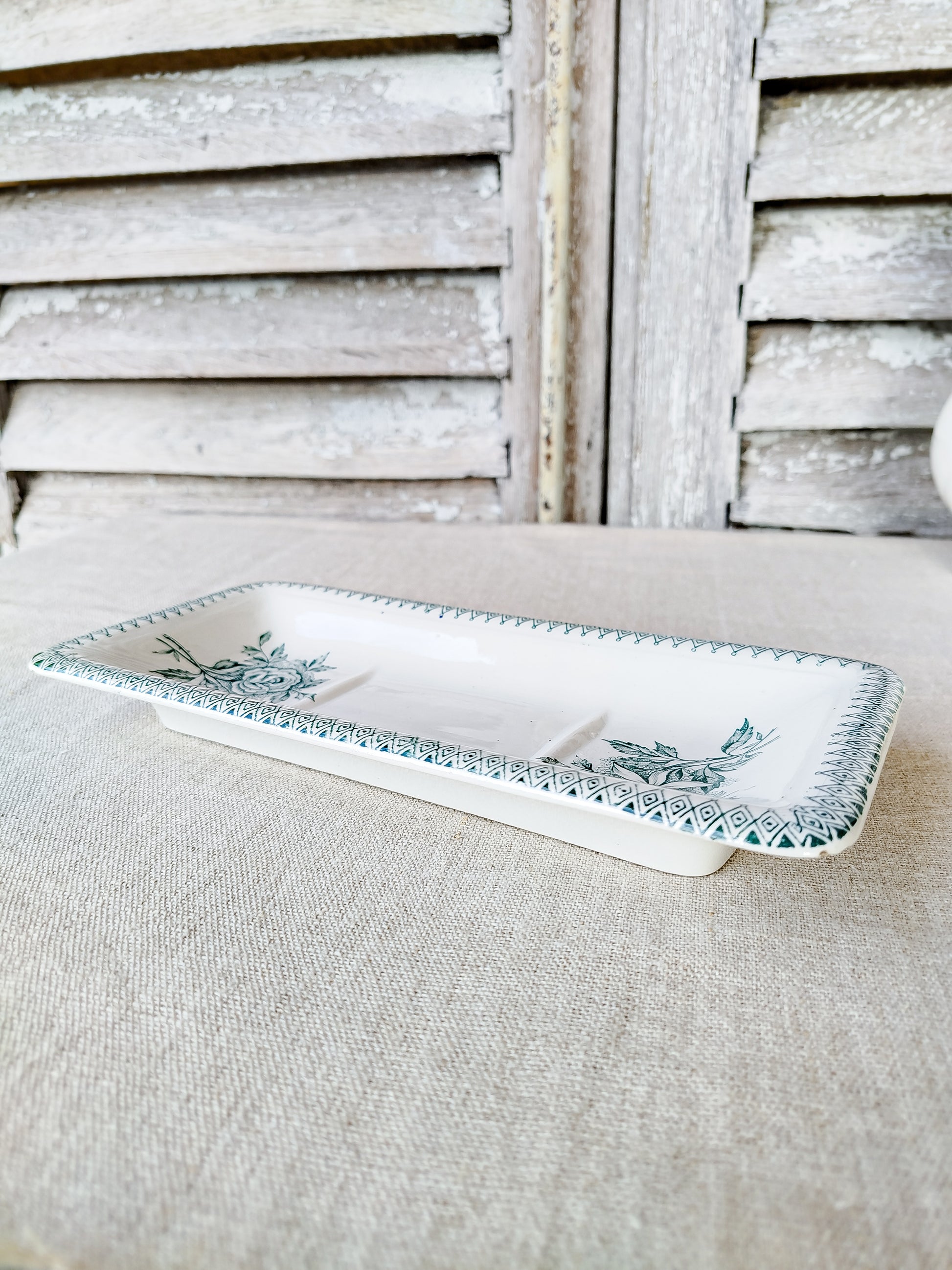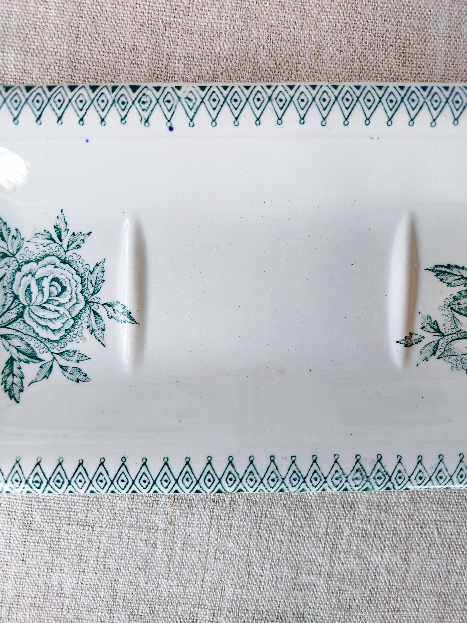 Le porte savon possède un décor floral de couleur verte.