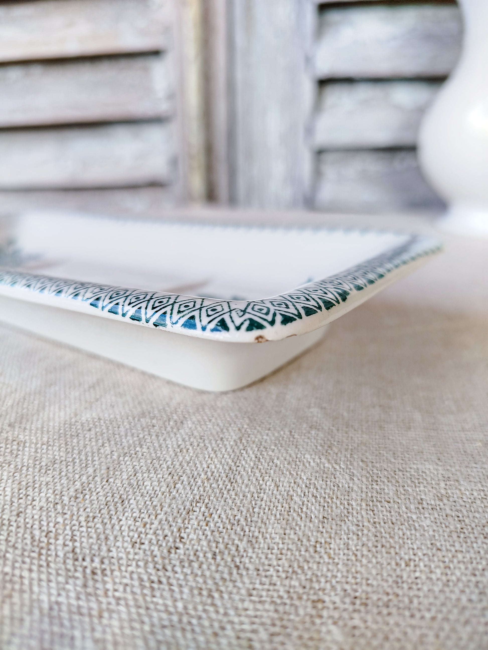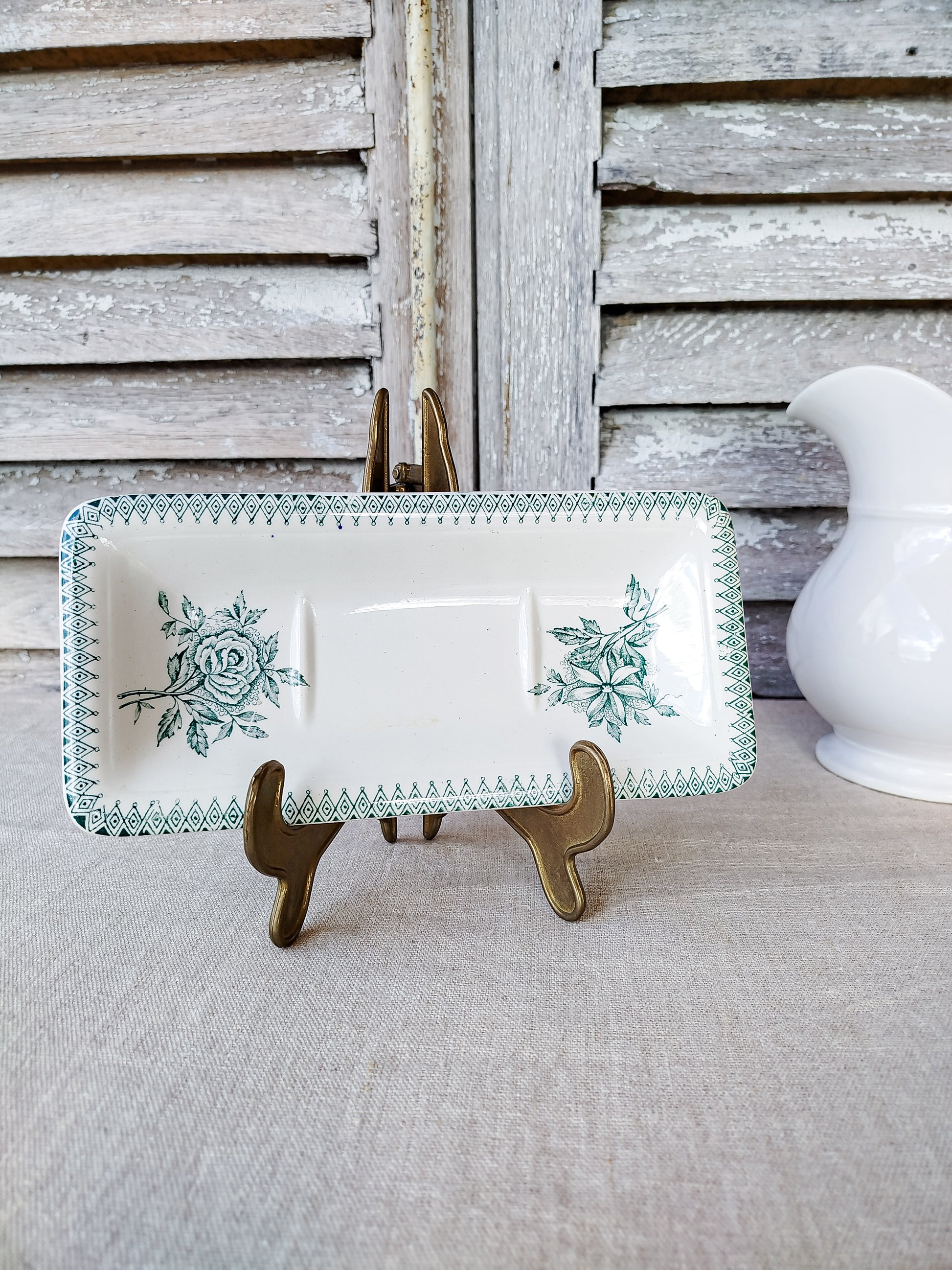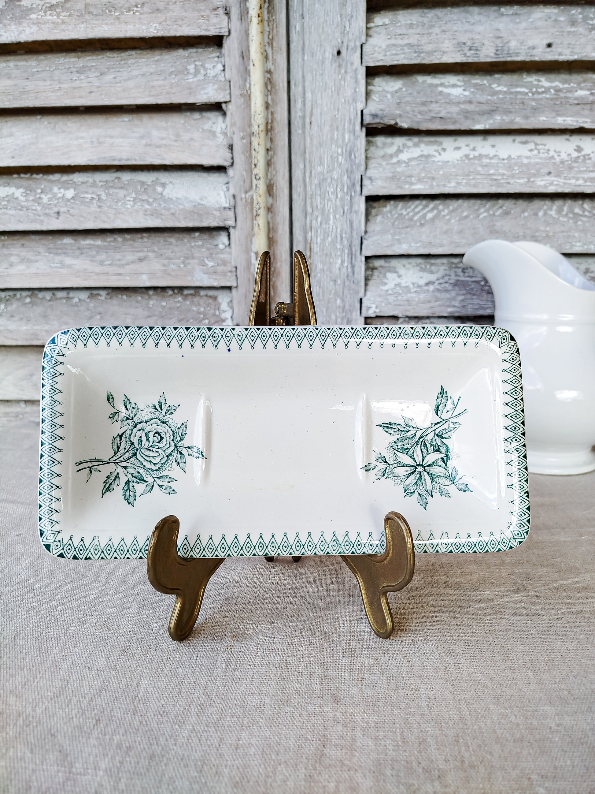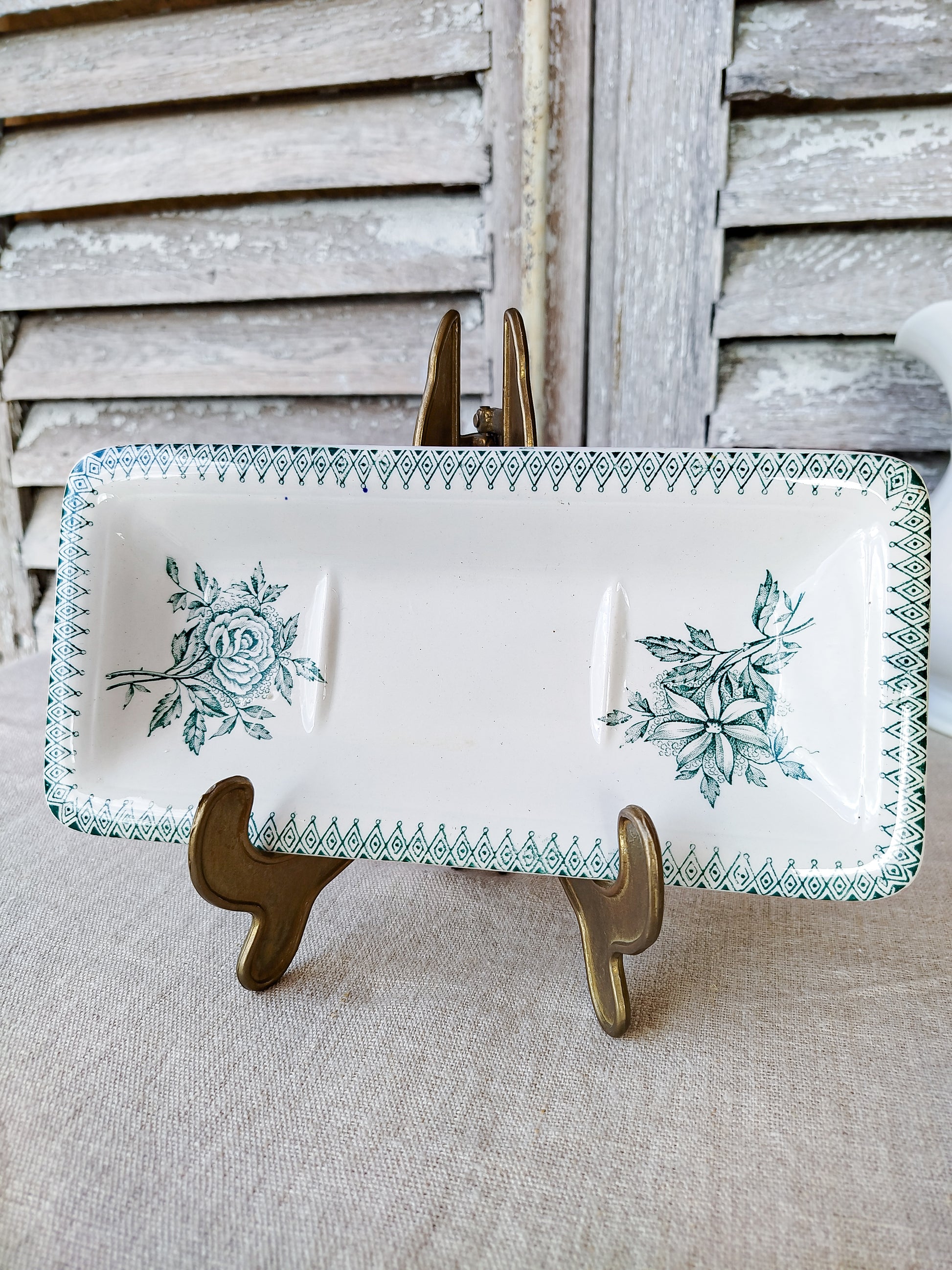 Le porte savon possède un décor floral de couleur verte.
