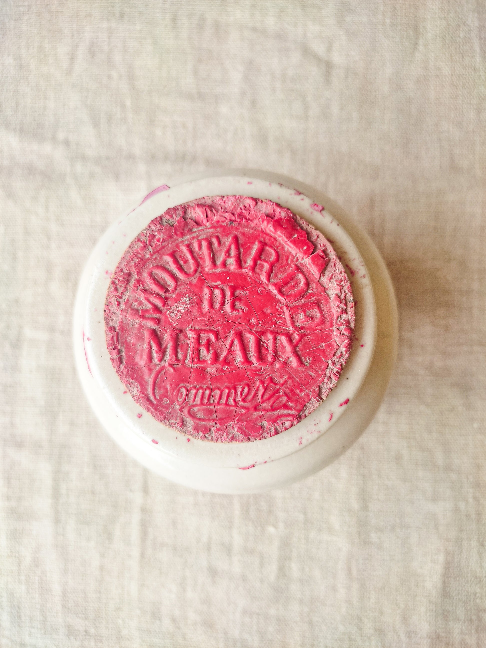 Le bouchon est encore enrobé de cire rouge avec sur le dessus, le cachet " Moutarde de Meaux" en relief.