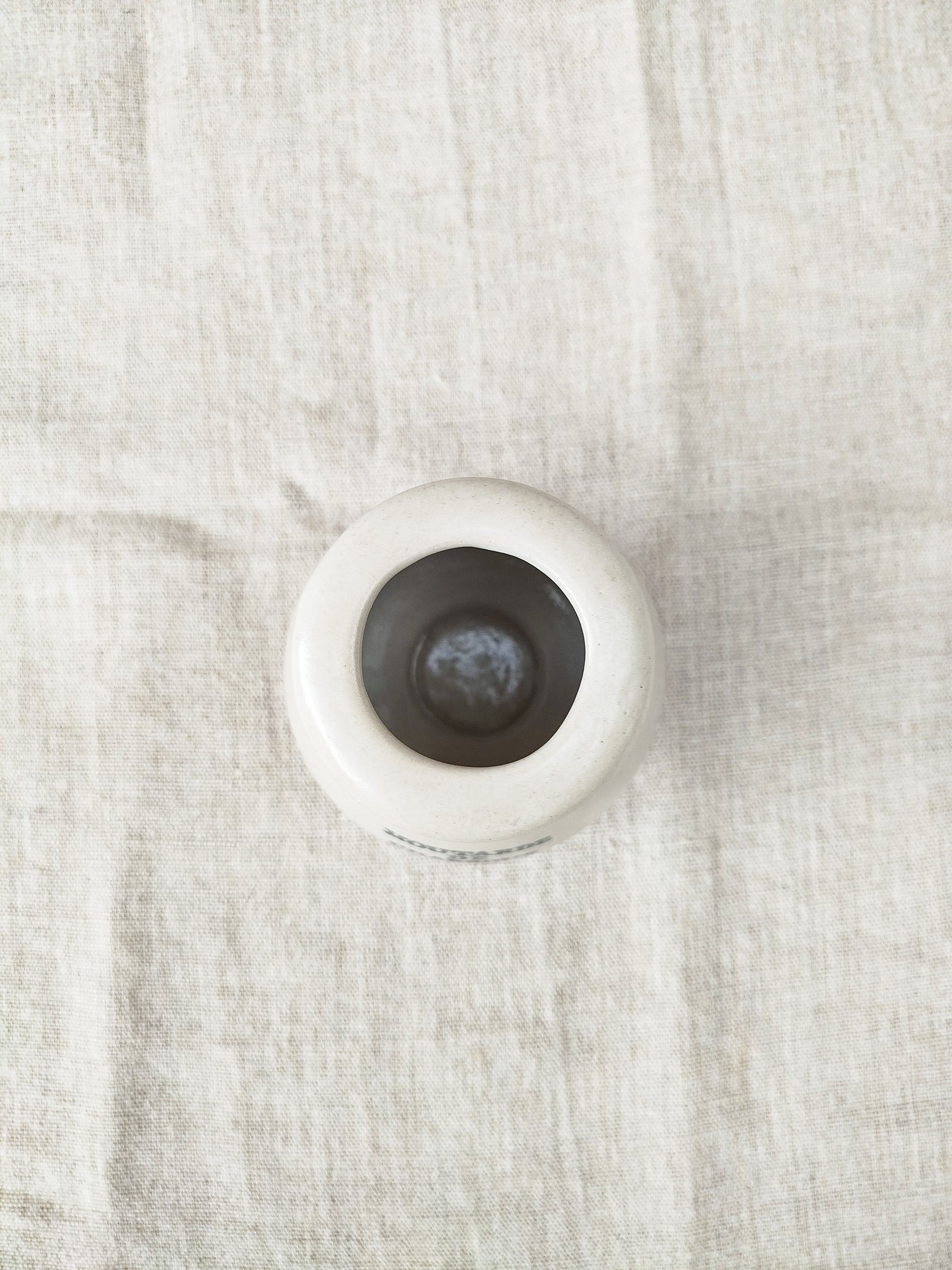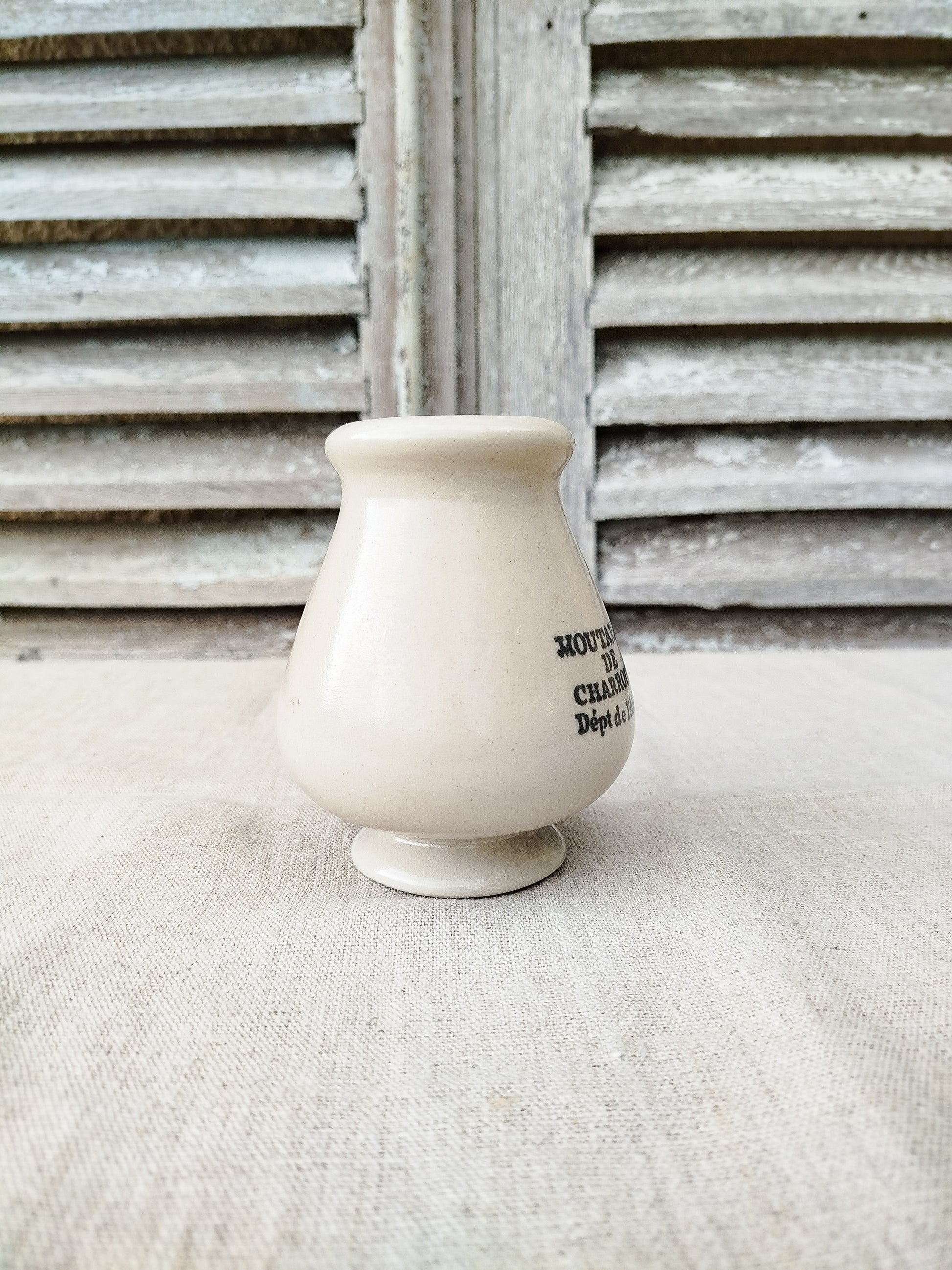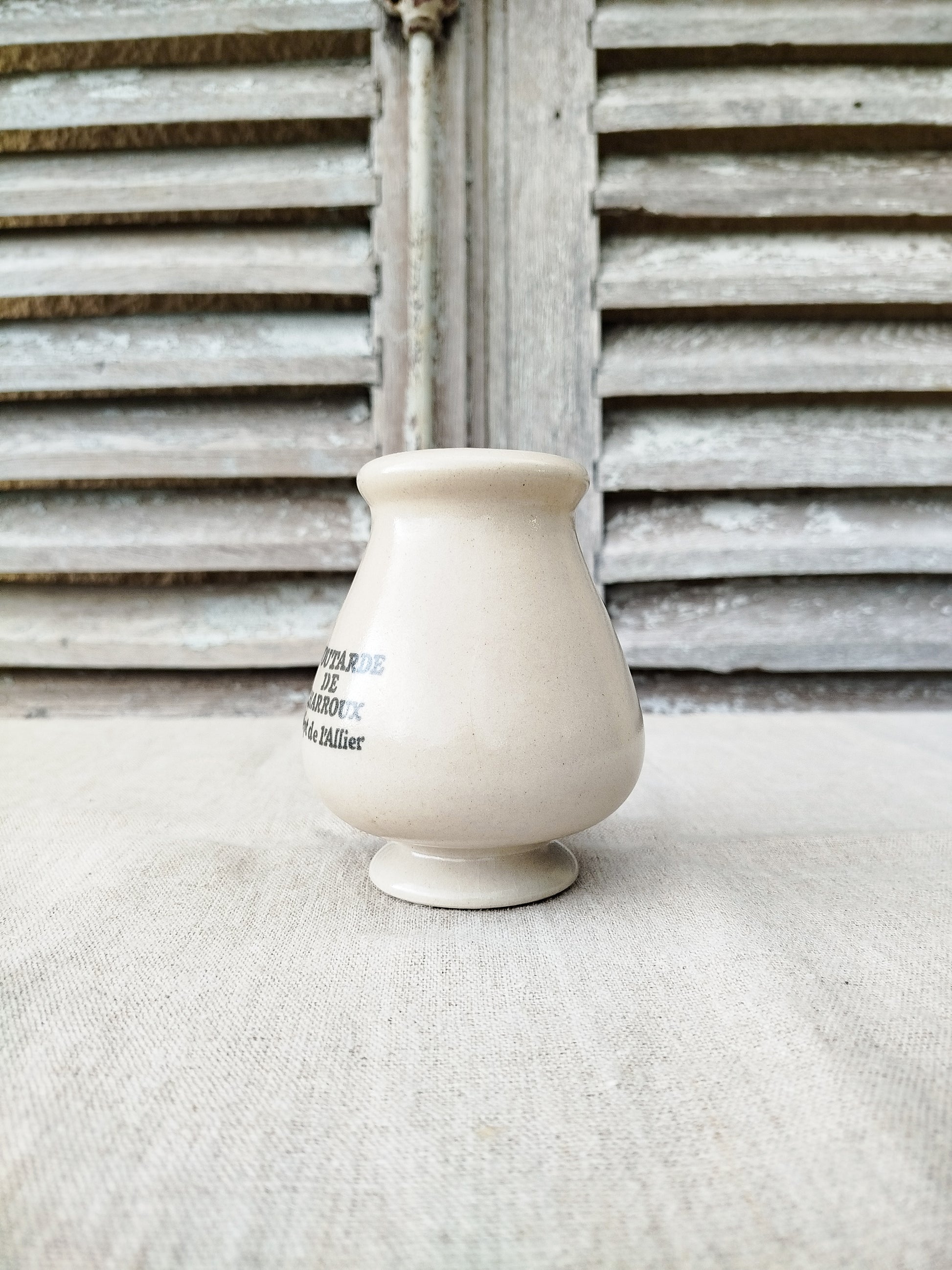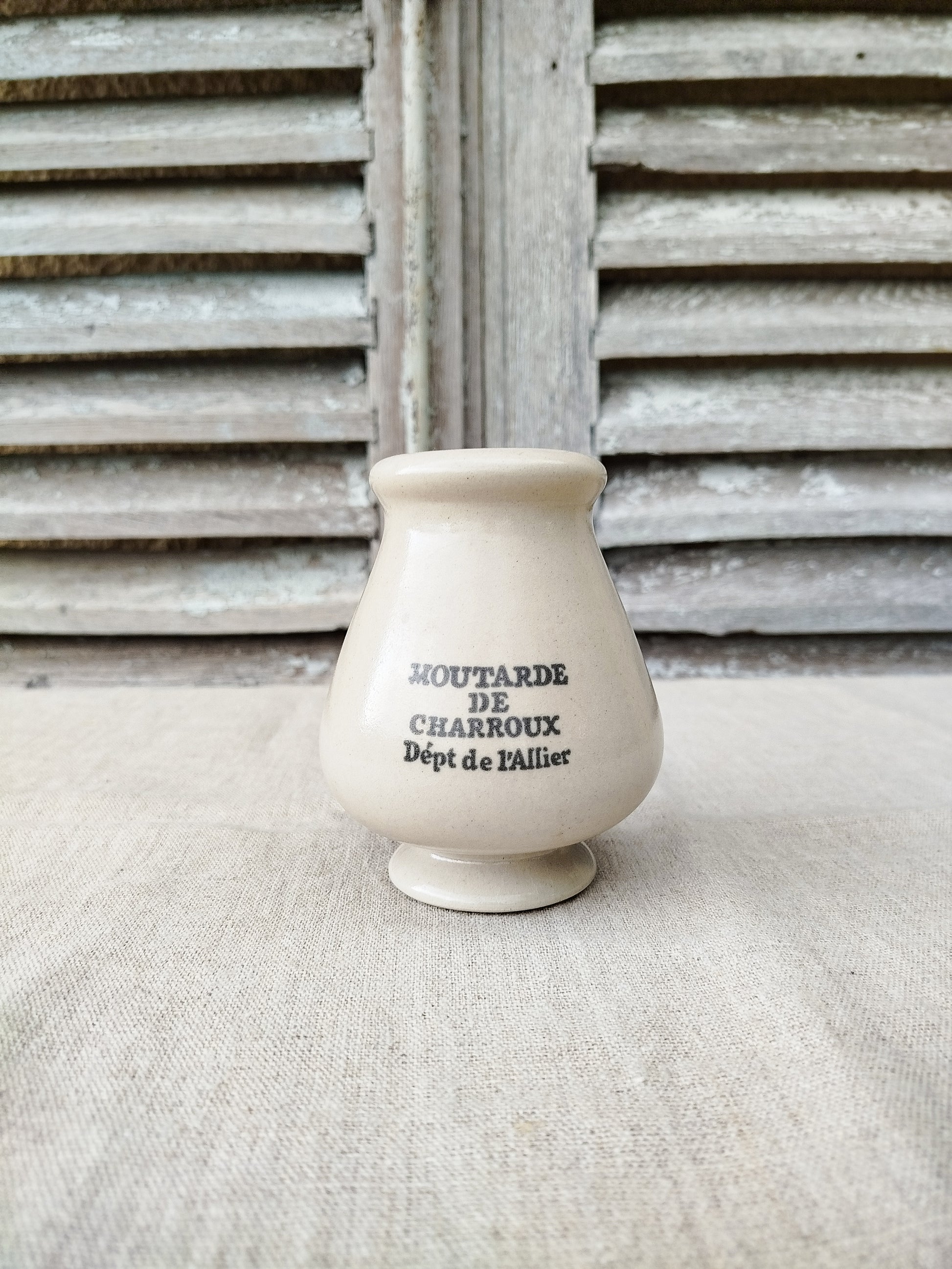 Il porte la mention : " Moutarde de Charroux Dépt de l'Allier " en lettres noires, sur le devant.