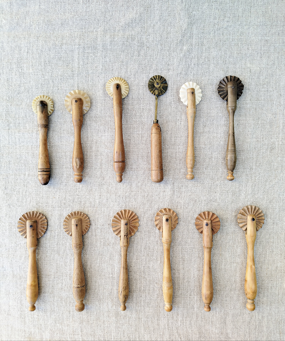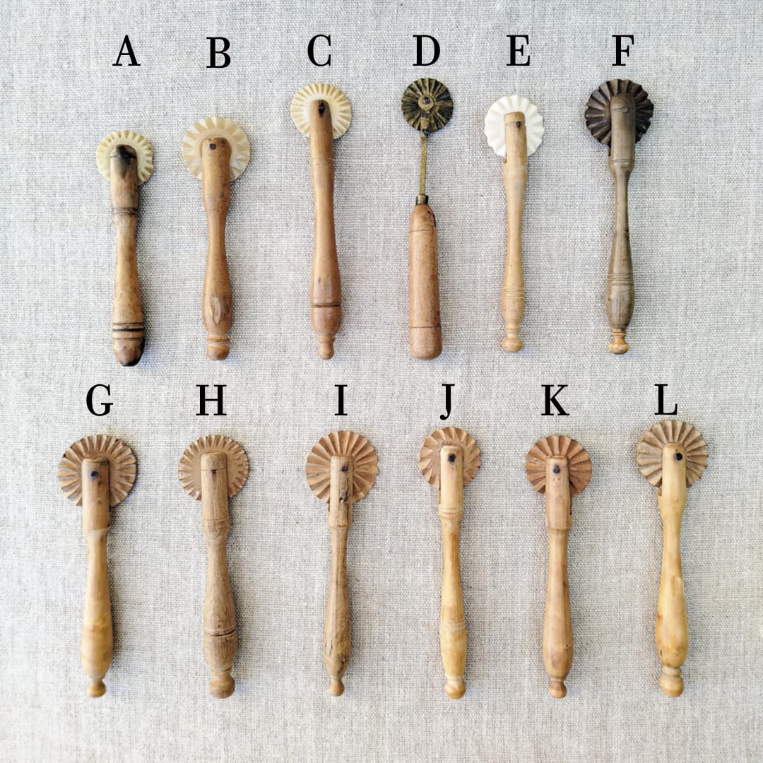 Certaines roulettes ont un manche en bois et la roulette est en plastique, d'autres sont uniquement en bois, une seule est en bois et métal.