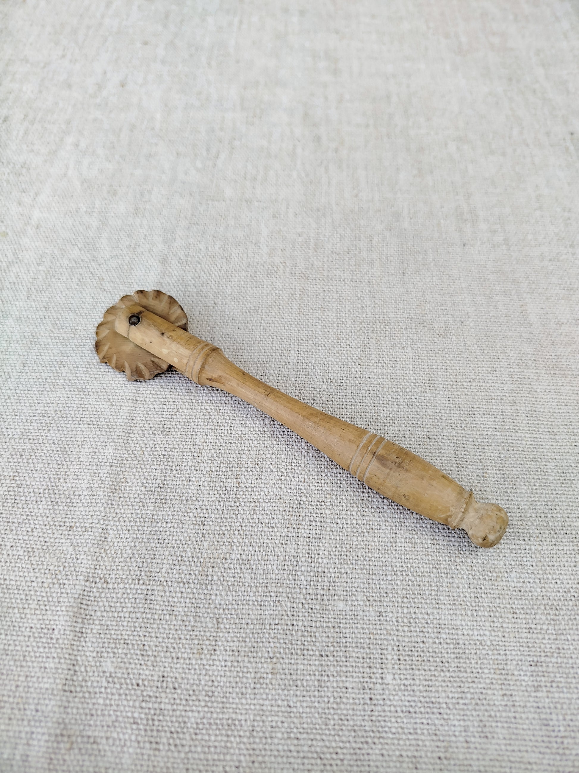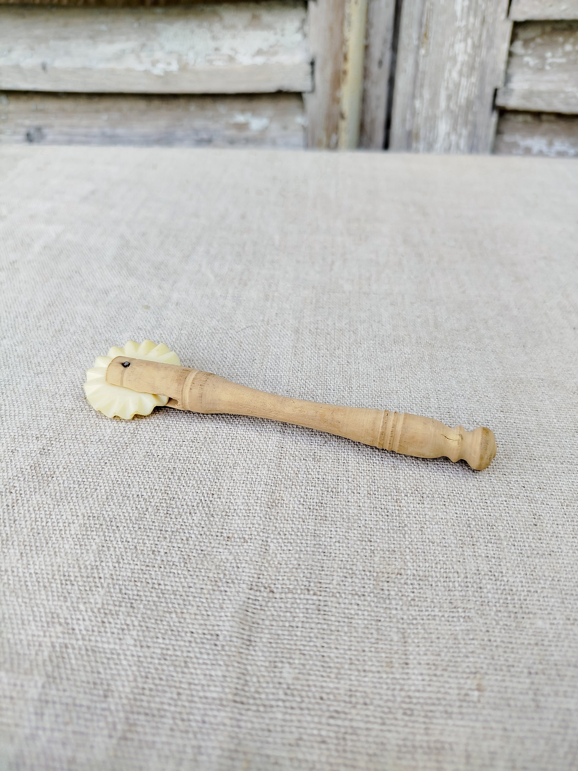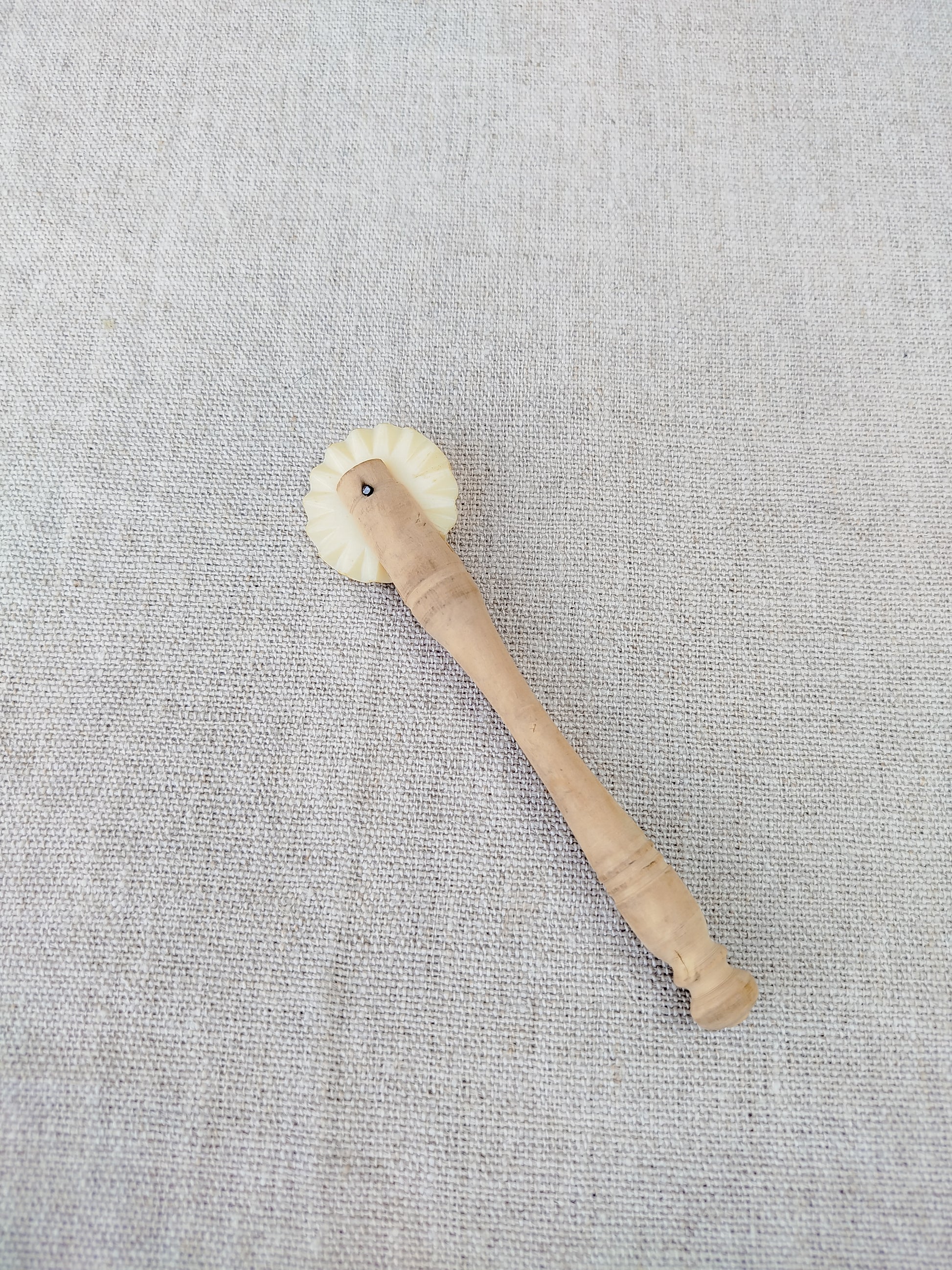 Modèle A : Manche en bois, roulette en plastique couleur jaune pastel, très bon état. 12,2 cm