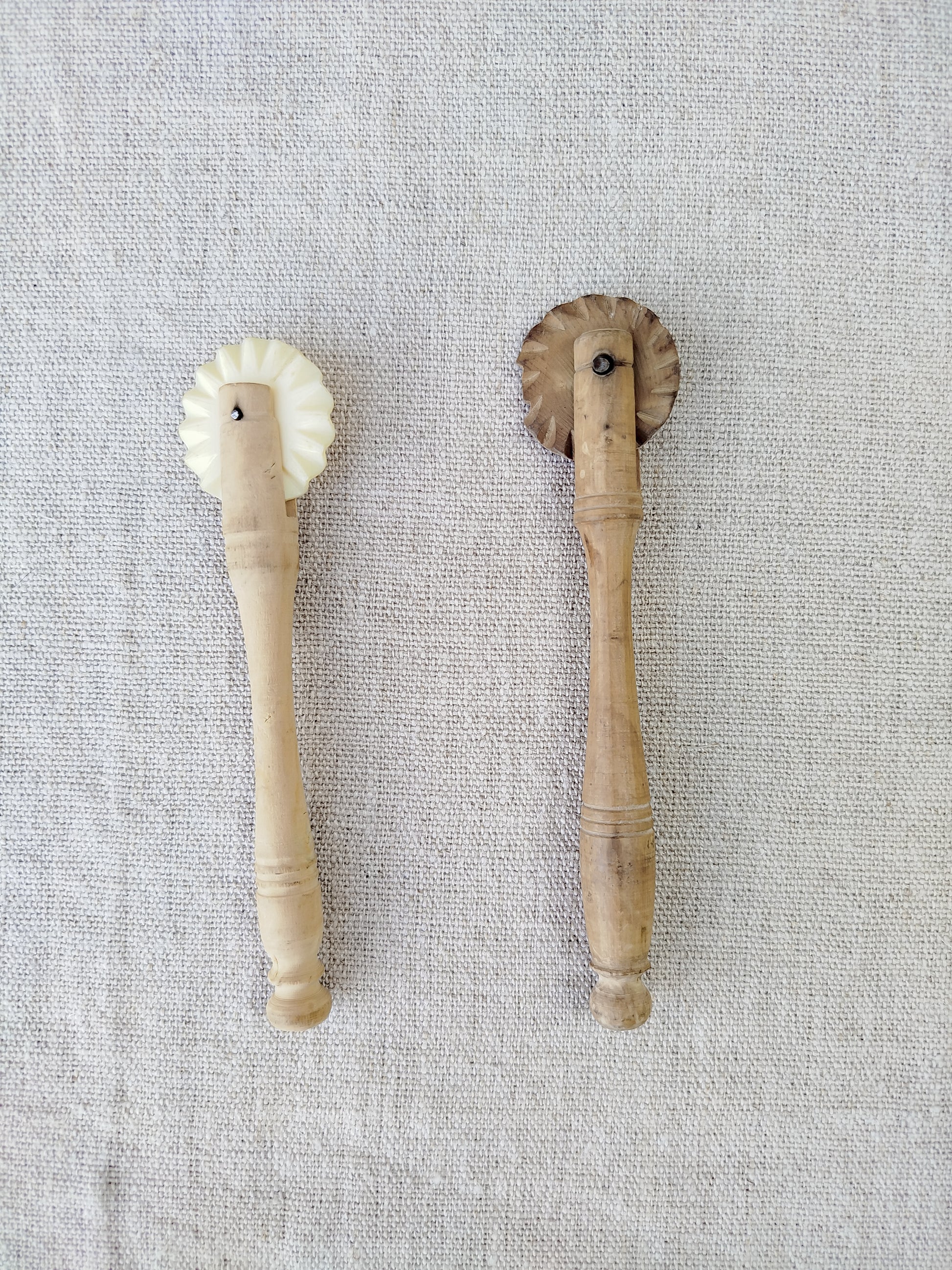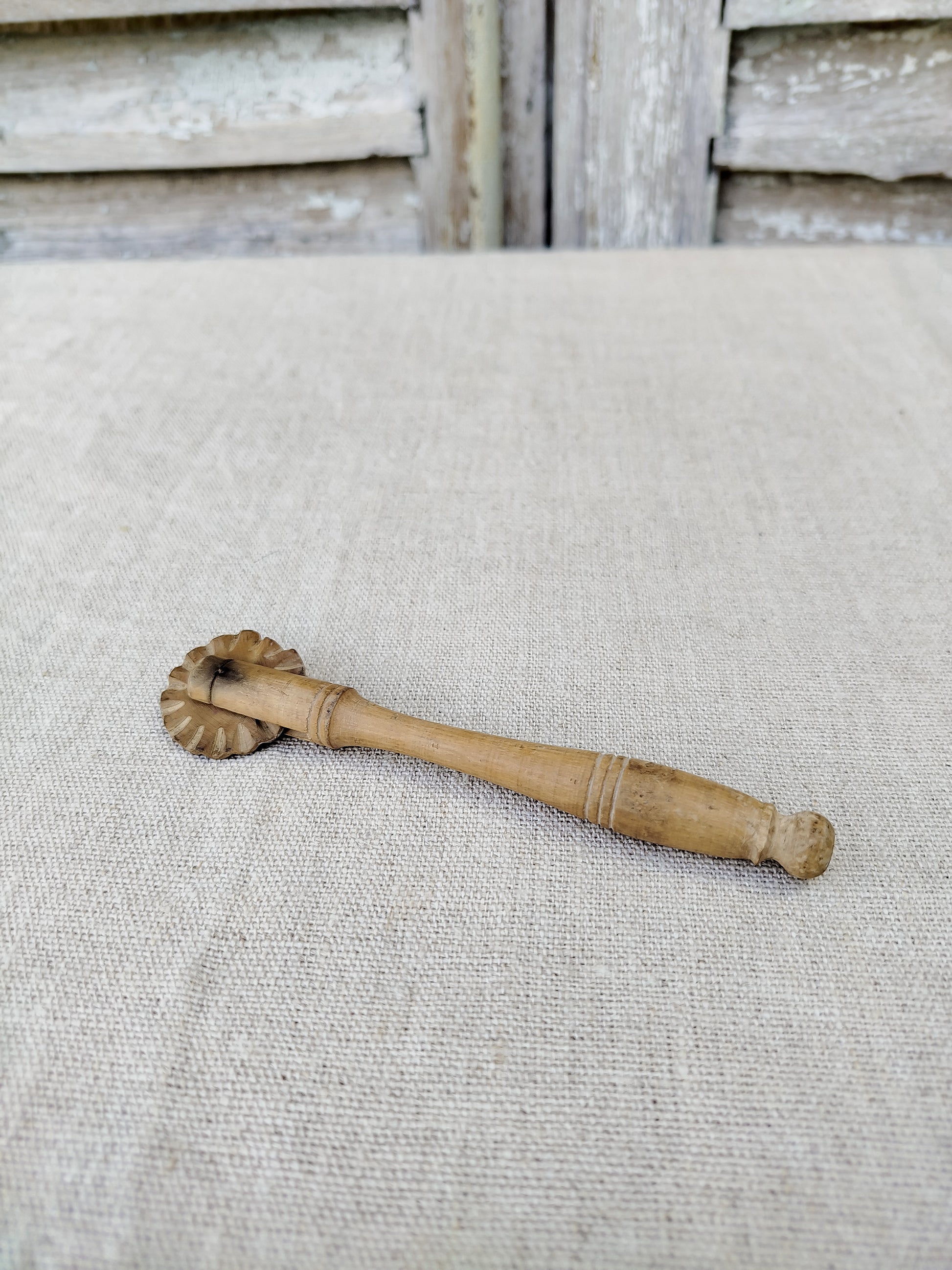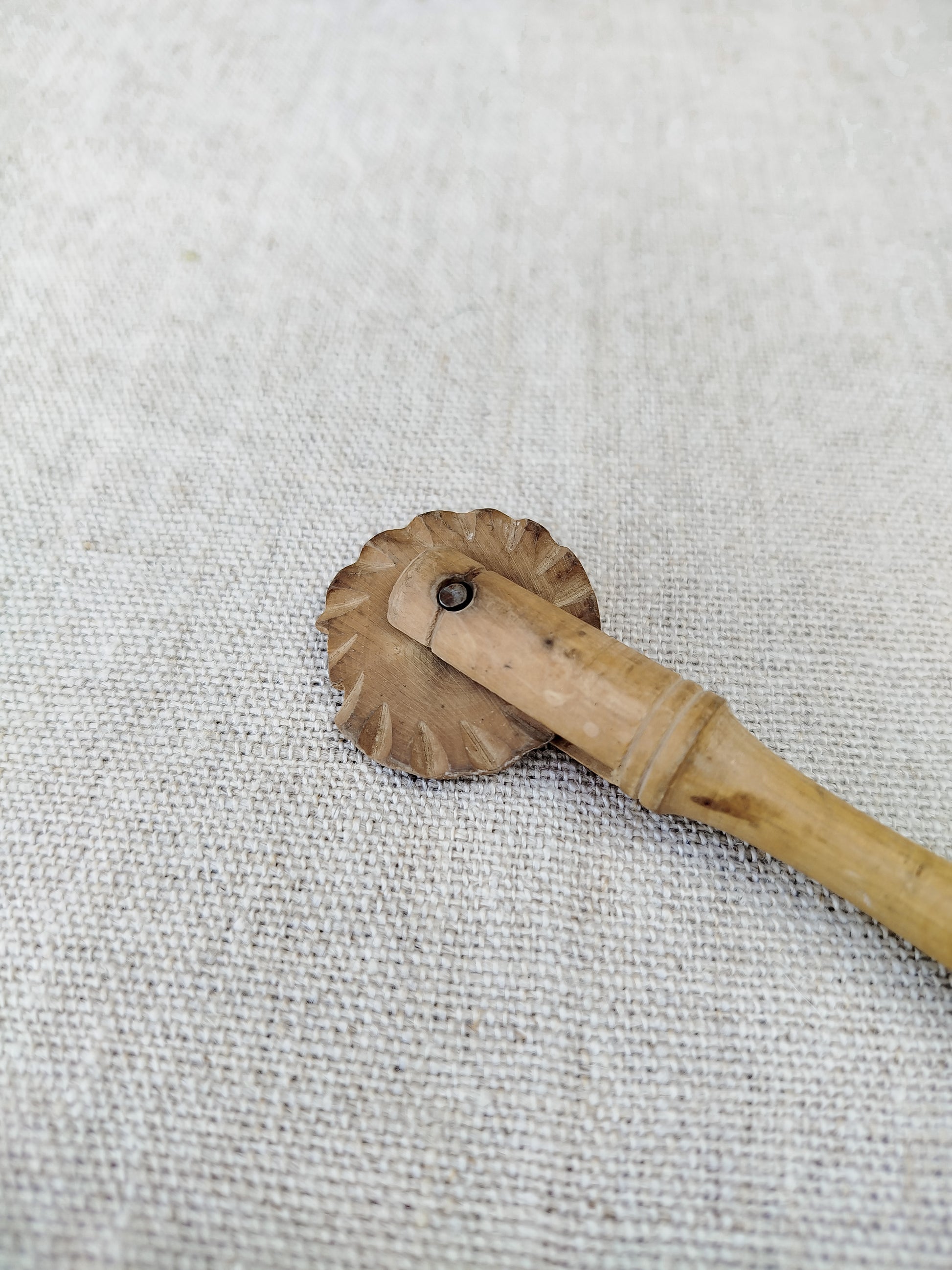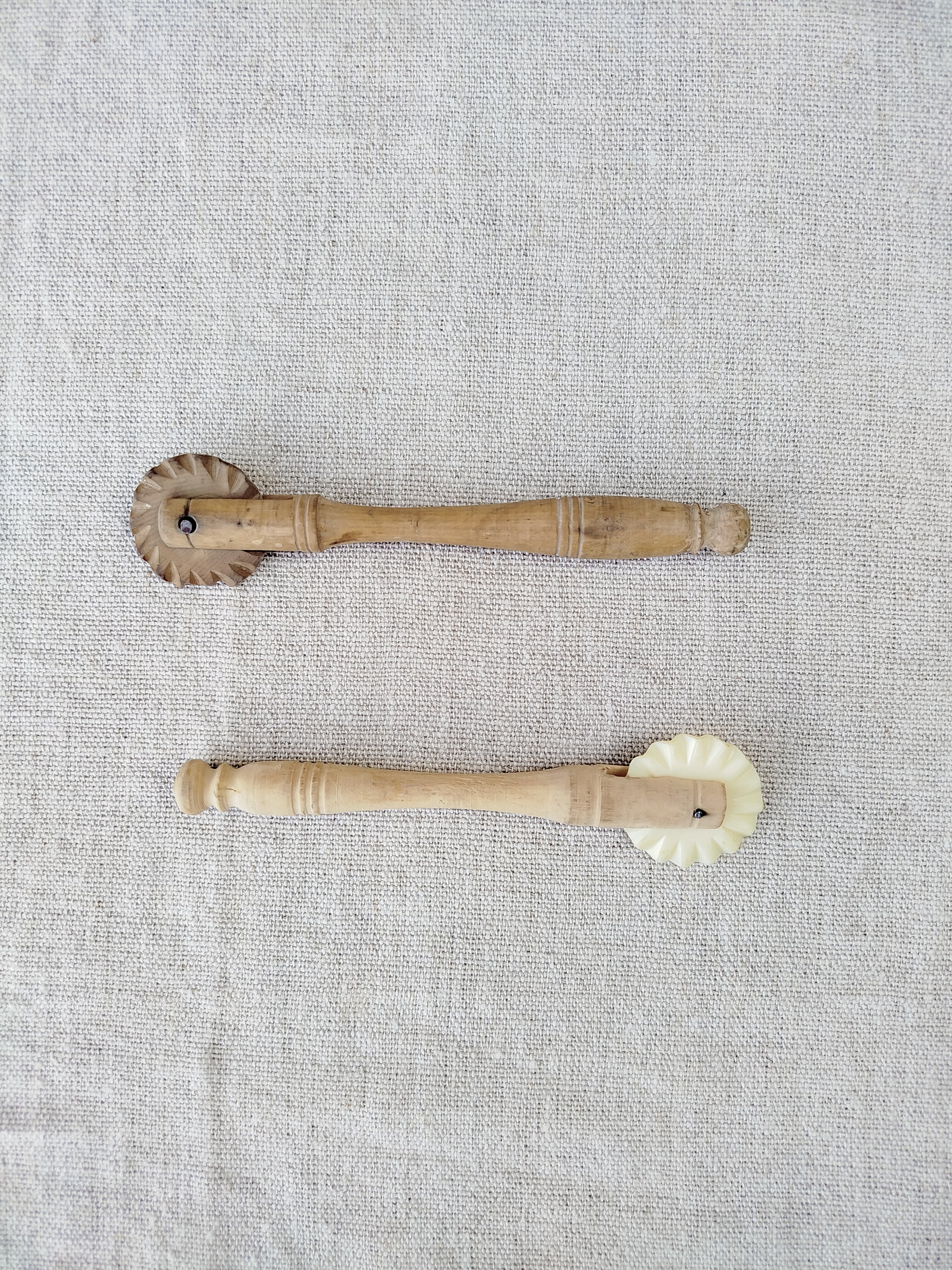 Modèle A : Manche en bois, roulette en plastique couleur jaune pastel, très bon état. 12,2 cm