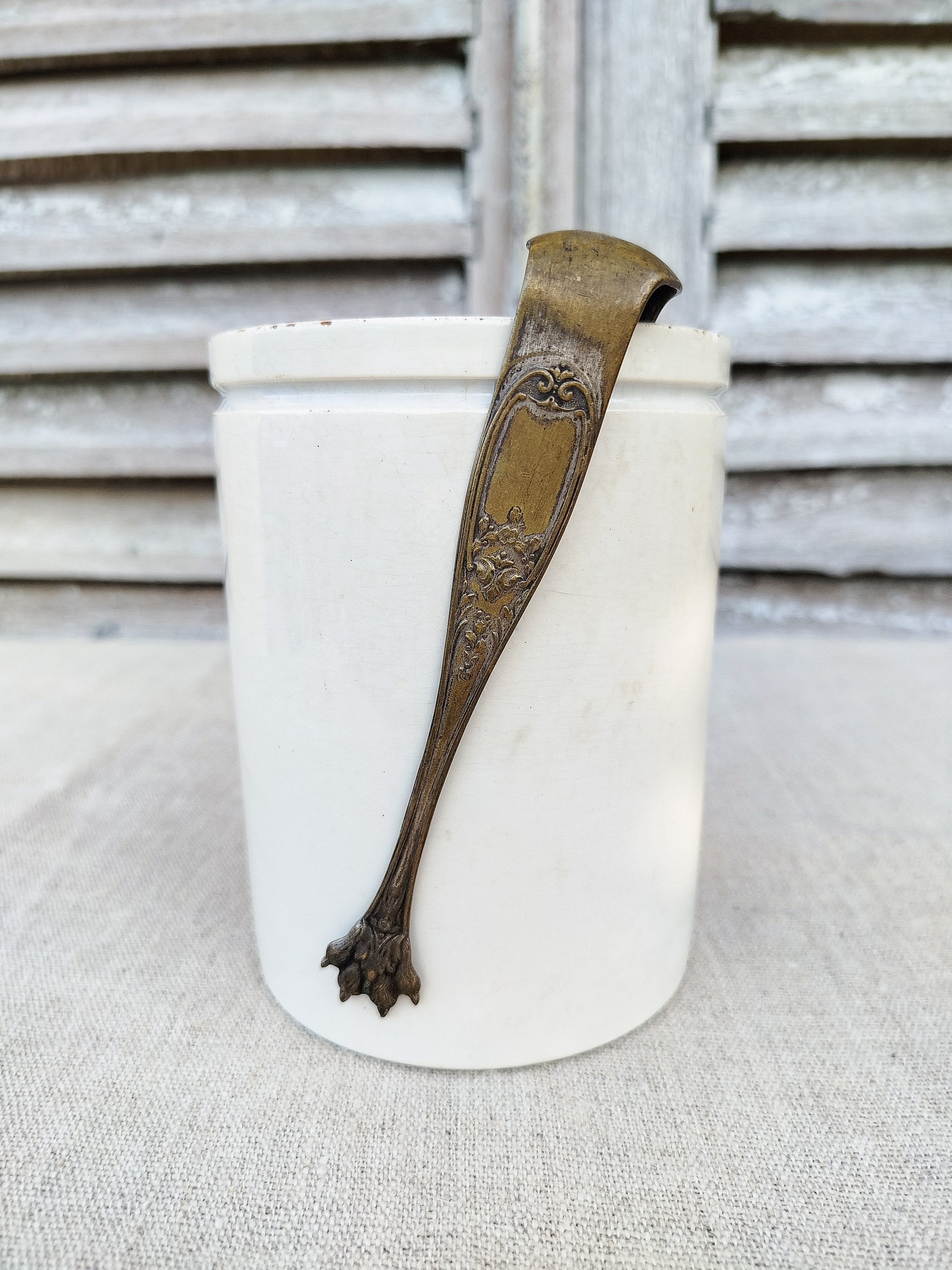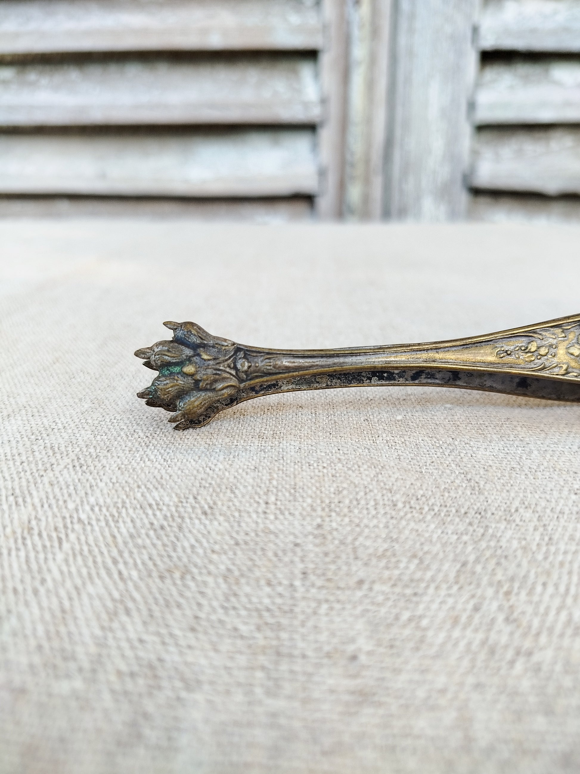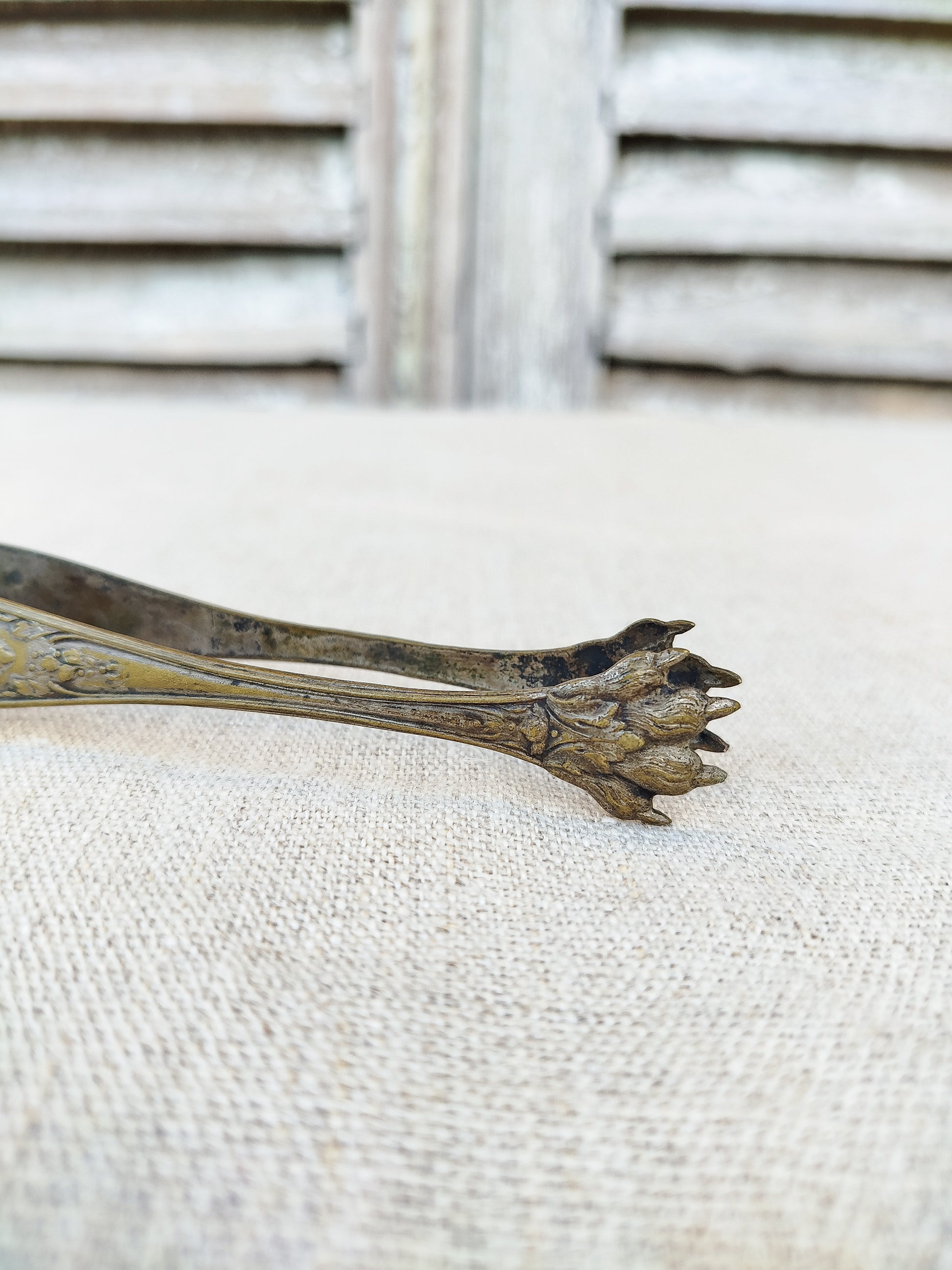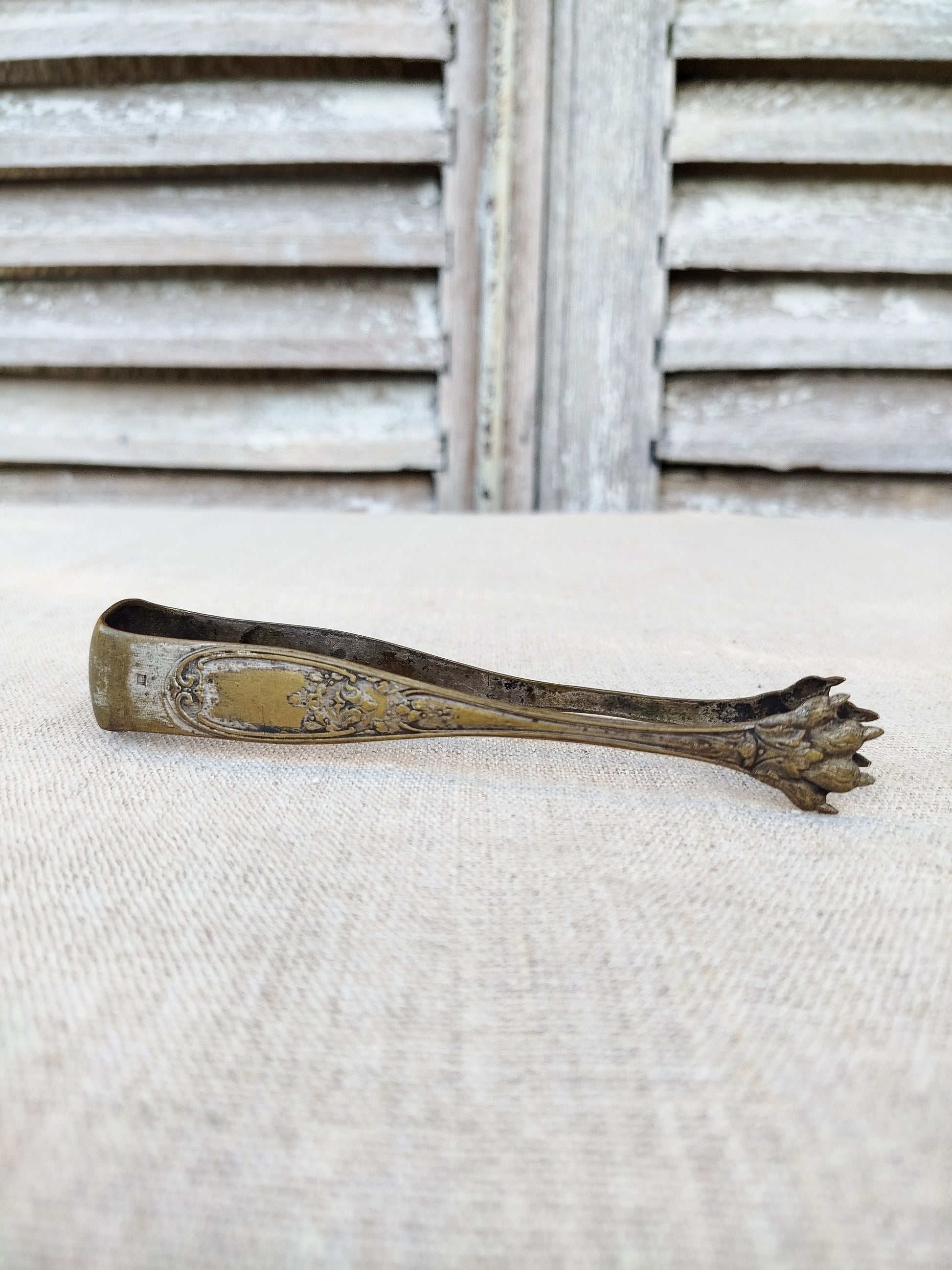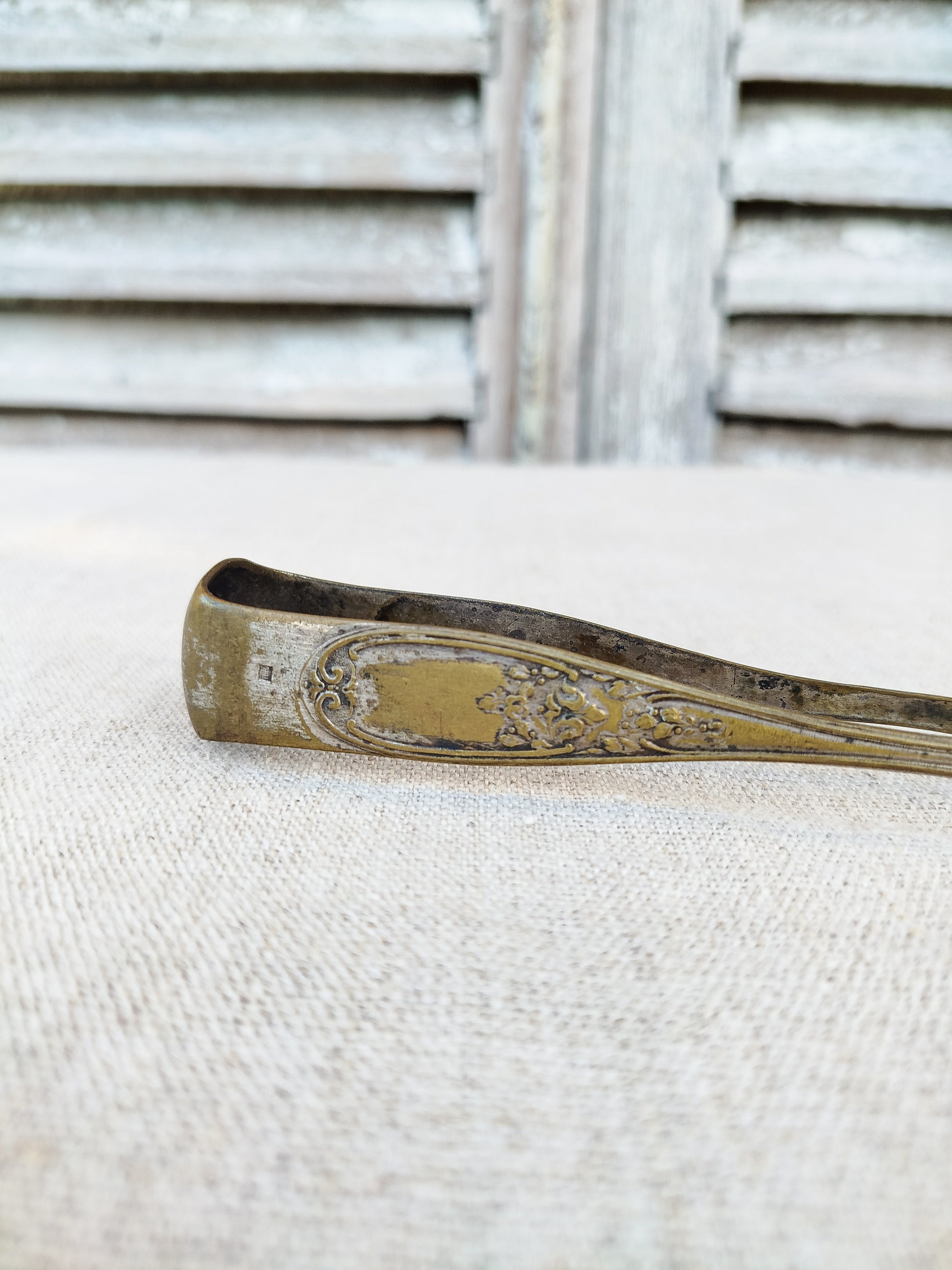 Il s'agit d'une pince à sucre ancienne en métal doré.