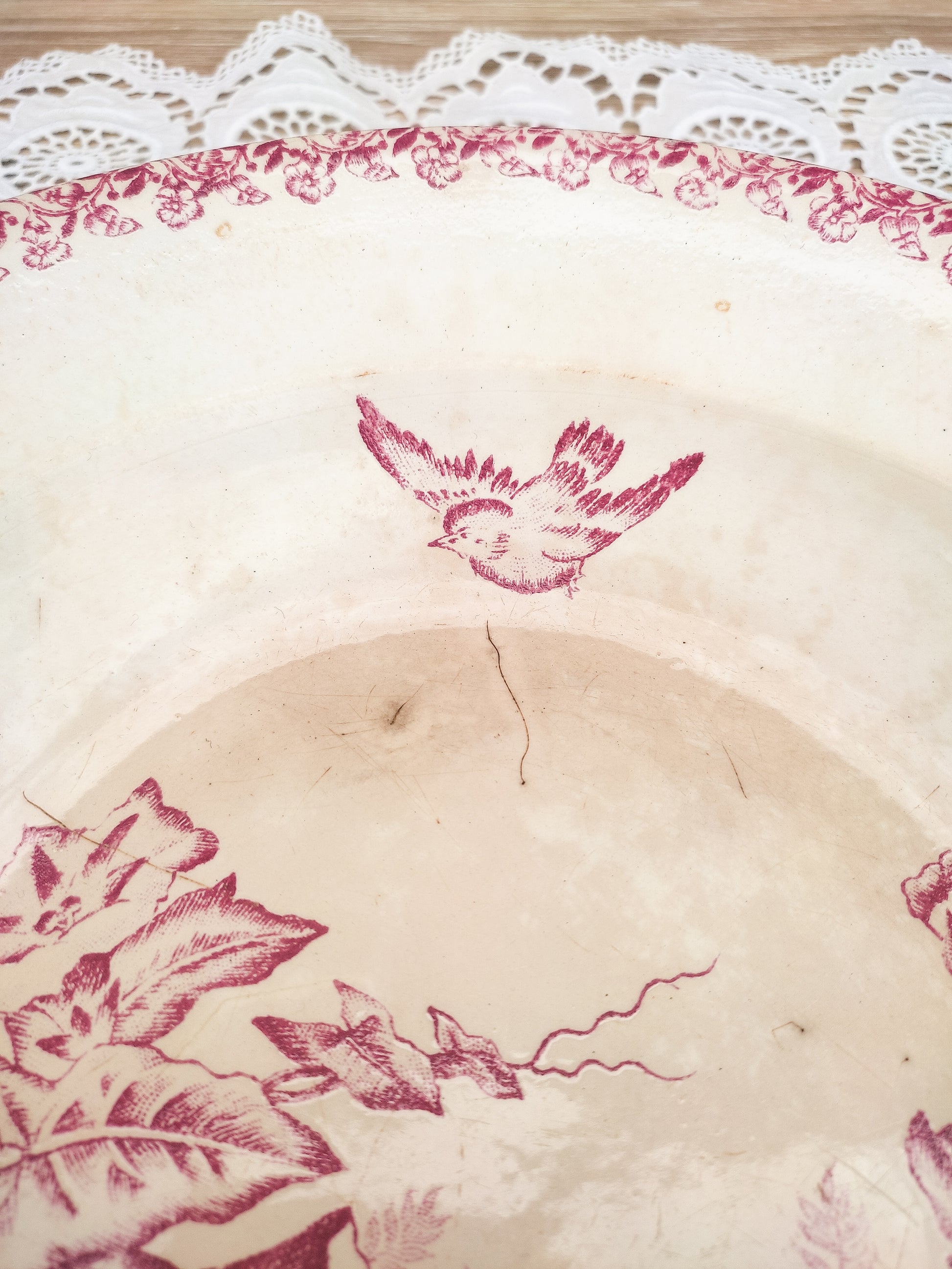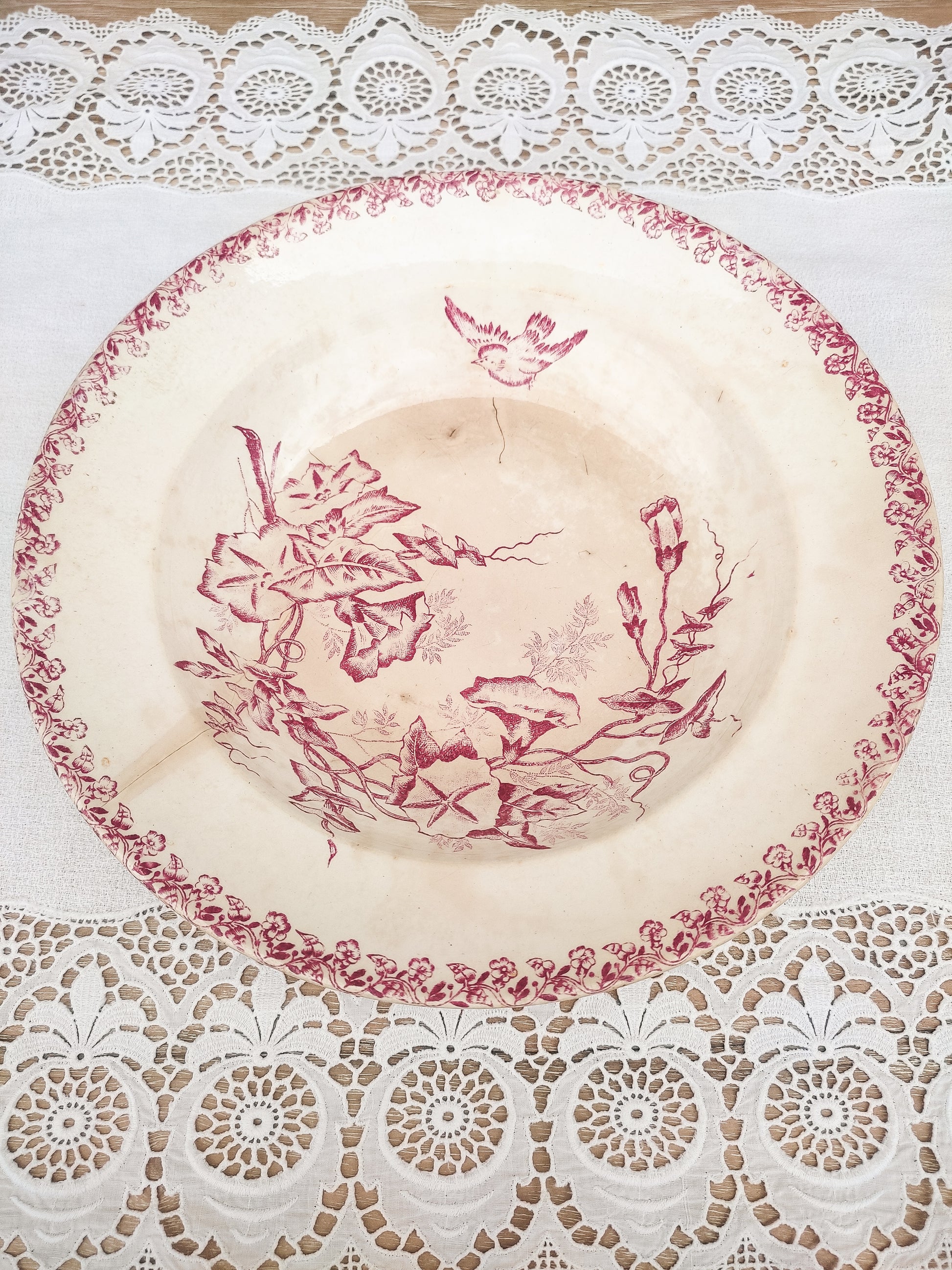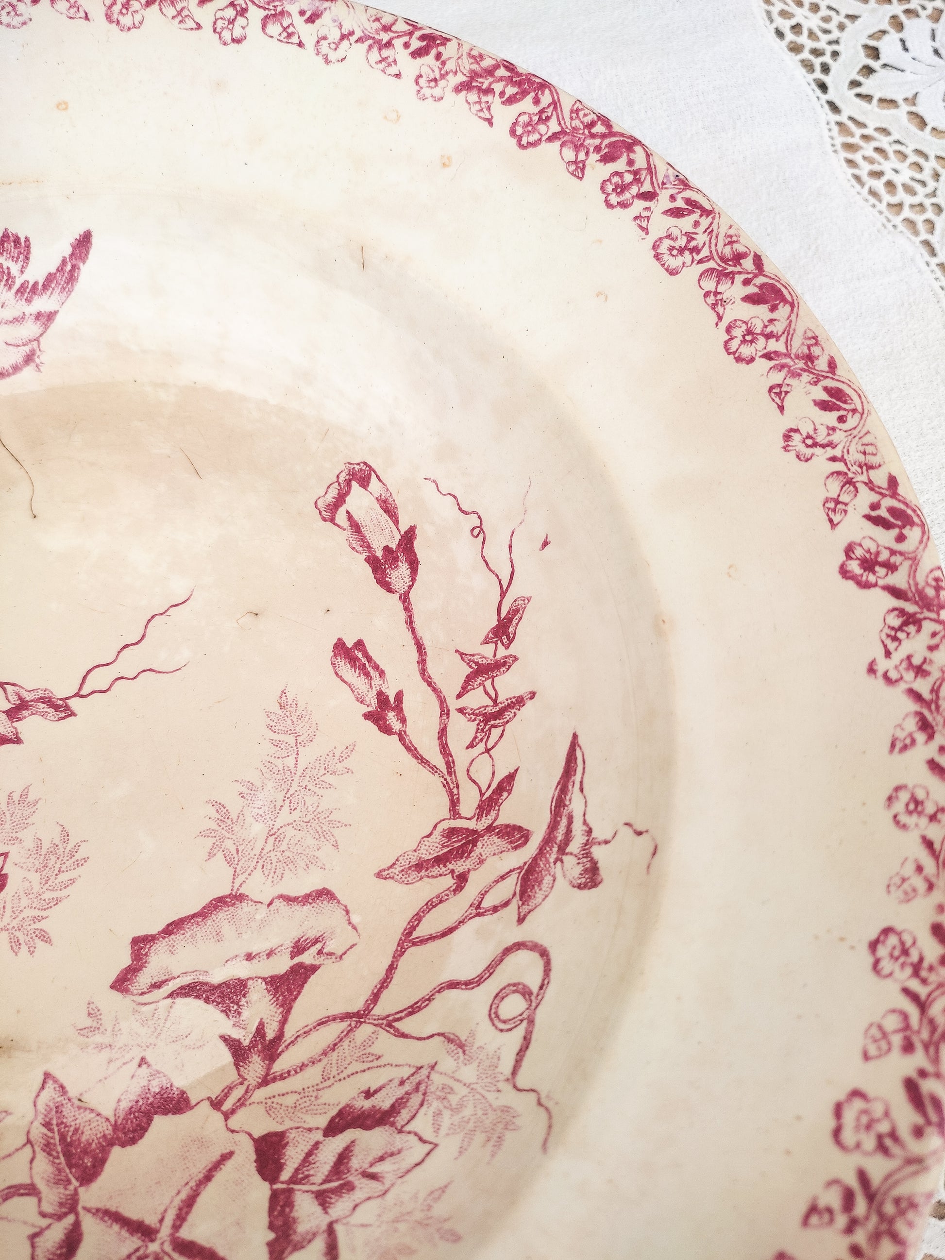 Décors rouges, un oiseau volant au dessus de fleurs. Petite frise florale tout autour de l'assiette.