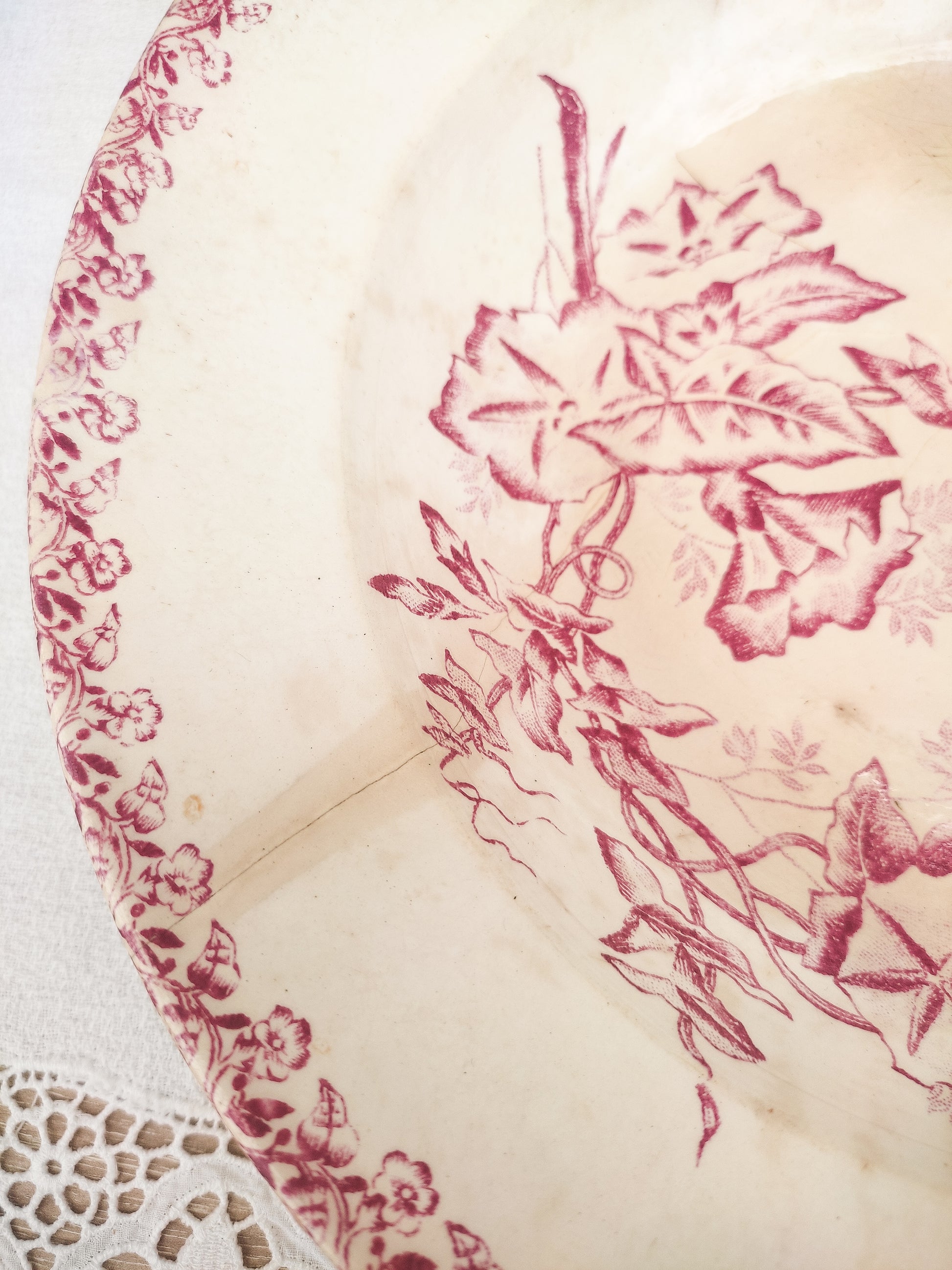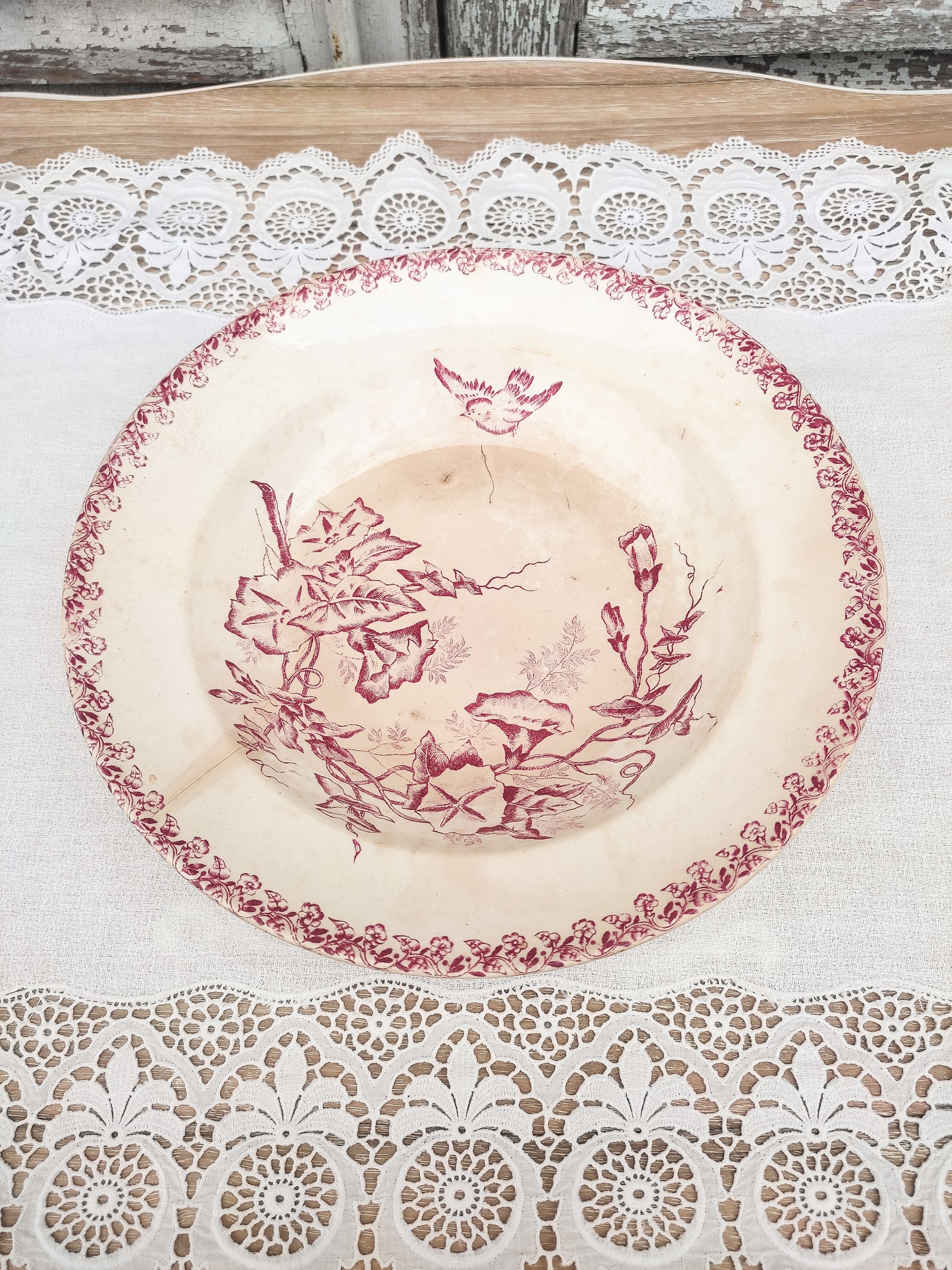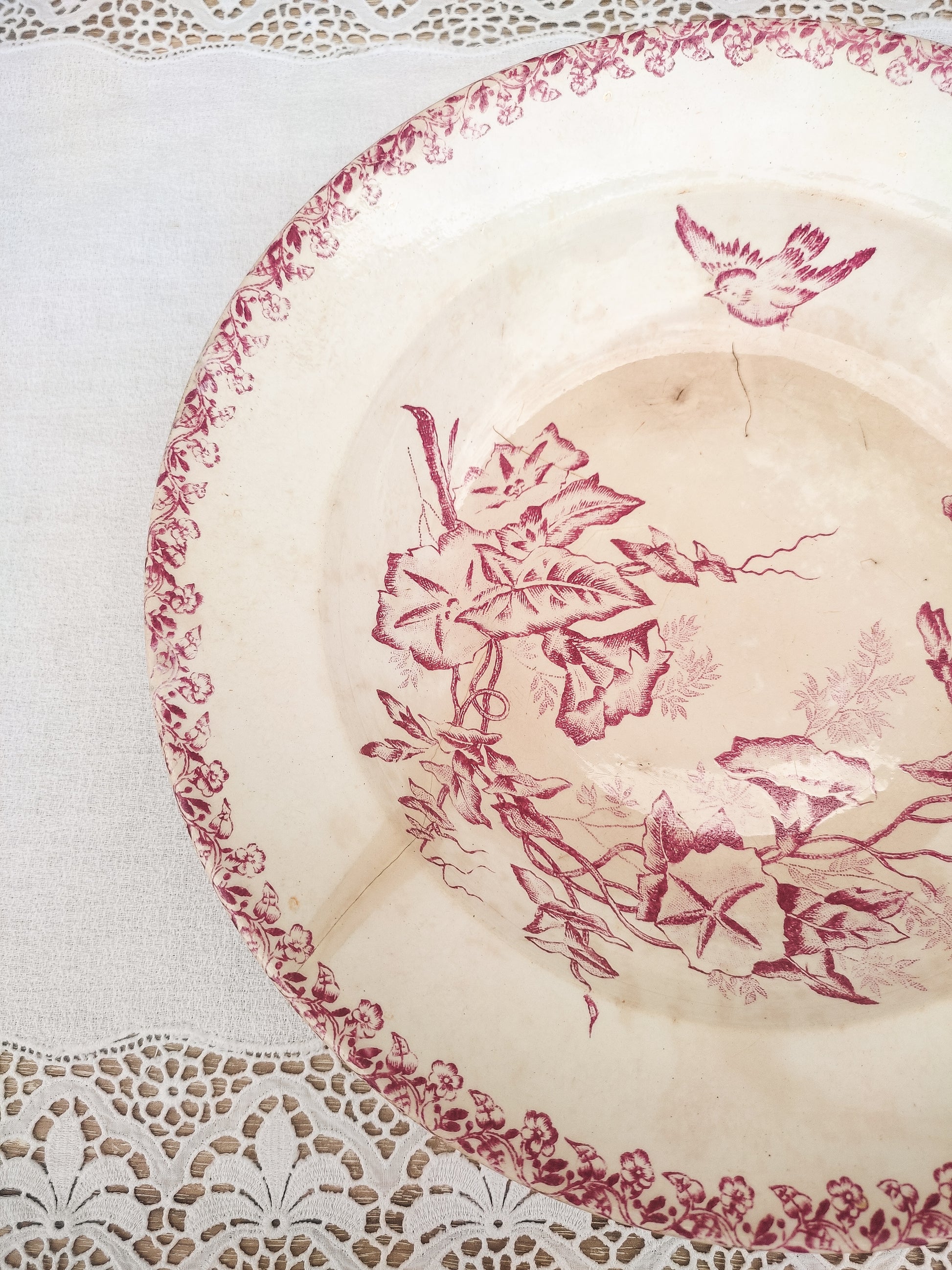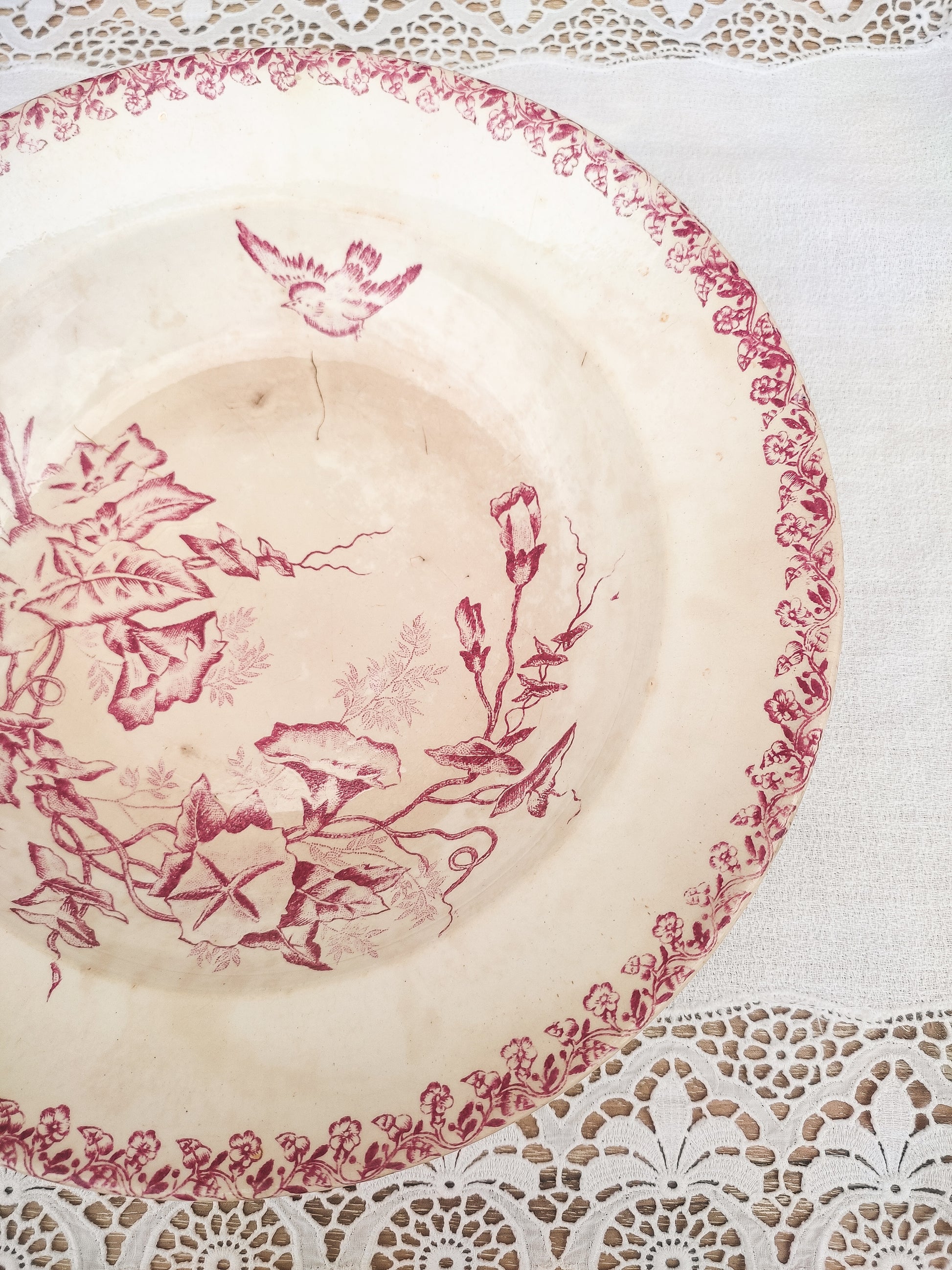 Décors rouges, un oiseau volant au dessus de fleurs. Petite frise florale tout autour de l'assiette.