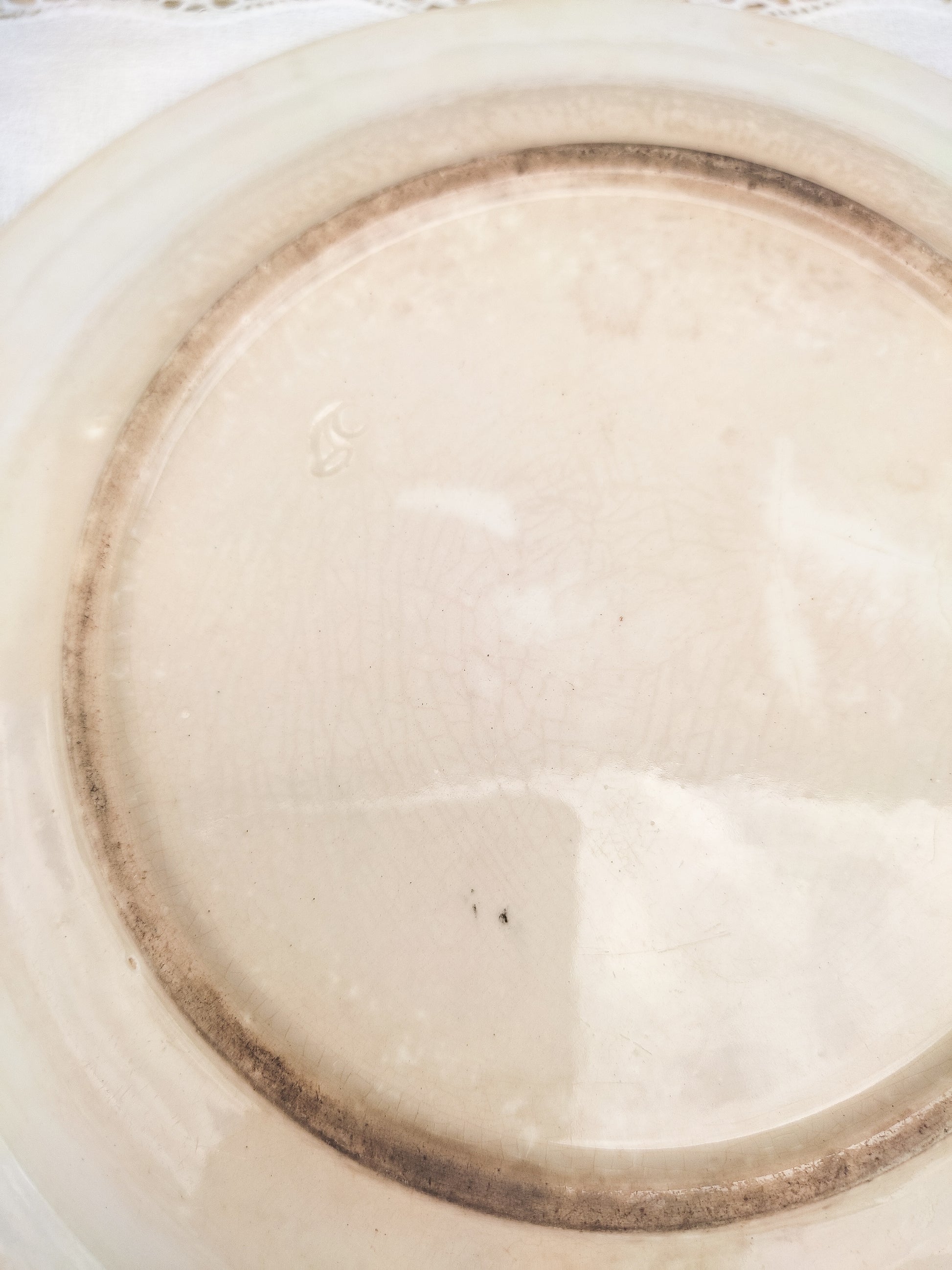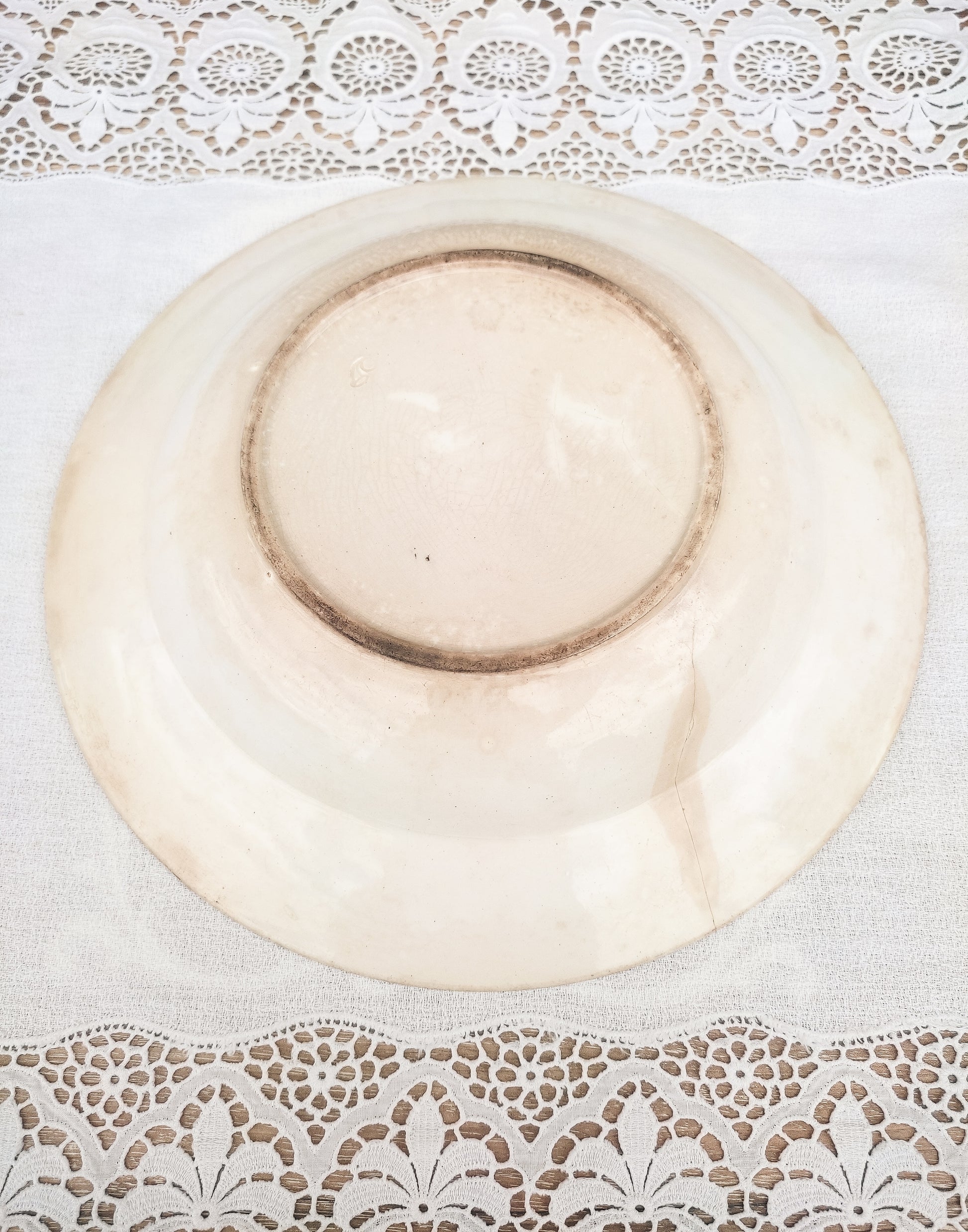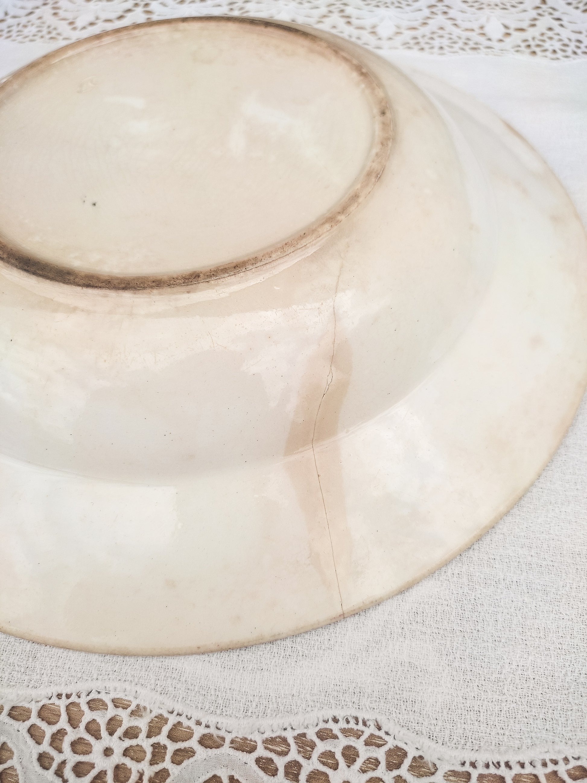 Patine ancienne présente, petites tâches de fer, une fêle et plusieurs rayures noires.