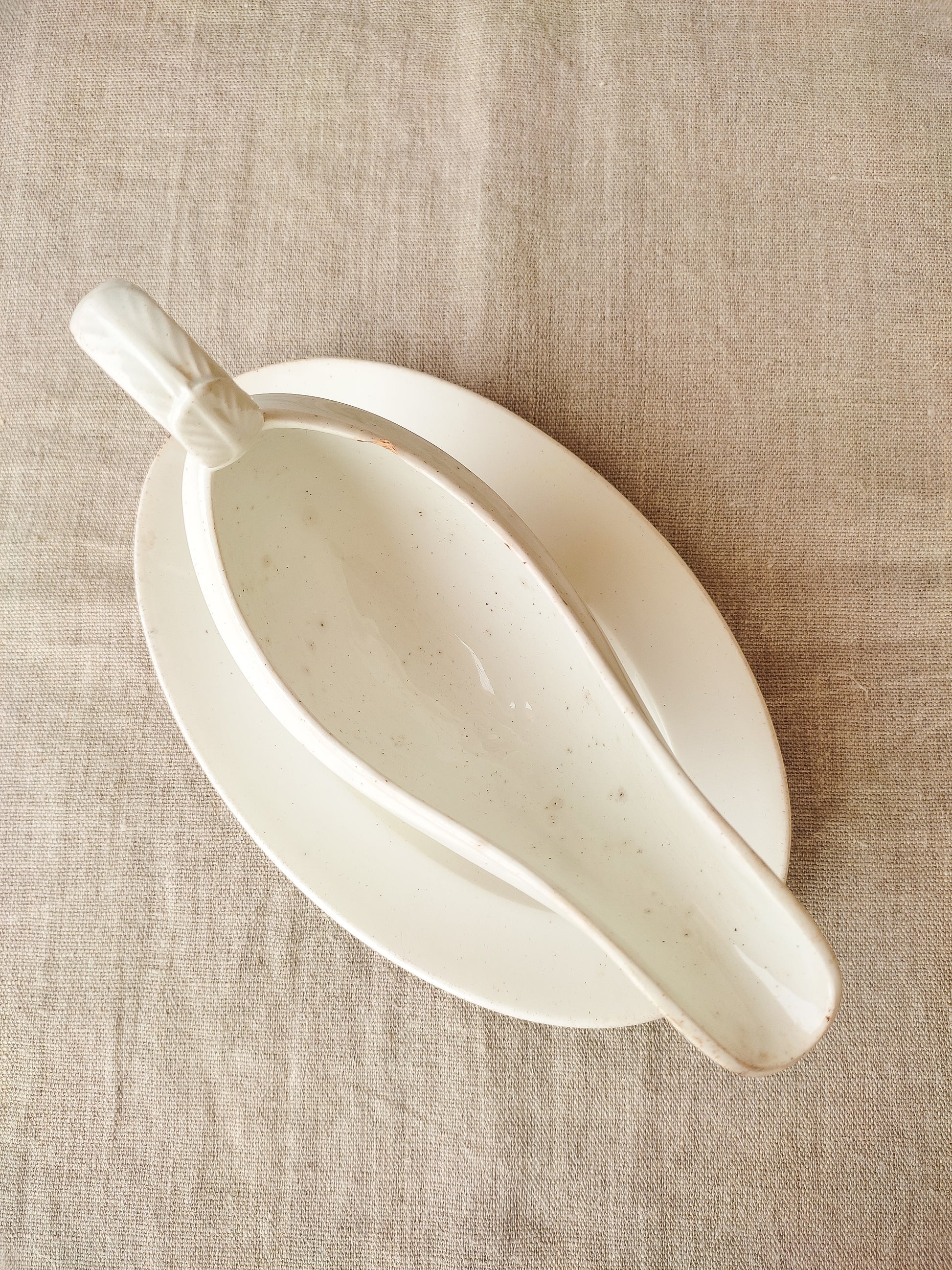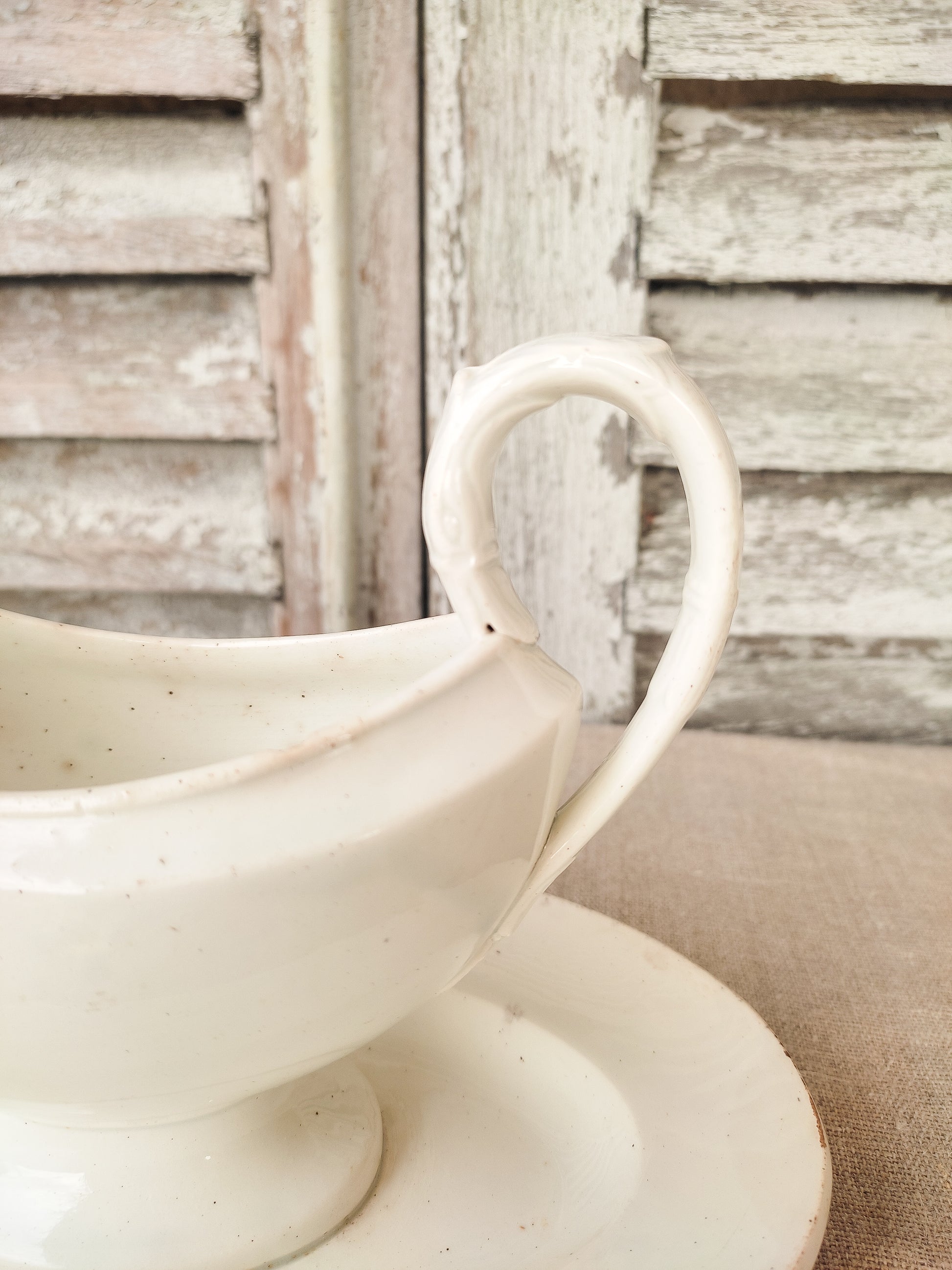 Elle est en faïence blanche, avec un plateau oval intégré à sa base.