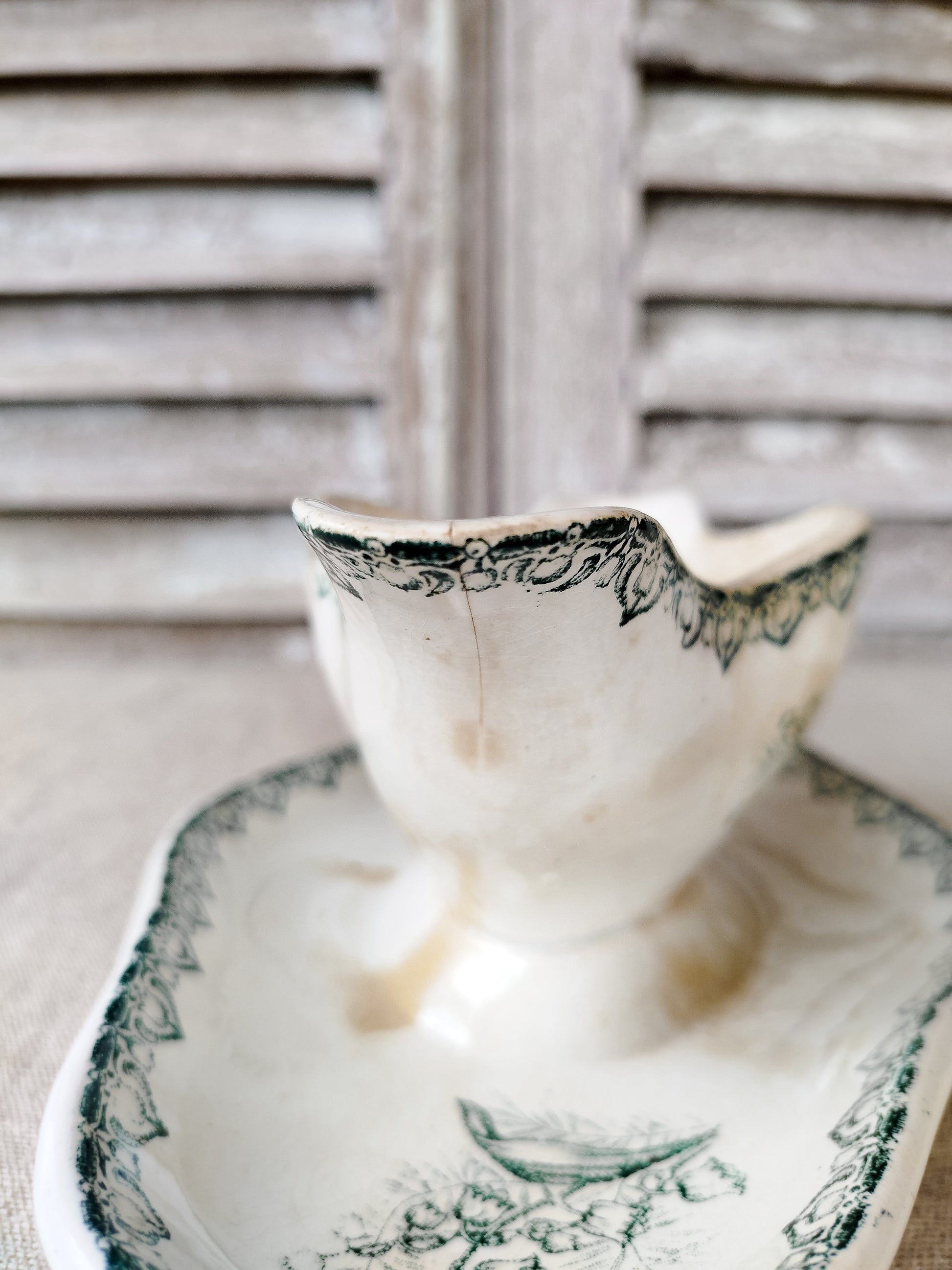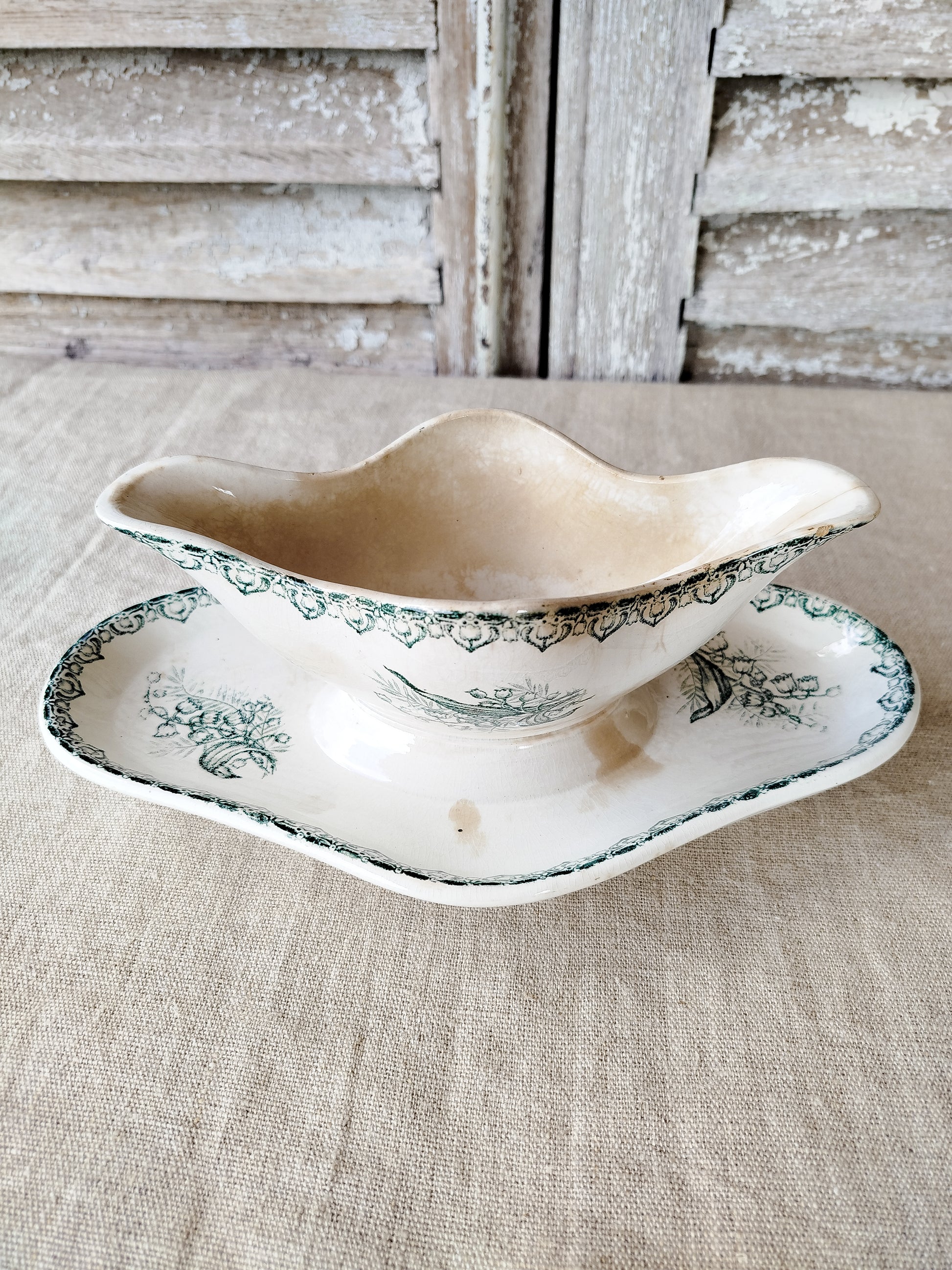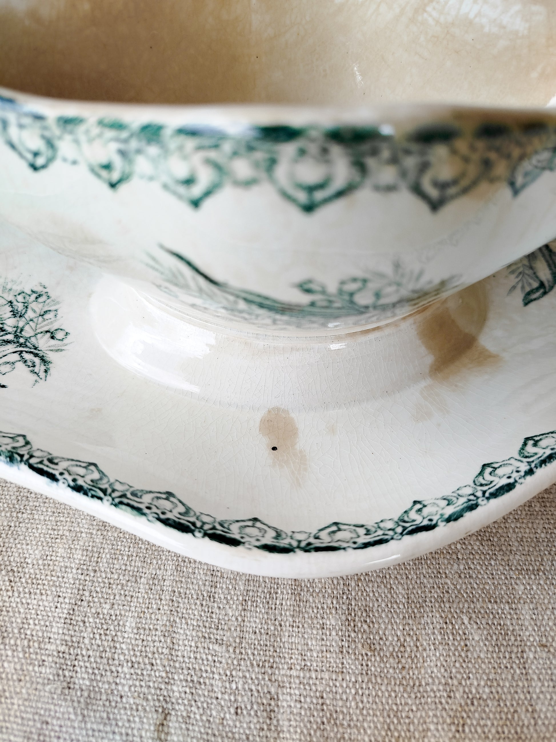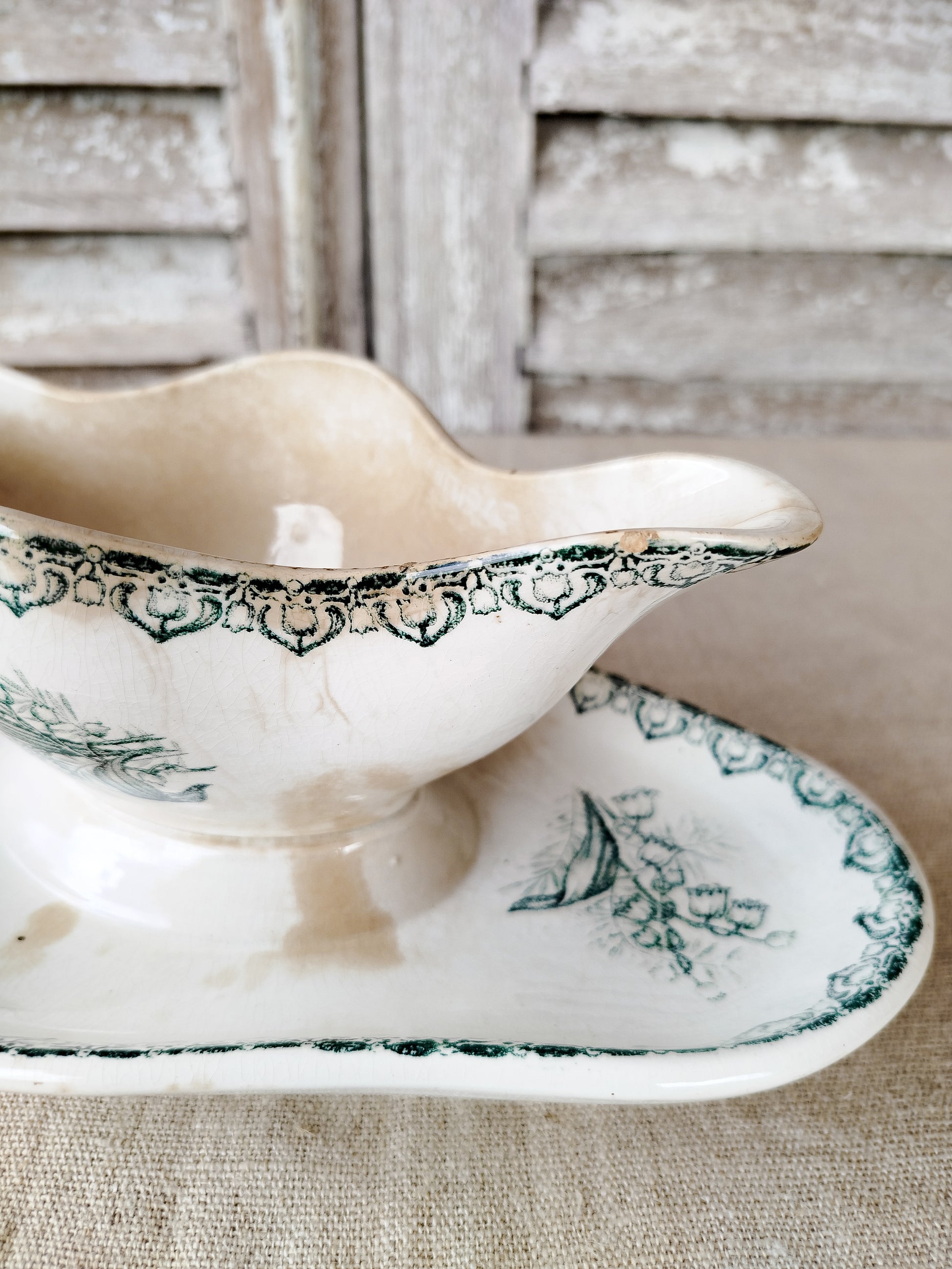 La saucière présente un petit éclat sur le rebord du haut, et un cheveux sur une extrémité. (Photos).