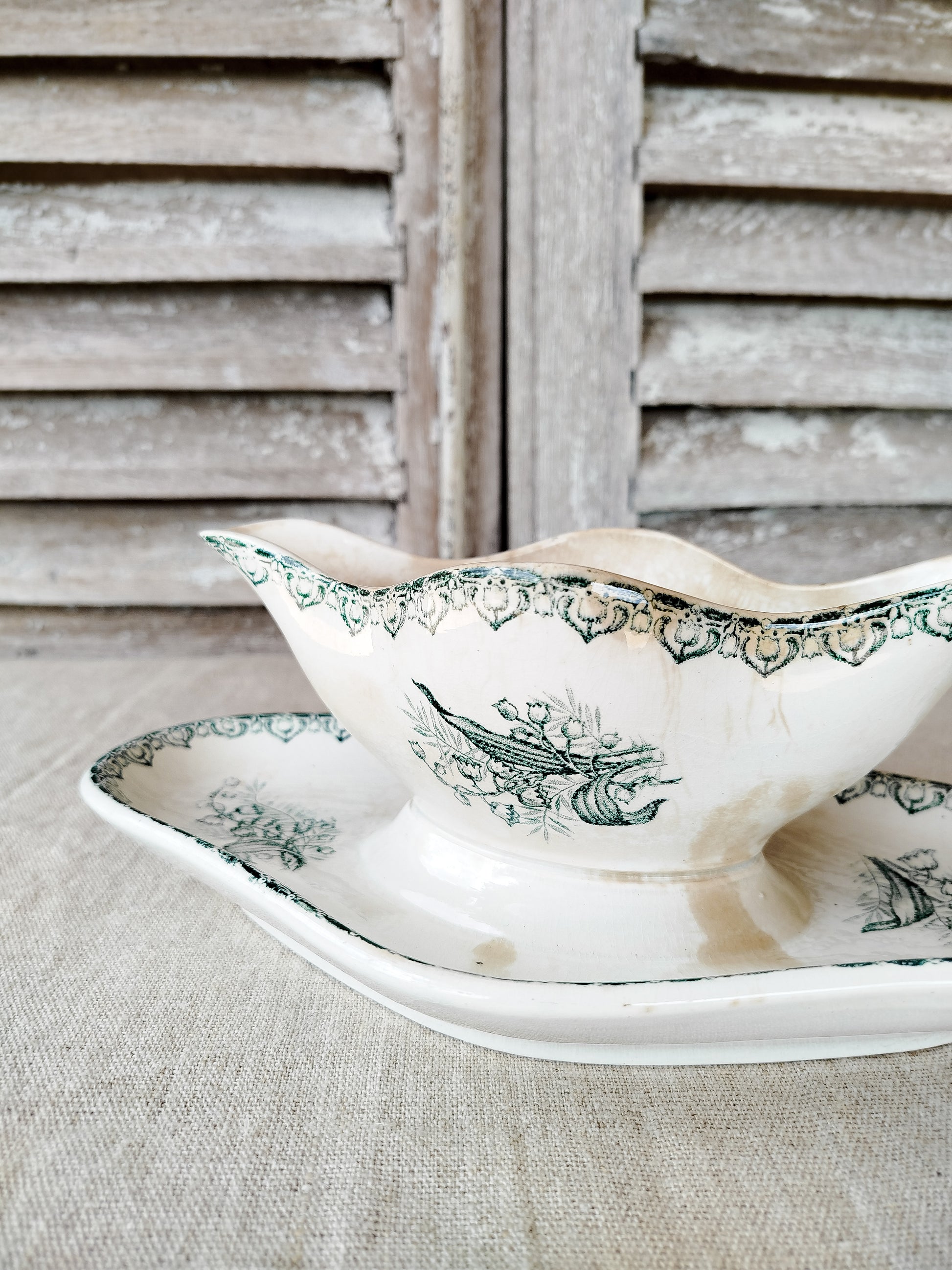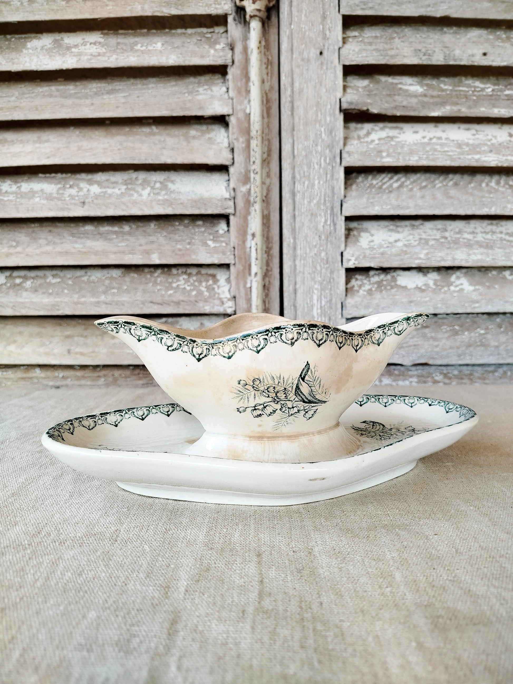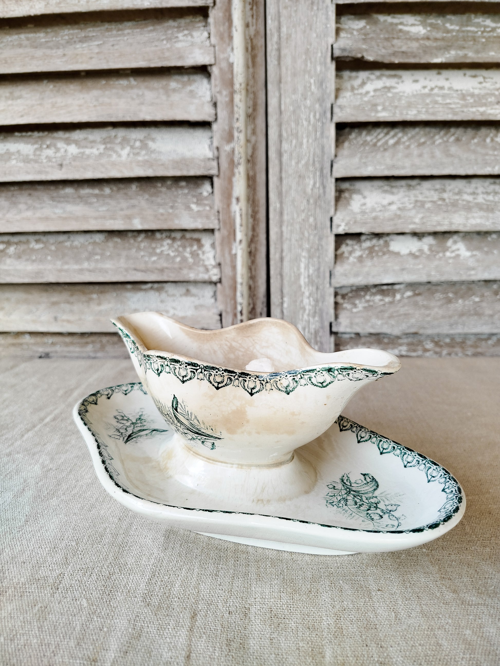La saucière présente un petit éclat sur le rebord du haut, et un cheveux sur une extrémité. (Photos).