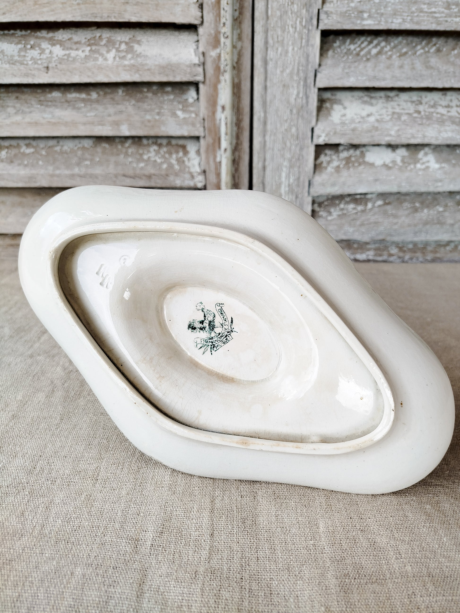 Le décor nommé " Muguet ", représente une frise décorative sur les contours de l'objet et différents brins de muguet sur le plateau et de chaque côté du récipient.