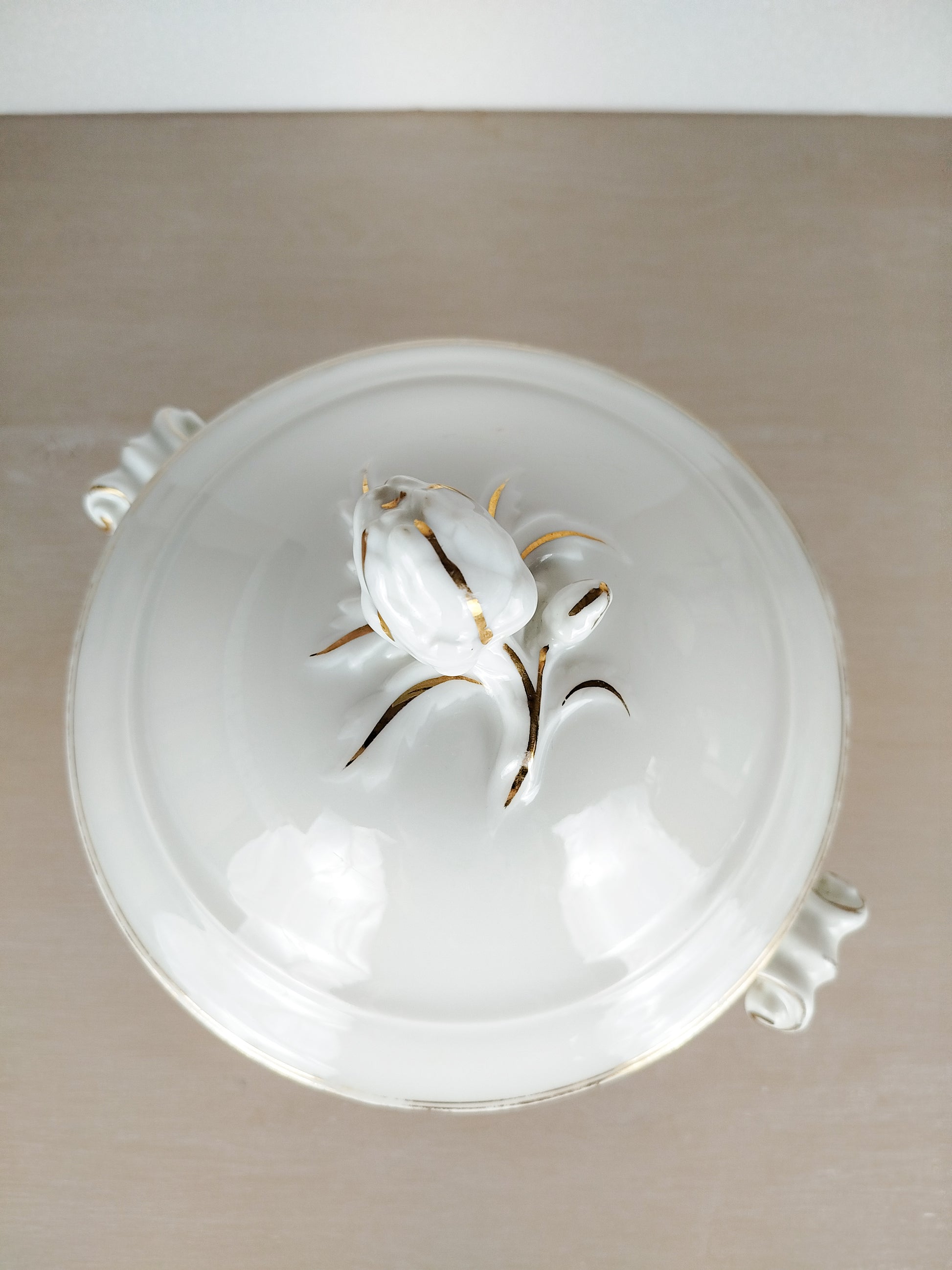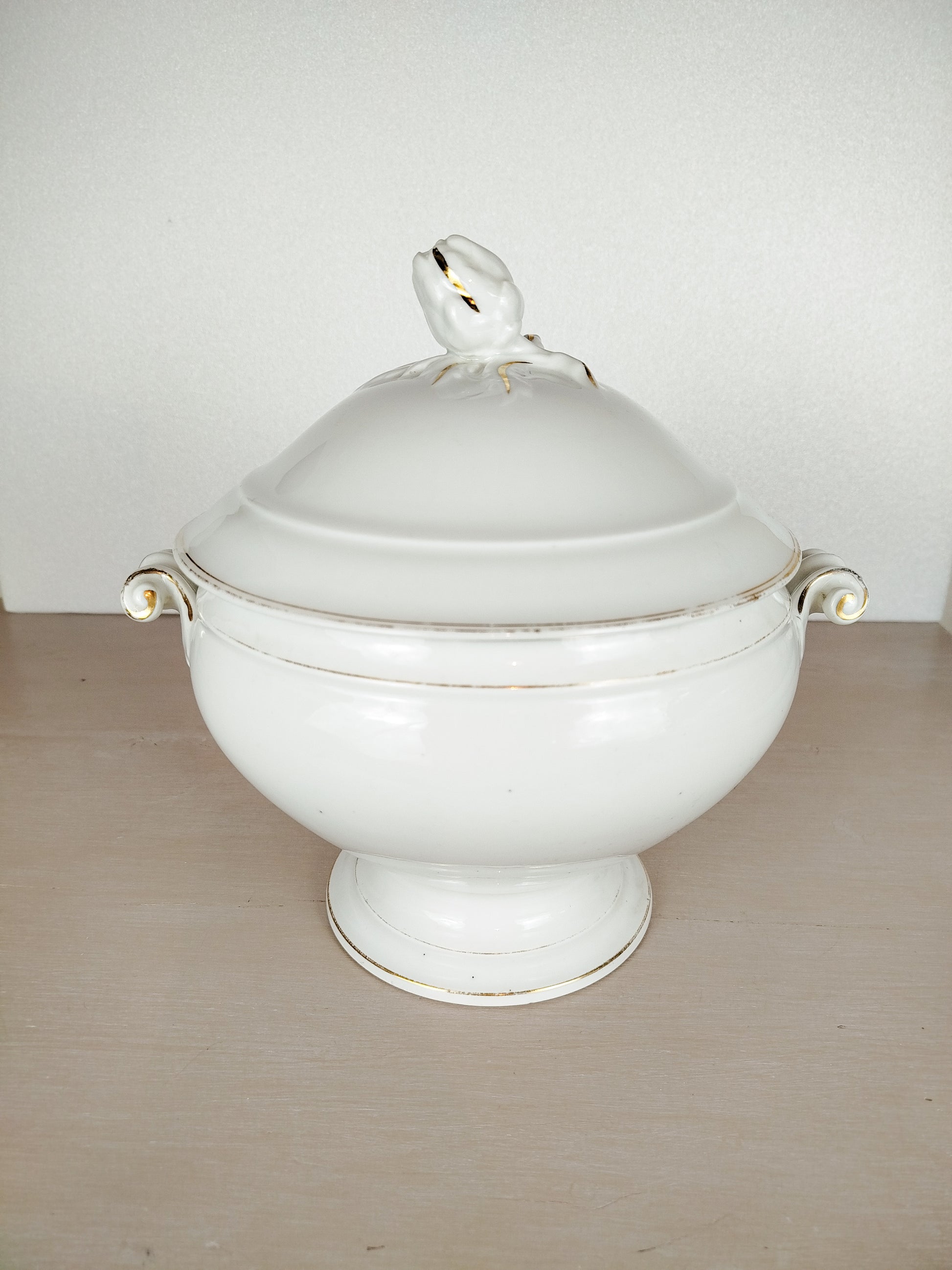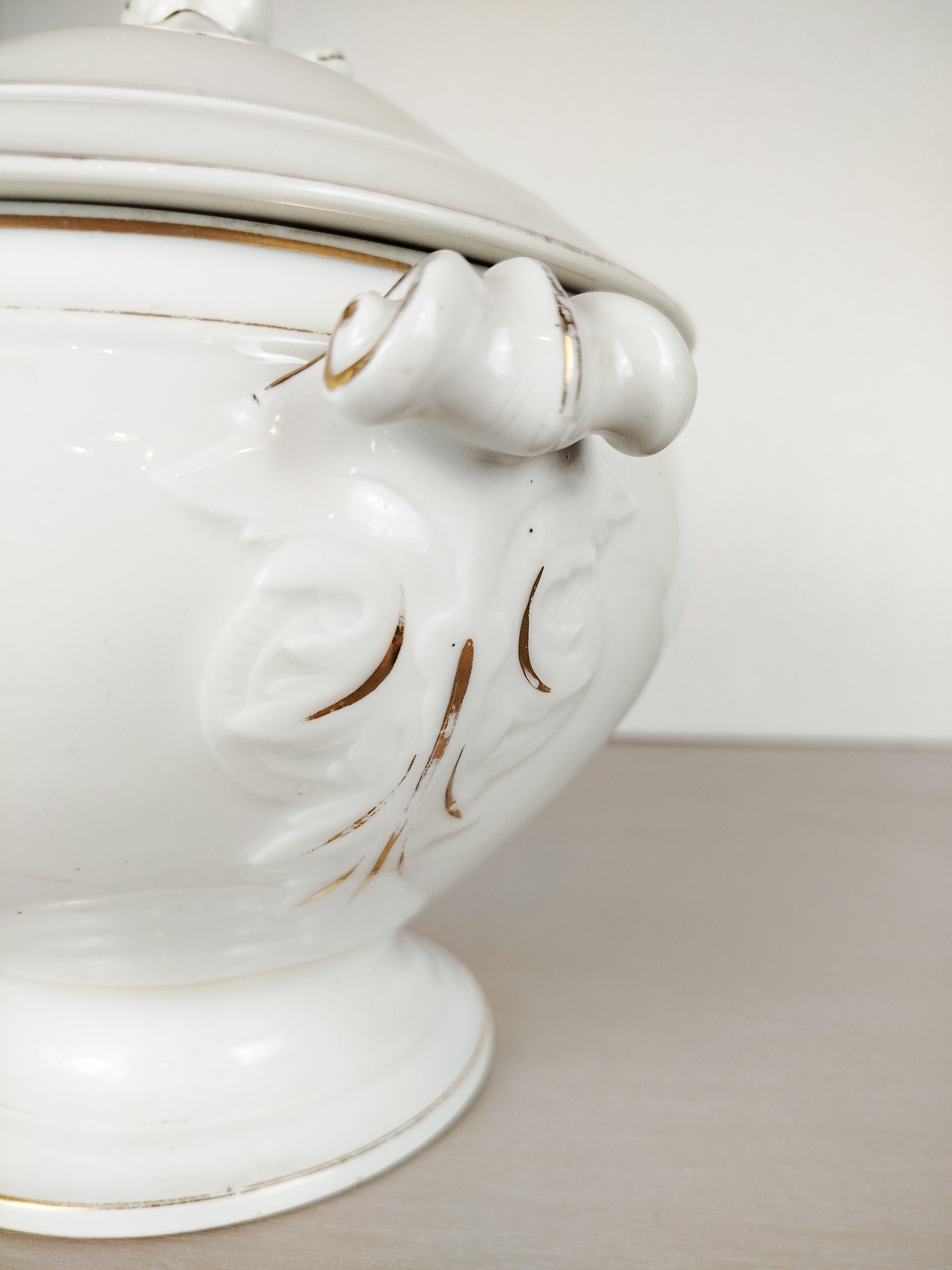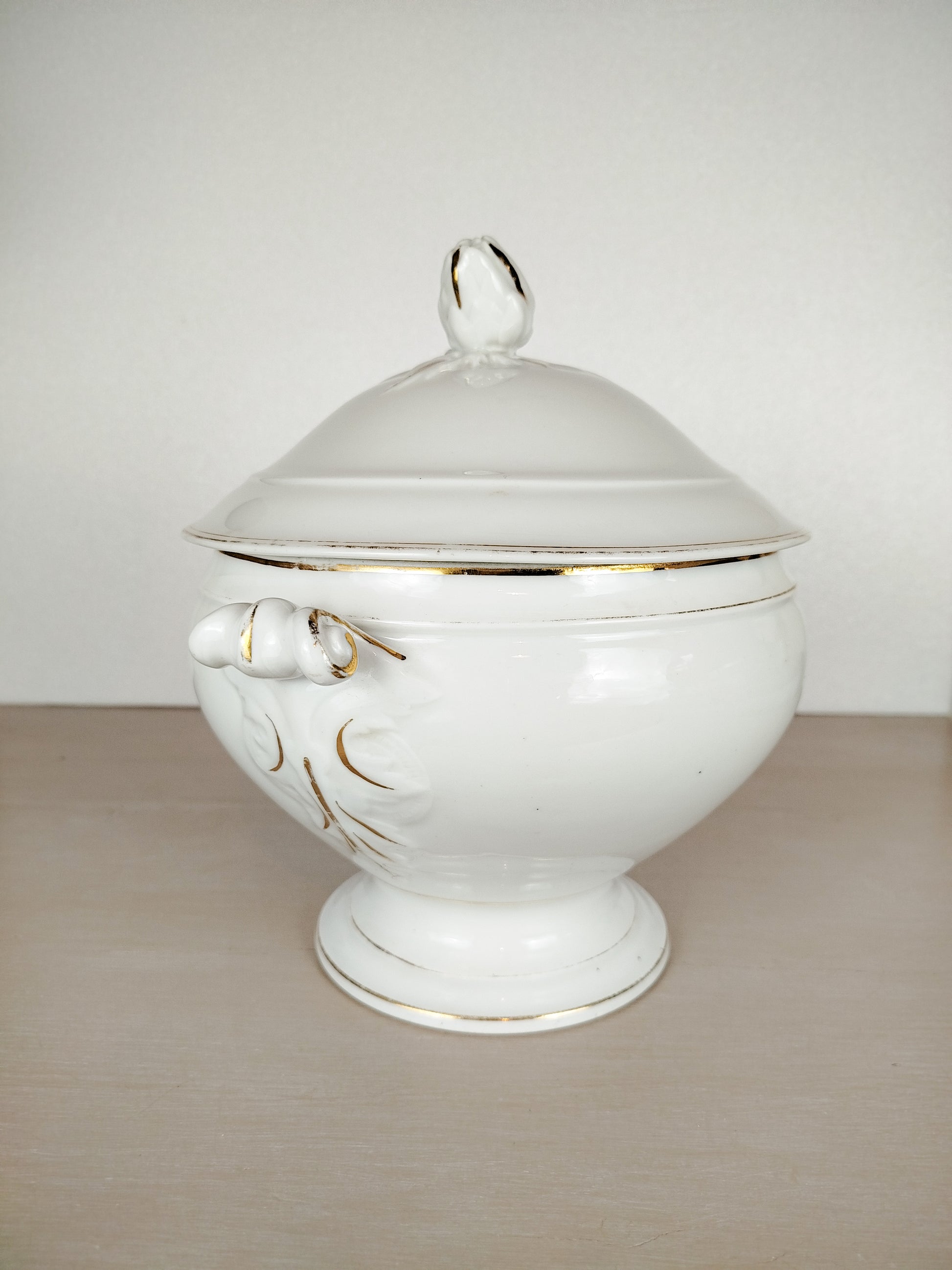 Elle est en porcelaine blanche et est décorée de plusieurs liserés dorés. (en partie effacés).