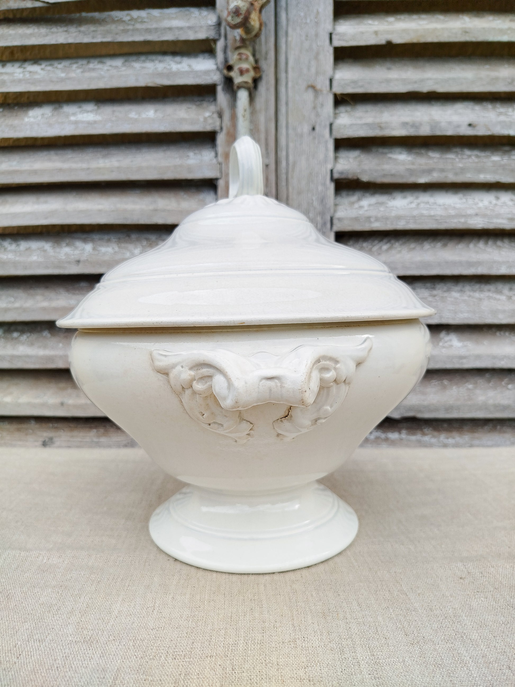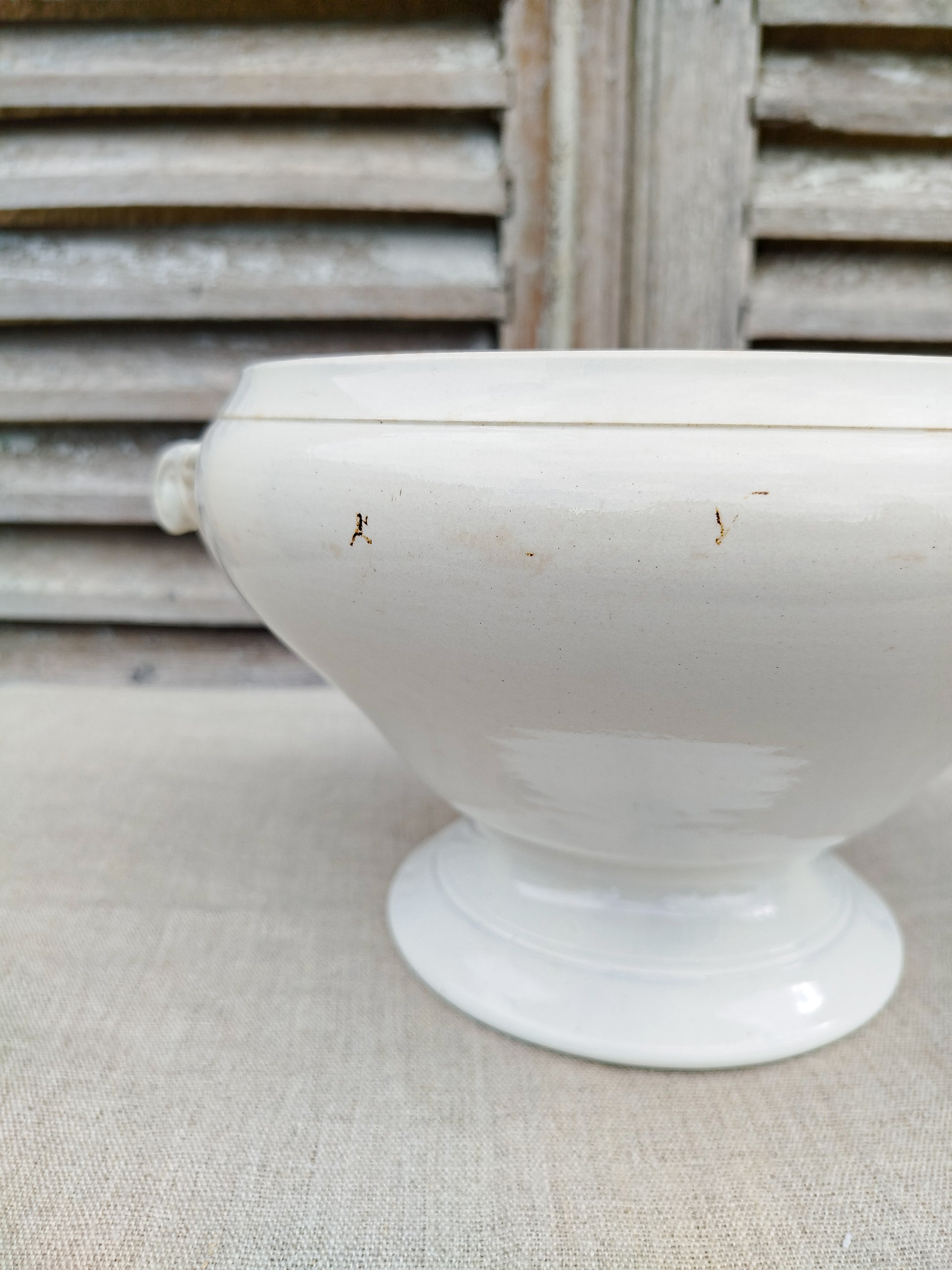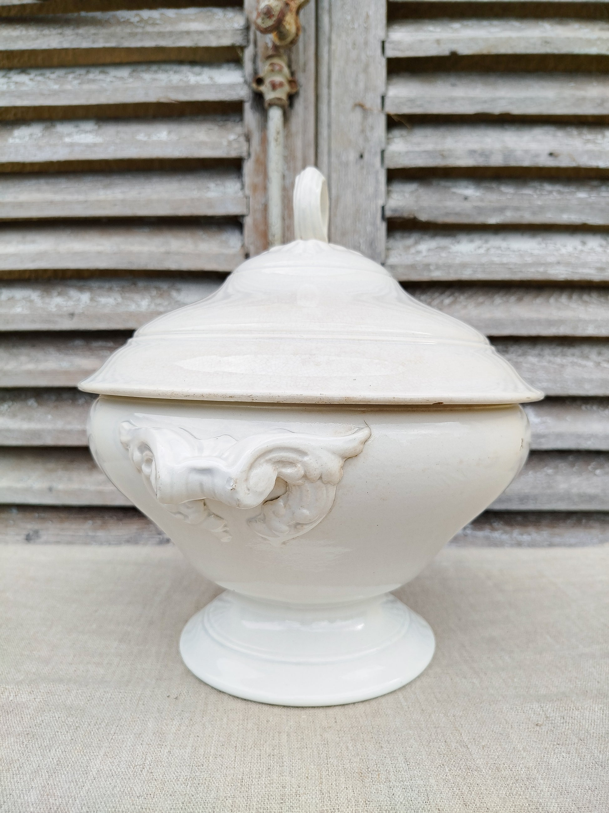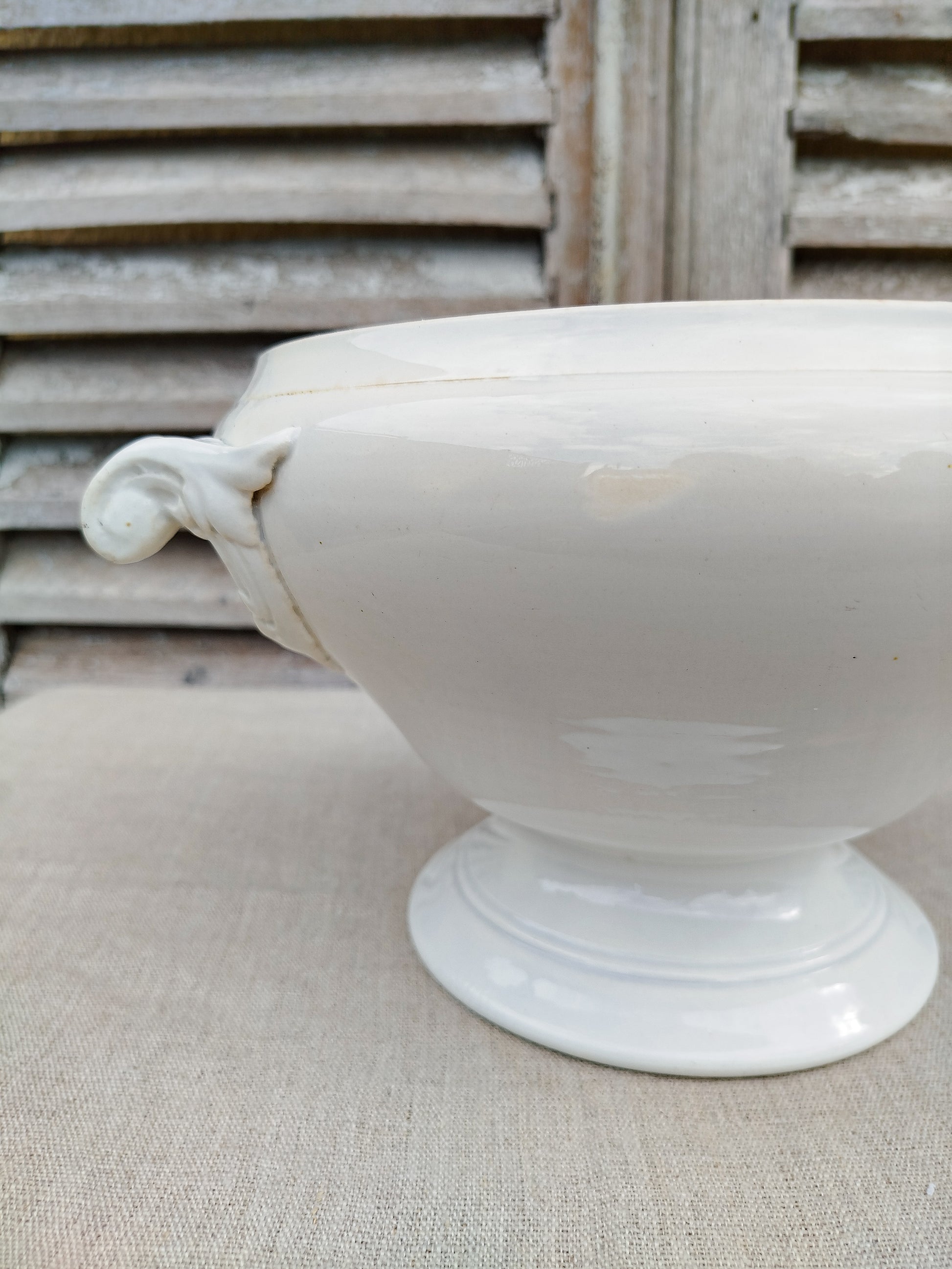 Soupière antique blanche en faïence de Digoin & Sarreguemines.