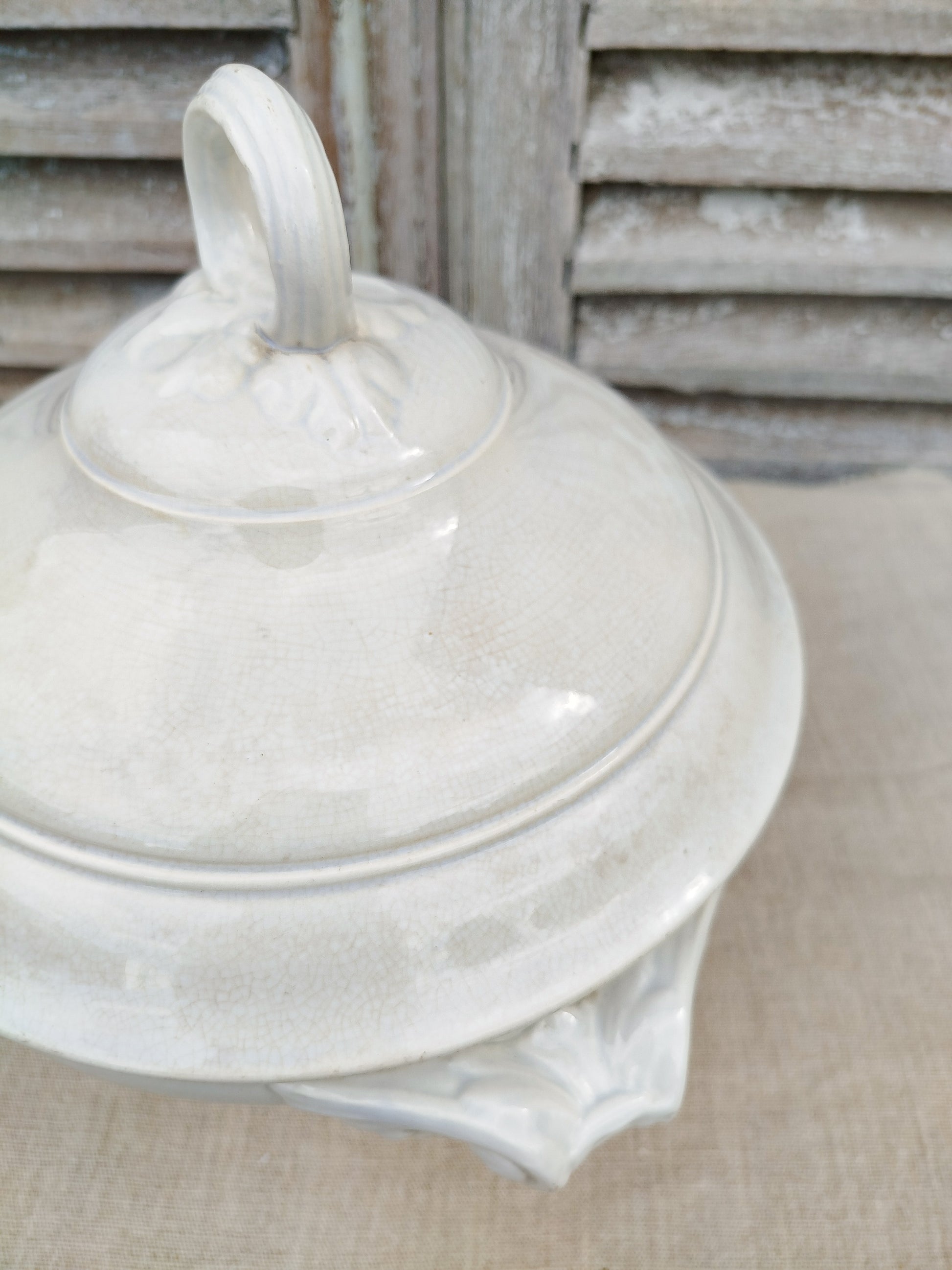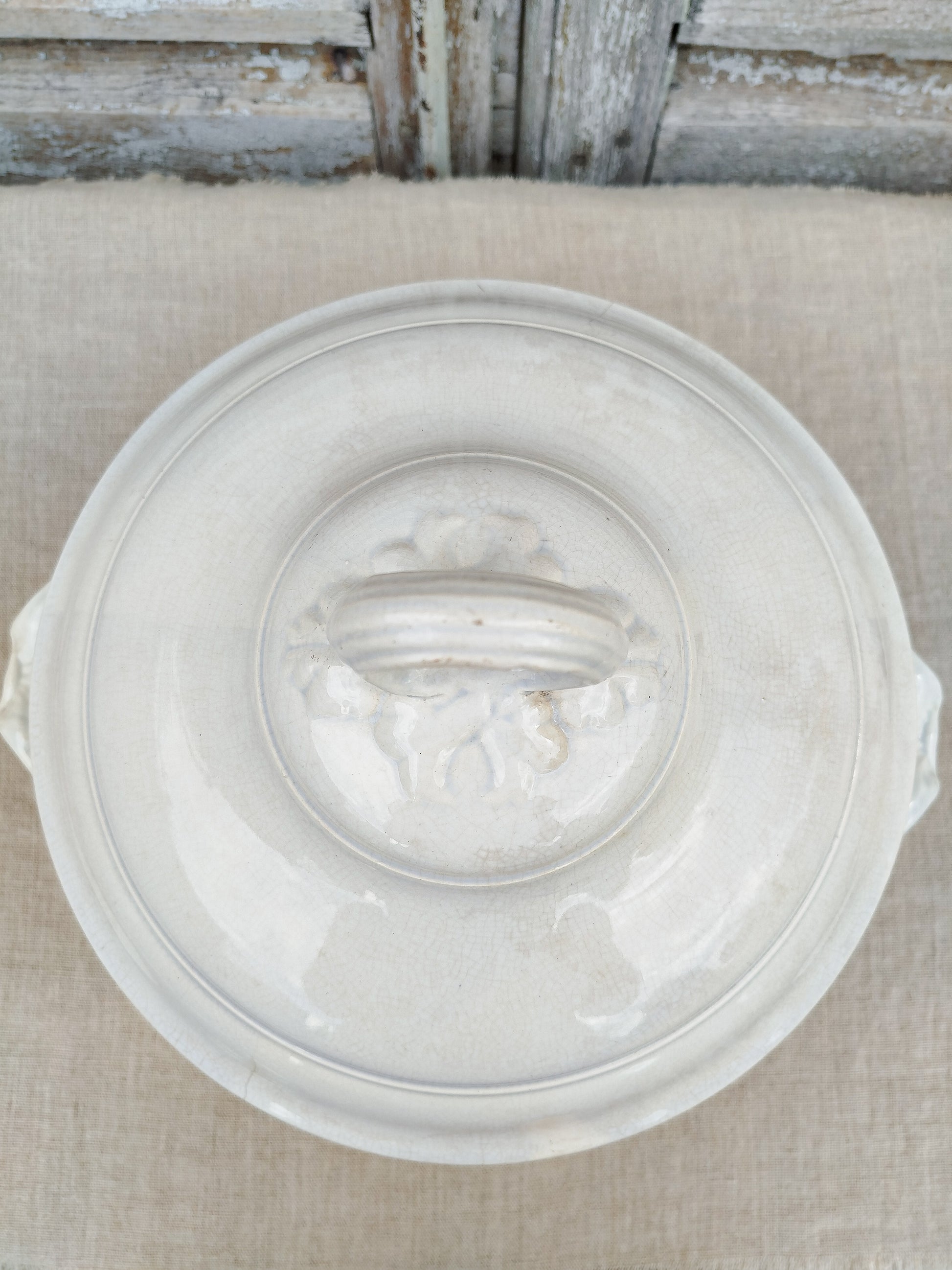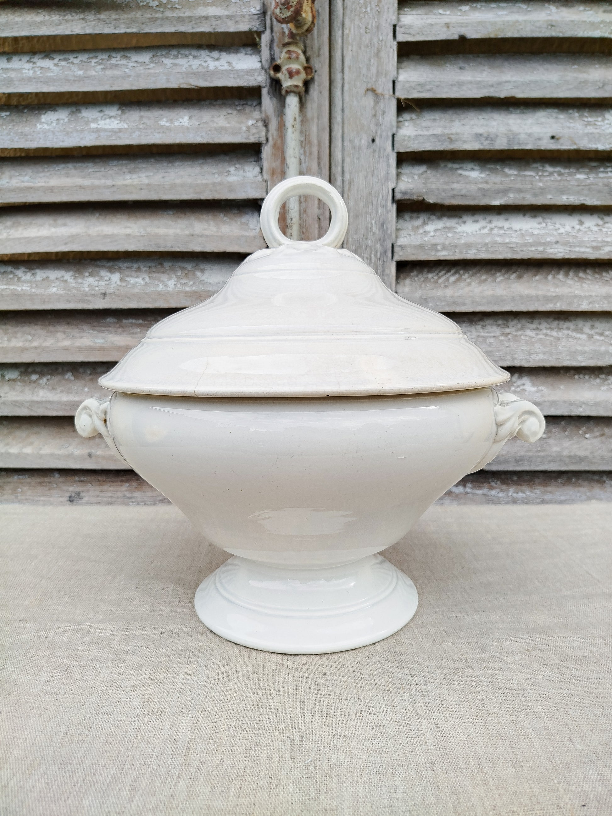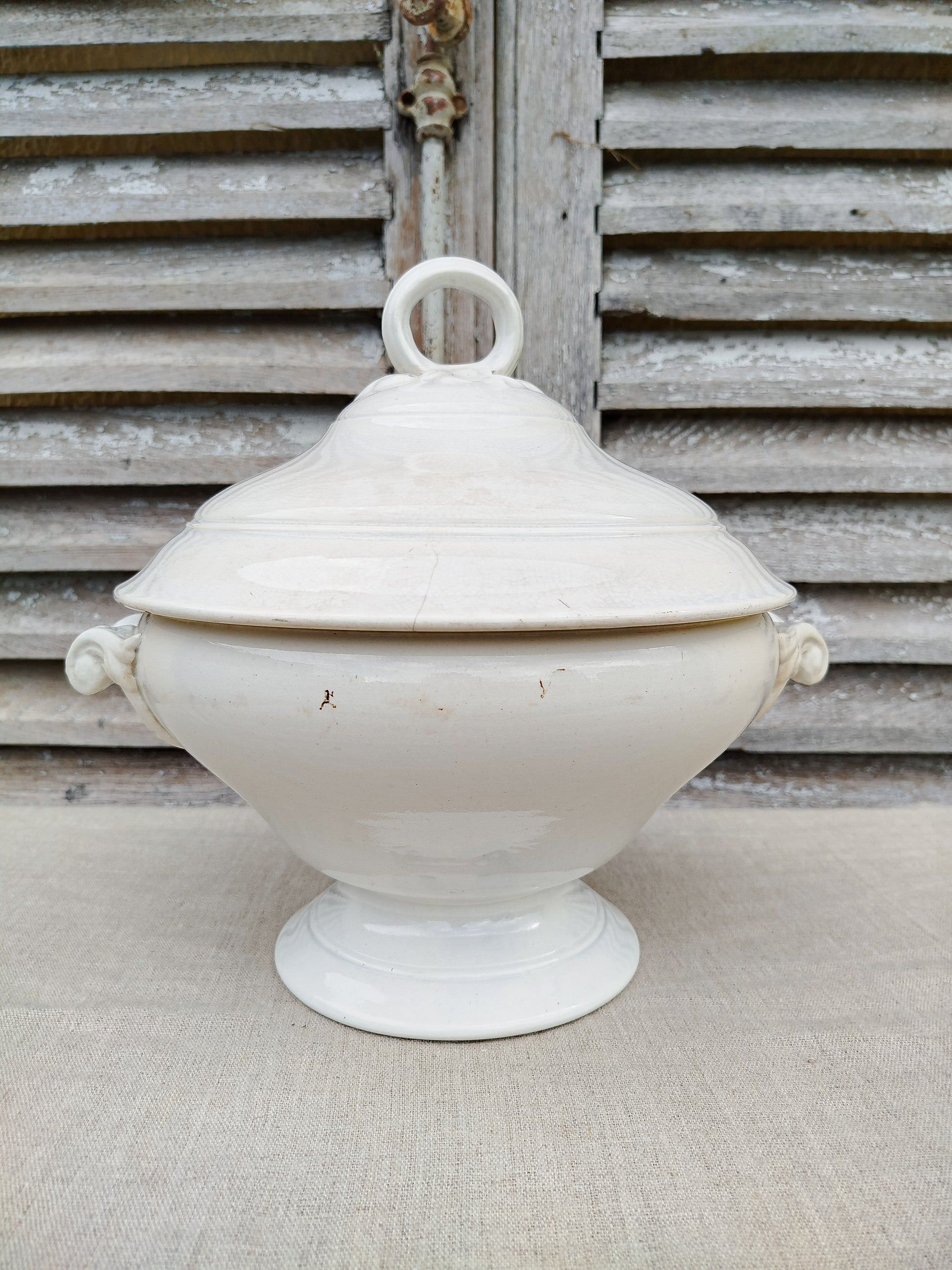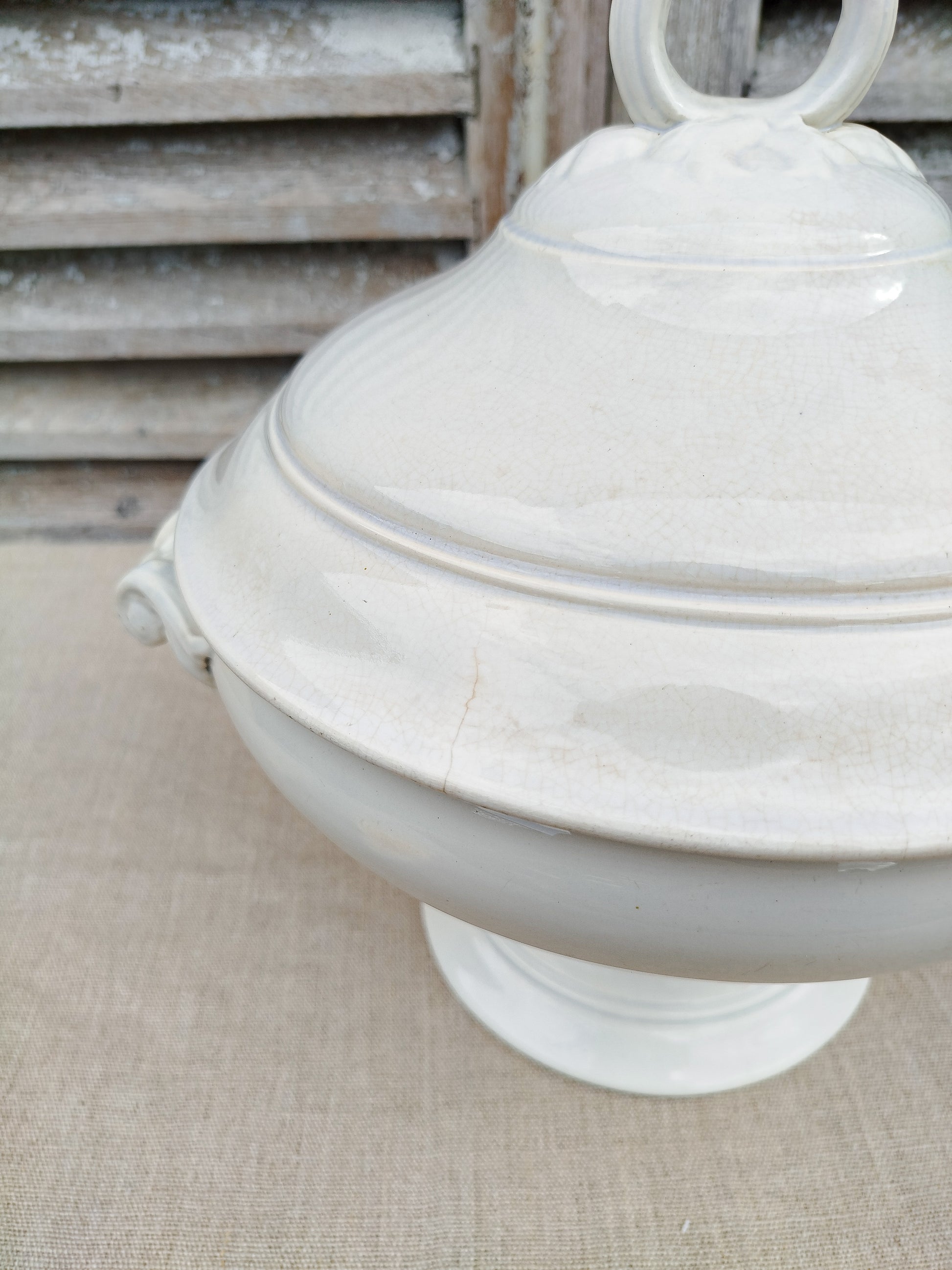 Soupière antique blanche en faïence de Digoin & Sarreguemines.