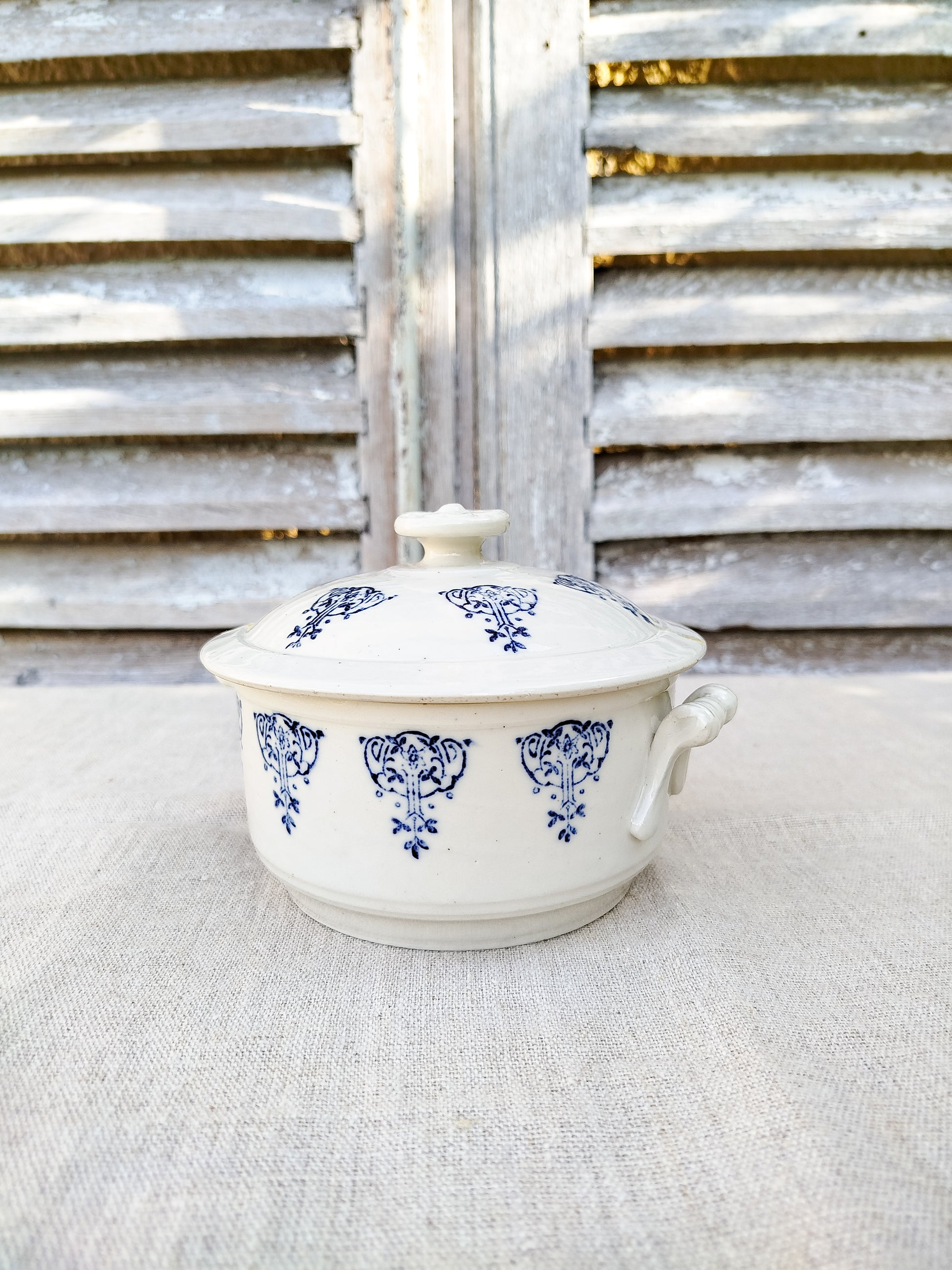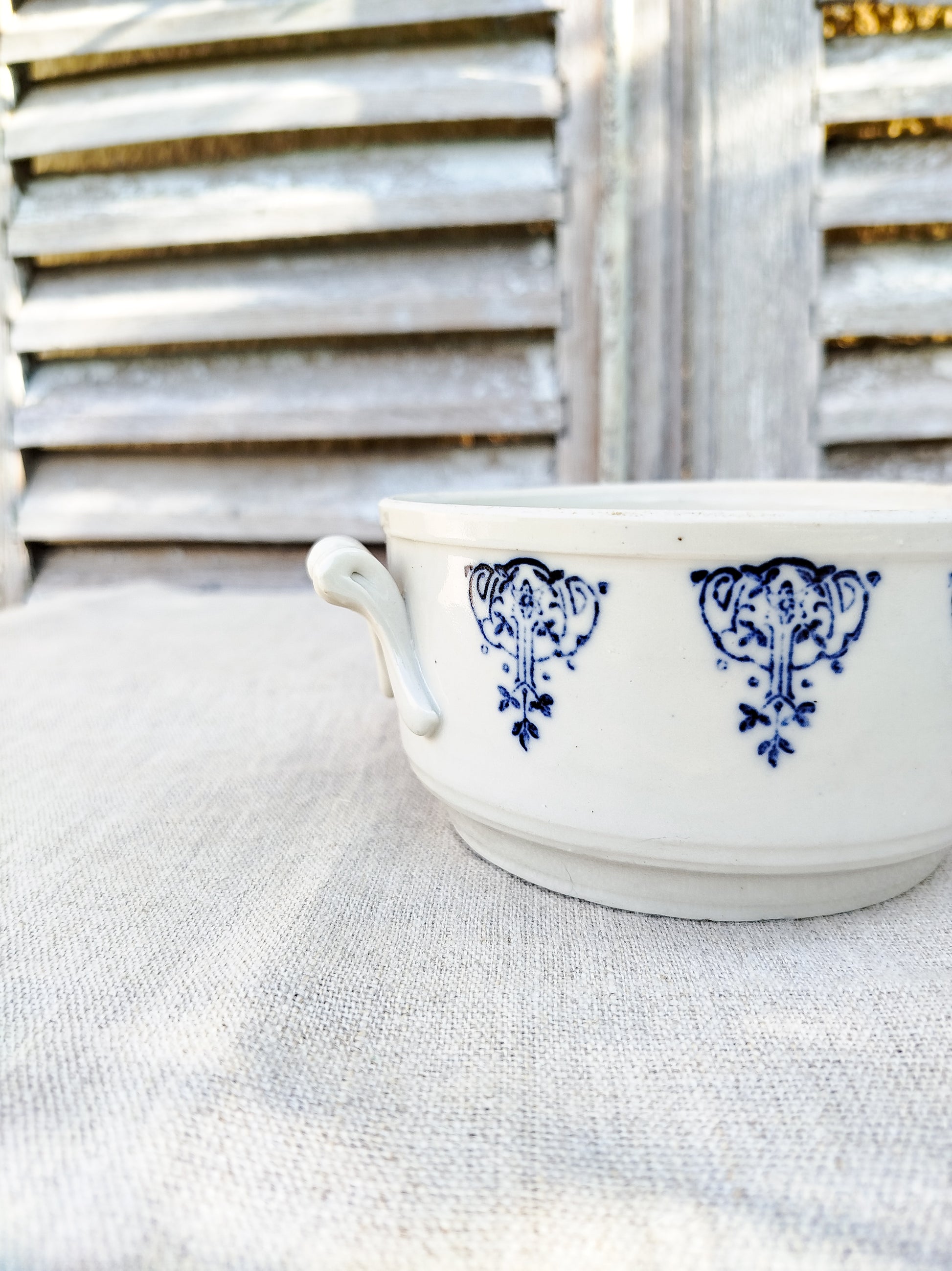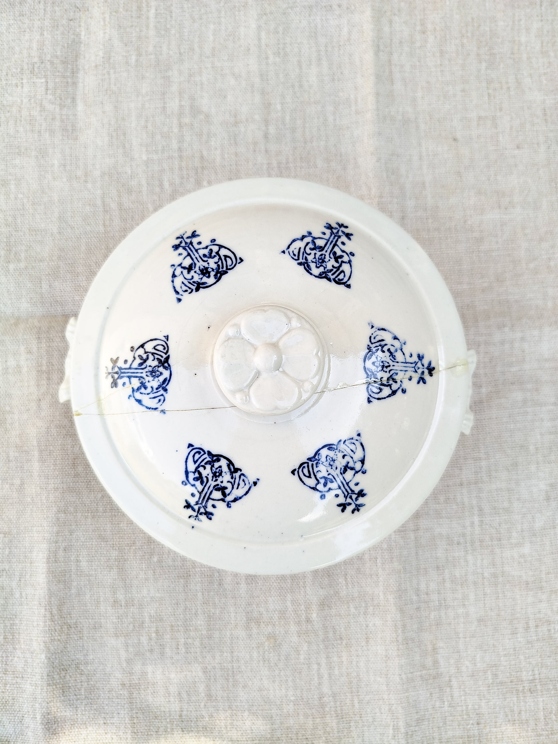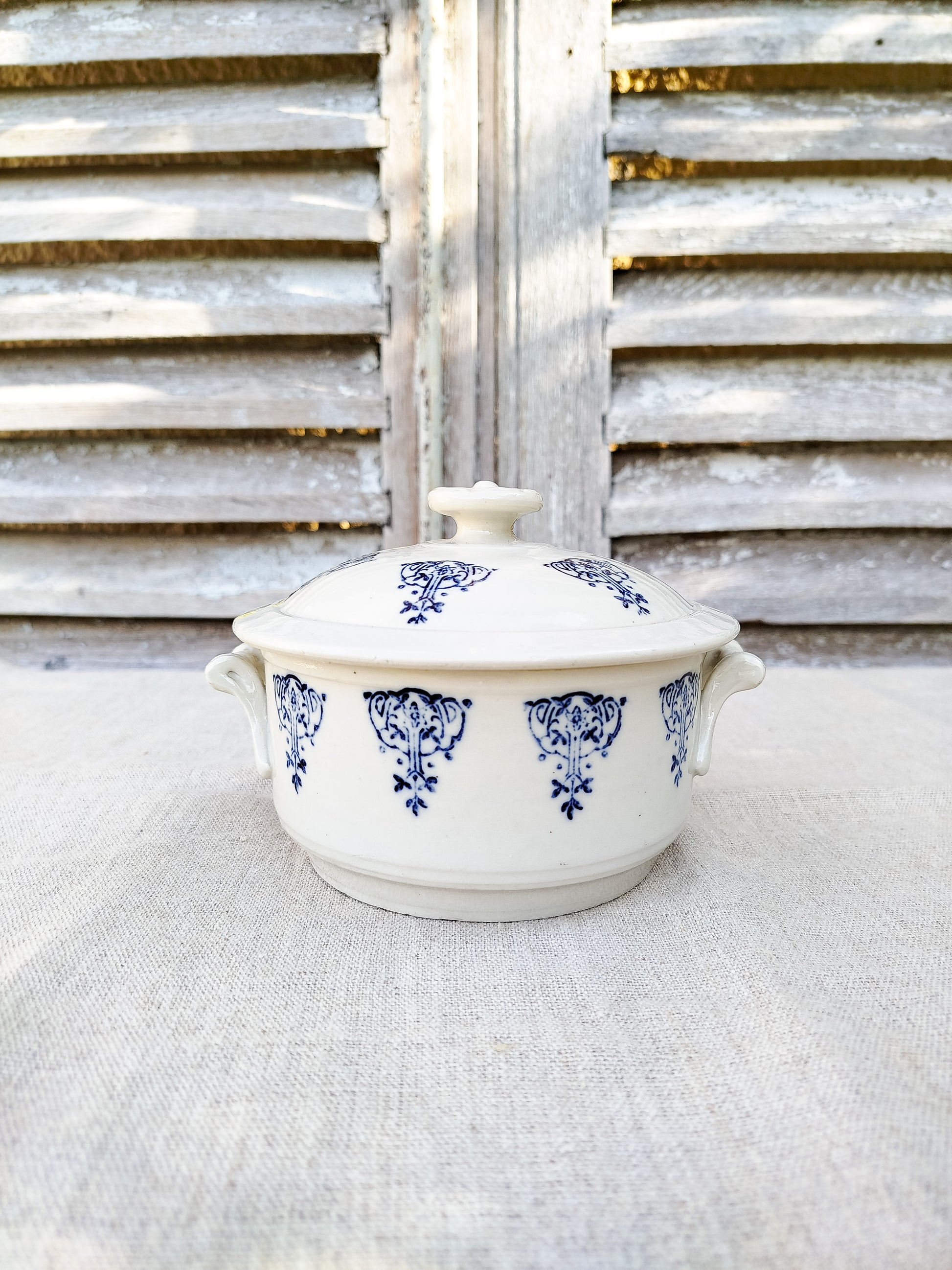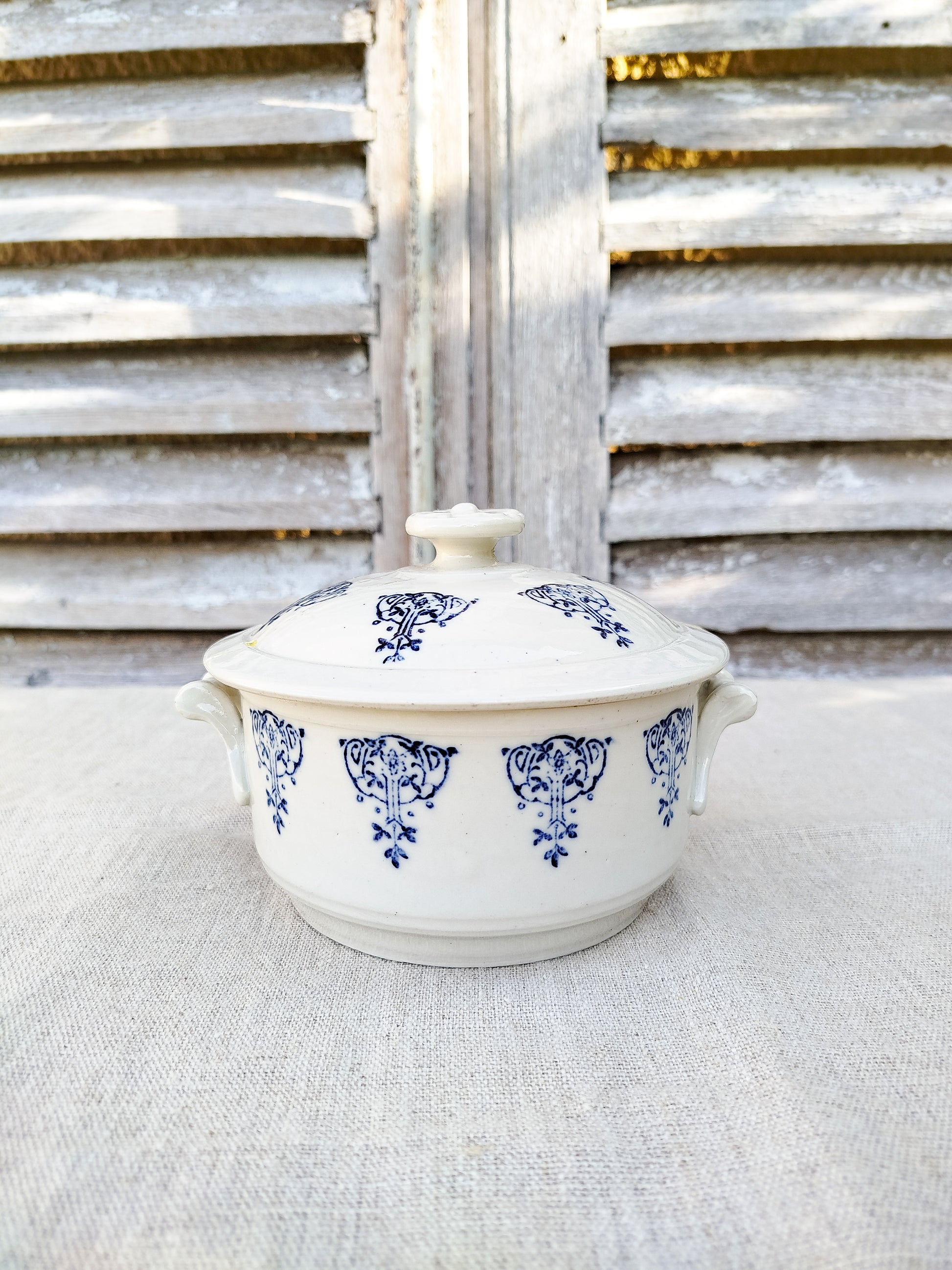 Motifs style art nouveau en bleu foncé, tout autour de la soupière et sur son couvercle.