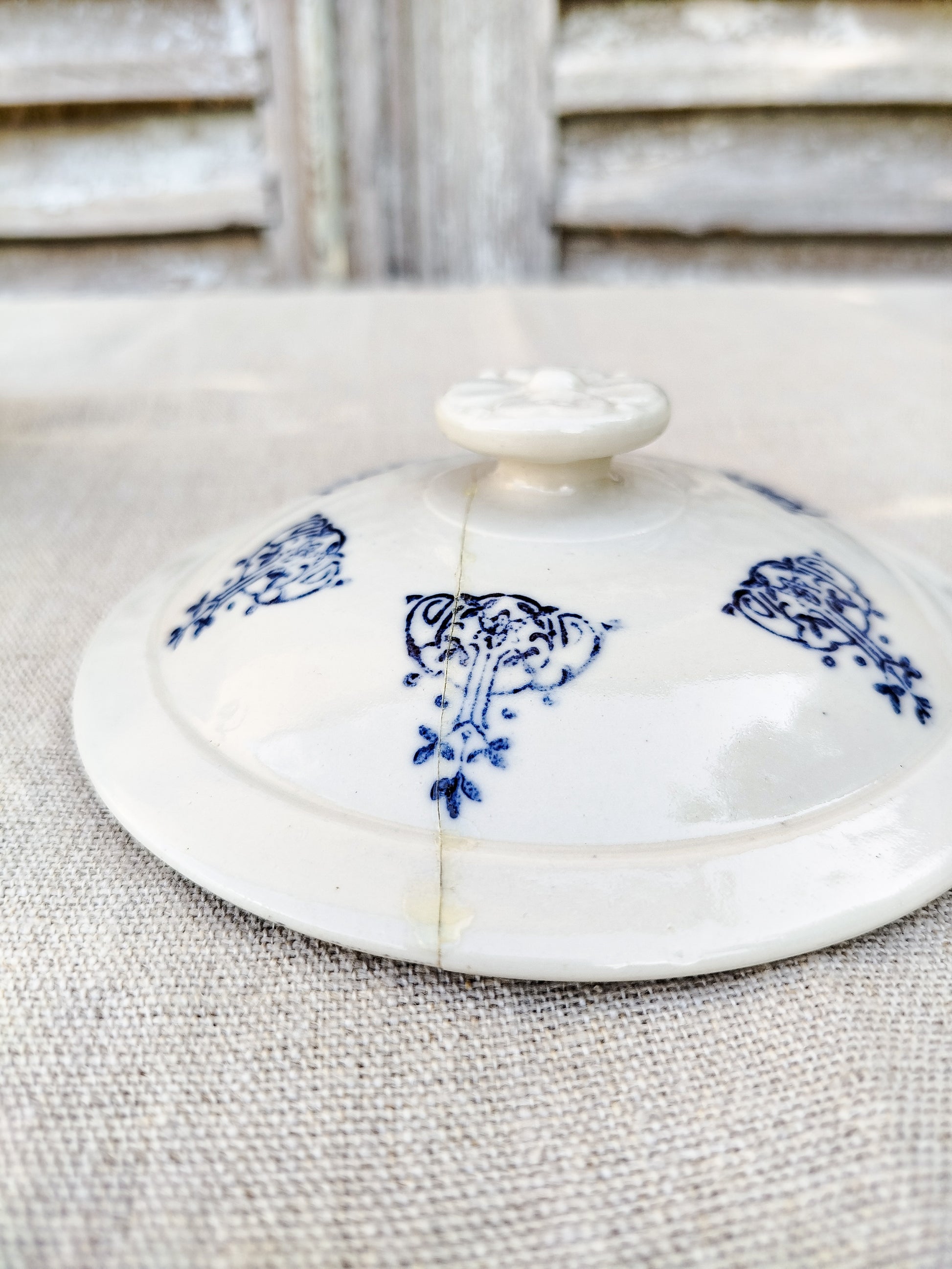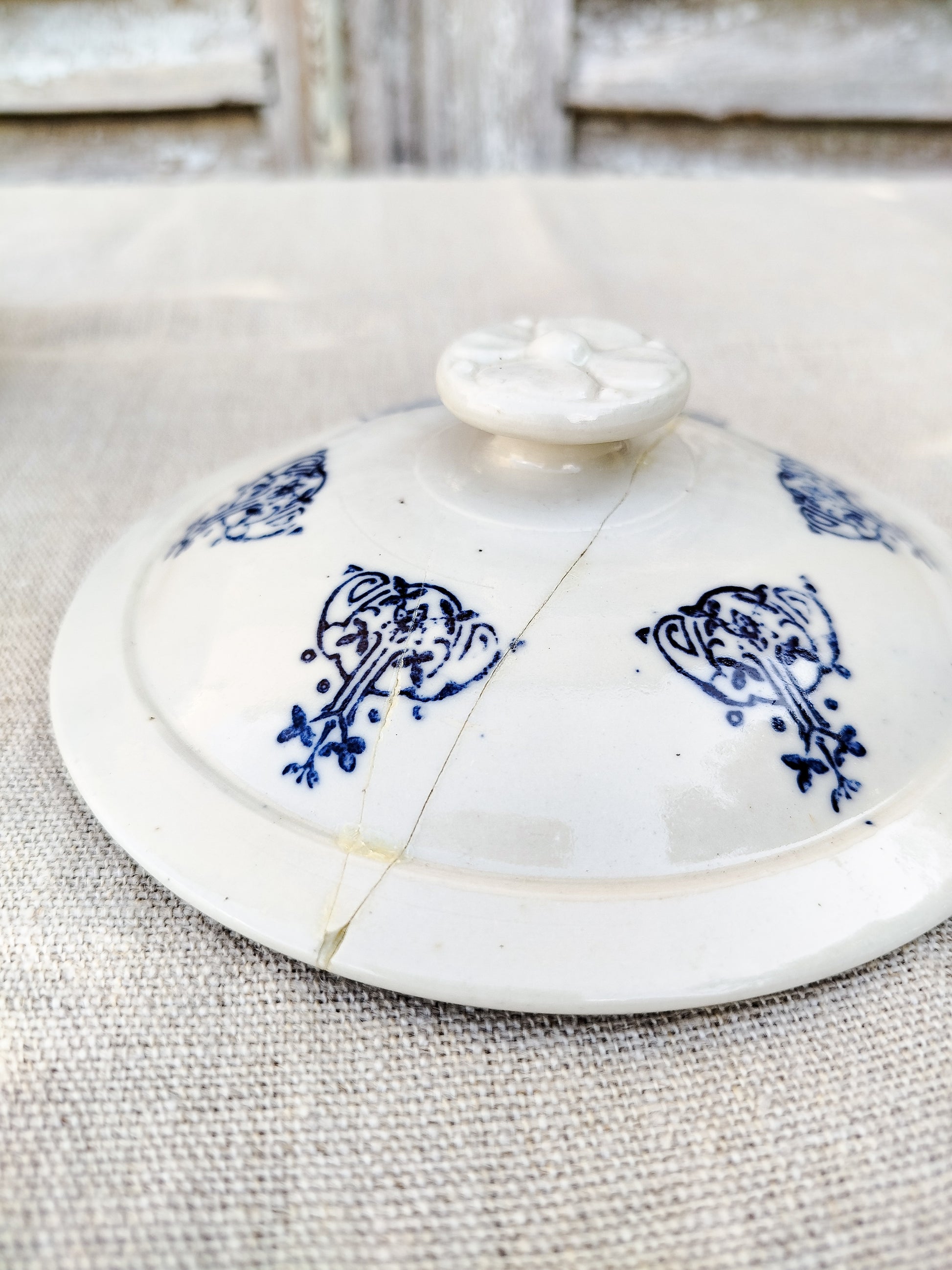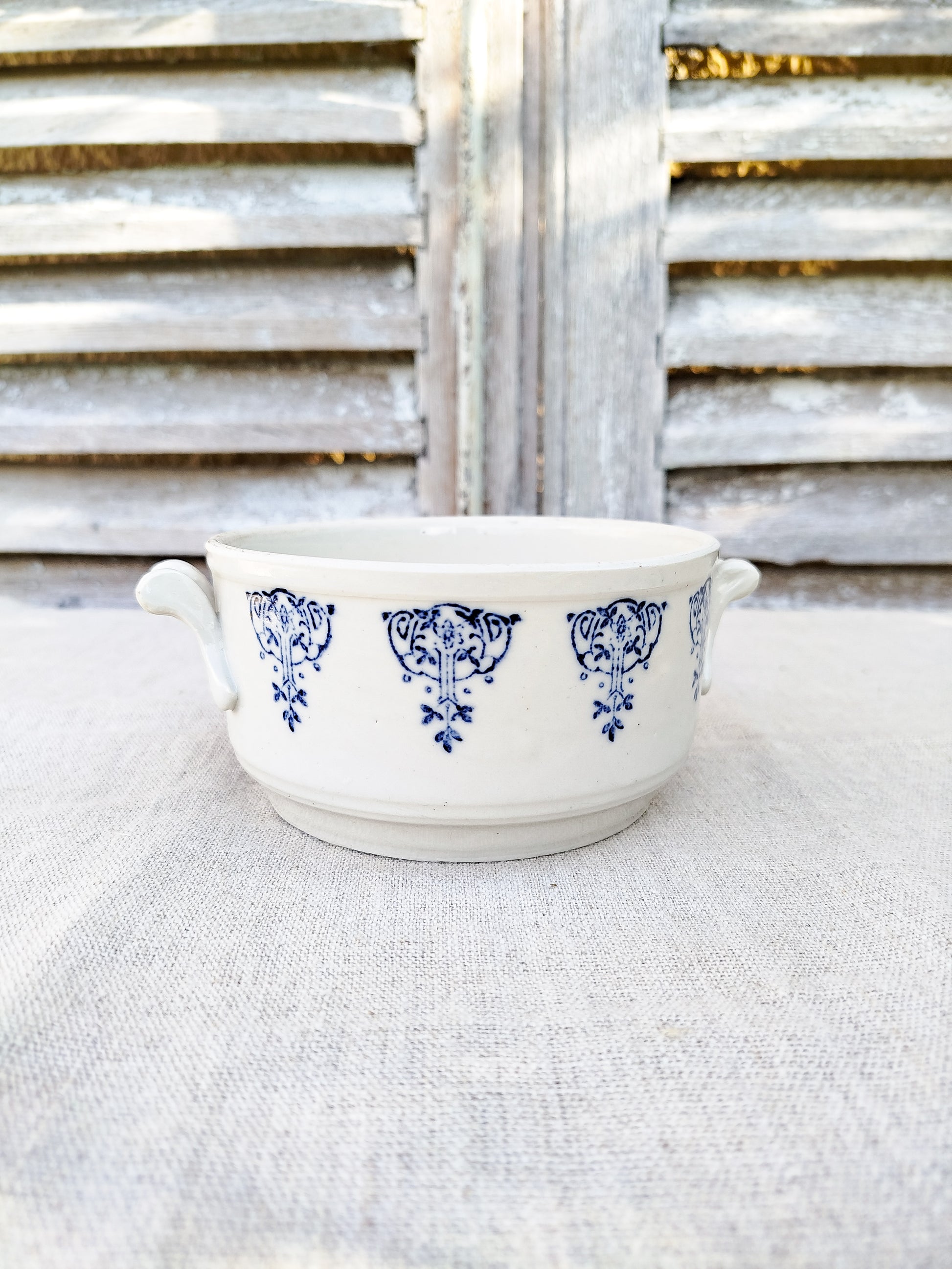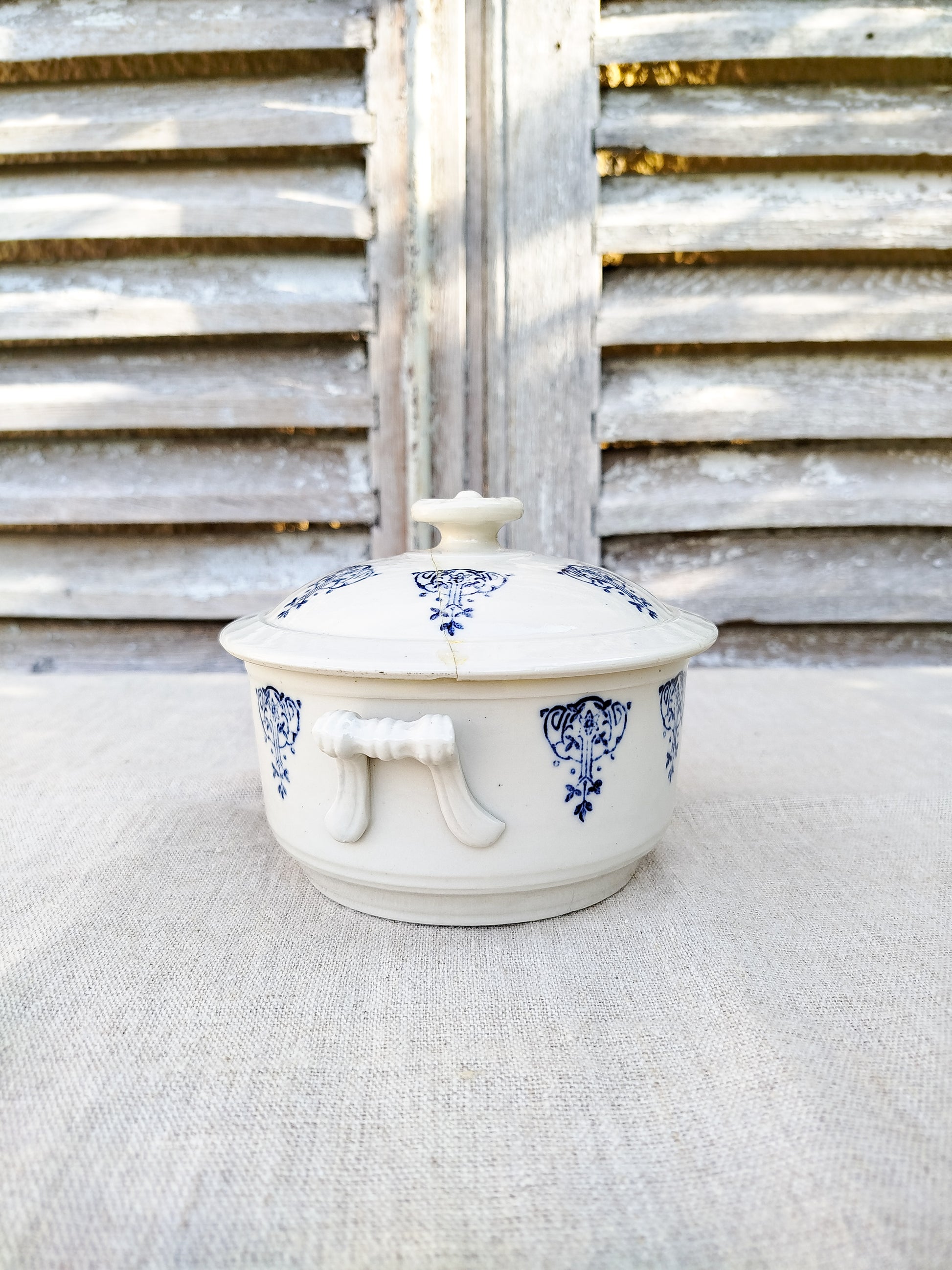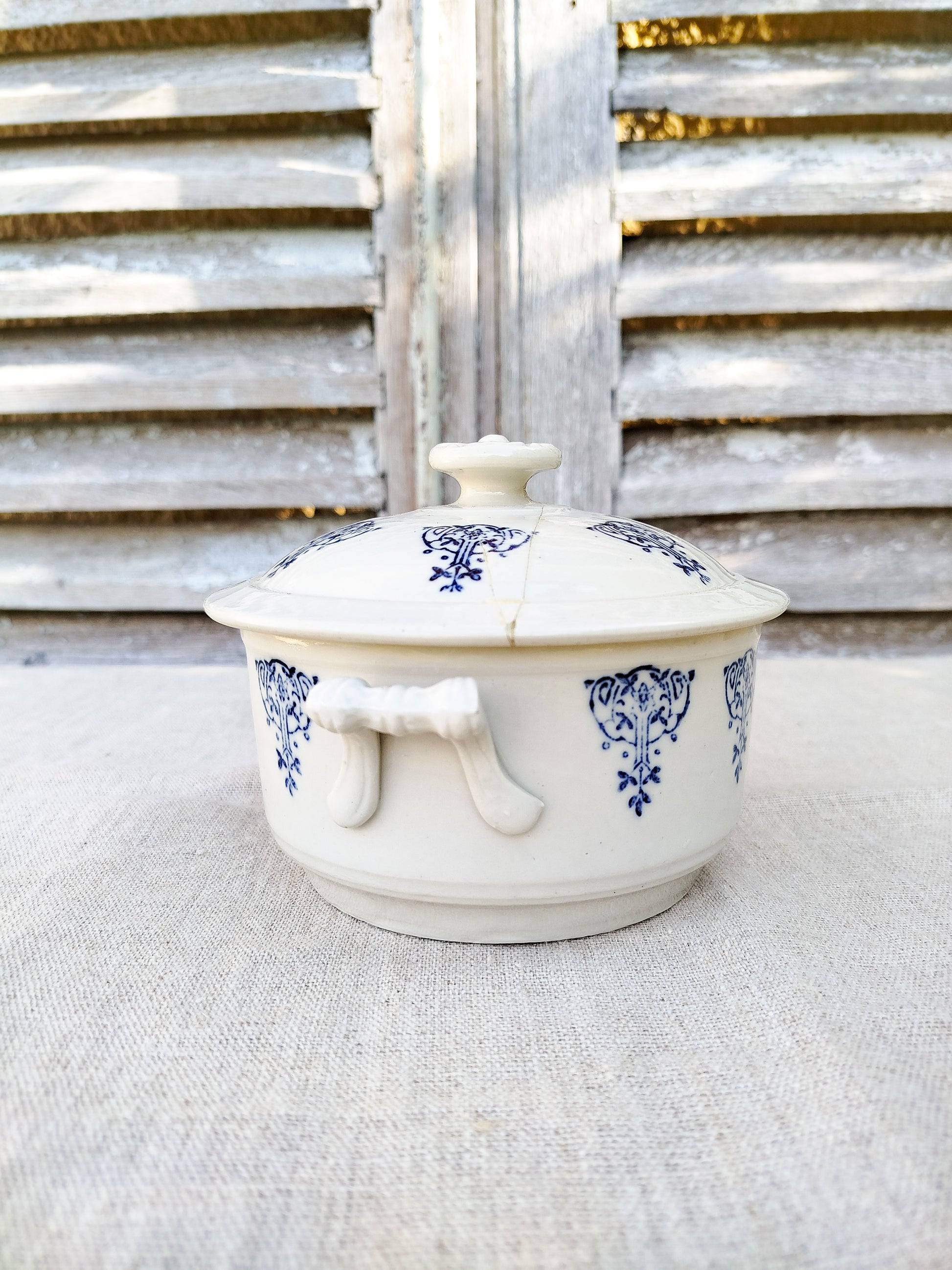 Motifs style art nouveau en bleu foncé, tout autour de la soupière et sur son couvercle.