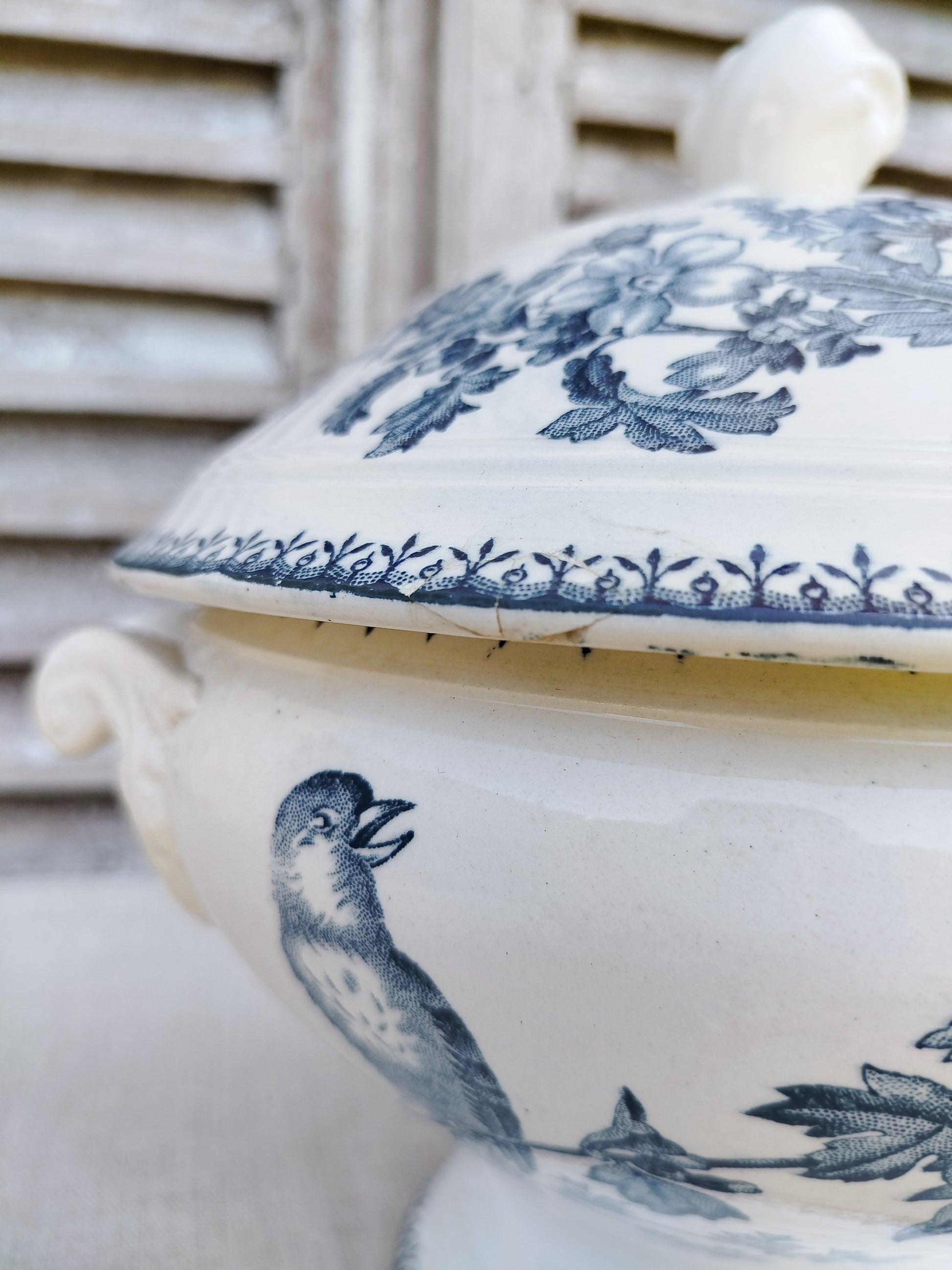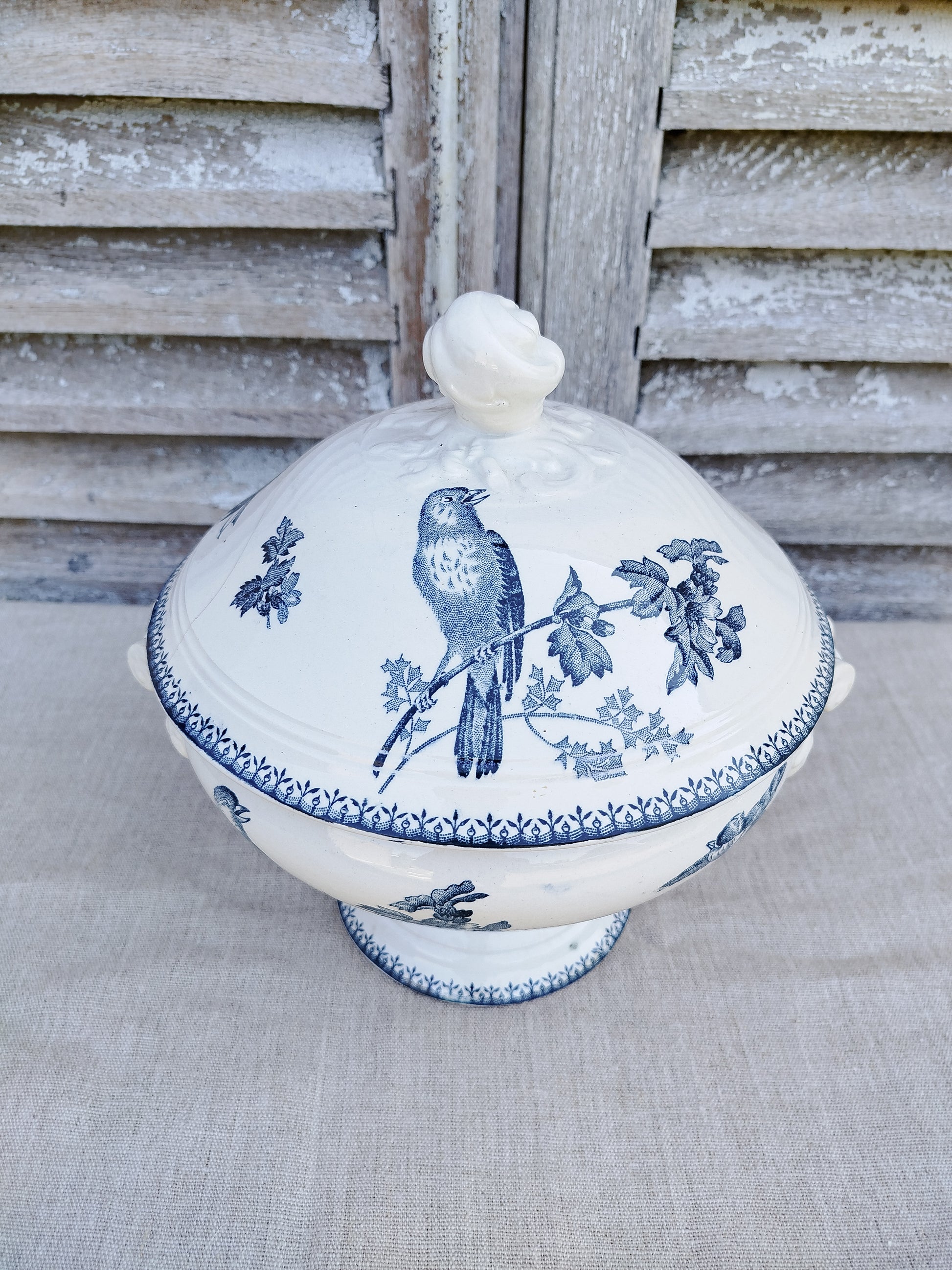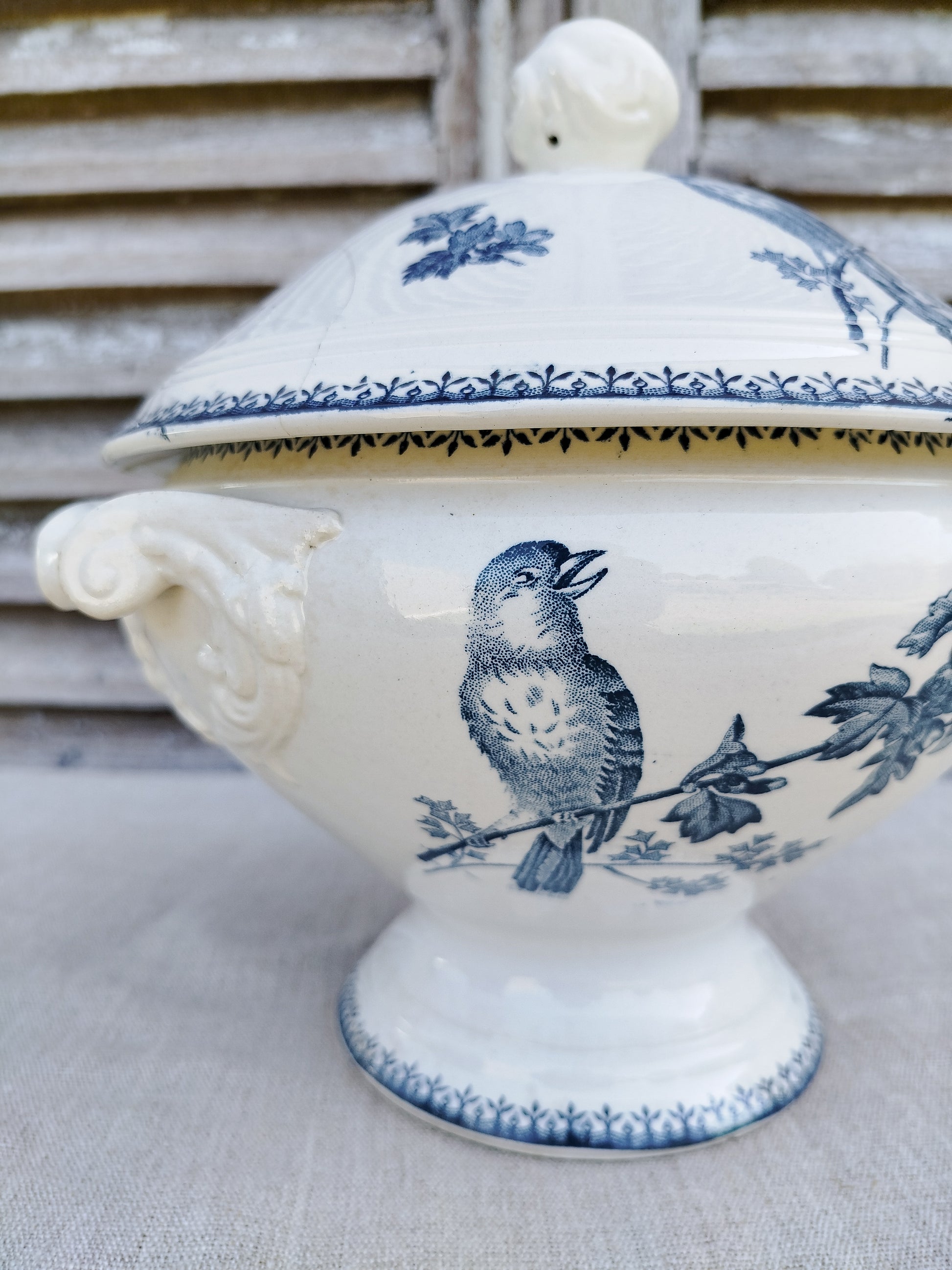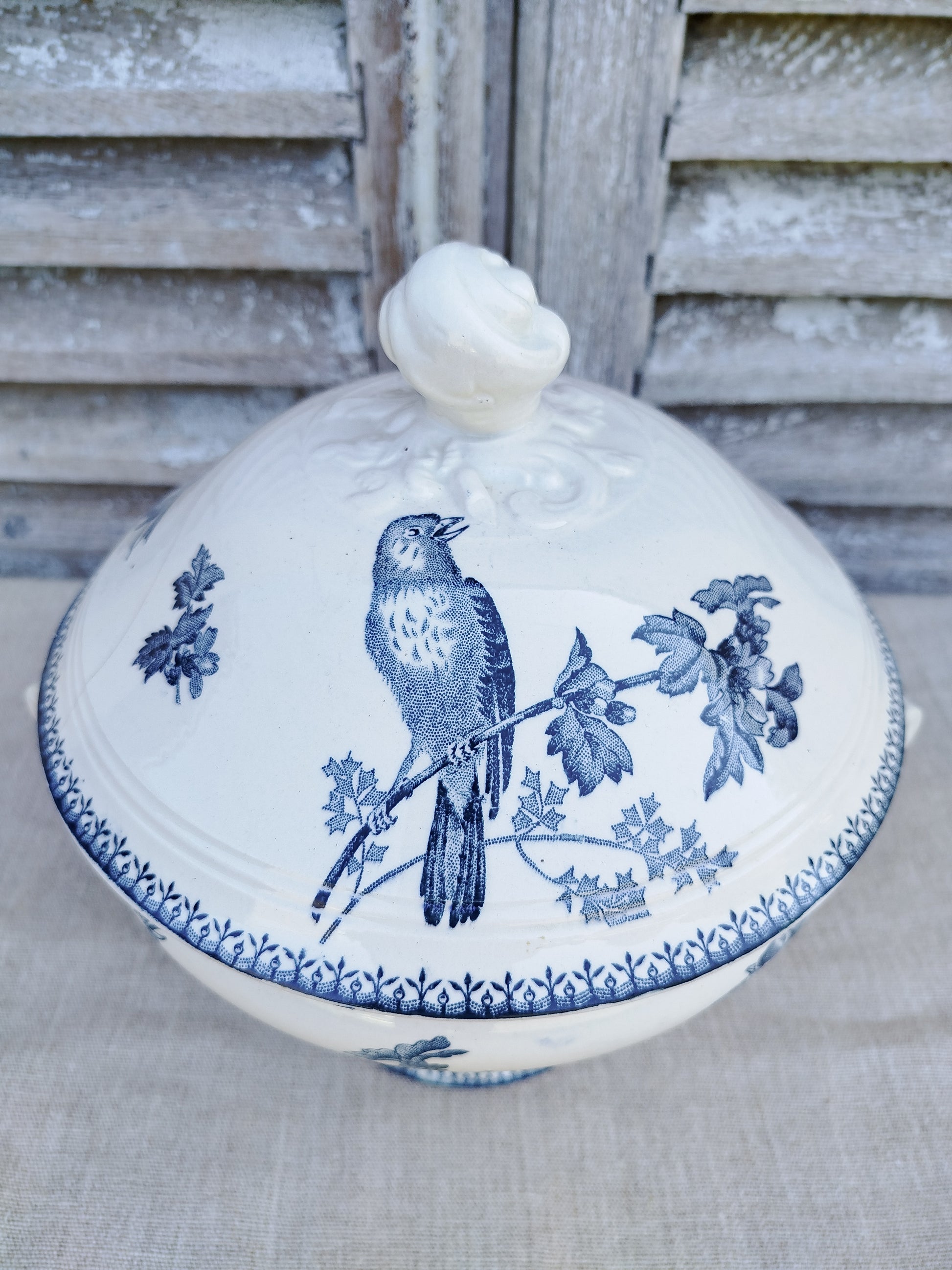 Il s'agit du modèle " Mésange " avec un décor floral en bleu, accompagné de trois petites mésanges réparties sur les deux côtés, ainsi que sur le couvercle.